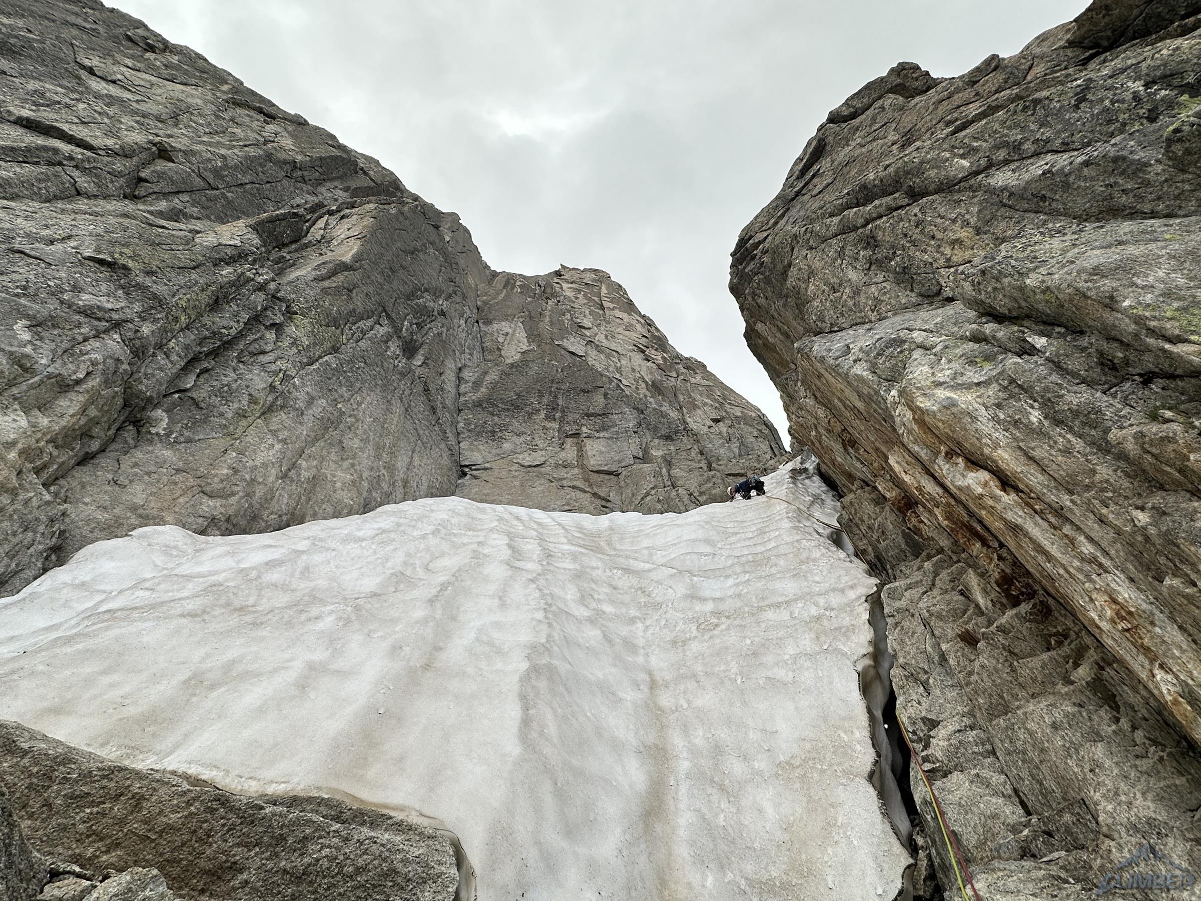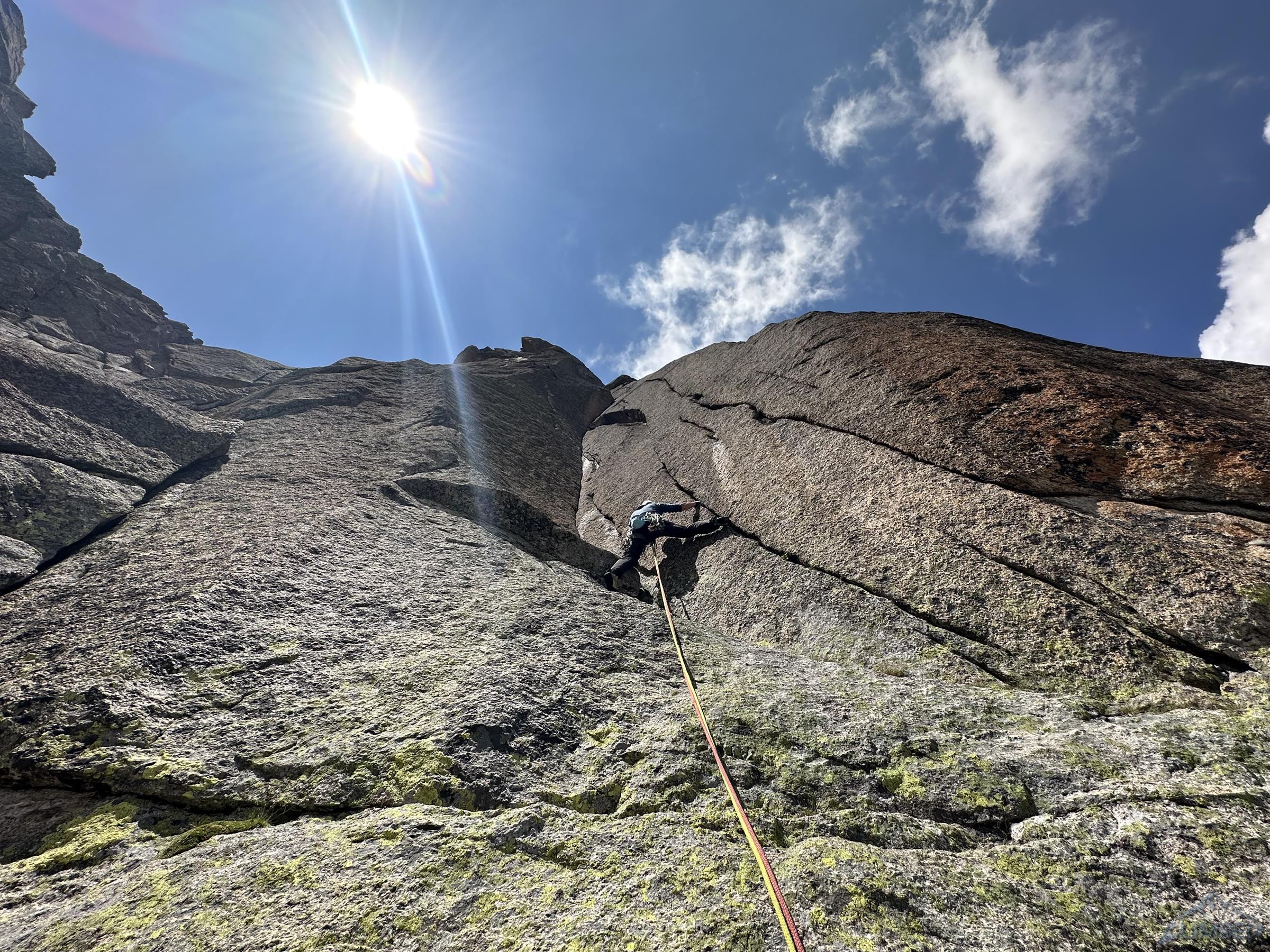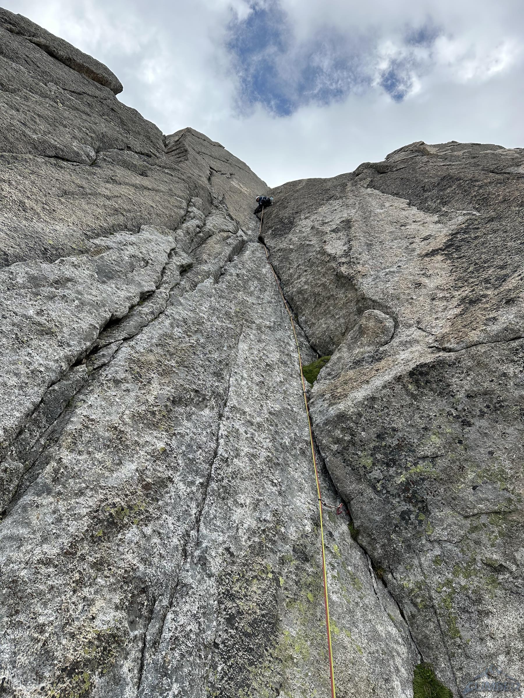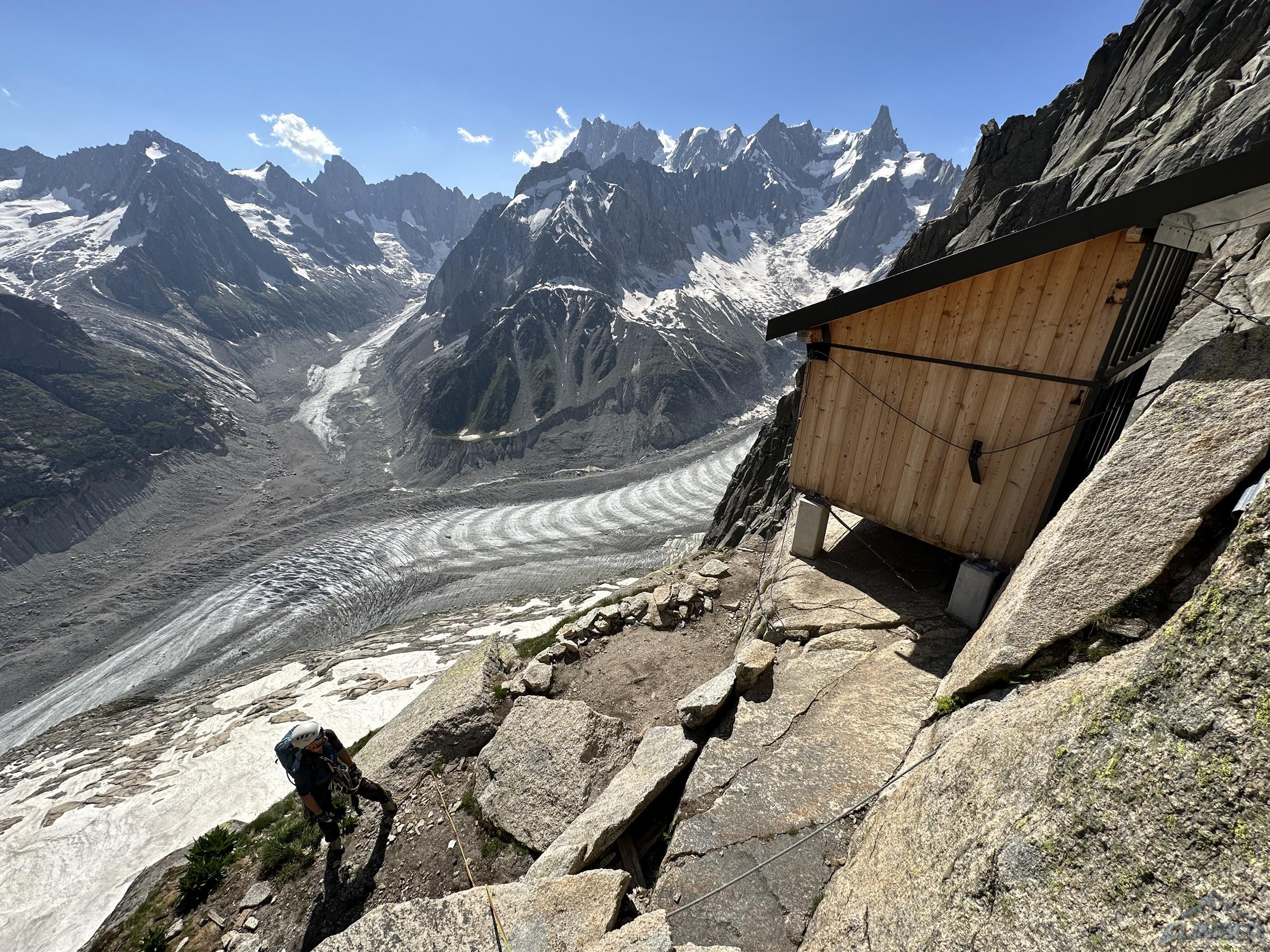 Po zmianie na prowadzeniu ruszam w piąty odcinek – dość przystępną jak na Piolę płytę za 6c, po której kontynuuje się ślicznymi rysami do góry. Cały ten wyciąg można obejść zacięciem po lewej stronie i załupą w prawo (5c), warto jednak pokusić się o oryginalny, trudniejszy wariant. Stanowisko znajdujące się po wyjściu z trudności warto przenieść 10 metrów wyżej – kolejny odcinek to prawie 60 metrów wspinania. Idziemy kominem i dalej płytą w prawo do spita na kancie, którym kontynuujemy skośnie w lewo do odległej półki. Siódmy wyciąg to piękna rysa po lewej (6a), docieramy nią wprost na wielki taras na którym znajdziemy… chatkę 😊. Historyczne schronisko (Old Tour Rouge) zostało odrestaurowane i służy obecnie jako miejsce biwakowe, z którego korzysta całkiem sporo osób wspinających się République Bananière. Dzięki temu kilka wyciągów przejść można późnym popołudniem dnia pierwszego, a pozostałe po wygodnym noclegu – nie jest to głupi pomysł bo mamy więcej czasu żeby wyrobić się na szczyt i zjechać jeszcze przed zmrokiem.