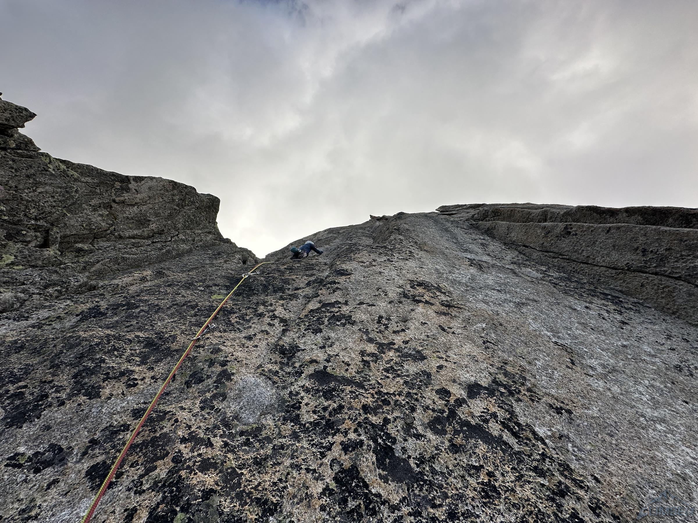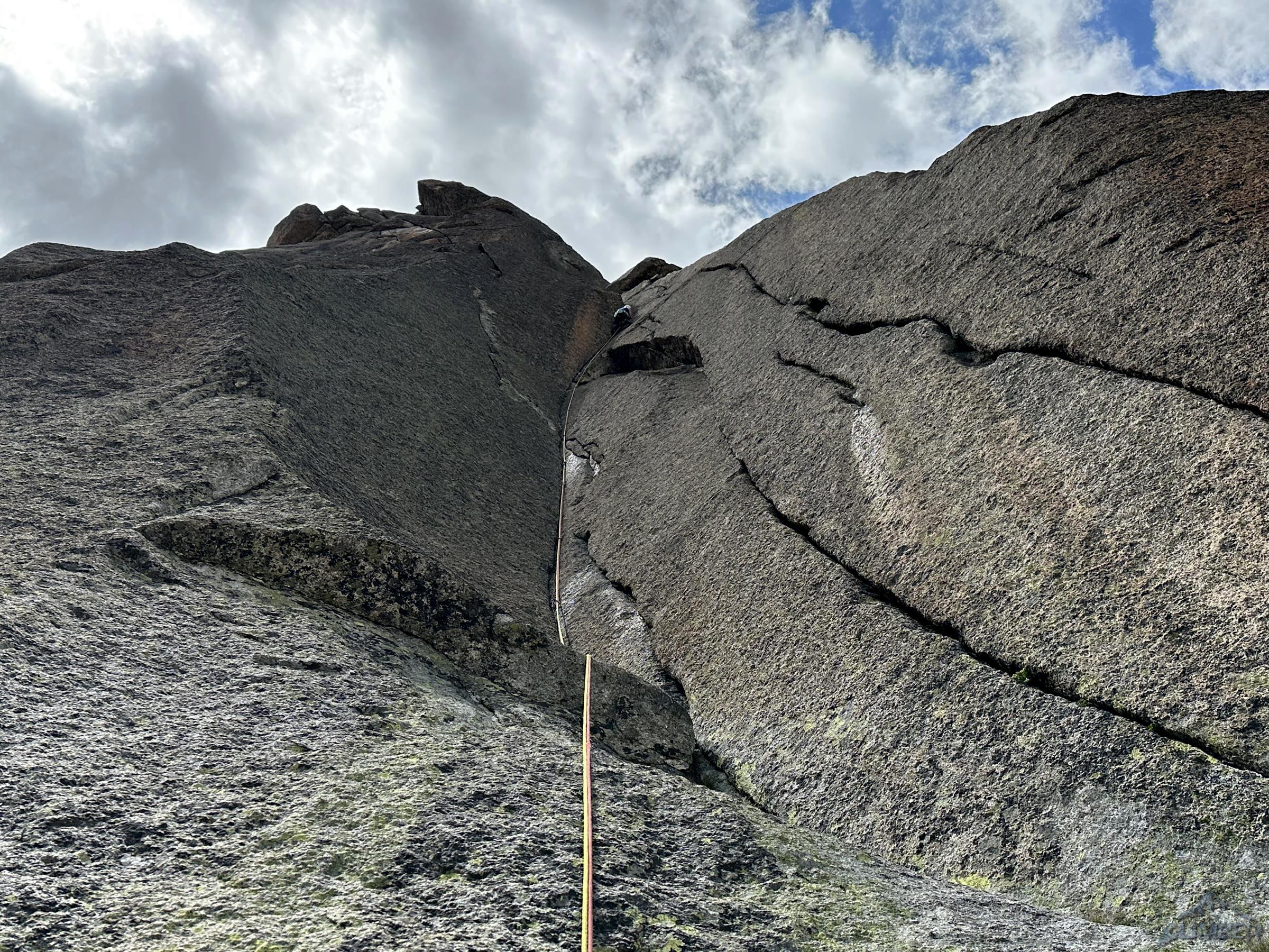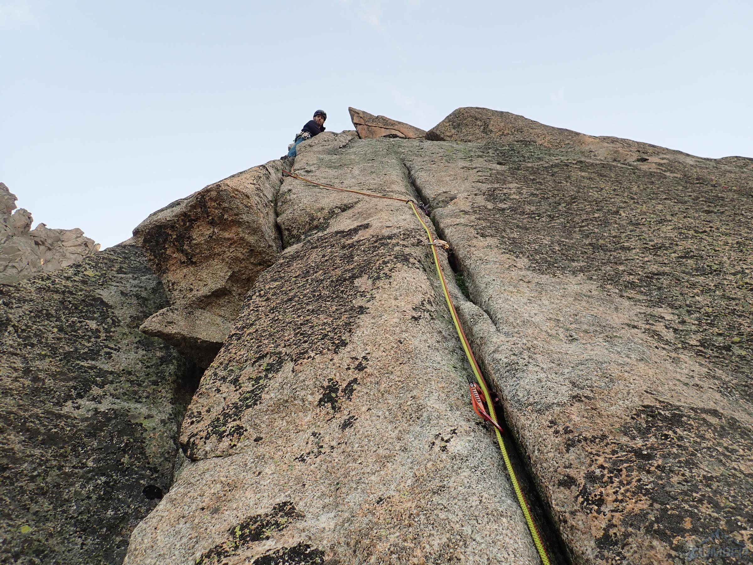 Z półki dalsza droga nie wiedzie już zacięciem, a rysami na prawo (wyc. 18, 6a). Następny, 19-ty wyciąg, jest długi i dość wymagający – zaczynamy płytą na lewo (6b) i przechodzimy do zacięcia, zamykającego się w górnej części, gdzie przewijamy się do półki na kancie. Ostatni trudny wyciąg na drodze (6c) po tym co Romek zrobił w zacięciu biorę na siebie – po kilku metrach klinów w obłej rysie czeka techniczne przejście do pęknięcia po lewej i już łatwym terenem można gnać w prawo do odległego stanowiska pod ostatnią przeszkodą. Jest nią stroma płyta (6a+) usiana kilkoma chwytami przypominającymi ziemniaki 😊. Po wyjściu powyżej czeka jeszcze około 20 metrów nietrudnej grani wyprowadzającej na półkę pod filarem. W tym miejscu Republika Bananowa się kończy, warto jednak rozważyć kontynuowanie na szczyt Igły drogą normalną (5c, 5c i 5c/A0 lub klasycznie 6c+ więc warto podjąć wyzwanie). W naszym przypadku jest już ciemno, daje się więc przekonać, że nie ma to większego sensu i zaczynamy zjazdy.