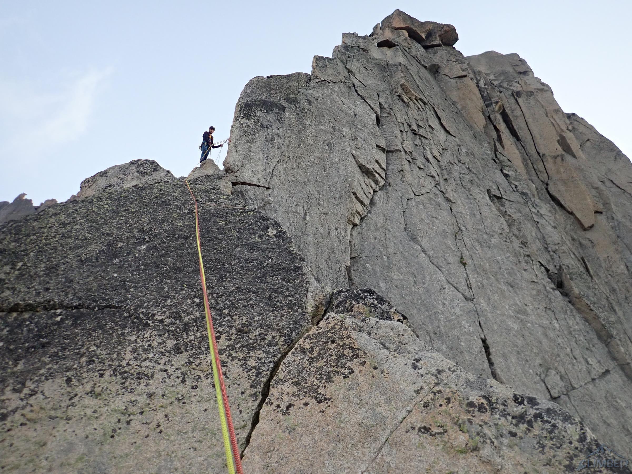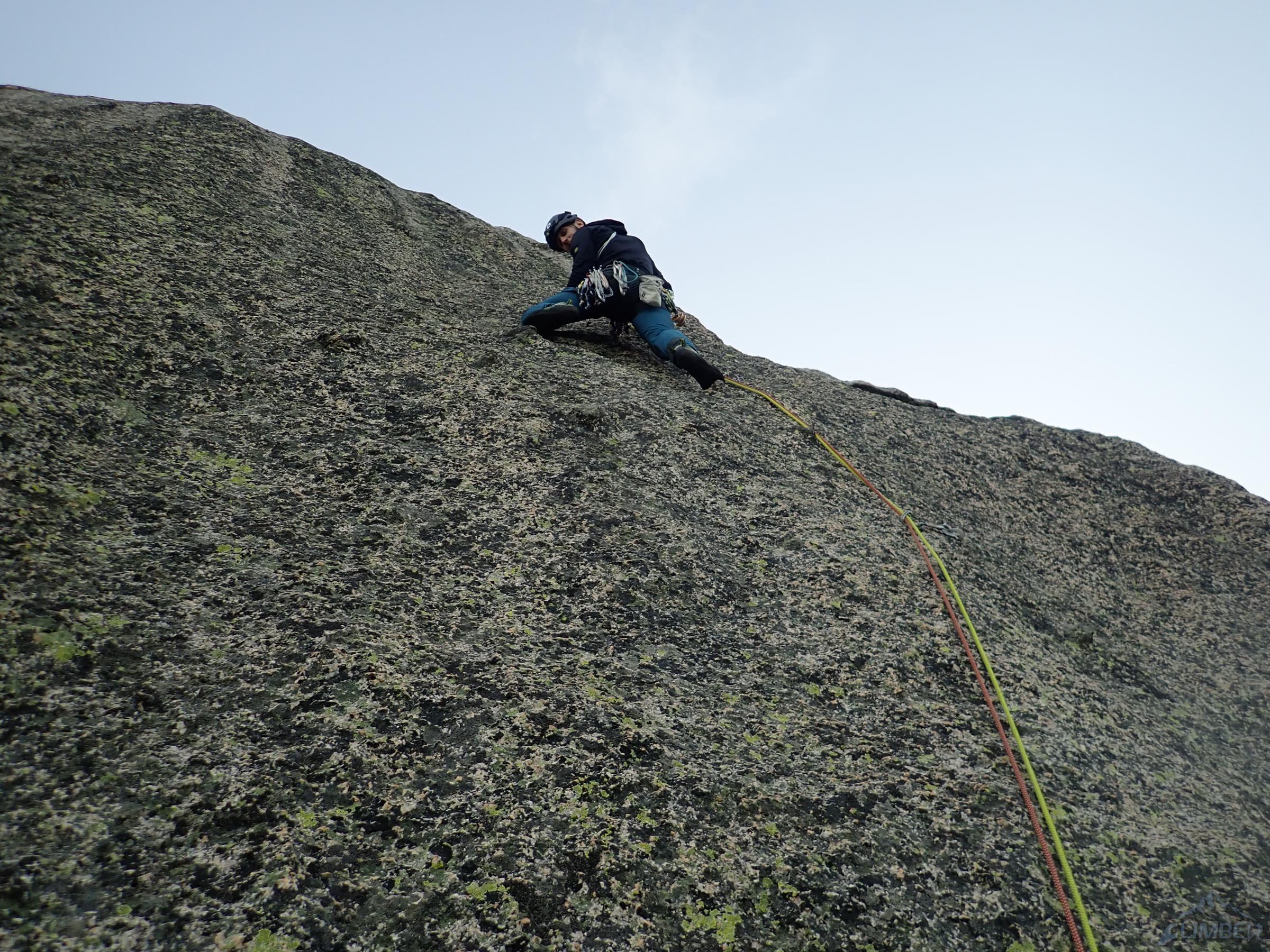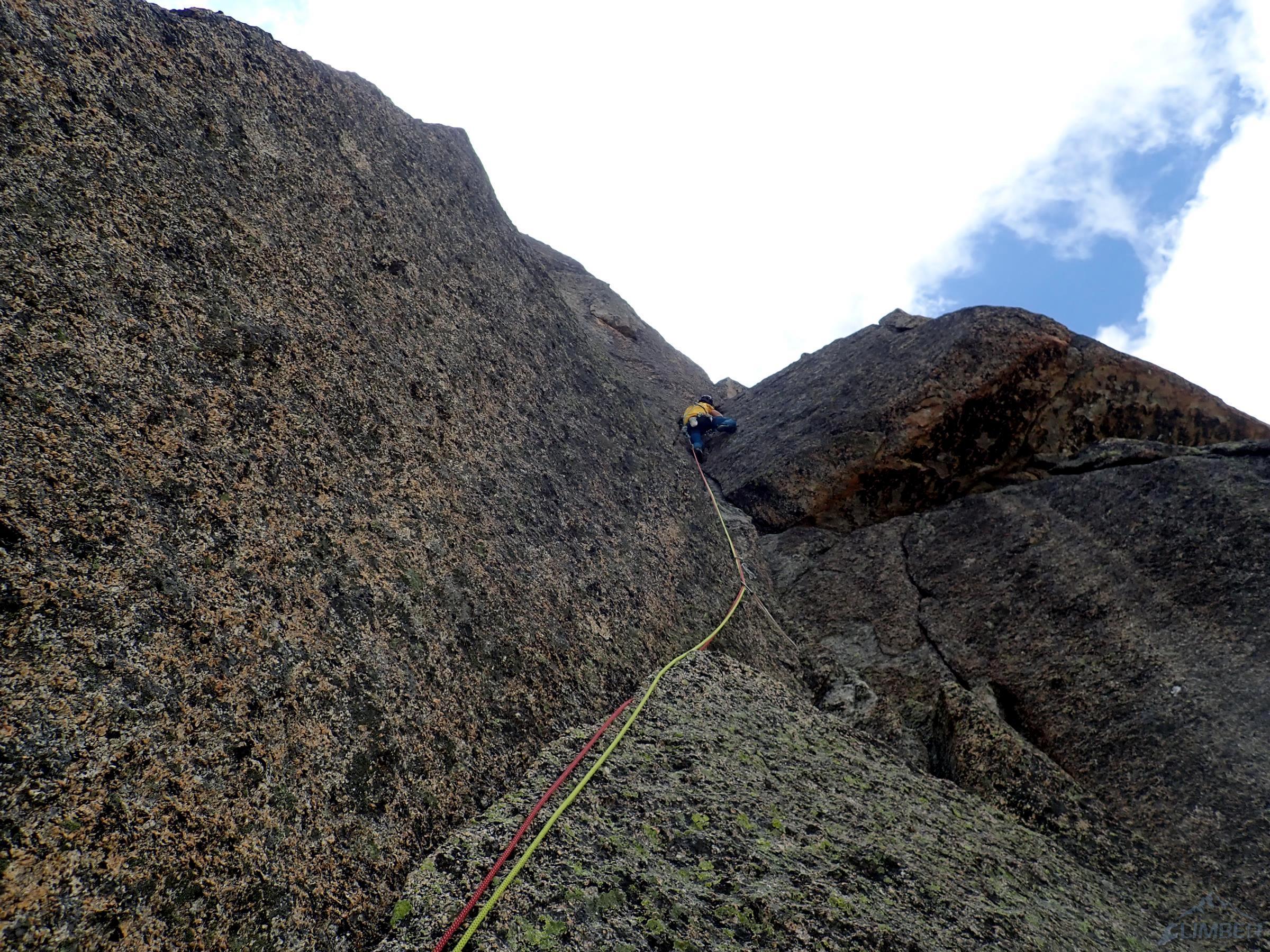 Drugiego dnia pobytu na Enversach (pierwszego robiliśmy Pedro Polar) bierzemy z Romkiem na celownik jedną z najsłynniejszych tutejszych pozycji, Republikę Bananową. Długa na około 950 metrów droga jest różnorodna i intensywna – osiem wyciągów jest w przedziale 6b-6c, a i wiele 6/6a+ trzyma klasę. Trudności są w kapitalnych zacięciach oraz płytach, ale jest też sporo interesujących rys. Po przejściu stwierdziliśmy, że by zebrać tyle ładnego wspinania trzeba by przejść na wschodniej i północnej Mnicha 4-5 dróg jednego dnia 😉. Linia przecina kilka turni (z jednej z nich nawet zjeżdżamy) wyszukując najpiękniejszych formacji i kończy się około 100 metrów poniżej wierzchołka Igły Republiki – dodatkowe trzy wyciągi można pokonać drogą normalną.