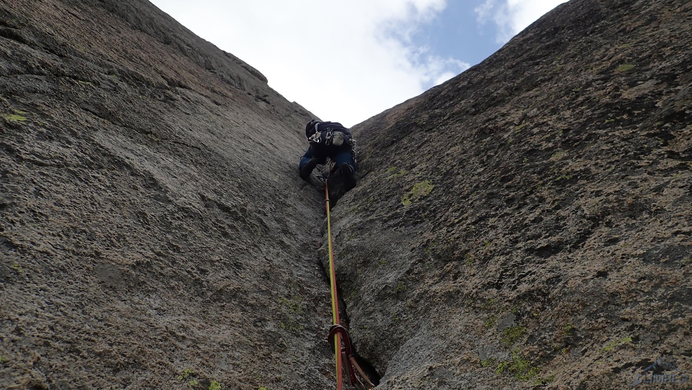 Sytuacja uratowana, nadal jednak sporo trudności przed nami. Pierwszy wyciąg w zacięciu (6b+) jest stosunkowo krótki, ale w jednym miejscu dość gładki – udaje mi się jednak poprowadzić w pierwszej próbie. Kolejny odcinek (6c) to już jednak prawdziwa „piękna i bestia” – ponad 40 metrów dość ciągowego wspinania, z kilkoma przewieszonymi odcinkami na których ręce puchną, a łydki drgają 😉. Mocno wątpimy czy uda się przejść klasycznie - wiemy, że z powodu późnej pory oraz zmęczenia mamy tylko po próbie by uporać się z tak długim i wymagającym odcinkiem. Romek staje jednak na wysokości zadania i mimo kilku ciężkich chwil prowadzi zacięcie OS-em (finalnie udaje się zrobić w tym stylu całą drogę). Idąc w ślady kolegi delektuję się wspaniałymi ruchami, podziwiając jednak wytrzymałość kolegi który spędził tutaj prawie godzinę powoli pnąc się do góry i zakładając sprzęt (zużyty do zera!).