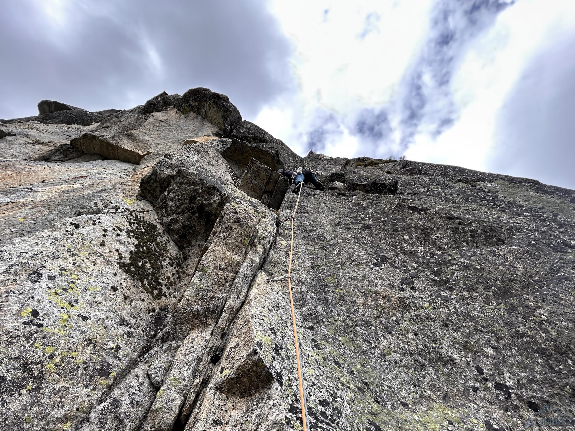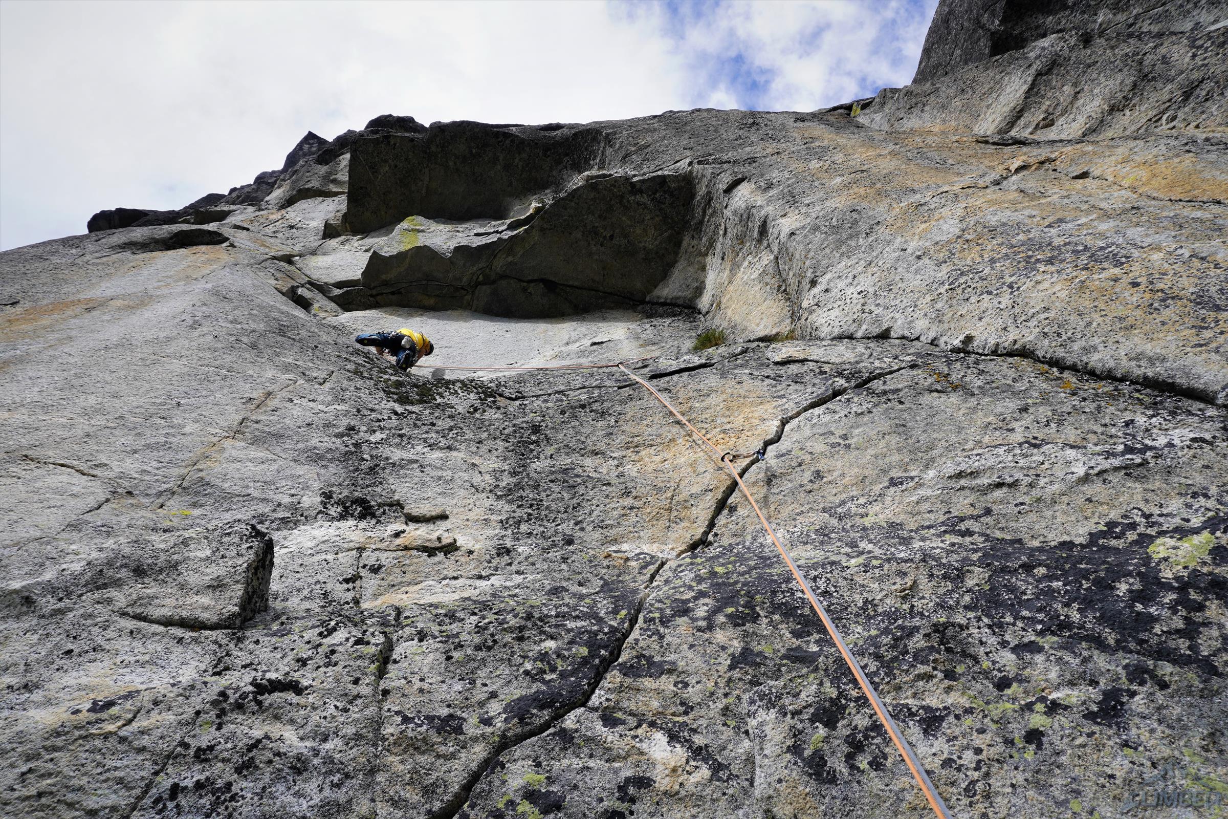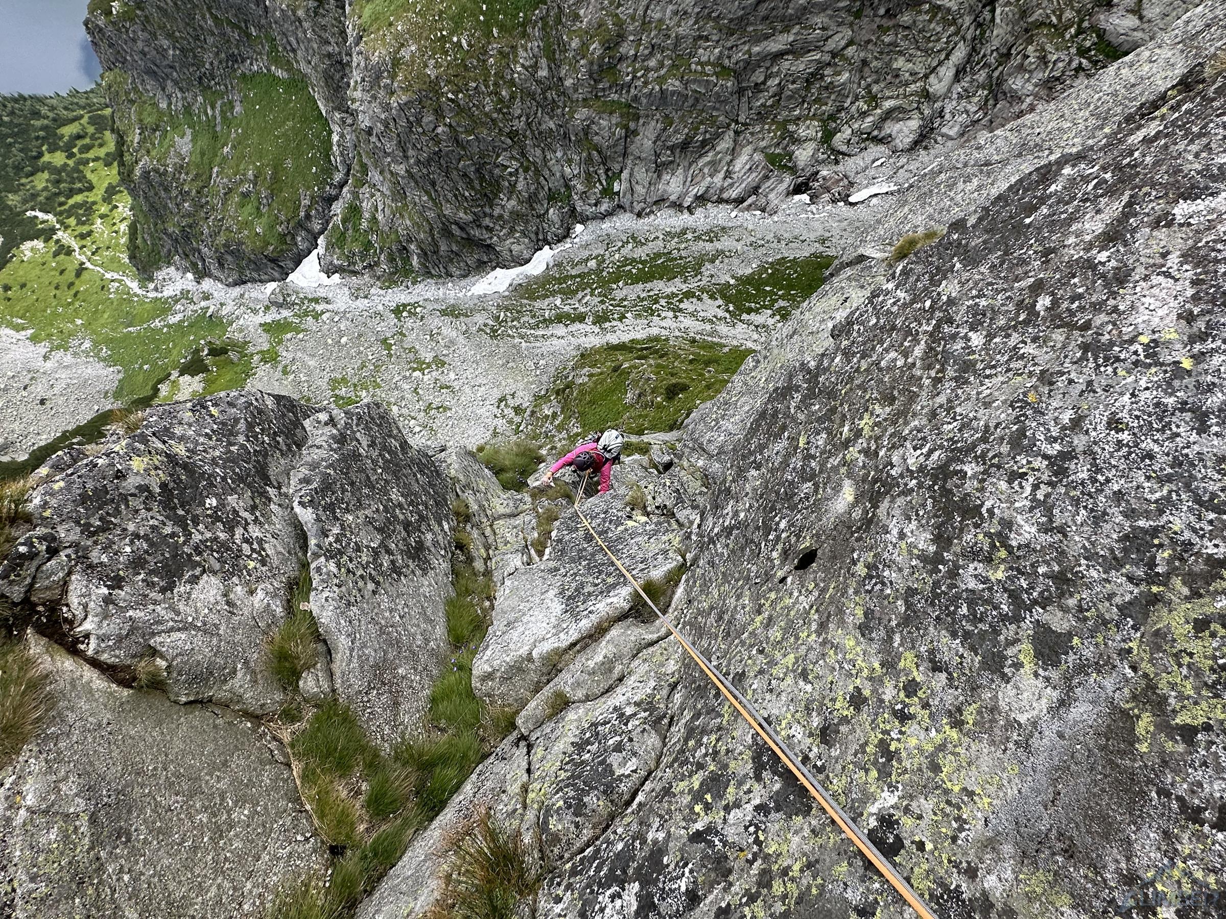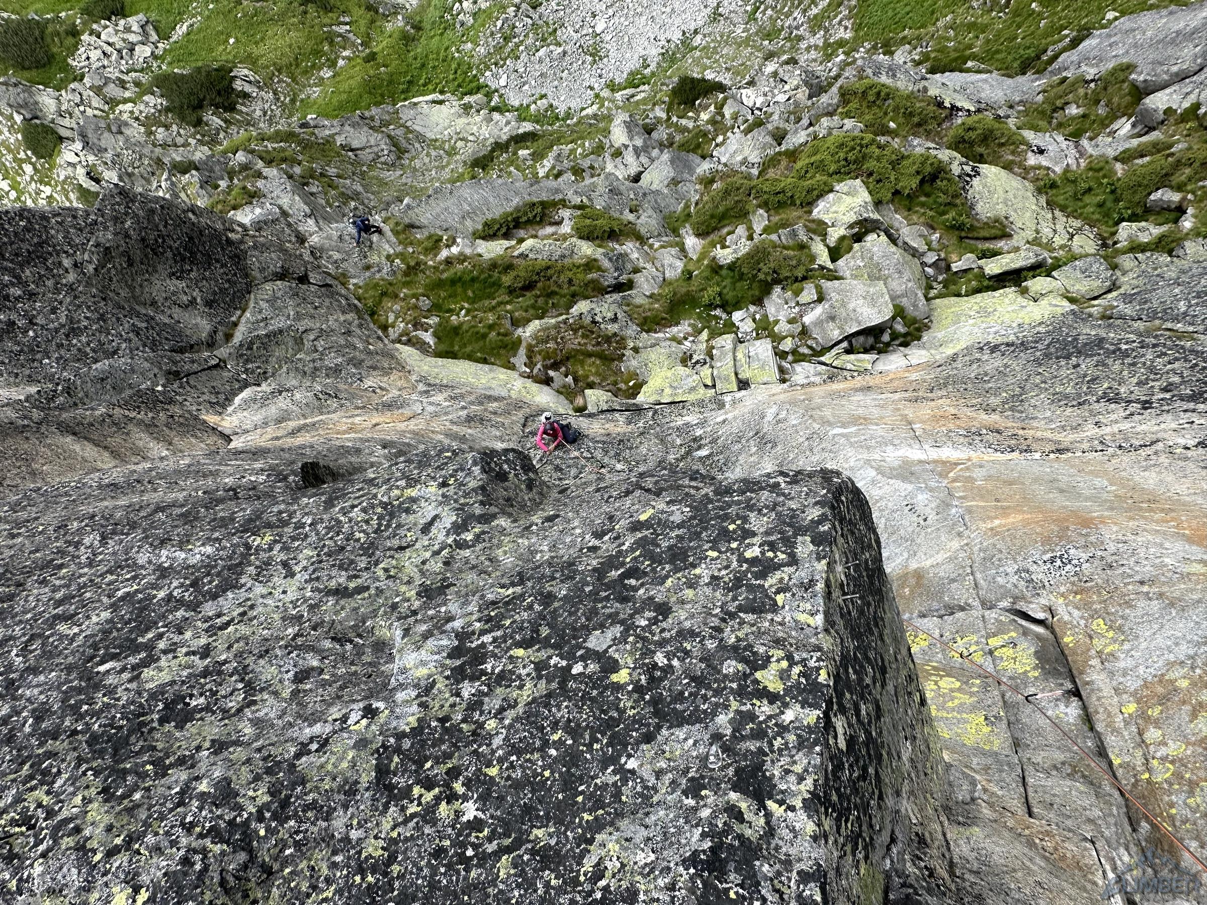 Weekendowy pobyt w Morskim Oku podczas klubowego obozu. Po kilku dniach opadów i niskiej temperatury sobota zapowiada się pogodnie tylko do południa. Wschodnia ściana Mnicha od rana jest w Słońcu i jako jedna z nielicznych przesycha, daje to więc nadzieję na szybkie przejście czegoś krótkiego. Po integracji do późnych godzin nocnych podejście jest bardziej męczące niż zazwyczaj, w końcu jednak docieramy na miejsce. Chmury już gęstnieją, proponuję więc Ani by spróbować przynajmniej Fereńskiego (oryg. VII/VII+), na którym główne trudności oferuje pięknie prezentujący się pierwszy wyciąg.