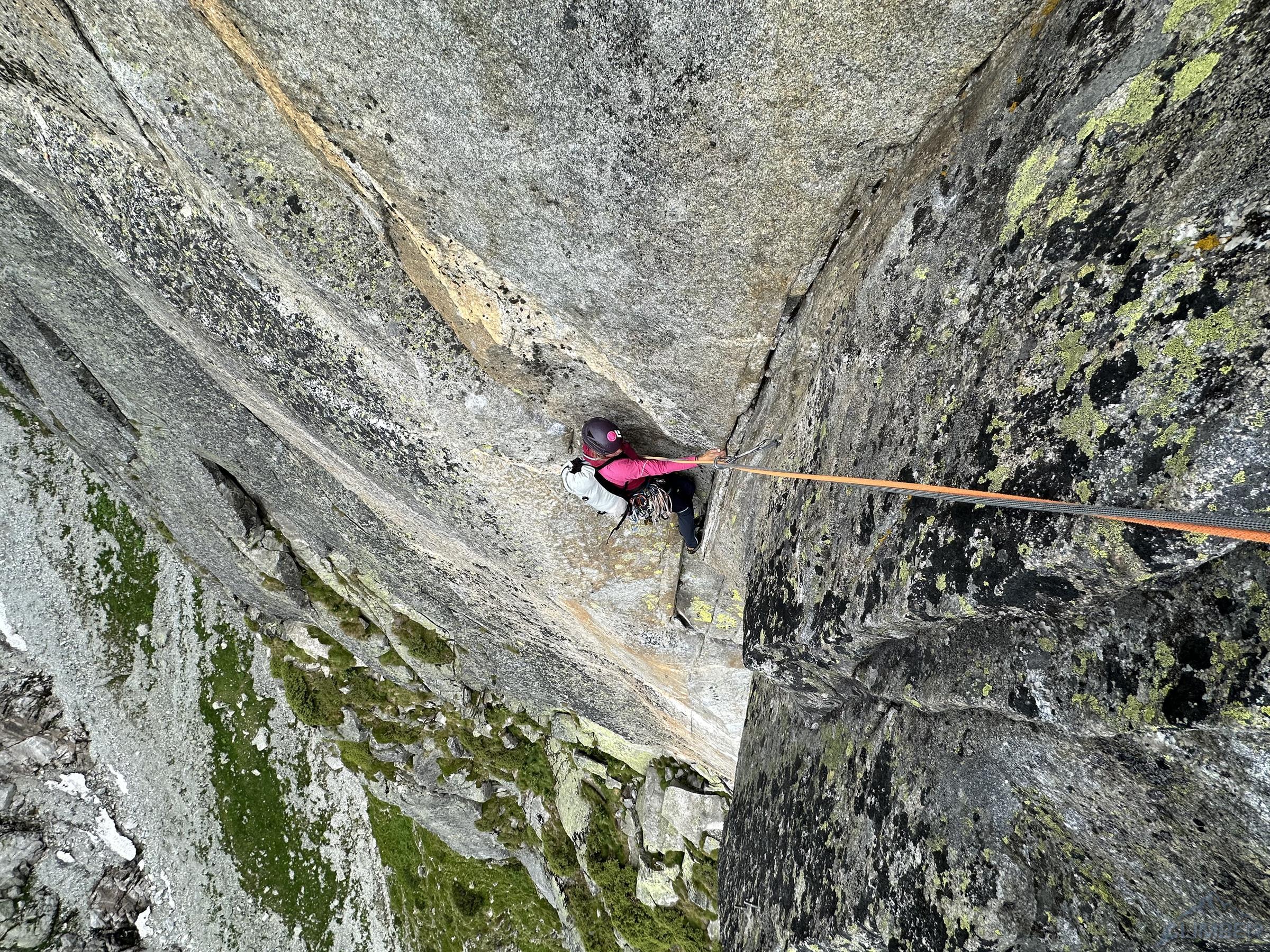 Drugi wyciąg zaczyna się od zaskakująco kąśliwego przewinięcia przez okapik (VI+, spit), wyżej robi się już łatwiej. Kontynuujemy wzdłuż rysy (V+, spity) i po 15 metrach docieramy do półki, do której z prawej strony dochodzi Hobrzański. Nie zatrzymując się kontynuujemy zacięciem (V) kolejne 15 metrów do stanowiska pod przepięknym Zacięciem Kosińskiego. Na Górne Półki najłatwiej dostać możemy się ostatnim wyciągiem Międzymiastowej (VI+), my jednak postanawiamy zrobić to Kosińskim, z którym mam stare porachunki – takie zakończenie jest zresztą bardziej logiczne i eleganckie. Zacięcie pokonujemy na własnej asekuracji i posiada ona dwa trudniejsze, przewieszone fragmenty – dolny z szerszą rysą (ok. VII-) i górny z wąskim pęknięciem (VII). Będąc tu już po raz trzeci tym razem udaje się poprowadzić w pierwszej próbie, nadal stwierdzam jednak że łatwo nie jest 😊.