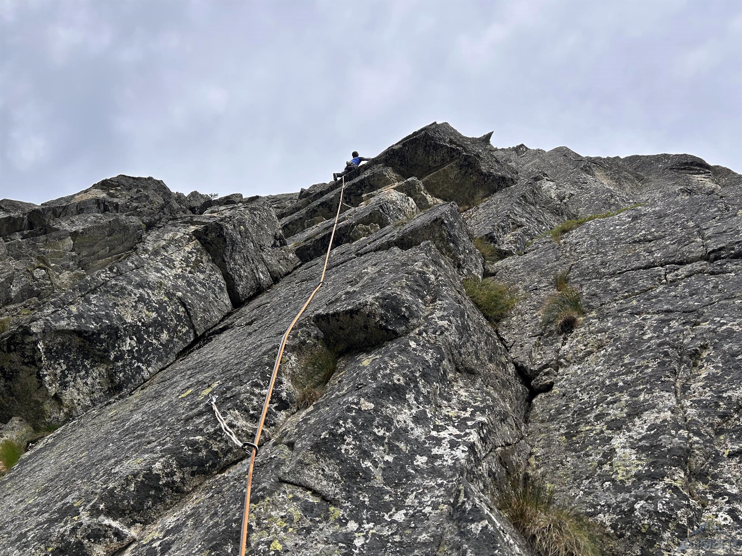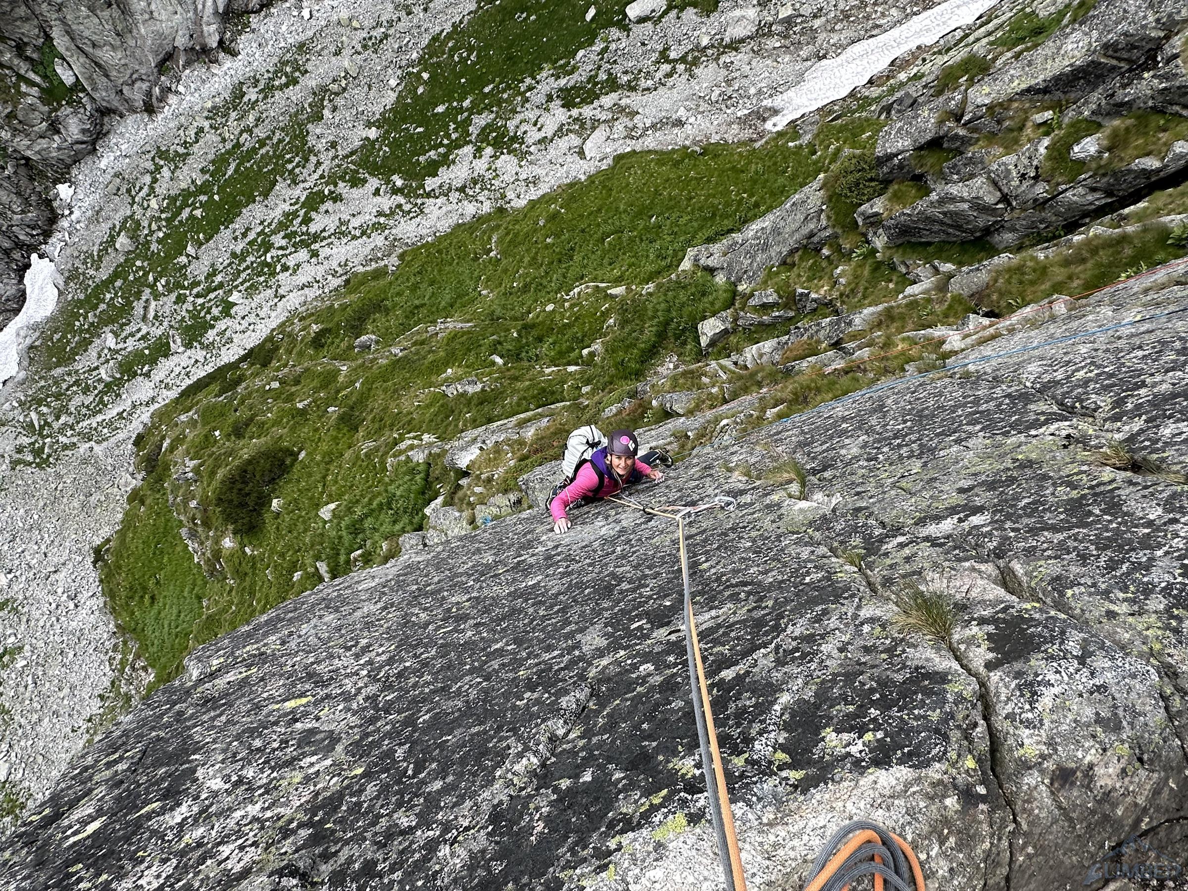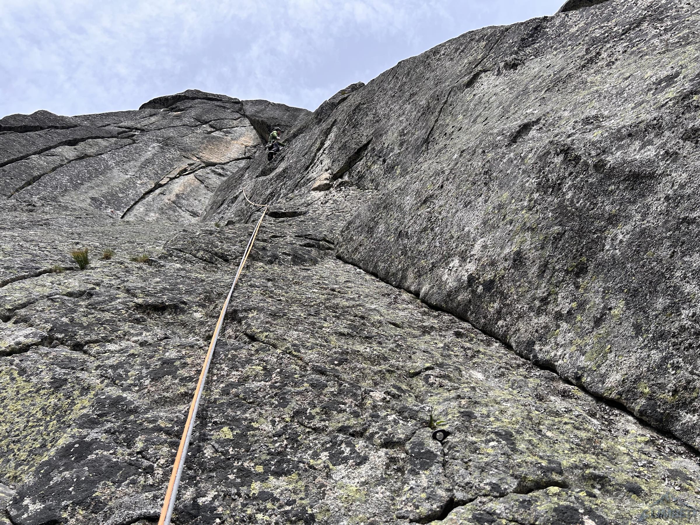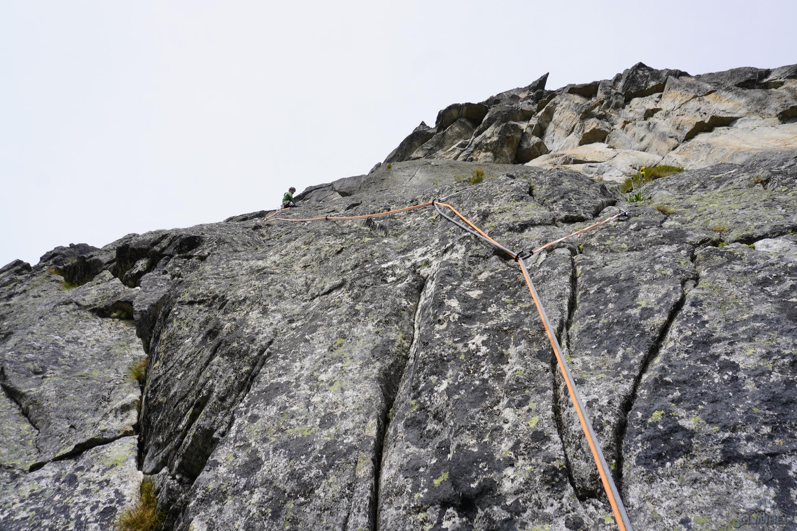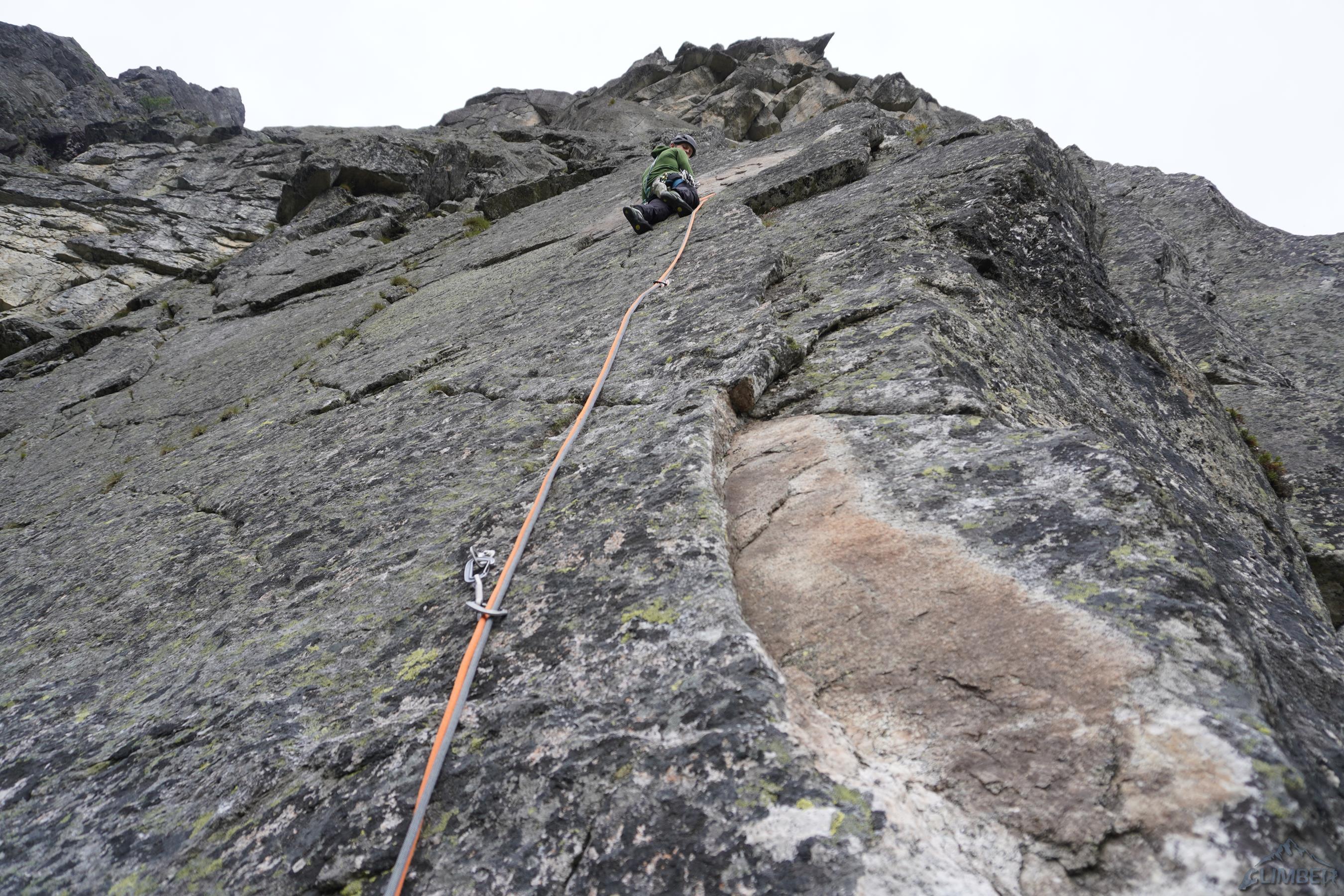 Pierwszy wyciąg (25m) zaczynamy od przyjemnego kanciku (VI), z którego kierujemy się w stronę podciętej płyty – przewinięcie na nią przez okapik jest cruxem dolnej części drogi (VII+). Miejsce jest dość trikowe, tym razem dobrze trafiam z ustawieniem i przechodzę je bez problemu – pozostaje dojście do stanowiska wzdłuż cienkiej ryski (ok. VI+). Drugi odcinek (30m) prowadzi bardzo ładną płytą, po całkiem sprężnym starcie (VII-) robi się łatwiej (VI/VI+) i wystarczy spokojnie robić kolejne przechwyty po dobrych krawądkach. Po dotarciu do stanowiska z którego zjeżdżaliśmy robimy krótką przerwę, zabieramy pozostawione rzeczy (nie było sensu jechać z nimi w dół) i ruszamy dalej.