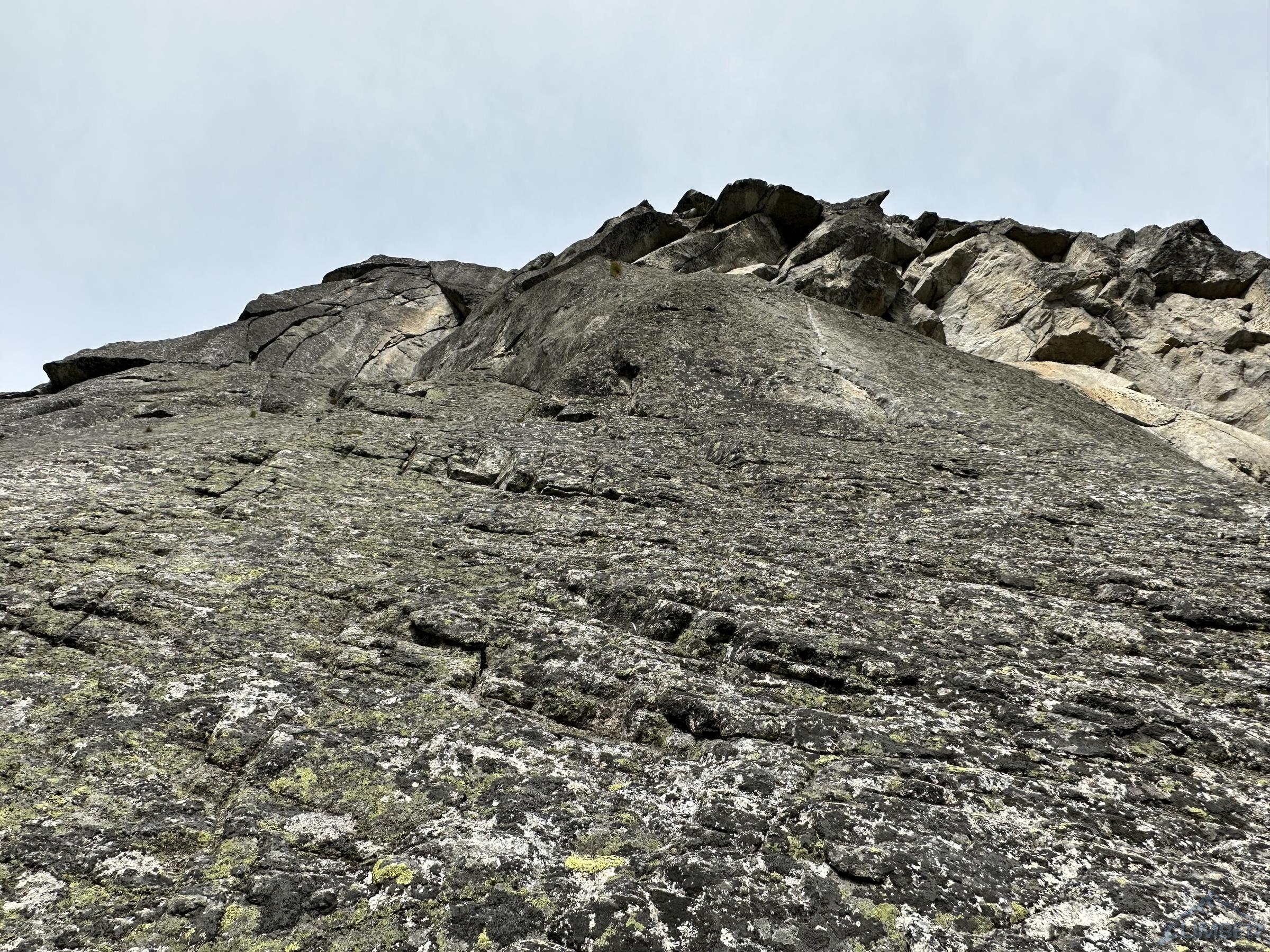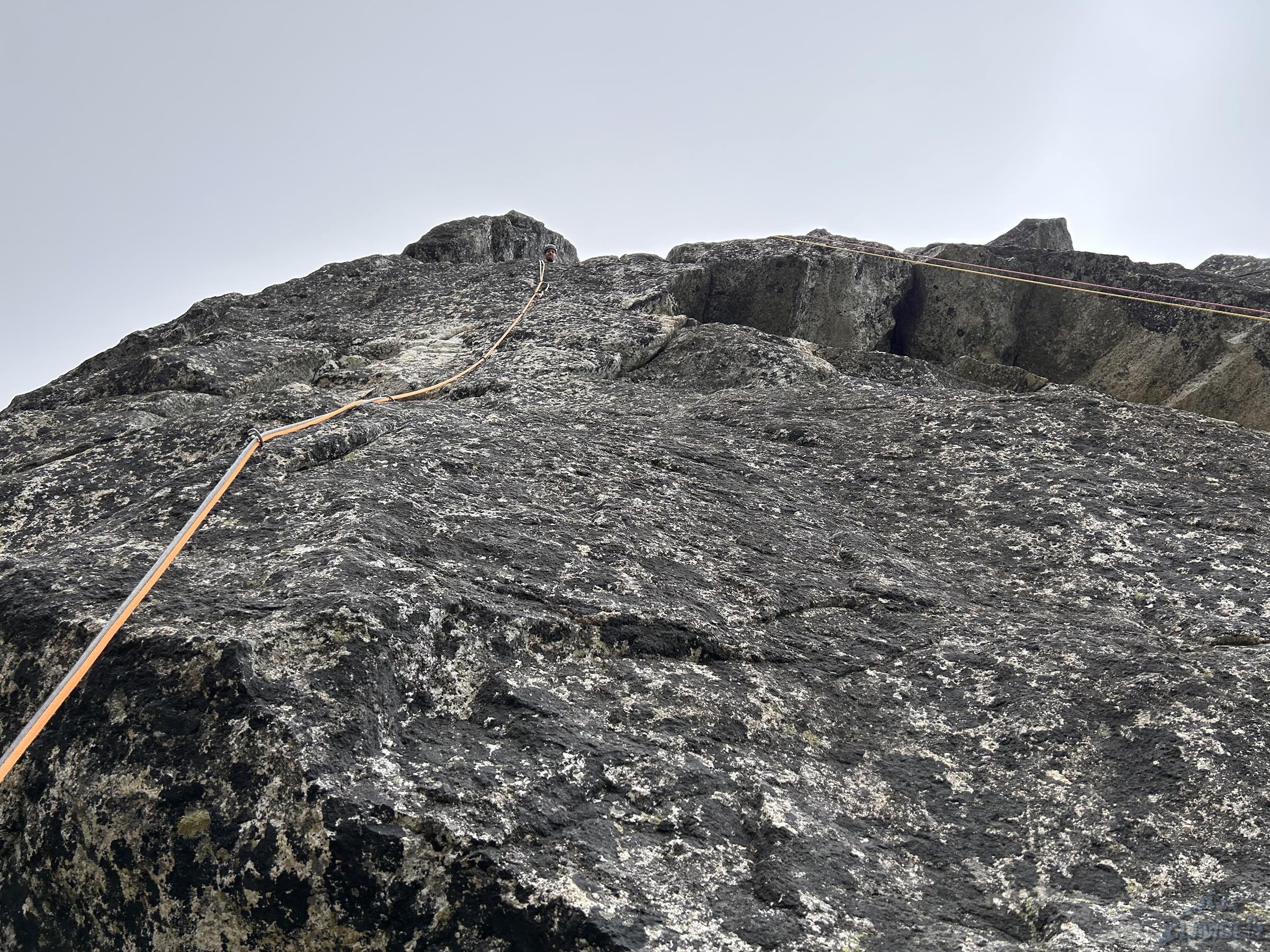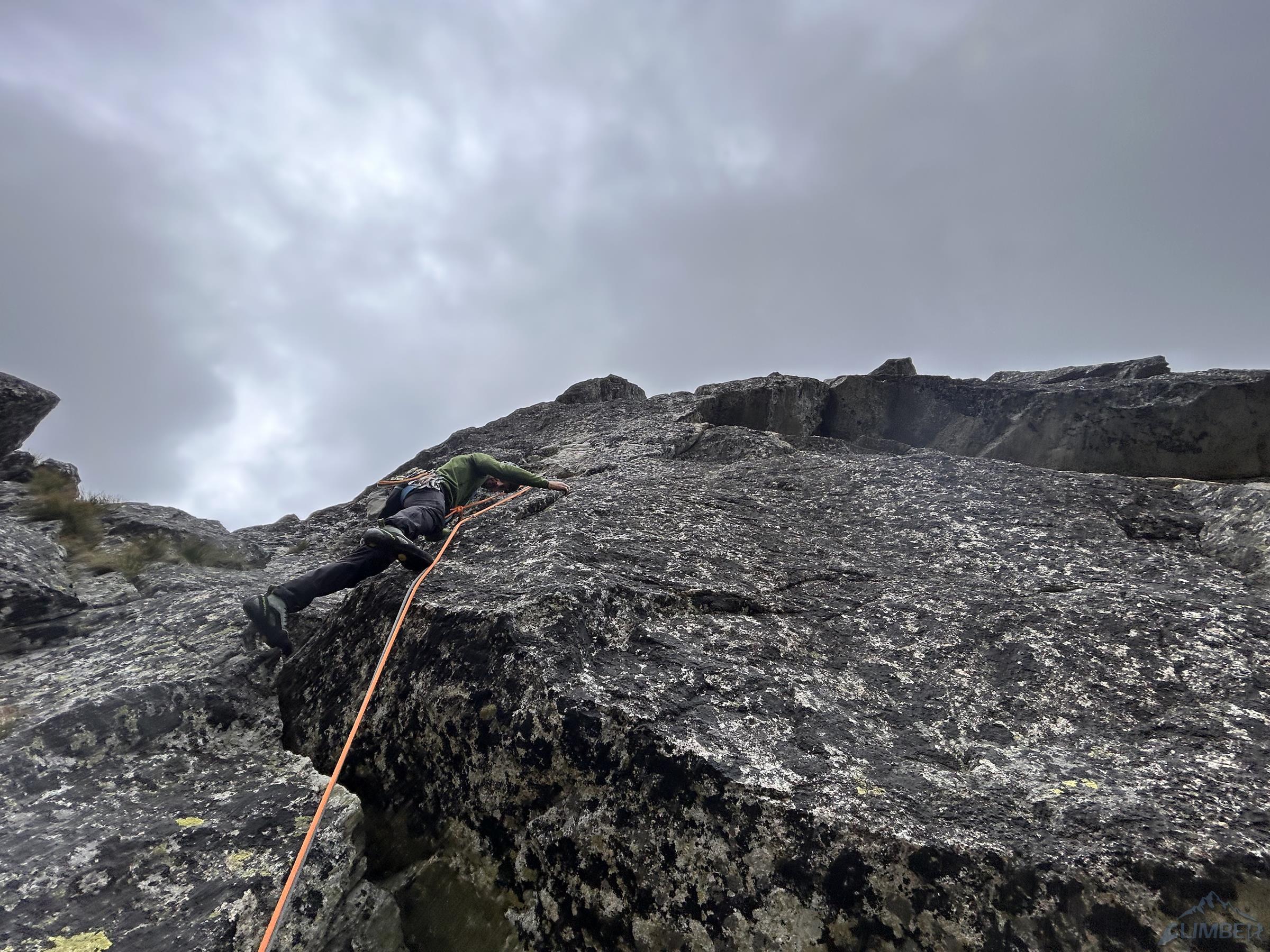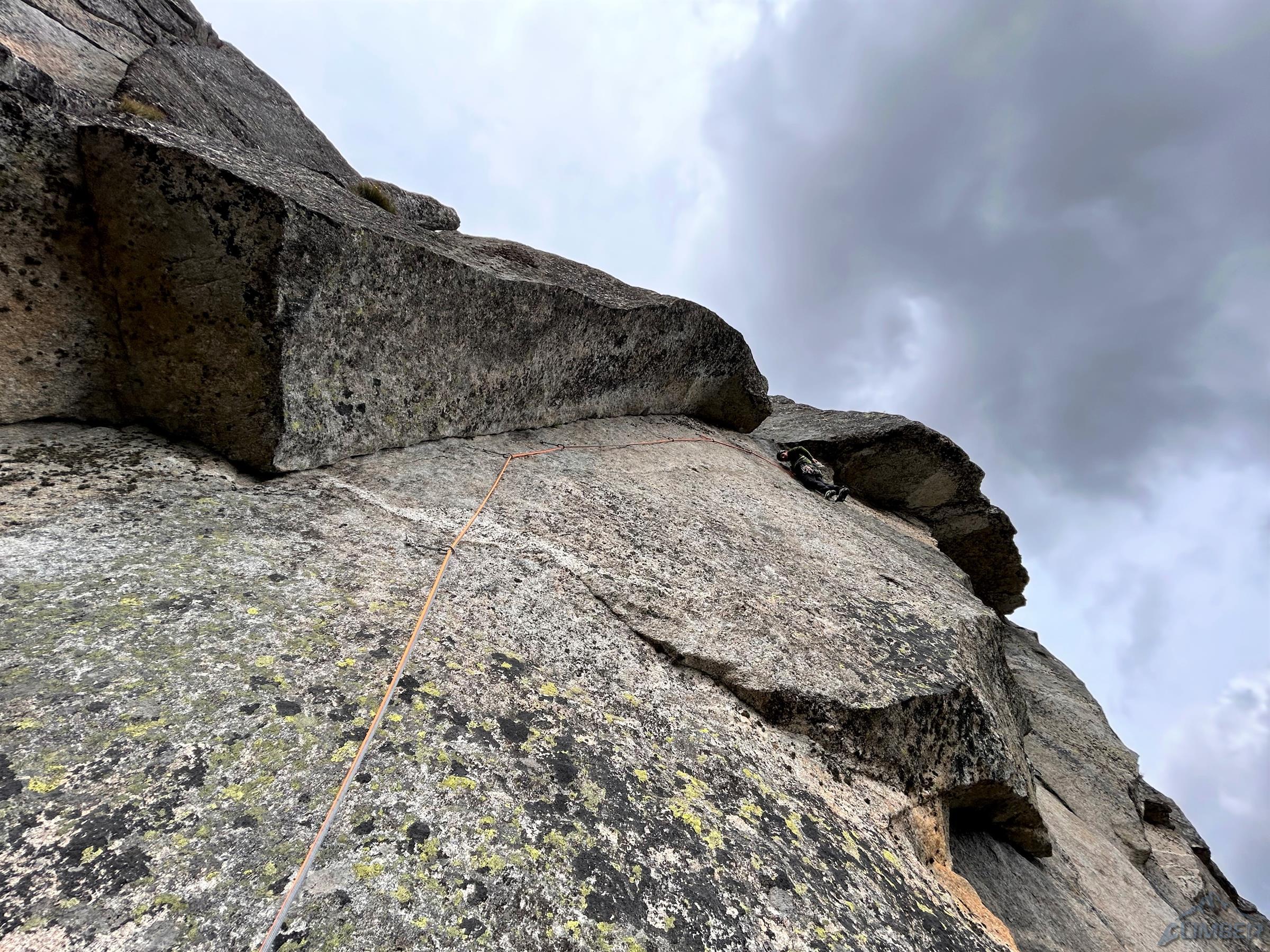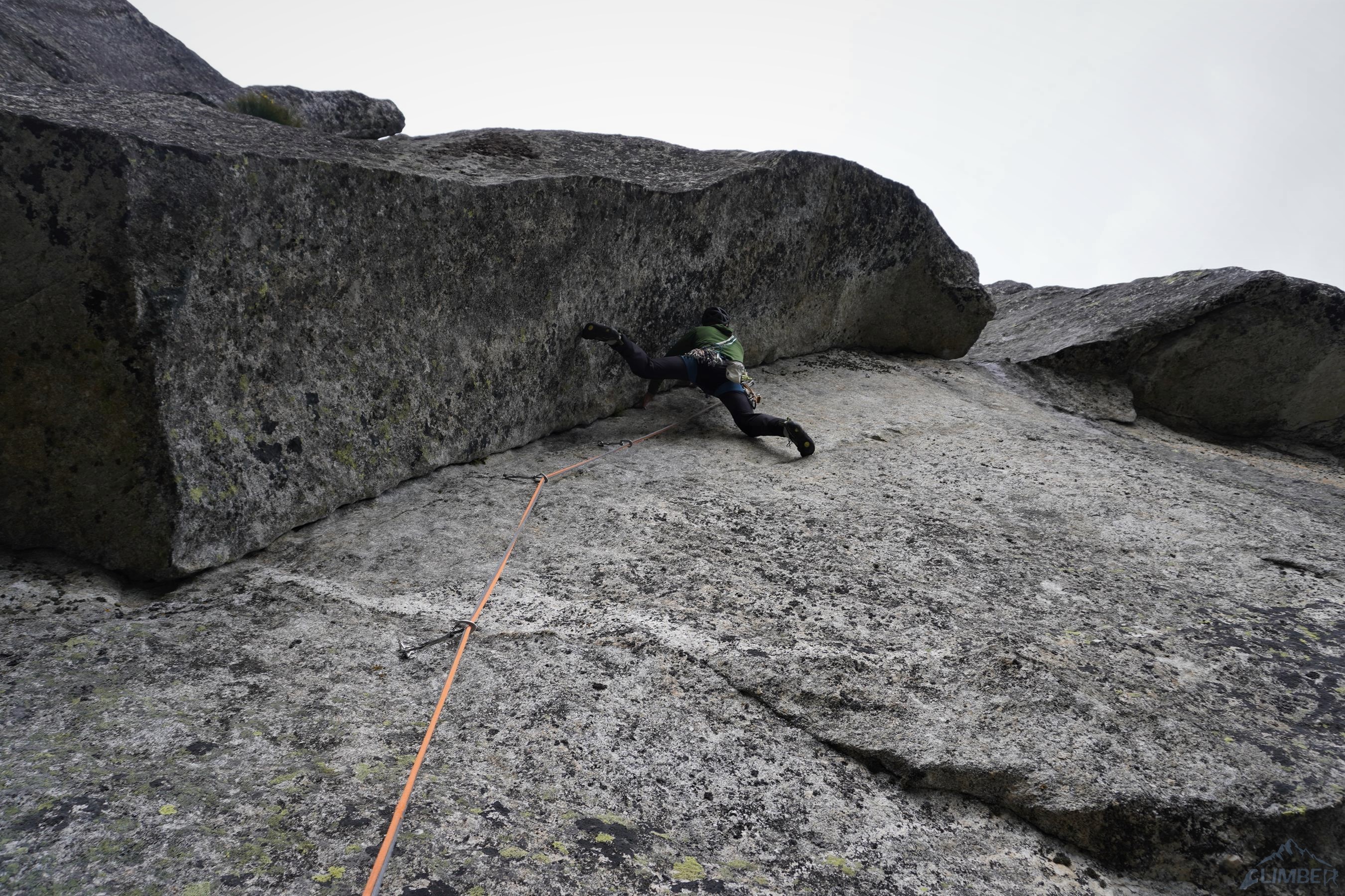 Odcinek szósty (20m) okazuje się największym wyzwaniem na drodze (mimo wyceny VIII sporo osób twierdzi, że jest kluczowy) – spędzam na nim mnóstwo czasu, a Ania marznie na niewygodnym stanowisku gdyż pogoda robi się coraz gorsza i ewidentnie deszcz wisi w powietrzu. Po ciekawym trawersie wzdłuż obłej rysy odbija się do góry wzdłuż kantu, za który trzeba się przewinąć na słabo urzeźbioną płytę – miejsce jest niezwykle techniczne i początkowo nie wierzę, że uda mi się je przejść. Na szczęście trzecia próba okazuje się skuteczna – kolejnej mogłoby nie być gdyż palce odmawiają już posłuszeństwa, a czarne chmury nie pozwalają na chociażby krótki rest pomiędzy wstawkami. Po przejściu cruxa pozostaje jeszcze pokonanie uklamionej przewieszki (VI) i wyjście na wielką, wygodną (uff) półkę z okapem, pod którym w razie konieczności będzie można przeczekać deszcz 😉.