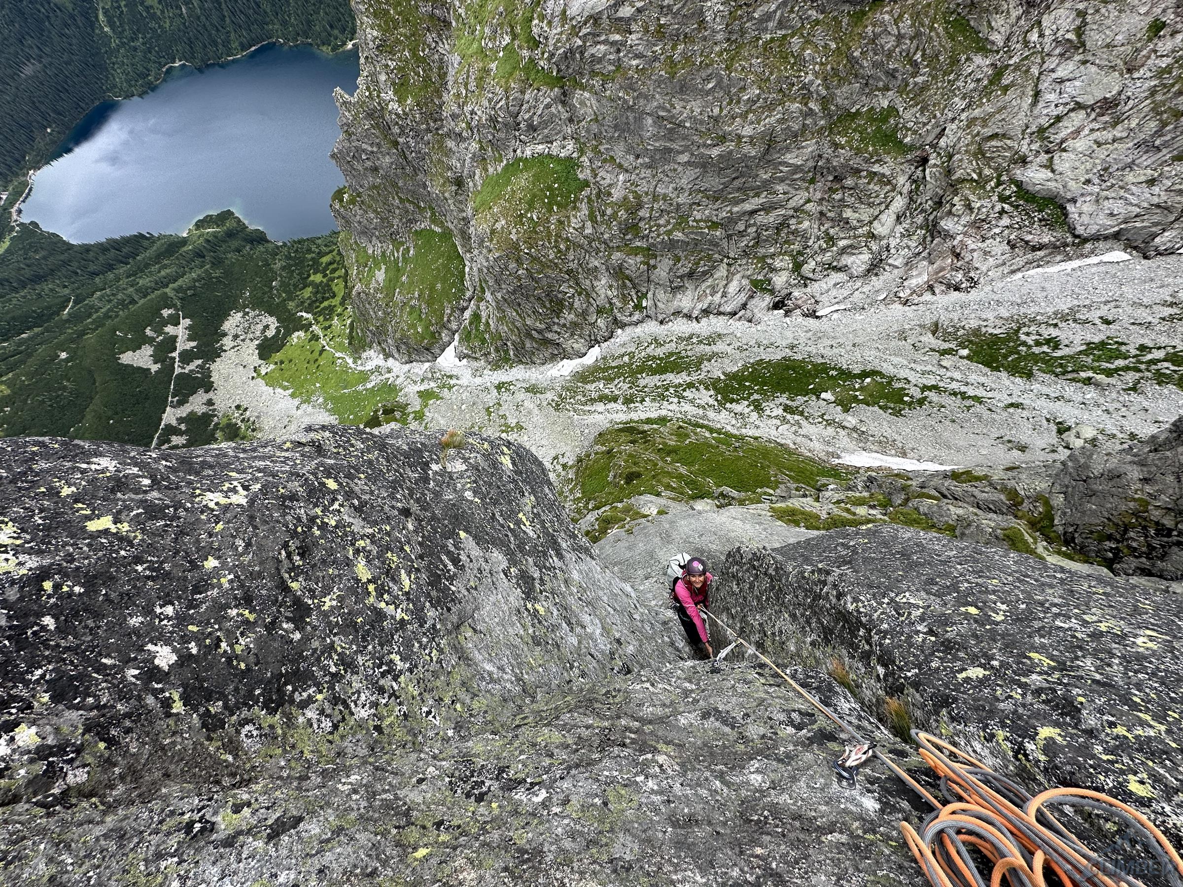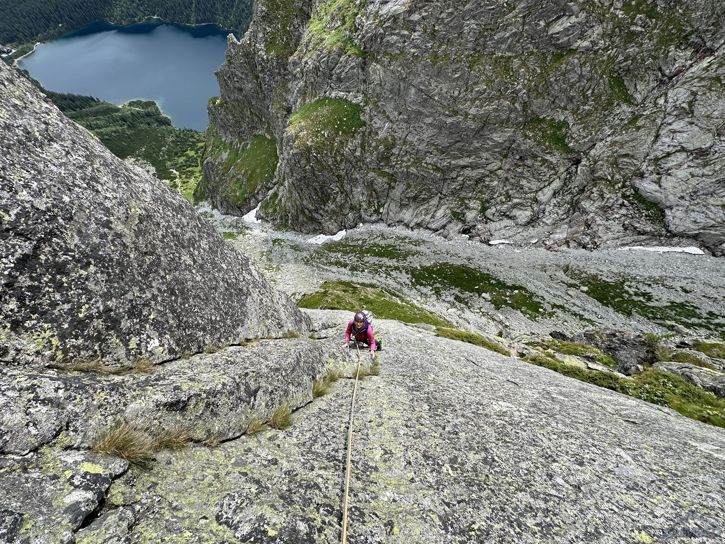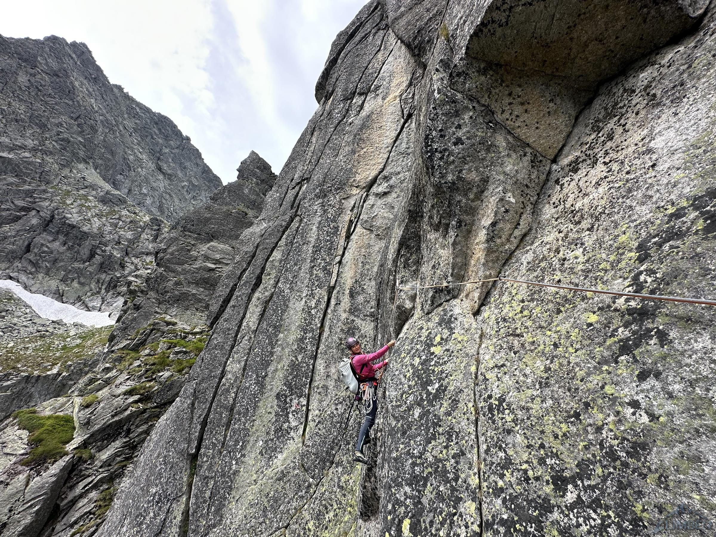 Ostatni wyciąg (25m) to wisienka na torcie – zaczynamy pięknym płytowym kancikiem (ok. VII) i docieramy do bardzo ciekawego miejsca, niknącej rysy z oddaloną klamą. Nieewidentną sekwencję (tutaj bardziej VIII niż VIII-) odkrywam dopiero po dłuższym wiszeniu, wracam do stanowiska i prowadzę raz jeszcze – tym razem skutecznie. Po wyjściu z trudności mijam ostatnie stanowisko na półce i wychodzę na oddalony o zaledwie kilka metrów wierzchołek. Po chwili jest przy mnie Ania i wspólnie cieszymy się z przejścia jednej z najlepszych tatrzańskich dróg w życiu. Gdy tylko zaczynamy zjazd zaczyna padać – kolejny raz potwierdza się, że w górach poza umiejętnościami i dobrym planowaniem/logistyką przydaje się też szczęście 😊.