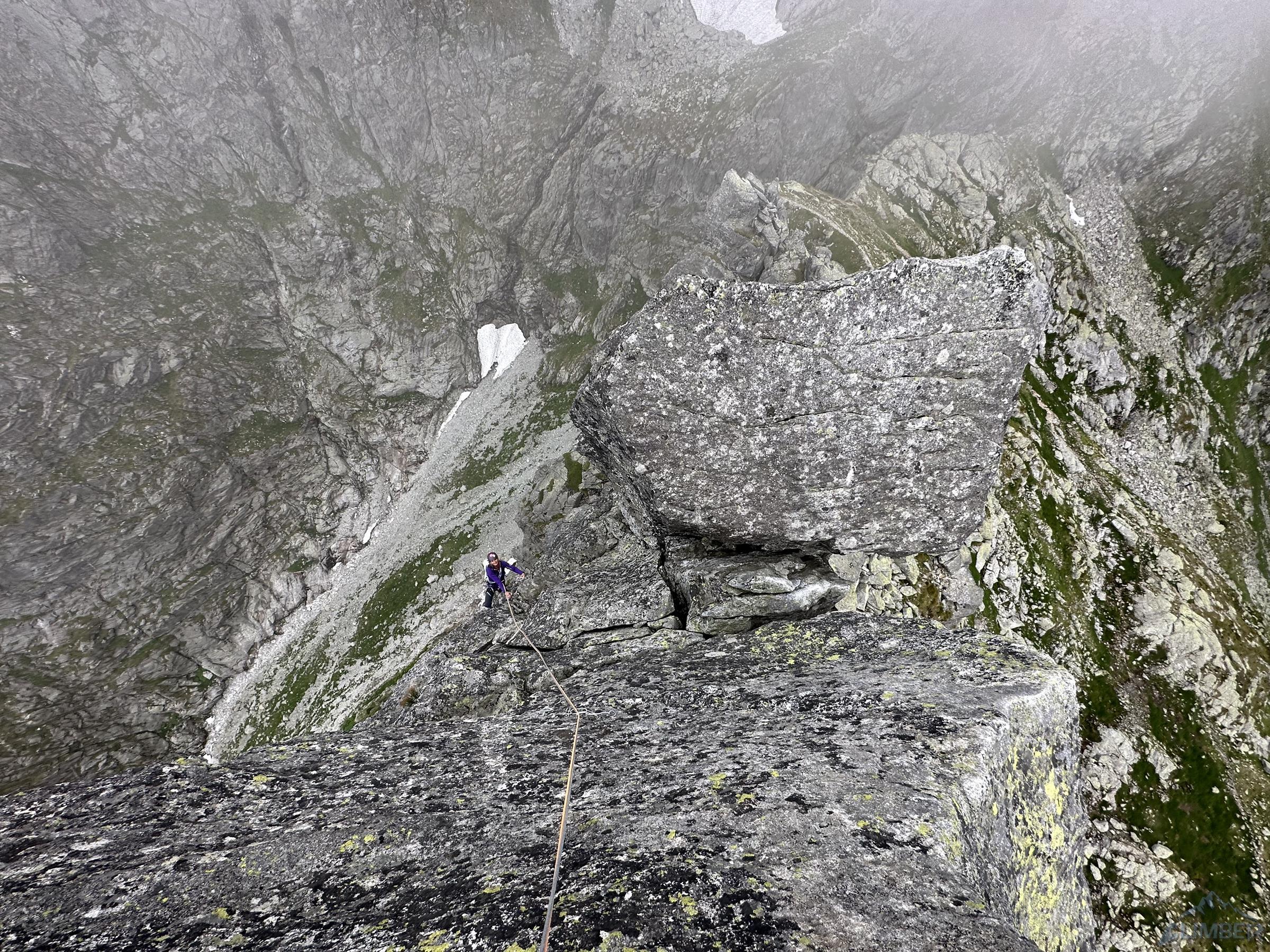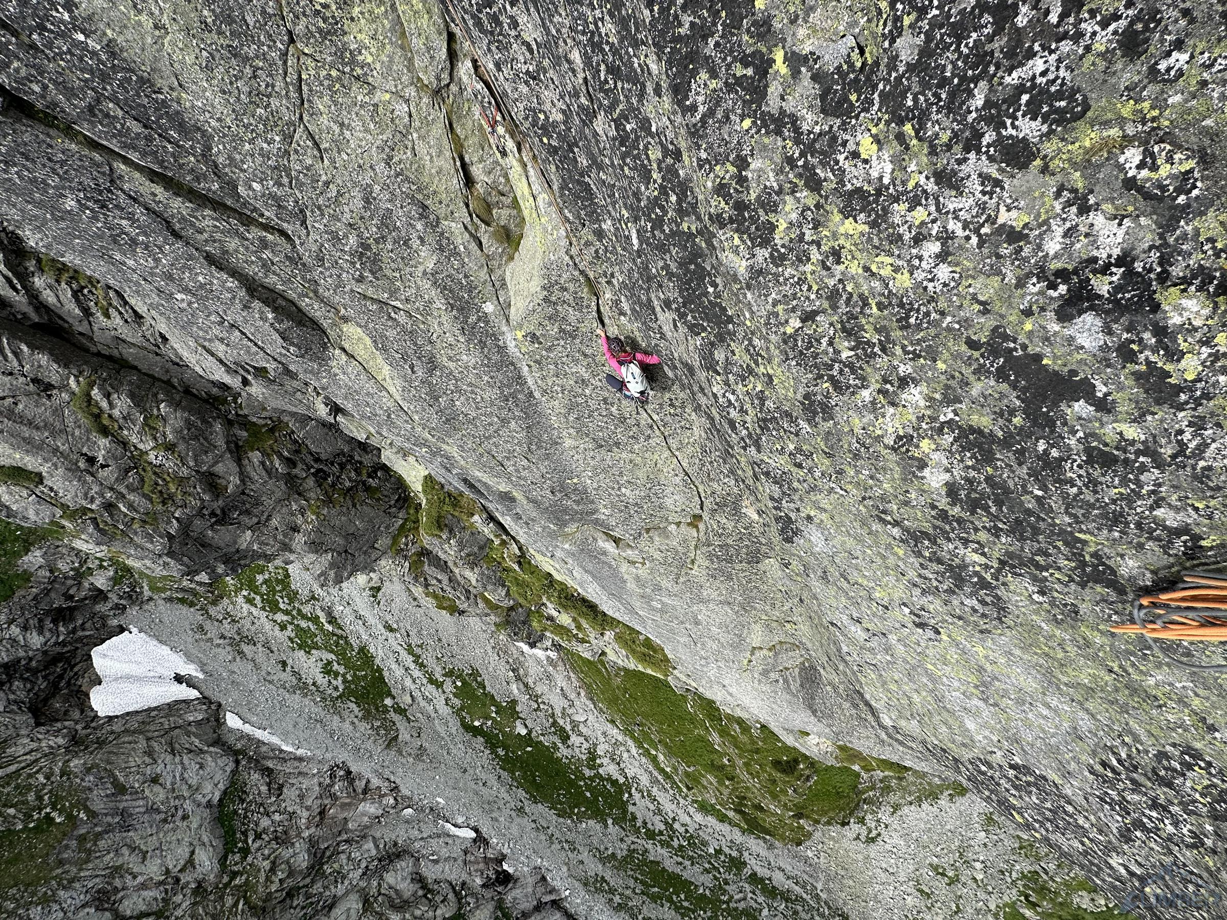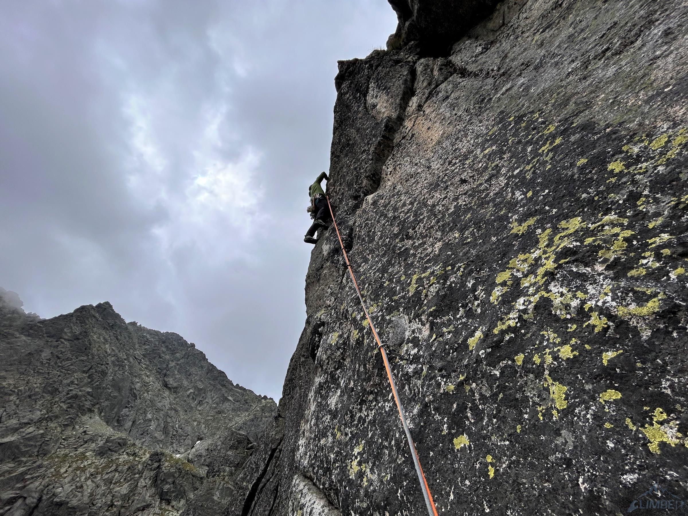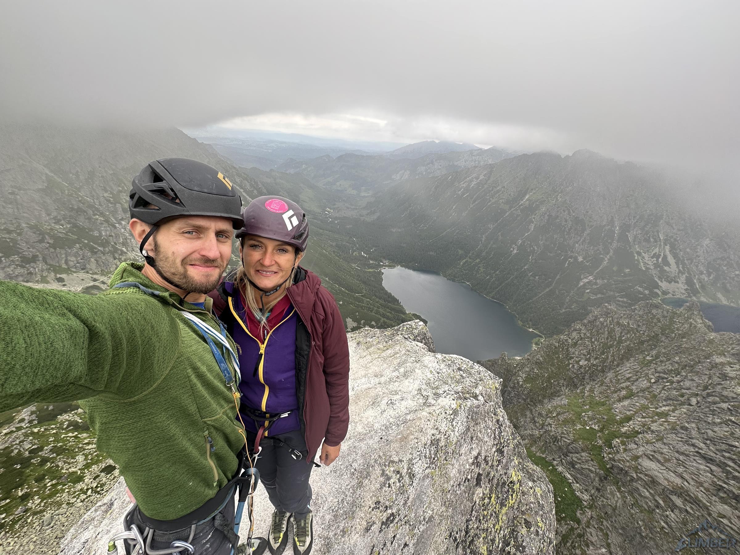 Ostatni wyciąg (25m) to wisienka na torcie – zaczynamy pięknym płytowym kancikiem (ok. VII) i docieramy do bardzo ciekawego miejsca, niknącej rysy z oddaloną klamą. Nieewidentną sekwencję (tutaj bardziej VIII niż VIII-) odkrywam dopiero po dłuższym wiszeniu, wracam do stanowiska i prowadzę raz jeszcze – tym razem skutecznie. Po wyjściu z trudności mijam ostatnie stanowisko na półce i wychodzę na oddalony o zaledwie kilka metrów wierzchołek. Po chwili jest przy mnie Ania i wspólnie cieszymy się z przejścia jednej z najlepszych tatrzańskich dróg w życiu. Gdy tylko zaczynamy zjazd zaczyna padać – kolejny raz potwierdza się, że w górach poza umiejętnościami i dobrym planowaniem/logistyką przydaje się też szczęście 😊.