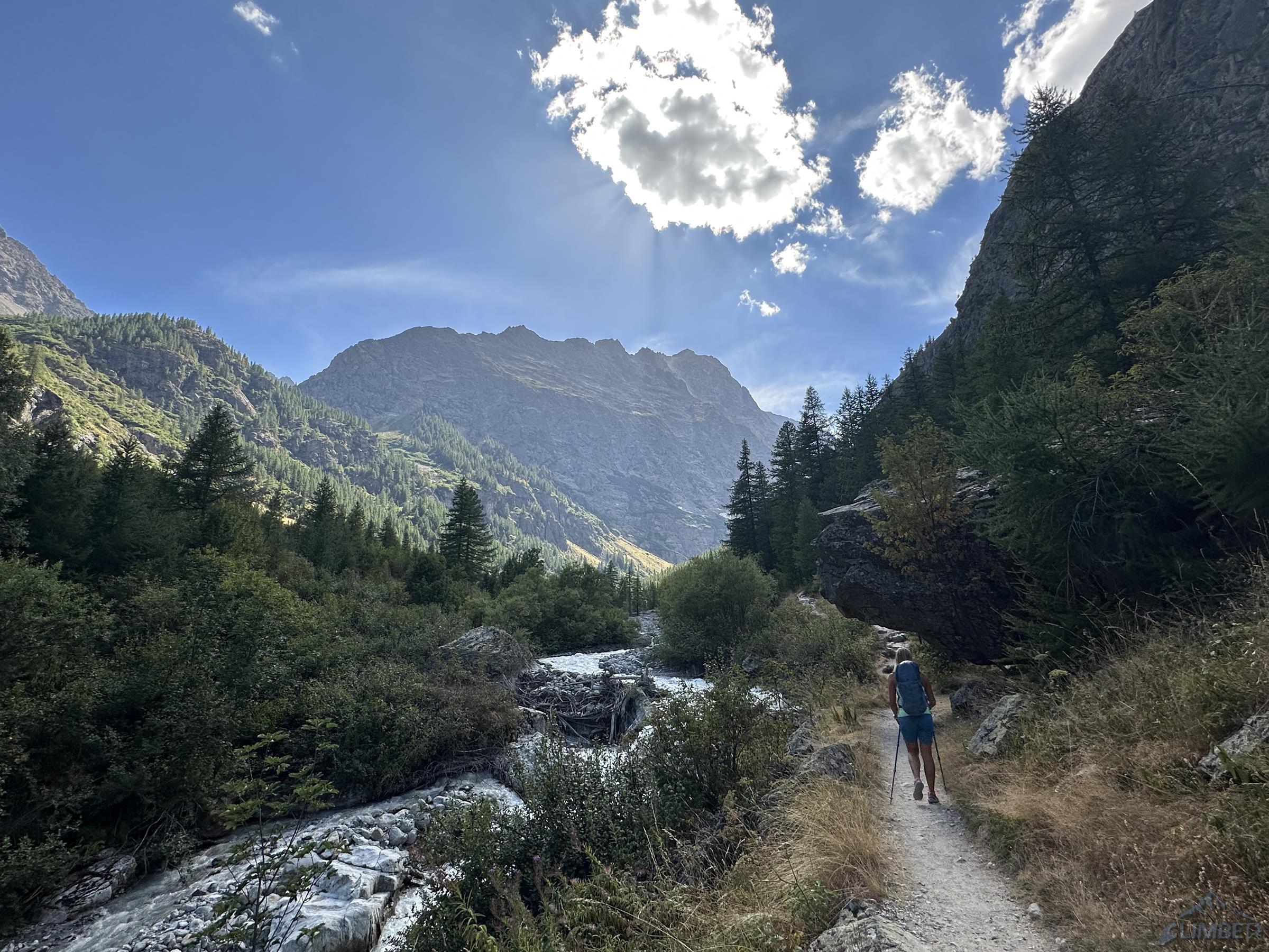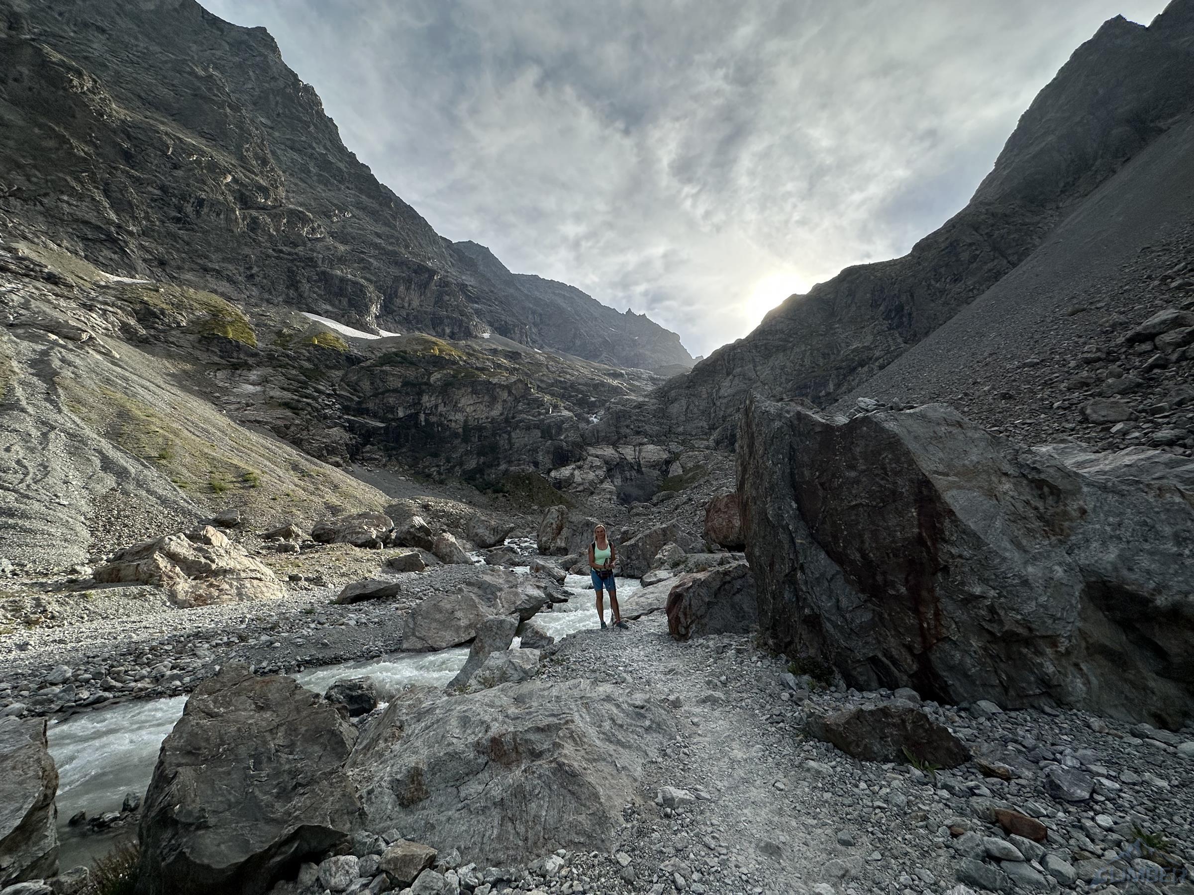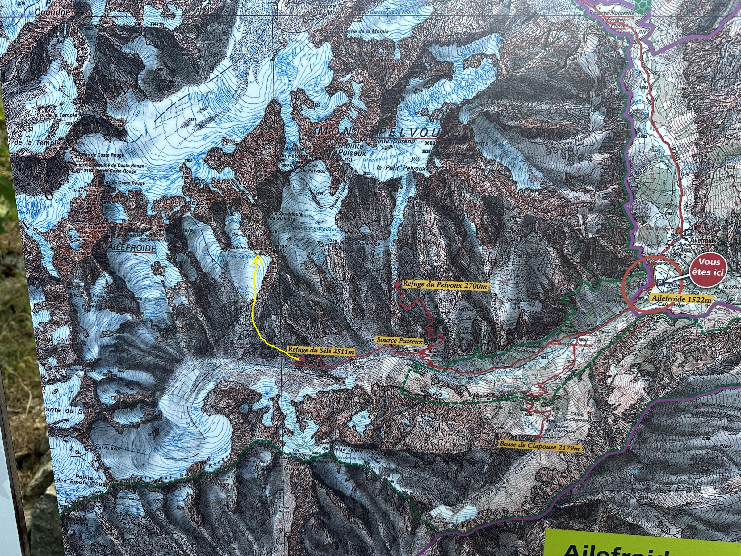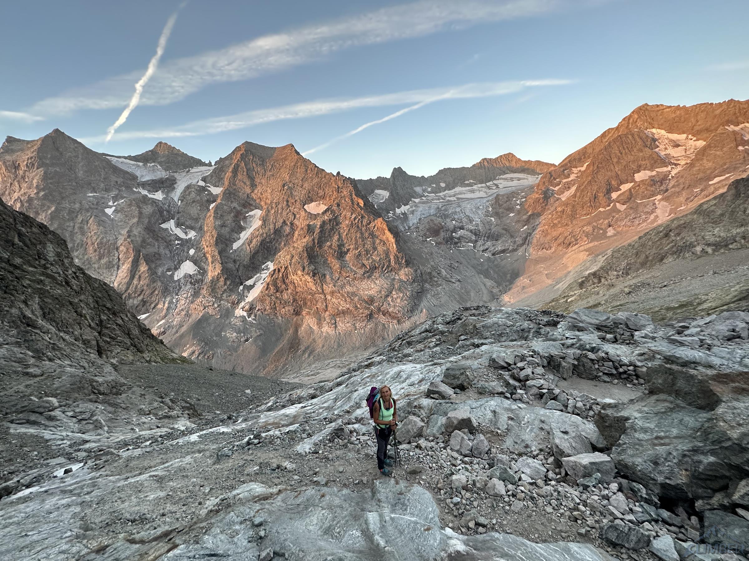 Ponieważ nasz cel położony jest dość wysoko, dzień wcześniej wieczorem podchodzimy z Ailefroide do schroniska Sélé (ok. 3h). Co ciekawe na kolacji spotykamy dwójkę mieszkającą za granicą Polaków wybierających się na jedną z okolicznych grani – Olę i Grześka. Okazuje się, że ten drugi jest fizjoterapeutą specjalizującym się w barkach, udaje mi się więc załapać na szybki zabieg i tejpowanie – to się nazywa zbieg okoliczności 😊. Następnego dnia rano pokonujemy dodatkowe półtora godziny pod ścianę i szykujemy się do wspinania – lodowca w środku lata brak, raki czy czekan są więc zbędne. Z powodu fali upałów w rejonie, ciepło jest nawet w cieniu, a gdy pojawia się Słońce (ok. 10-tej) – robi się nawet gorąco.