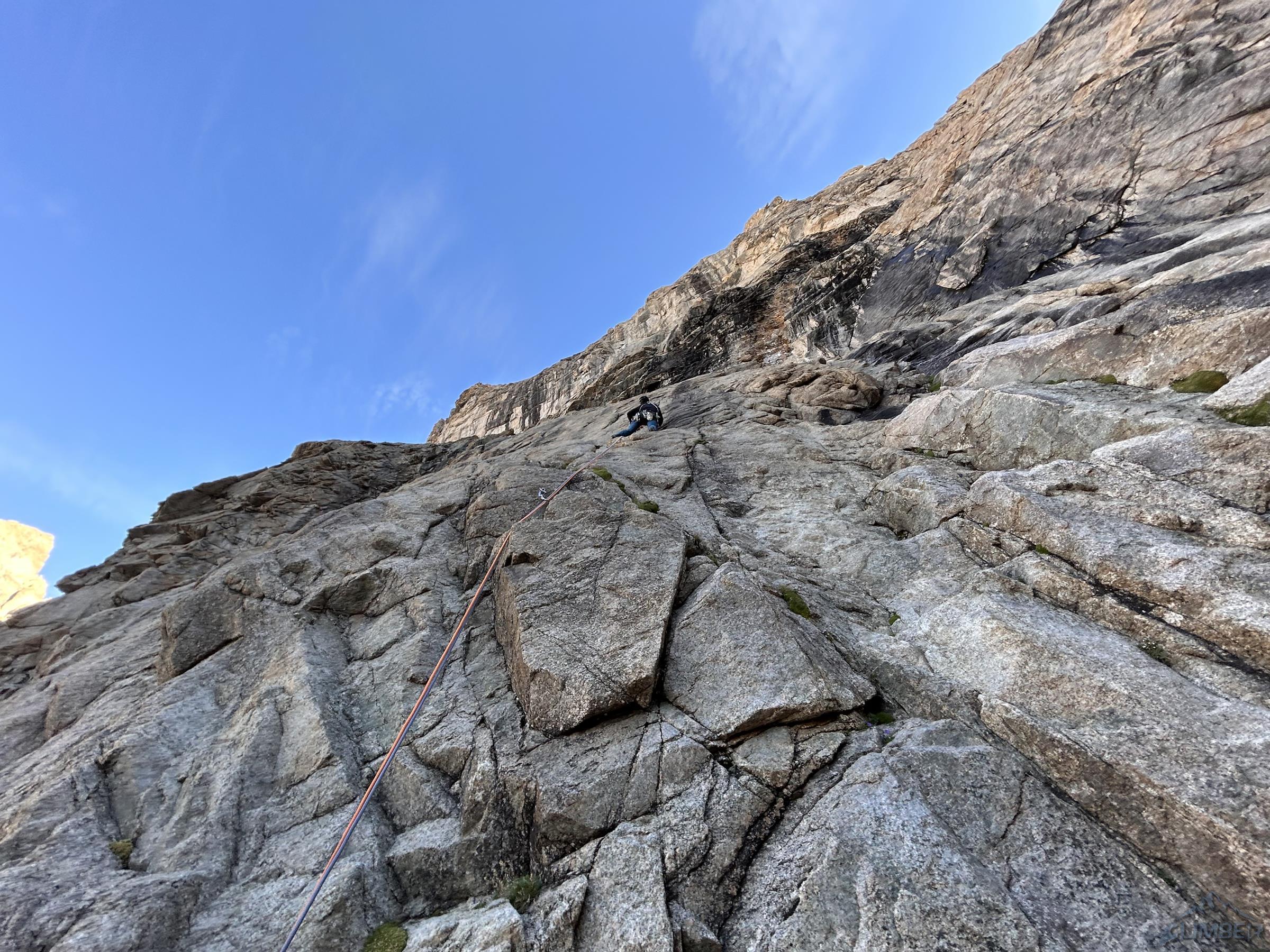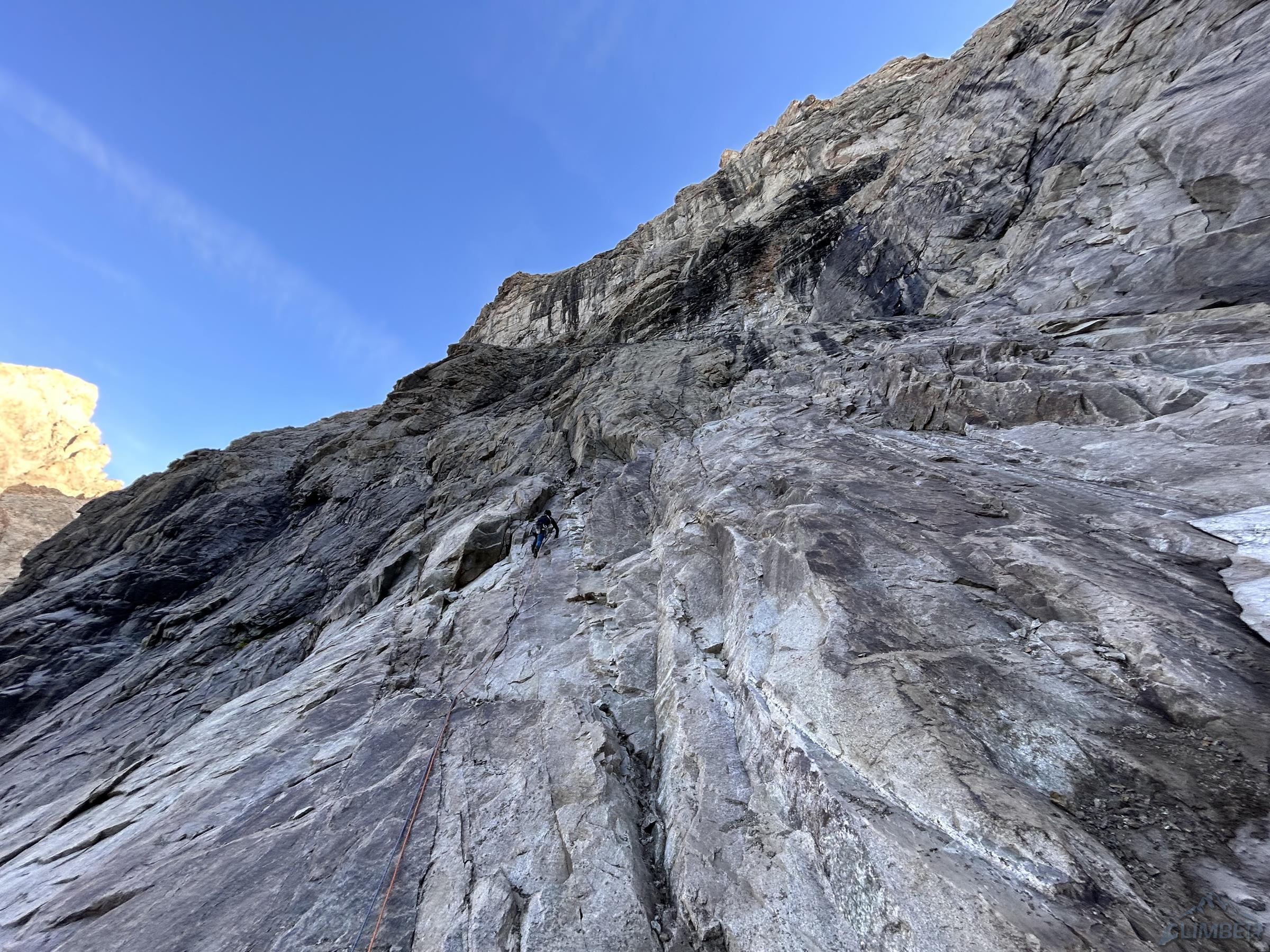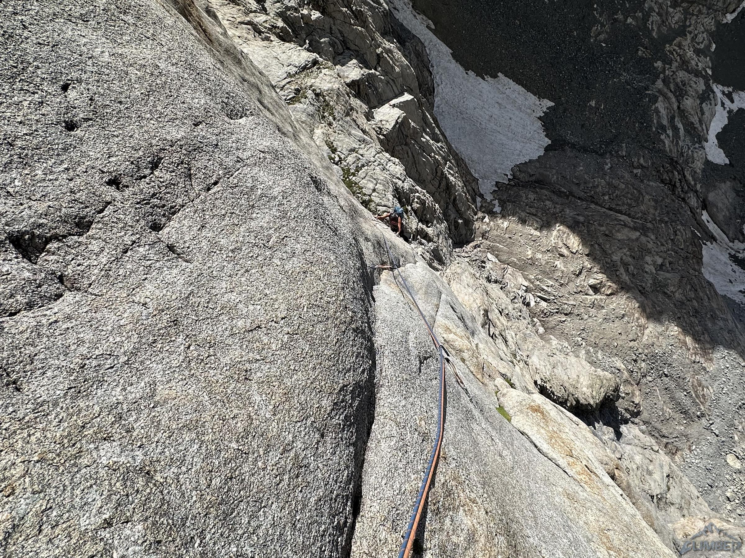 Droga startuje kilka metrów na lewo od wyraźnej załupy doprowadzającej pod okapy – z powodu cofnięcia się lodowca trzeba pokonać około 20-metrowy „wyciąg zerowy” o czwórkowych trudnościach (2-3 spity). Na pierwszy „właściwym” wyciągu czeka już znacznie ciekawsze i bardziej wymagające wspinanie po wymytych płytach (5c – obite ale dość rzadko). Drugi odcinek to łatwy start (4b) i ciekawy trawers po gładkiej płycie w lewo pod okapami. Wyżej skała robi się coraz lepsza – idziemy (6a) po ładnie urzeźbionej ścianie skośnie w prawo. Na czwartym wyciągu jako pierwsza przez chwilę idzie Ania – trafia się jej przyjemna żółta płyta (5c), z powodu gorszego samopoczucia nie decyduje się jednak na prowadzenie innych fragmentów.
