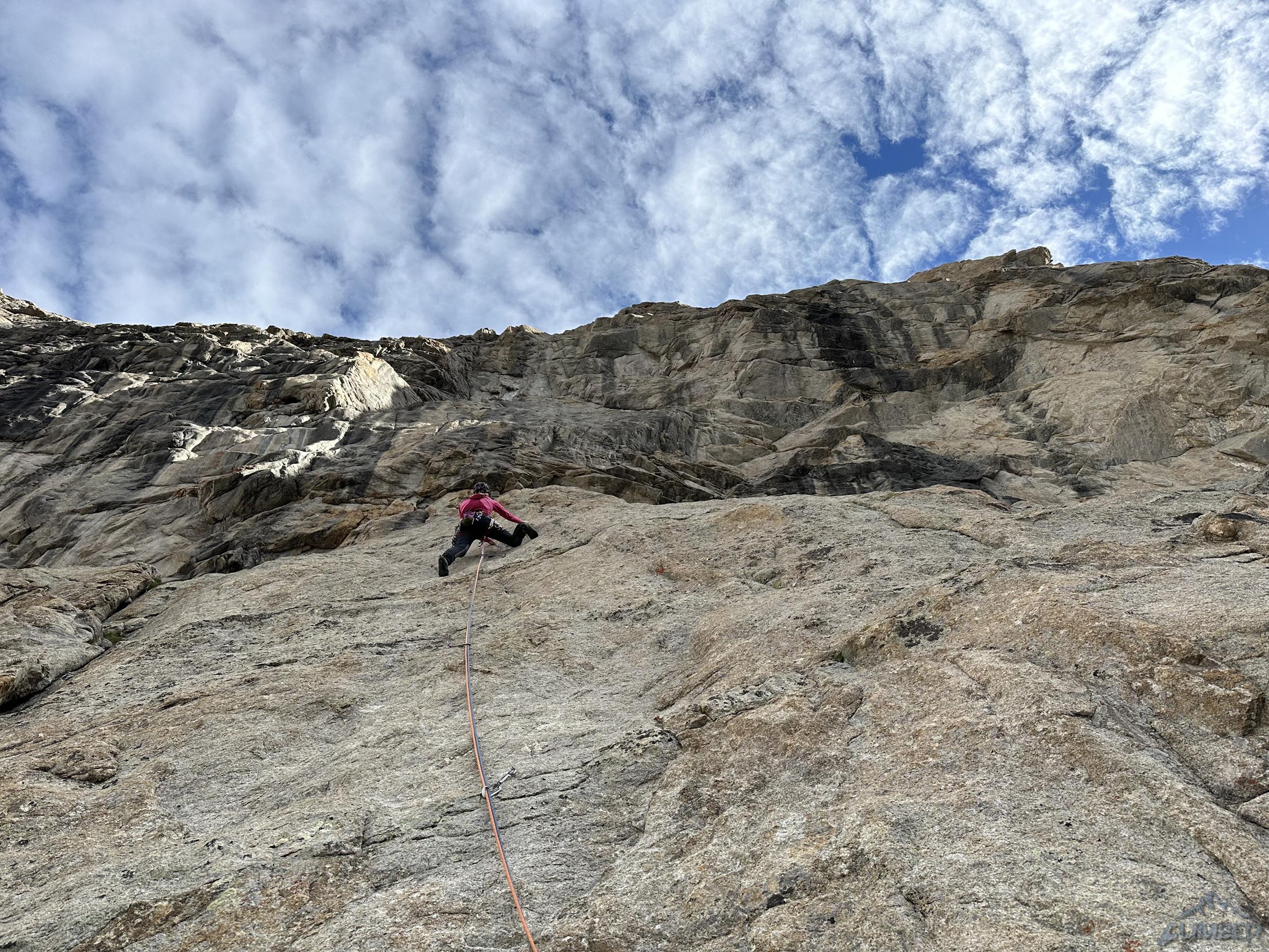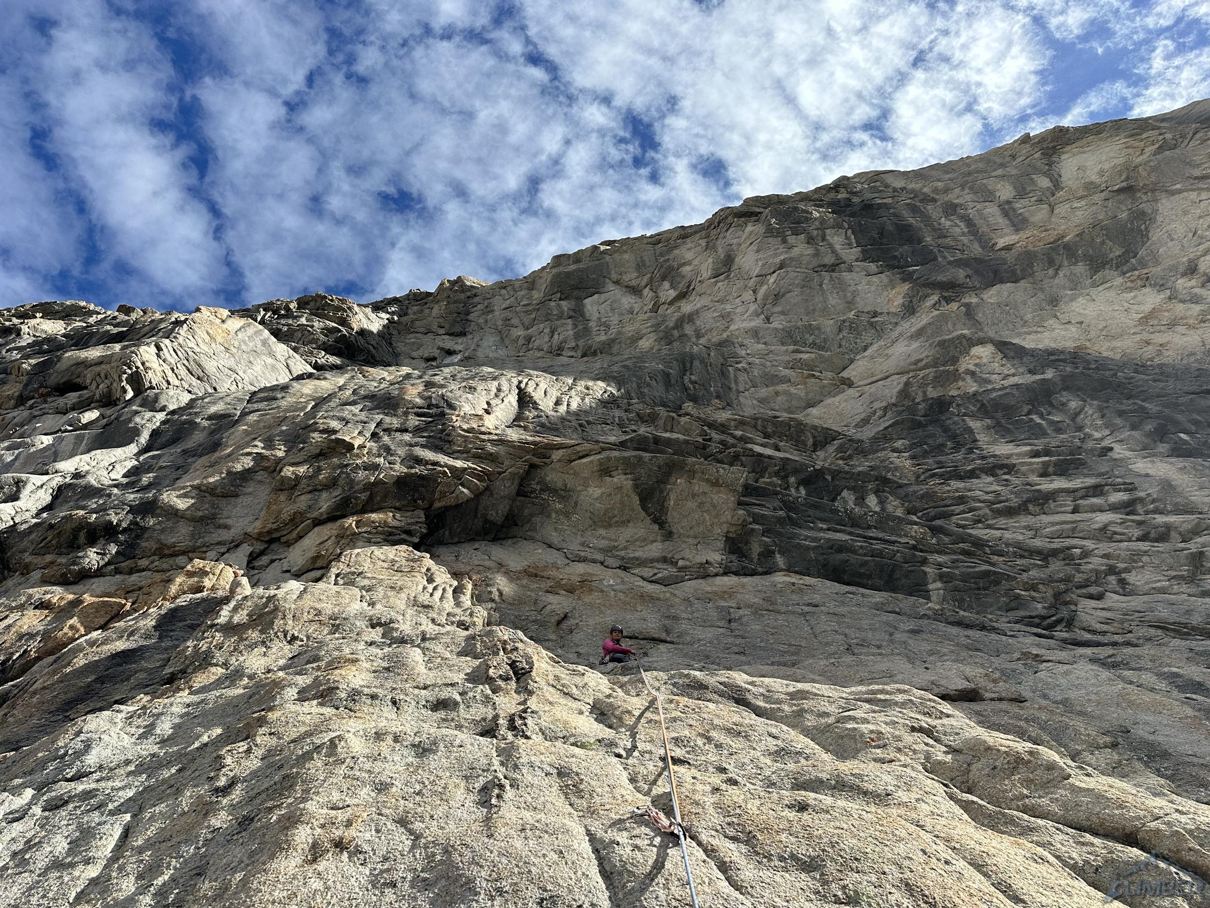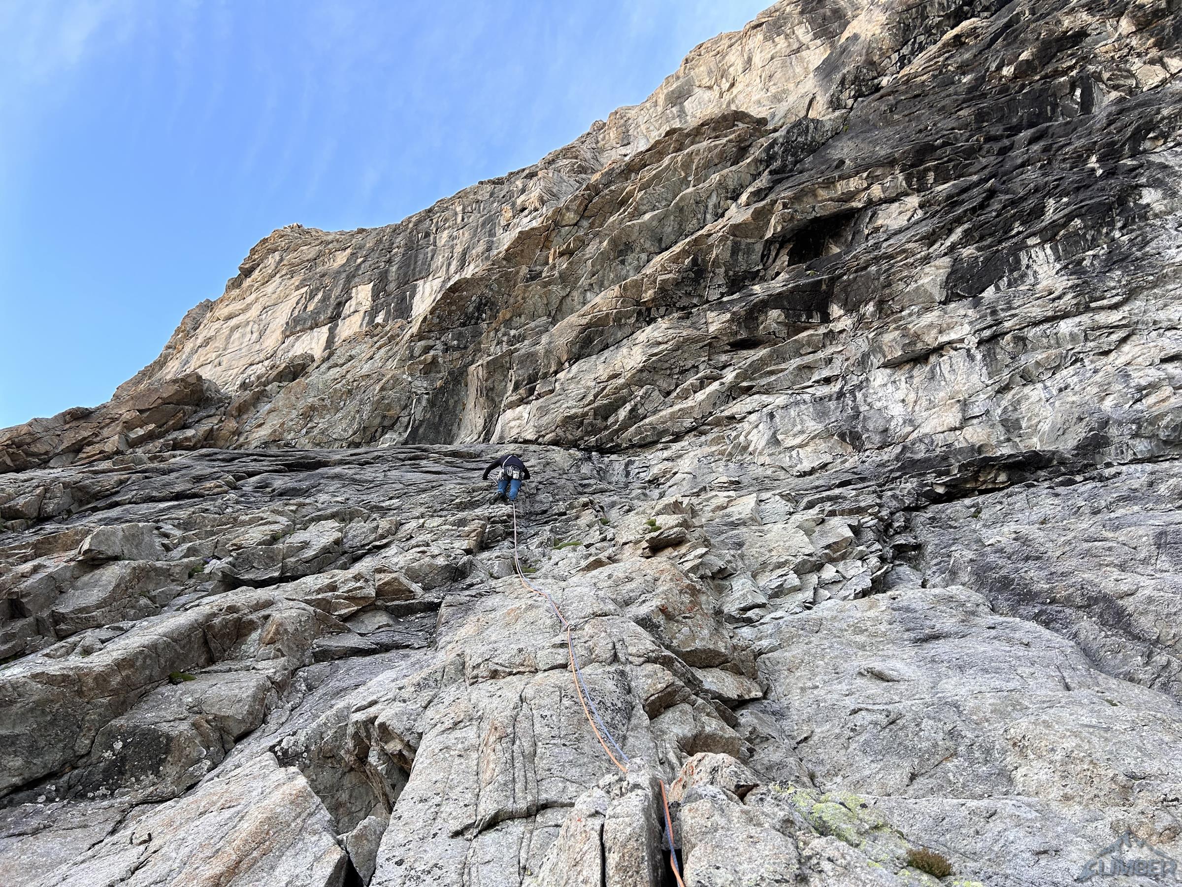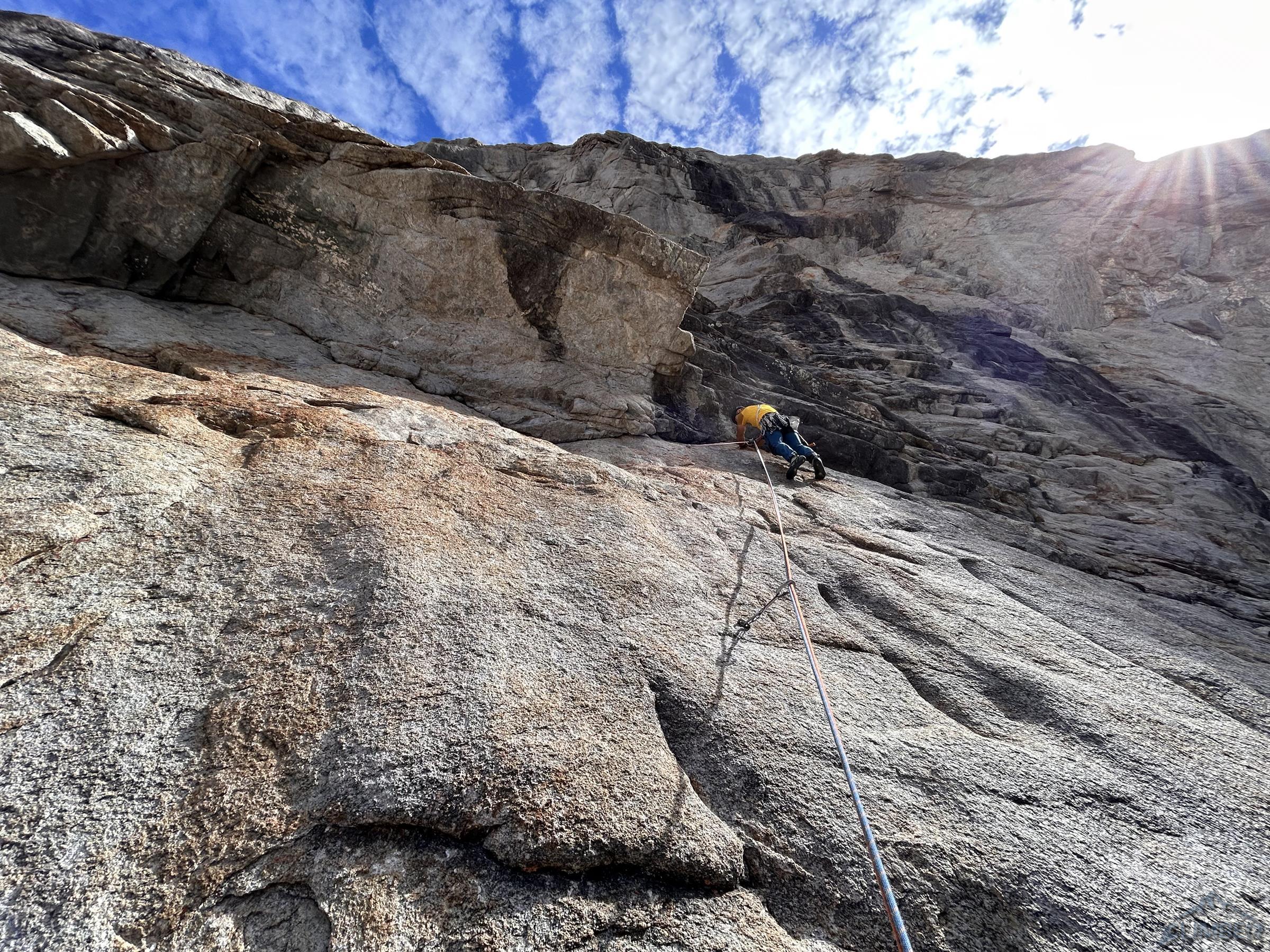 Droga startuje kilka metrów na lewo od wyraźnej załupy doprowadzającej pod okapy – z powodu cofnięcia się lodowca trzeba pokonać około 20-metrowy „wyciąg zerowy” o czwórkowych trudnościach (2-3 spity). Na pierwszy „właściwym” wyciągu czeka już znacznie ciekawsze i bardziej wymagające wspinanie po wymytych płytach (5c – obite ale dość rzadko). Drugi odcinek to łatwy start (4b) i ciekawy trawers po gładkiej płycie w lewo pod okapami. Wyżej skała robi się coraz lepsza – idziemy (6a) po ładnie urzeźbionej ścianie skośnie w prawo. Na czwartym wyciągu jako pierwsza przez chwilę idzie Ania – trafia się jej przyjemna żółta płyta (5c), z powodu gorszego samopoczucia nie decyduje się jednak na prowadzenie innych fragmentów.