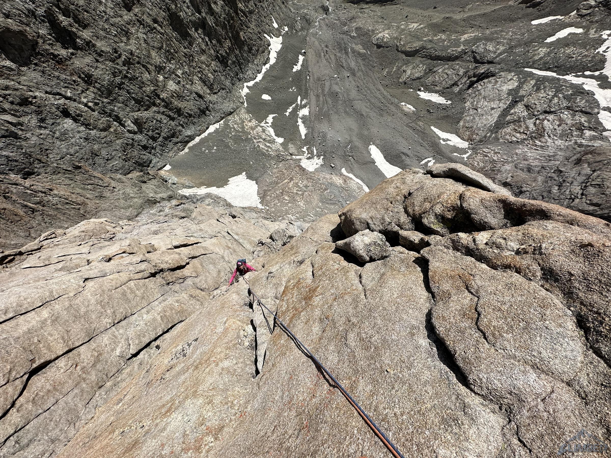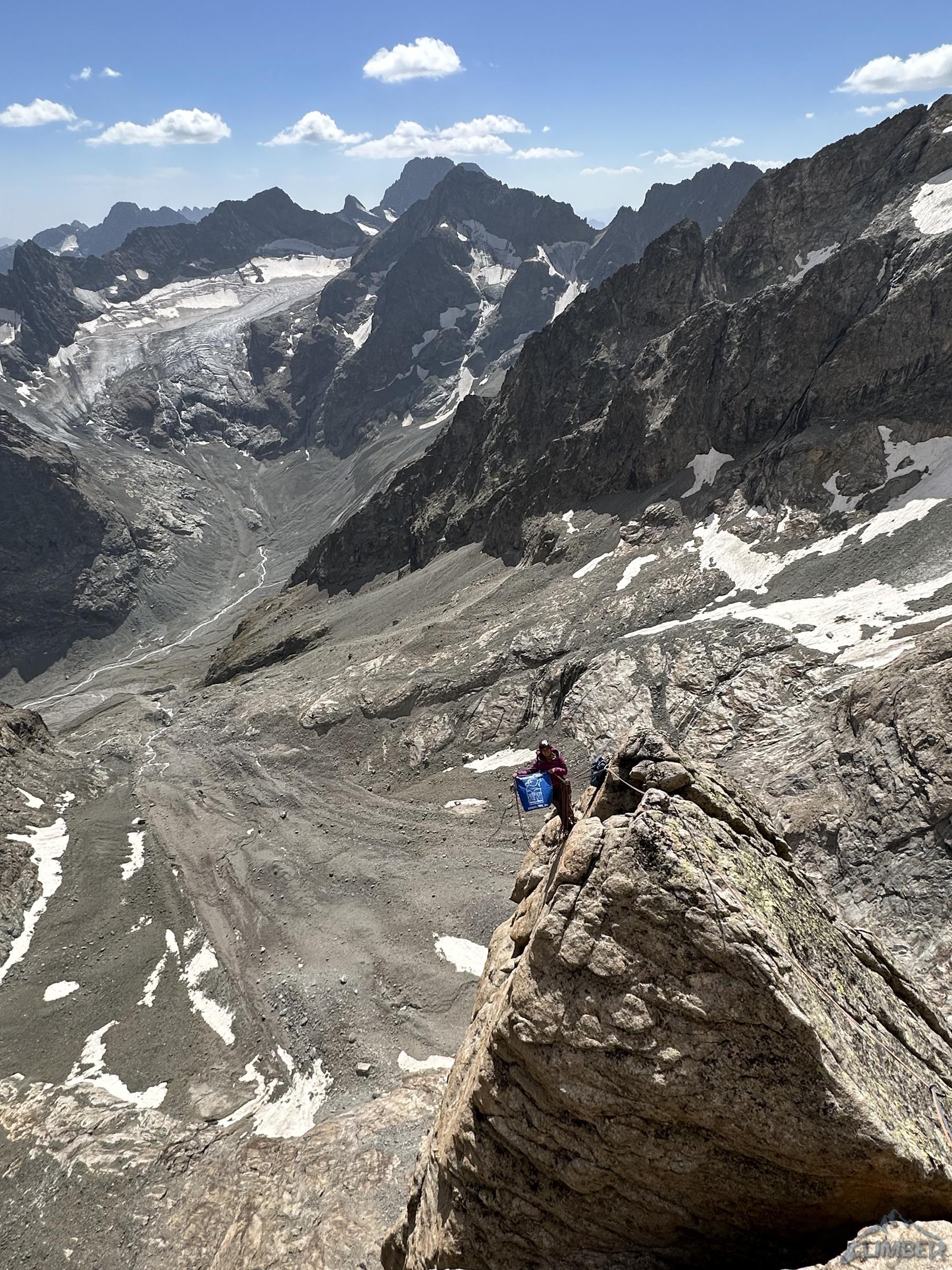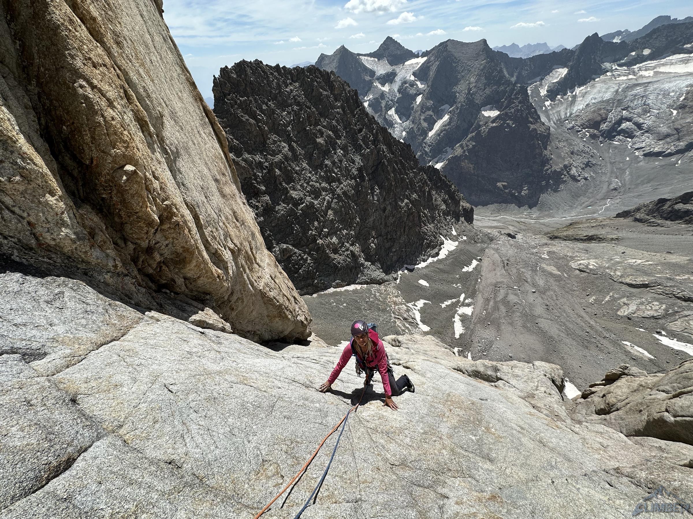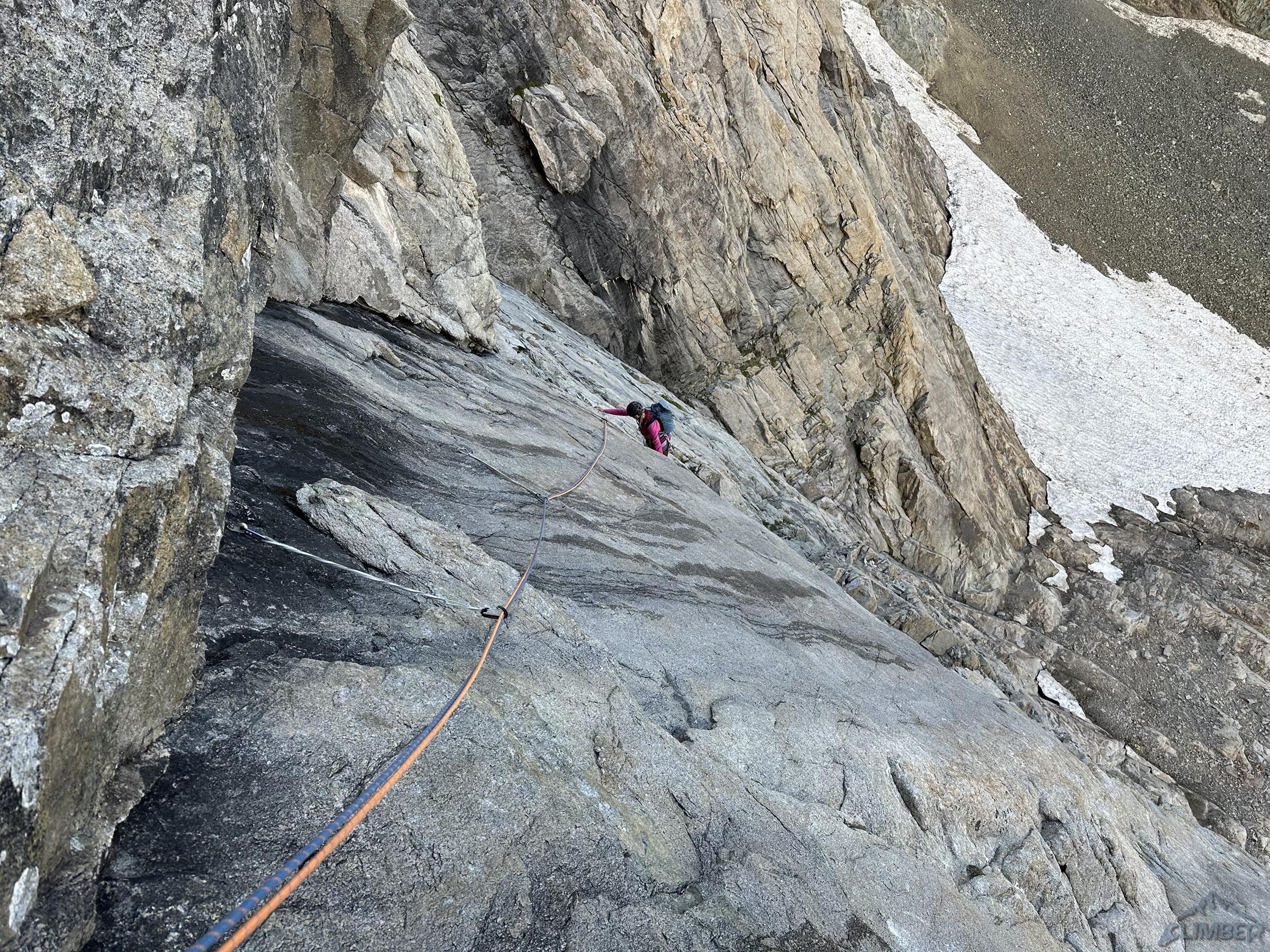 W dalszej części obozu klubowego w Alpach Delfinackich postanawiamy zmierzyć się z jedną z najładniejszych ścian w całym masywie – południową wystawą Aiguille de Sialouze (3576m). Świetnych dróg jest tutaj co najmniej kilka, a wśród nich absolutnym klasykiem jest 13-wyciągowa Attaque à Main Armée (wyceniana w zależności od źródła od 6c do 7a). Jak na większości najpopularniejszych górskich linii w Écrins możemy liczyć na dobre obicie (świeża re-ekipacja w 2021 roku), a własny sprzęt potrzebny jest tylko na ostatnie rysowe wyciągi. Wspinanie jest bardzo ładne i różnorodne, do tego od połowy ściany pojawia się piękny pomarańczowy granit, rodem z Grand Capucin – myślę że to wystarczająca rekomendacja!