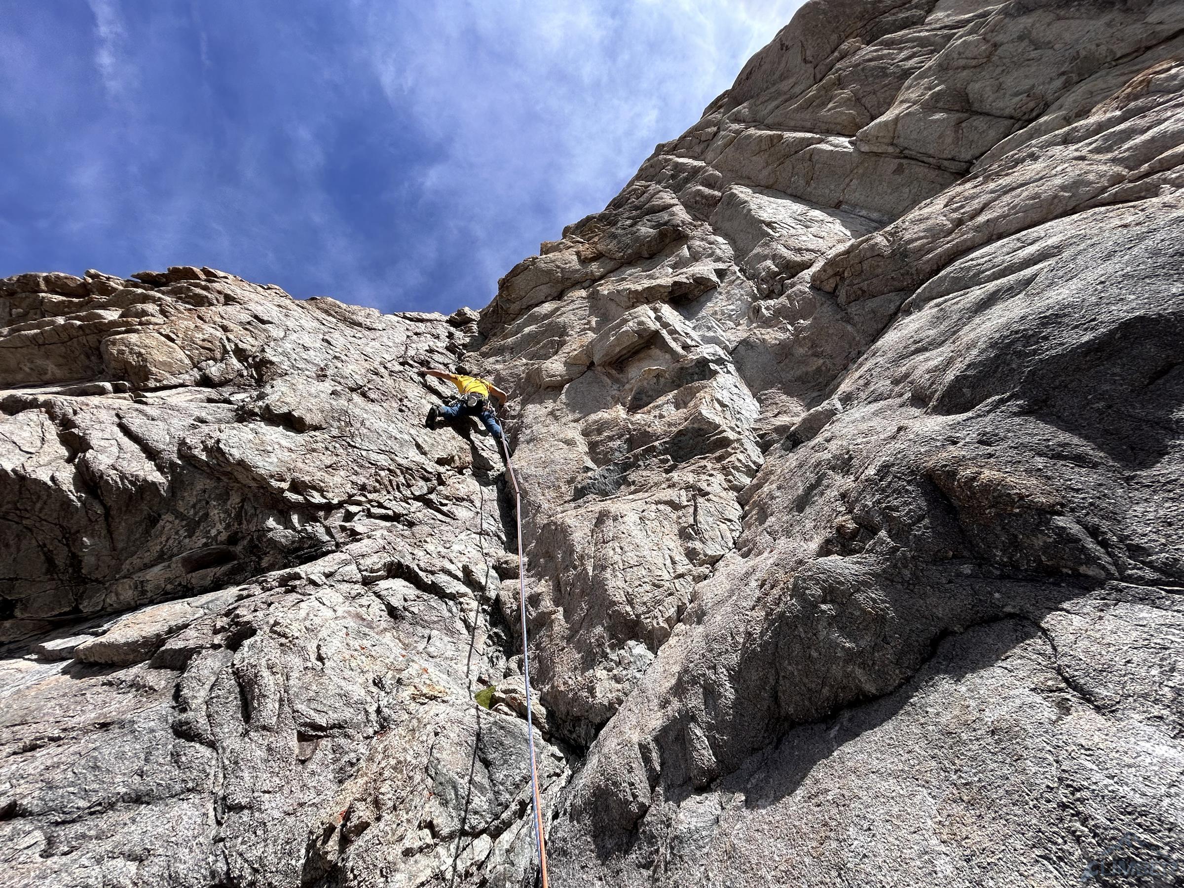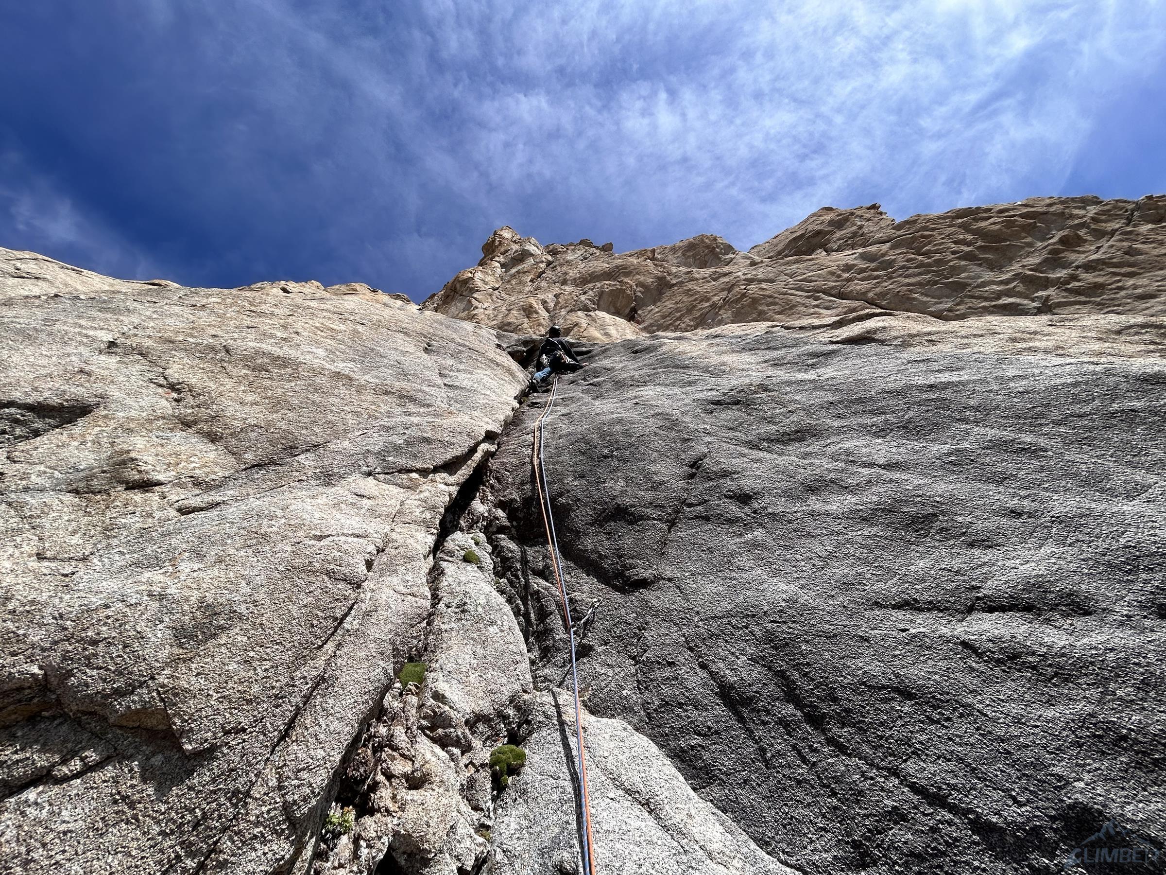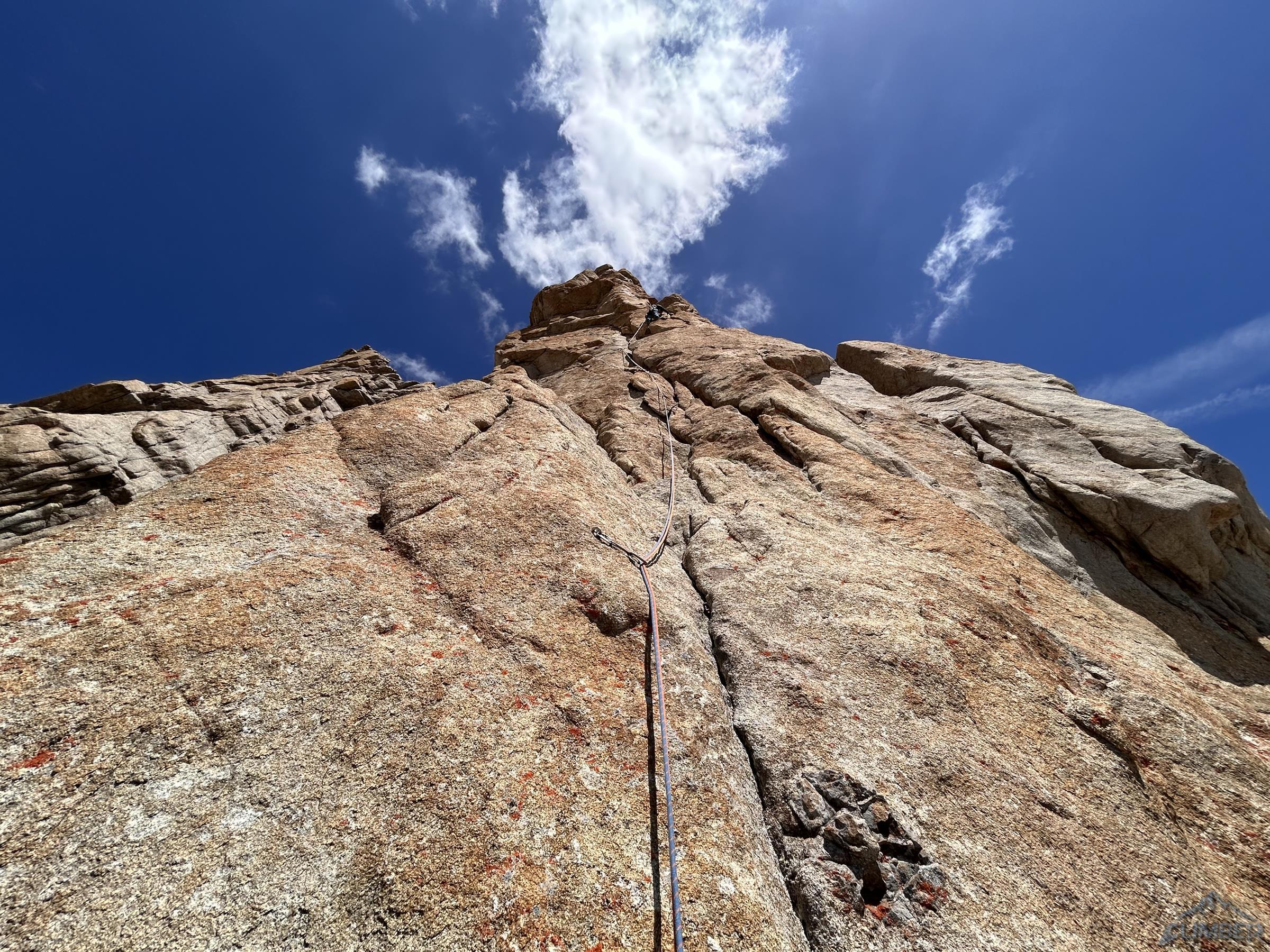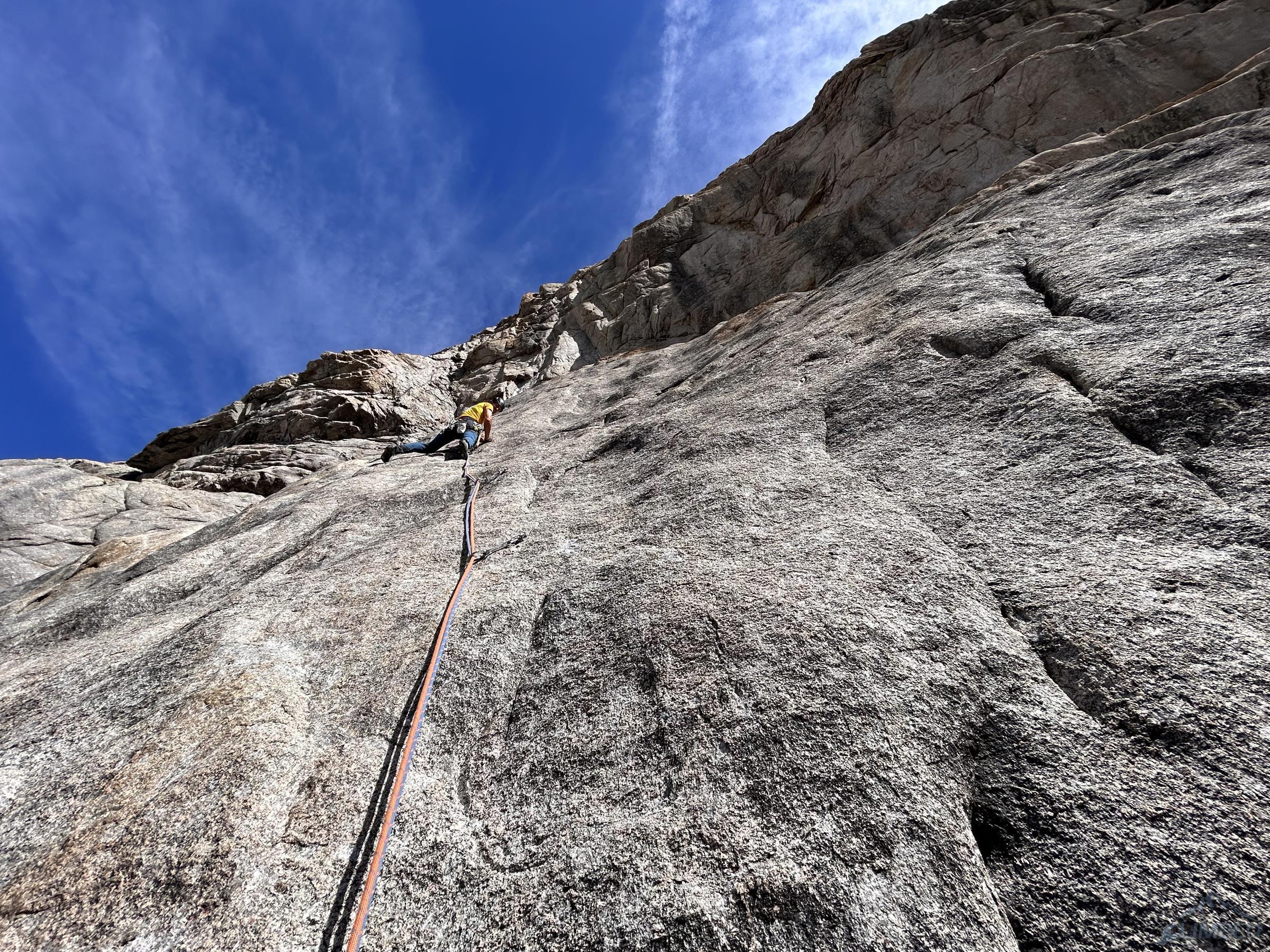 Górna część drogi jest bardzo efektowna i prowadzi w pięknym złotym granicie. Zaczynamy co prawda nieco ponurym kominkiem, ale po chwili przewijamy się na niezwykle eksponowany kant (6a+/b) i przechodzimy w prawo na filar. Wyciąg 12-ty prowadzi wzdłuż kapitalnych pęknięć (5c) – poza spitem kierunkowym wspinamy się wyjątkowo na własnej asekuracji (średnie/duże friendy). Ostatni odcinek (6a) to dalszy ciąg rys na własnej, pod koniec by sobie nie utrudniać warto odbić w lewo i dopiero do góry do stanowiska. Droga kończy się na szczycie filara, można zjechać stąd lub iść w kierunku wierzchołka do innej linii zjazdów – szczegóły na topo i plakacie. Ja wspinam się jeszcze dodatkowy wyciąg (4b), po czym schodzę nim z powrotem w dół – okazuje się, że na filar nie da się wrócić zjazdem a uparliśmy się by nim zjeżdżać 😉. Powrót wzdłuż mocno przewieszonej miejscami drogi Unchi Maka (8a!) okazuje się szybki ale i dość emocjonujący jeżeli nie będziemy się dobrze przepinać!