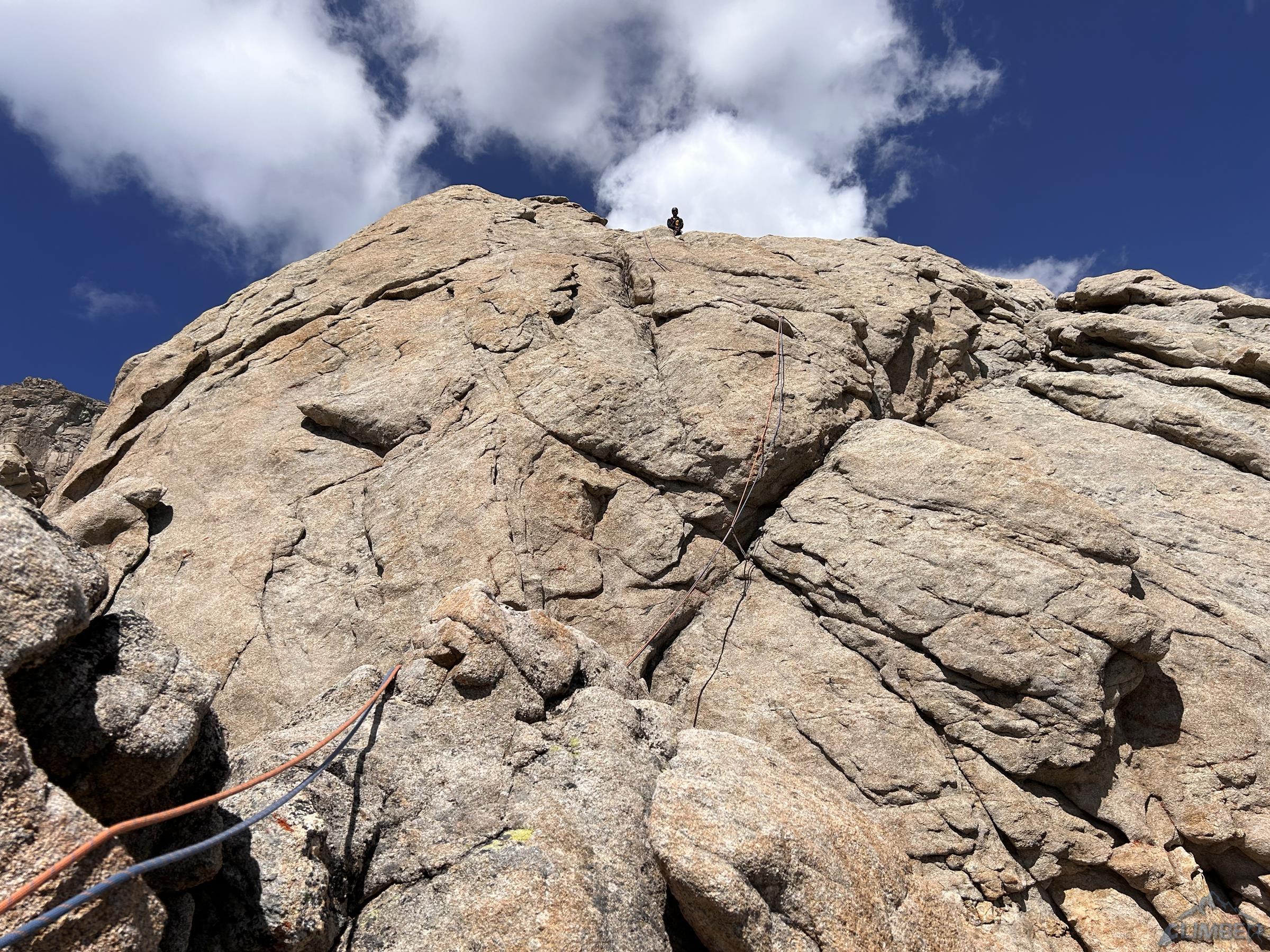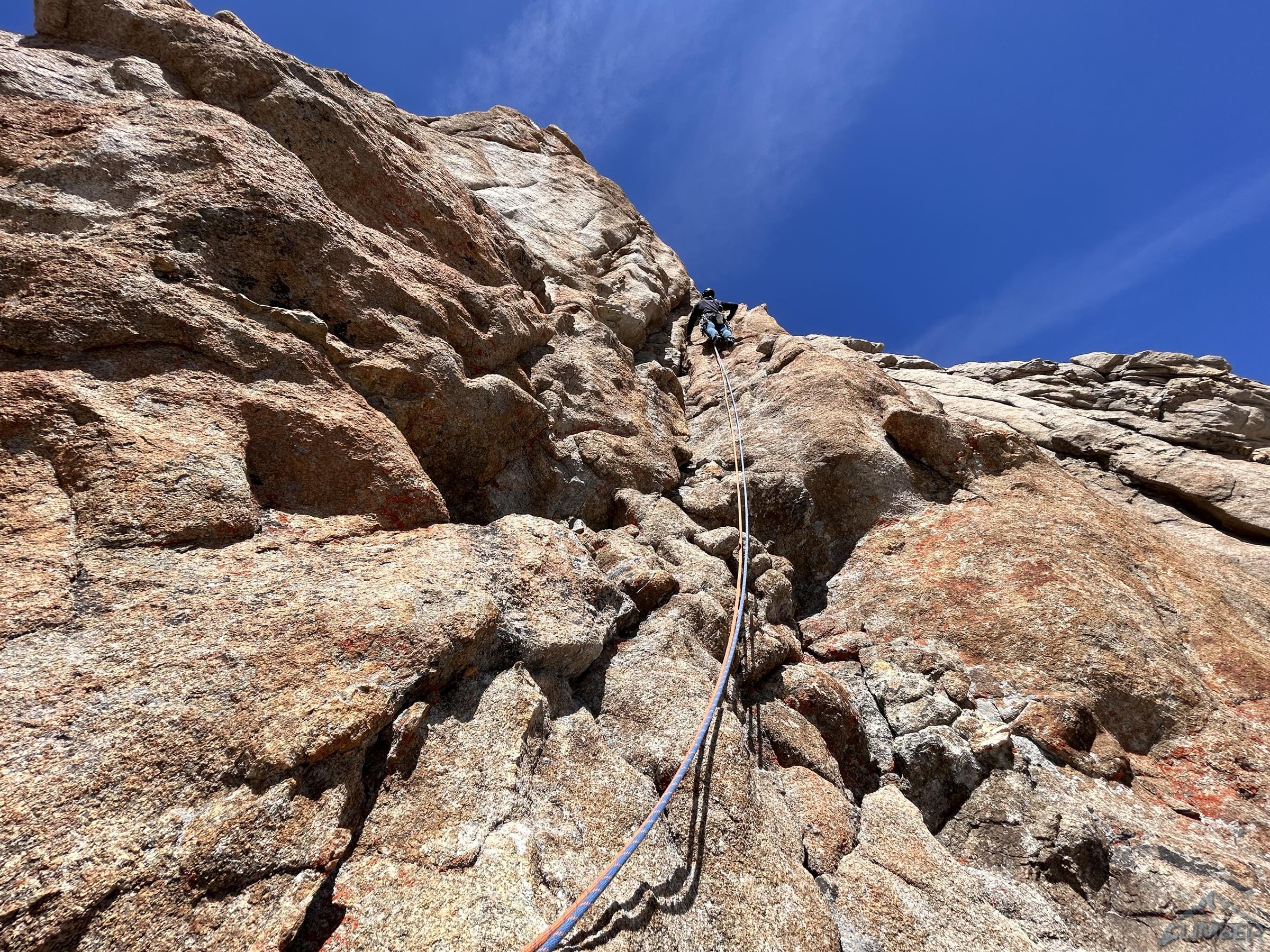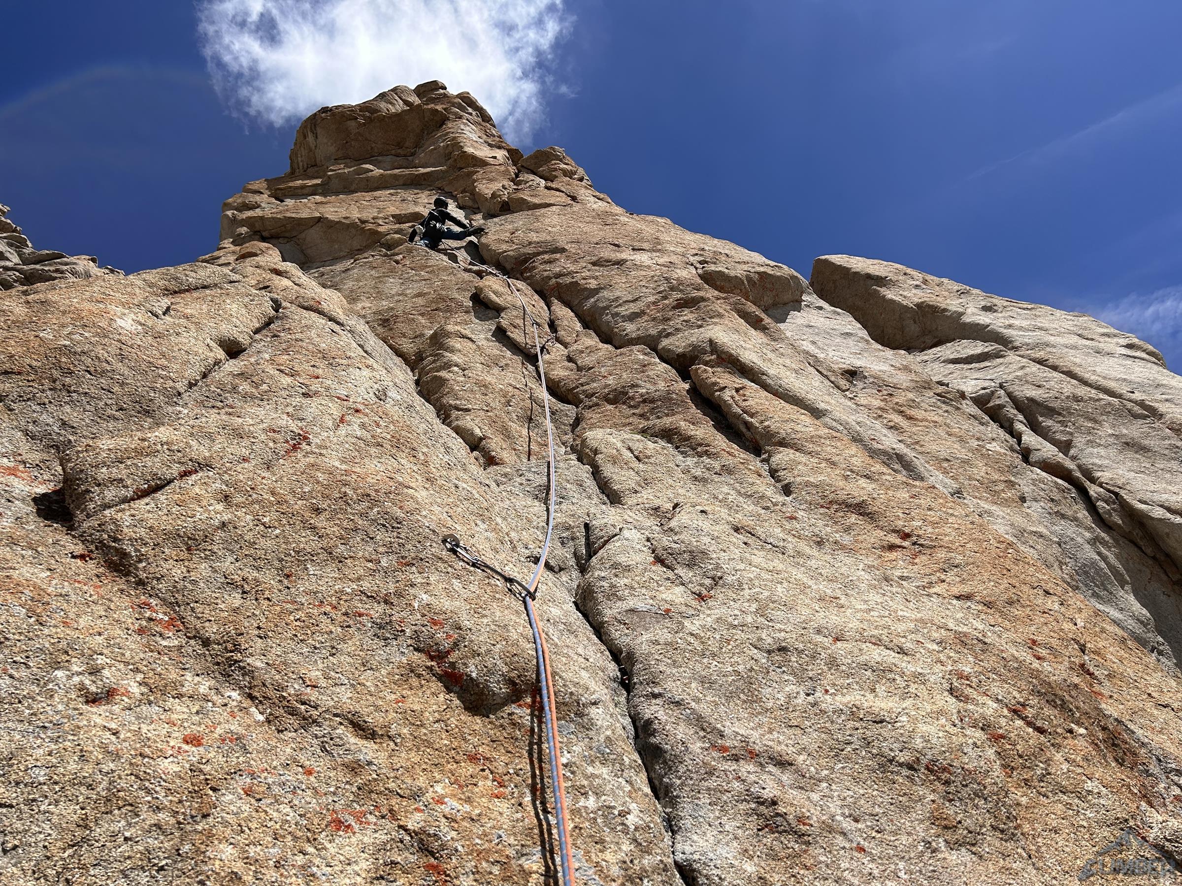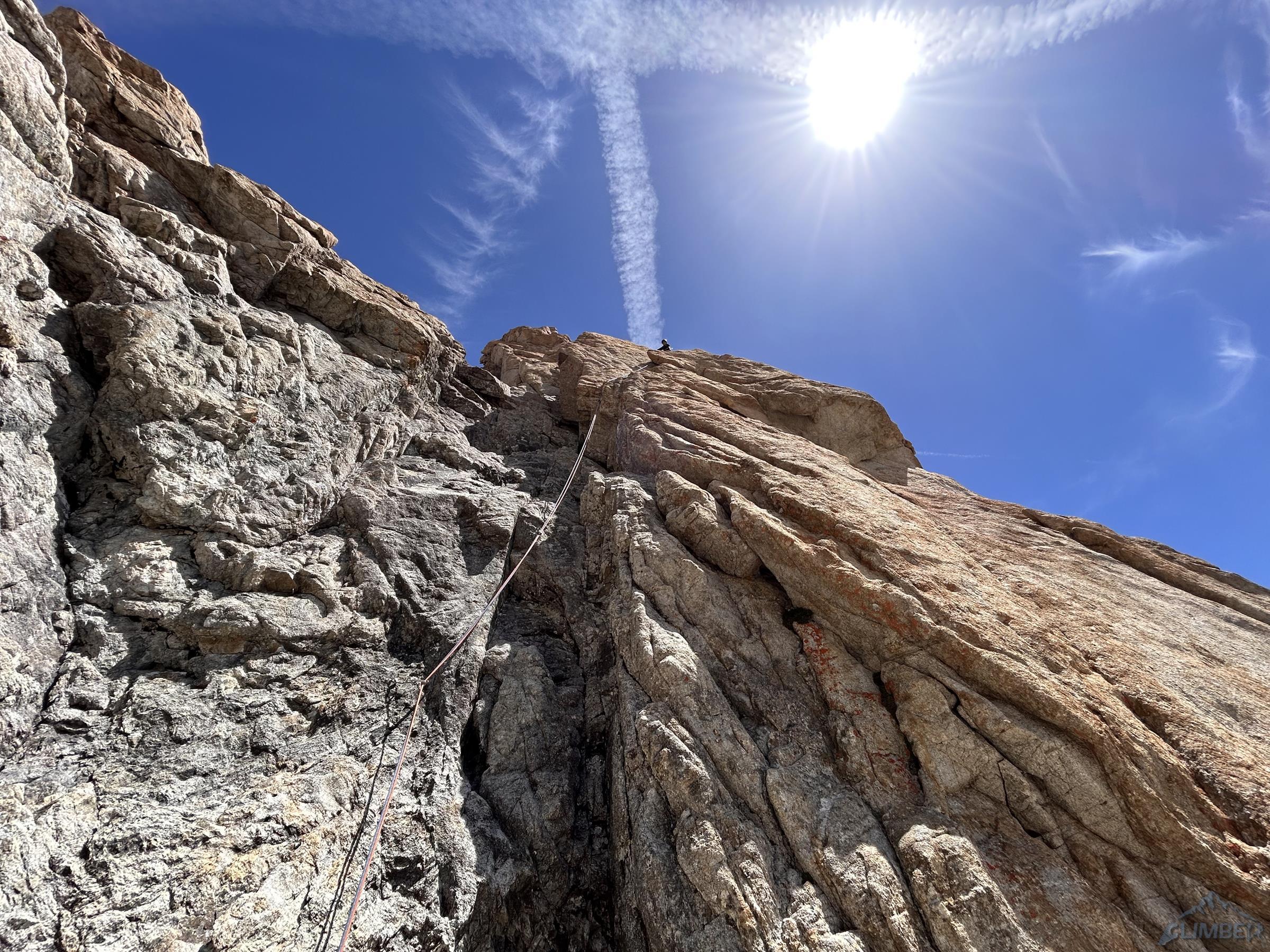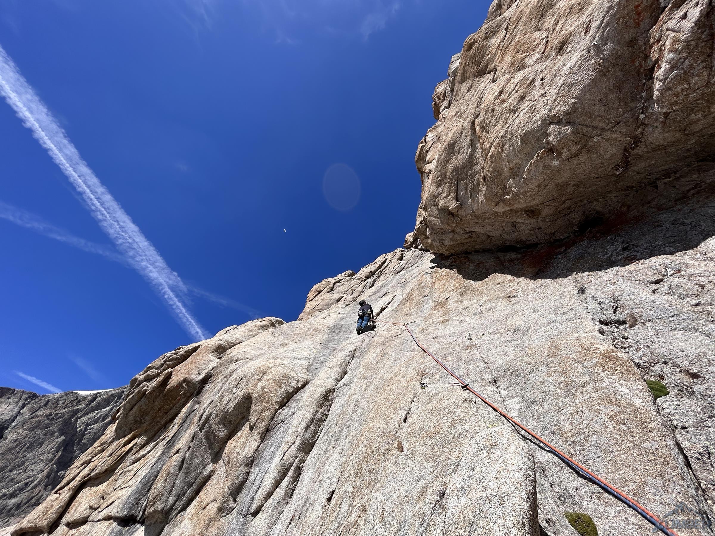 Górna część drogi jest bardzo efektowna i prowadzi w pięknym złotym granicie. Zaczynamy co prawda nieco ponurym kominkiem, ale po chwili przewijamy się na niezwykle eksponowany kant (6a+/b) i przechodzimy w prawo na filar. Wyciąg 12-ty prowadzi wzdłuż kapitalnych pęknięć (5c) – poza spitem kierunkowym wspinamy się wyjątkowo na własnej asekuracji (średnie/duże friendy). Ostatni odcinek (6a) to dalszy ciąg rys na własnej, pod koniec by sobie nie utrudniać warto odbić w lewo i dopiero do góry do stanowiska. Droga kończy się na szczycie filara, można zjechać stąd lub iść w kierunku wierzchołka do innej linii zjazdów – szczegóły na topo i plakacie. Ja wspinam się jeszcze dodatkowy wyciąg (4b), po czym schodzę nim z powrotem w dół – okazuje się, że na filar nie da się wrócić zjazdem a uparliśmy się by nim zjeżdżać 😉. Powrót wzdłuż mocno przewieszonej miejscami drogi Unchi Maka (8a!) okazuje się szybki ale i dość emocjonujący jeżeli nie będziemy się dobrze przepinać!