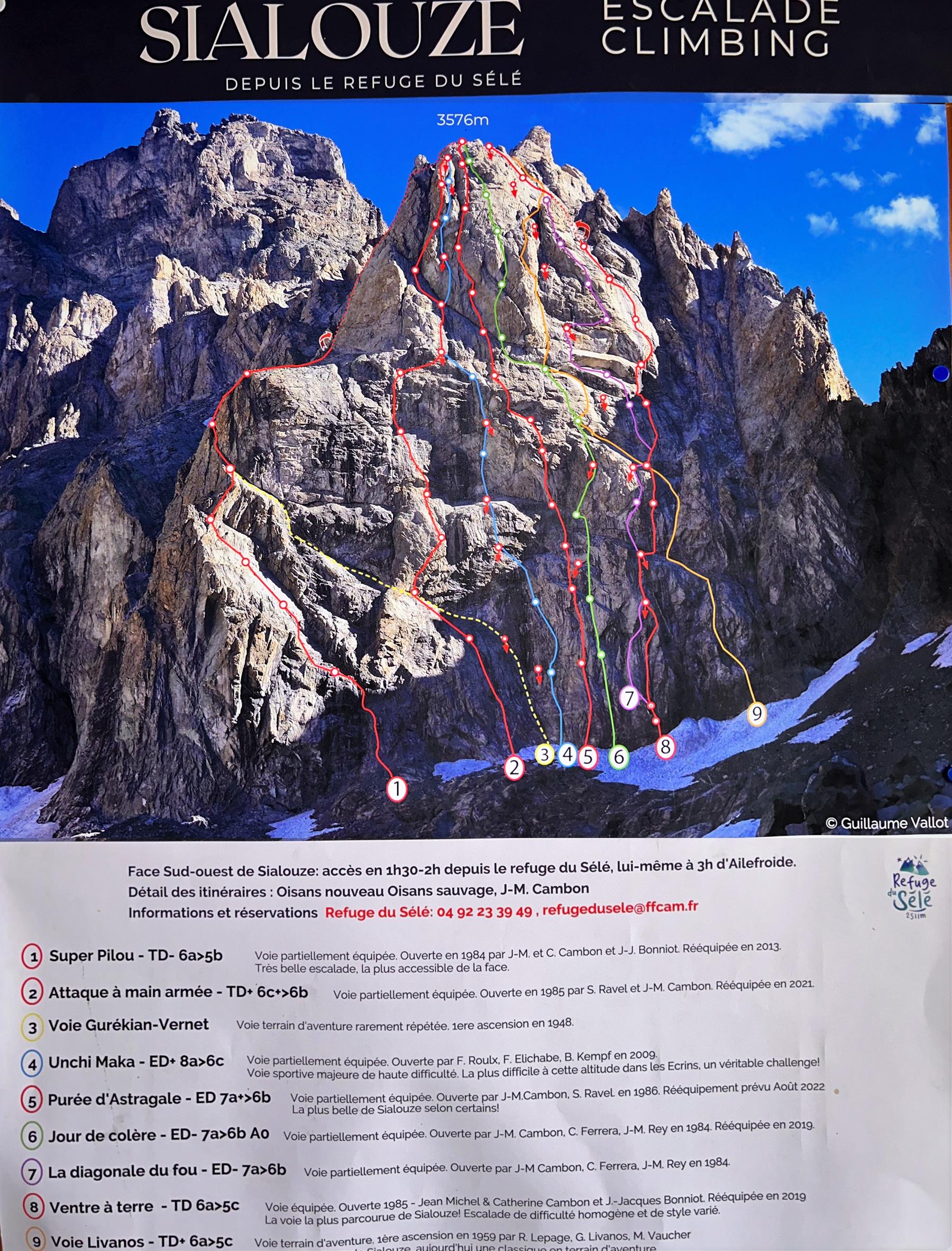 Sialouze okazuje się piękną ścianą, do tego dzięki stałej asekuracji mimo iż jesteśmy wysoko w górach jest bardzo komfortowo i możemy bezstresowo cieszyć się wspinaniem – zdecydowanie polecam pojawić się przynajmniej raz albo wybrać na 2-3 dni! Inne popularne drogi poza Atakiem to m.in. robiona przez dwa inne klubowe zespoły Super Pilou (6a) czy polecana przez stałego bywalca rejonu, Kajmana - Puree d’Astragale (7a+). Te i inne rekomendowane linie znajdziecie na załączonym plakacie.