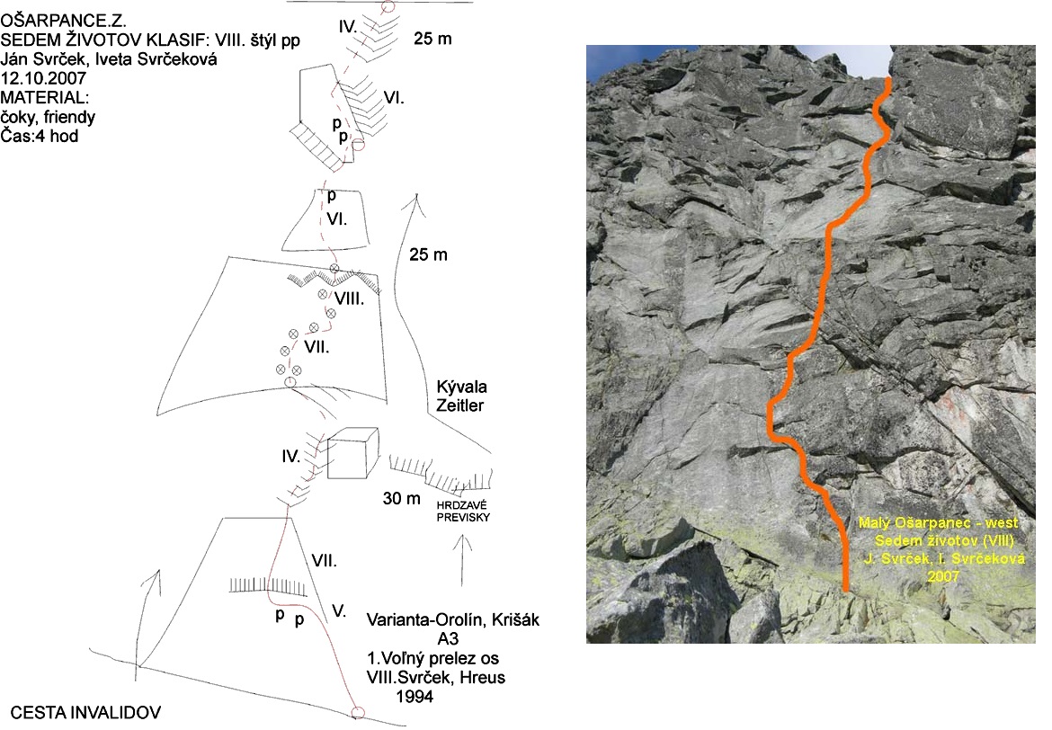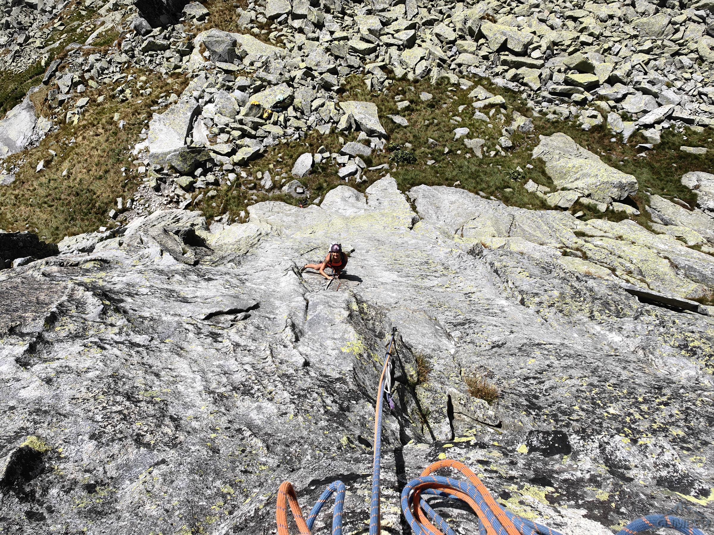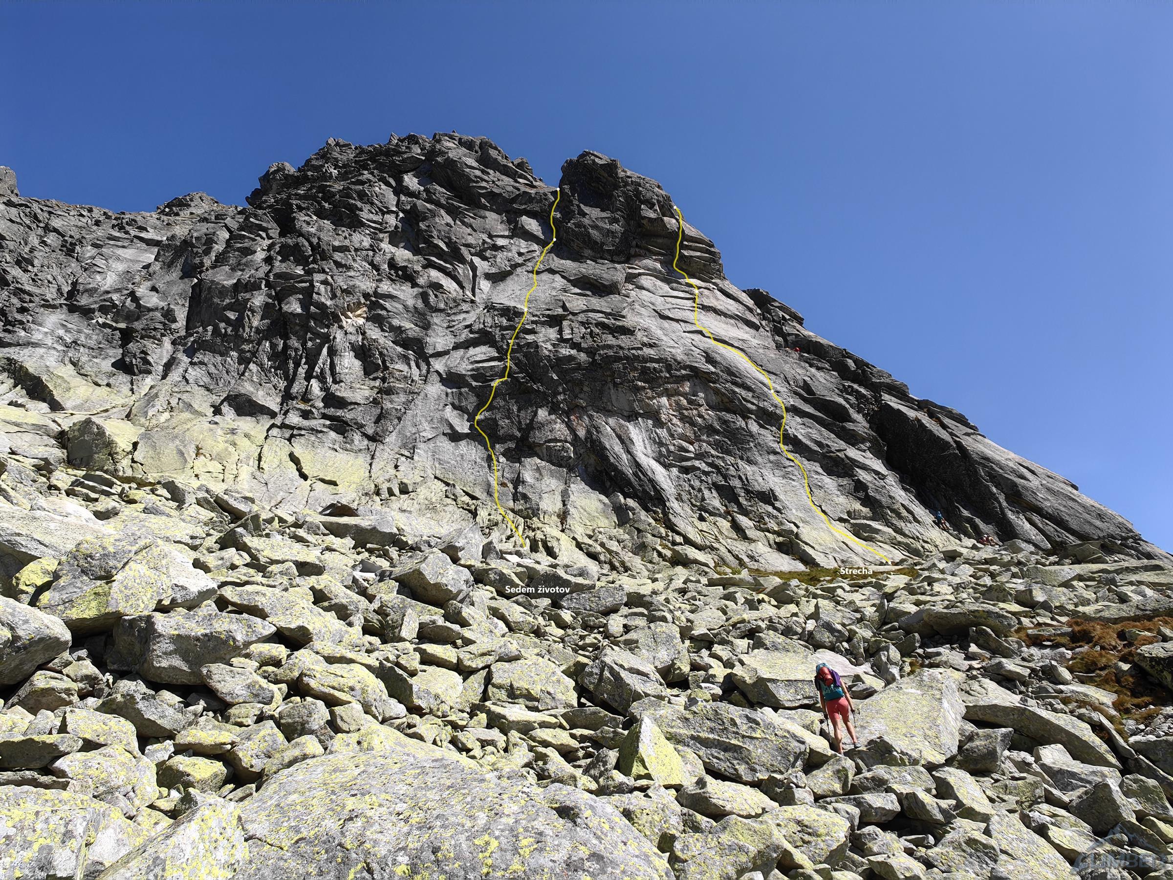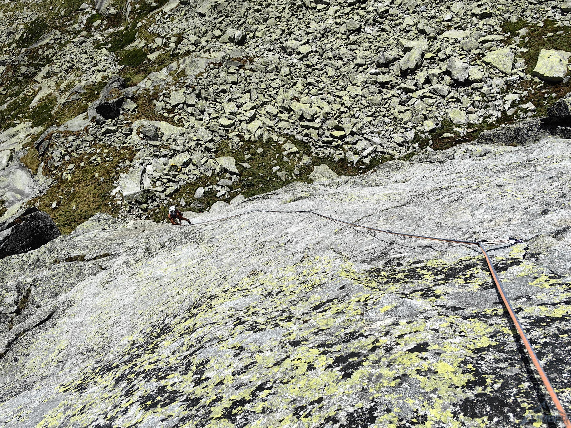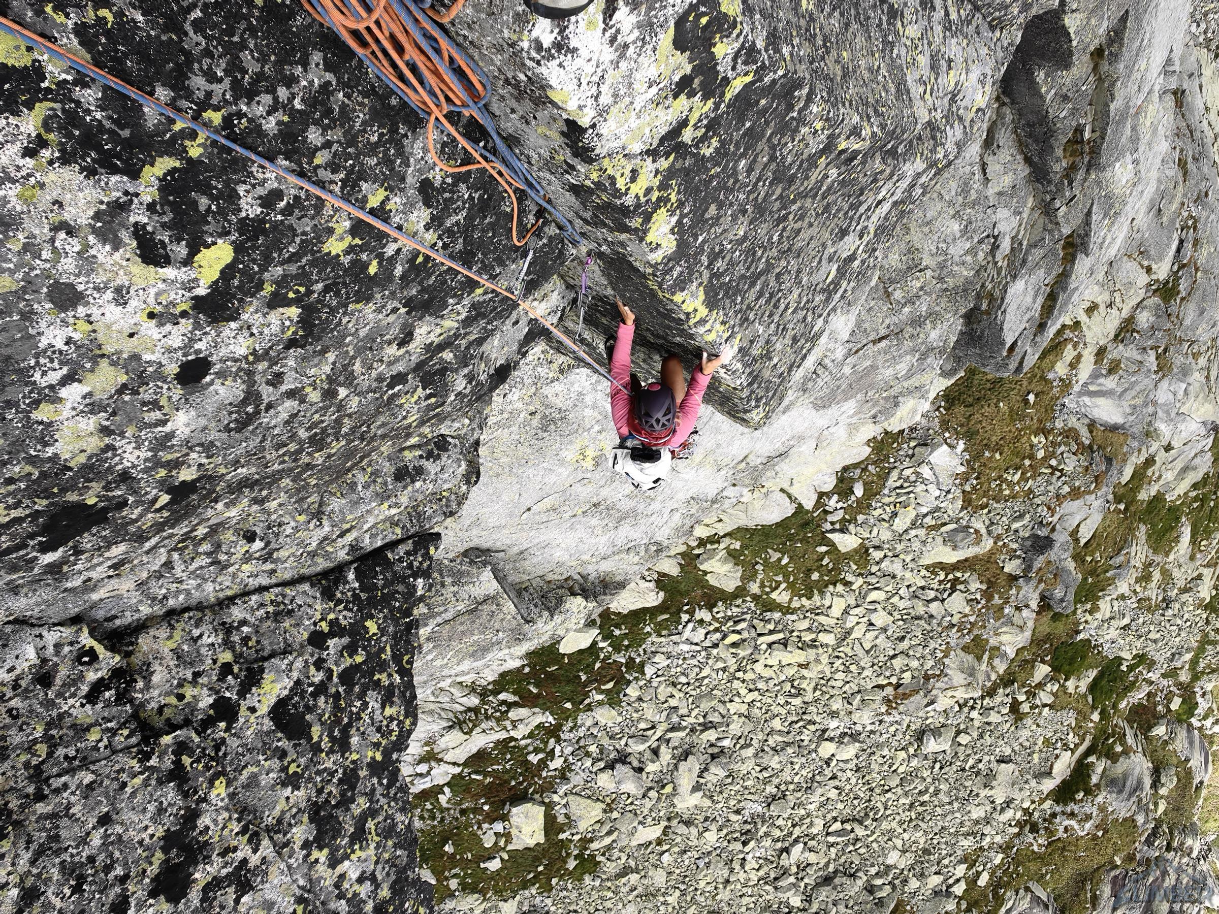 Po chwili odpoczynku namawiam partnerkę by towarzyszyła mi jeszcze na jednej, nieco bardziej wymagającej drodze położonej kilkanaście metrów na lewo - Sedem životov (VIII). Dwa ciekawe tradowe wyciągi na niej rozdzielone są ubezpieczoną w spity gładką płytą, którą prawie całą przechodzi się po przysłowiowym „niczym” – taki alpejski rajbung Pioli przeniesiony w Tatry 😊.