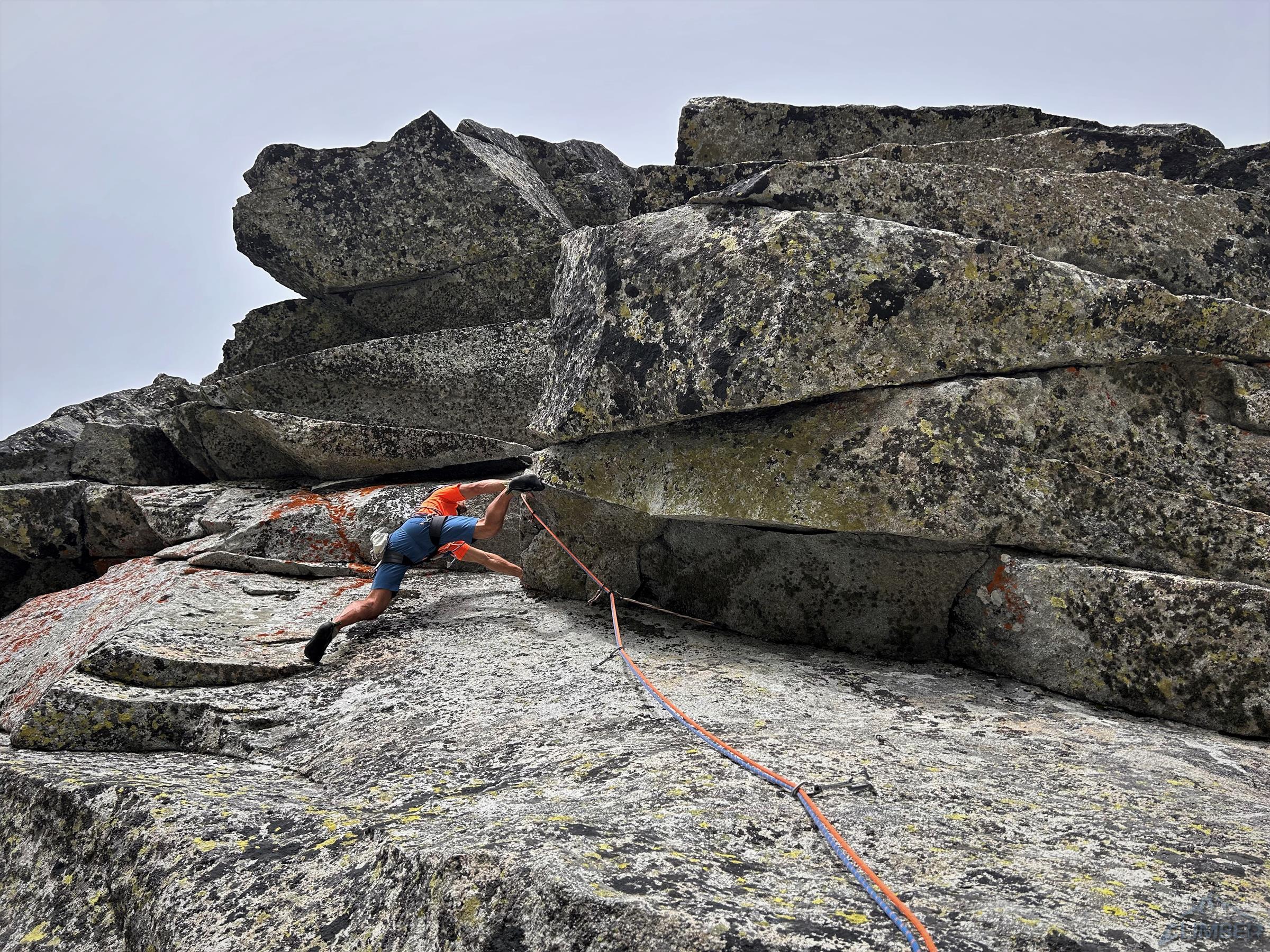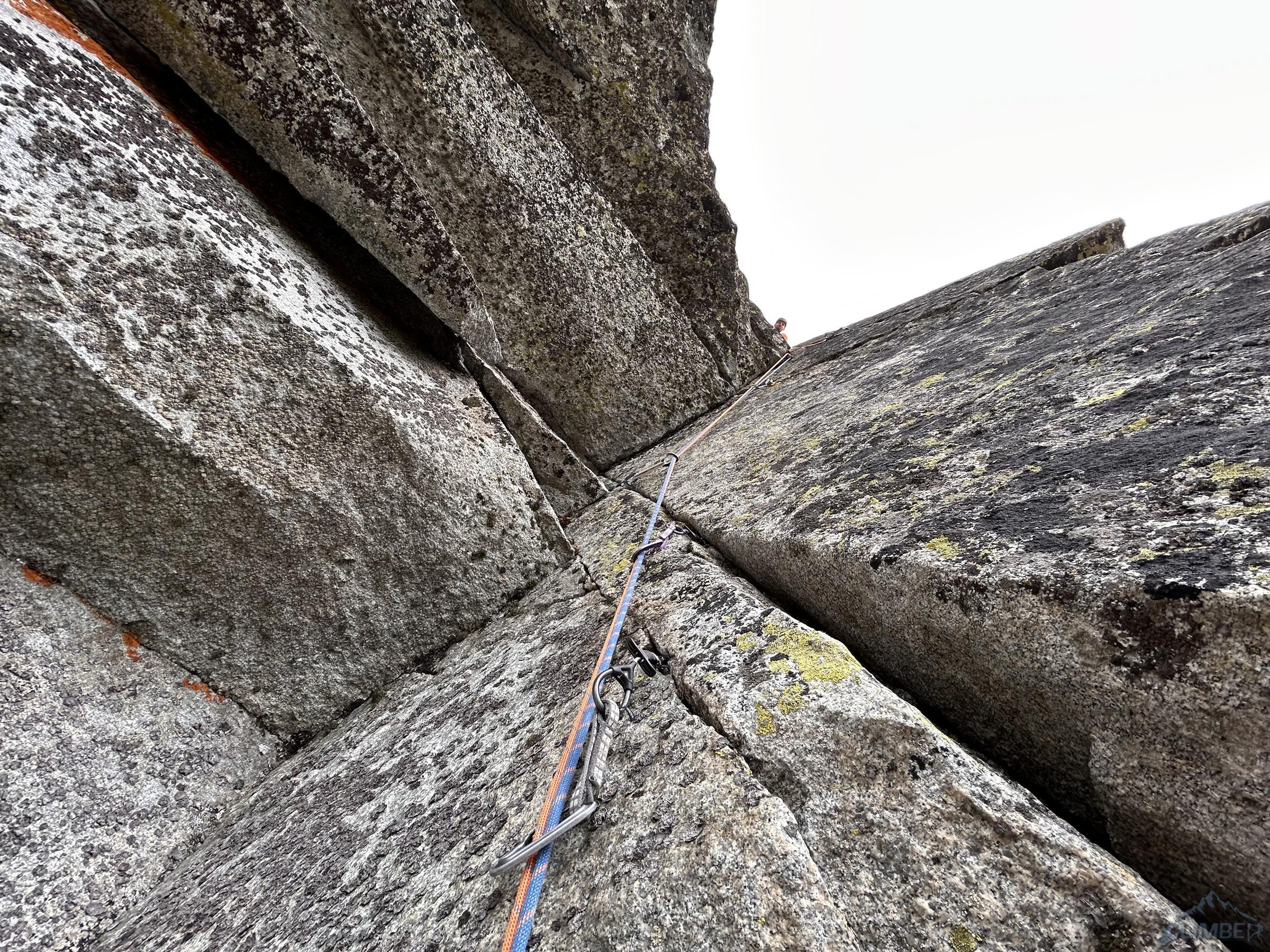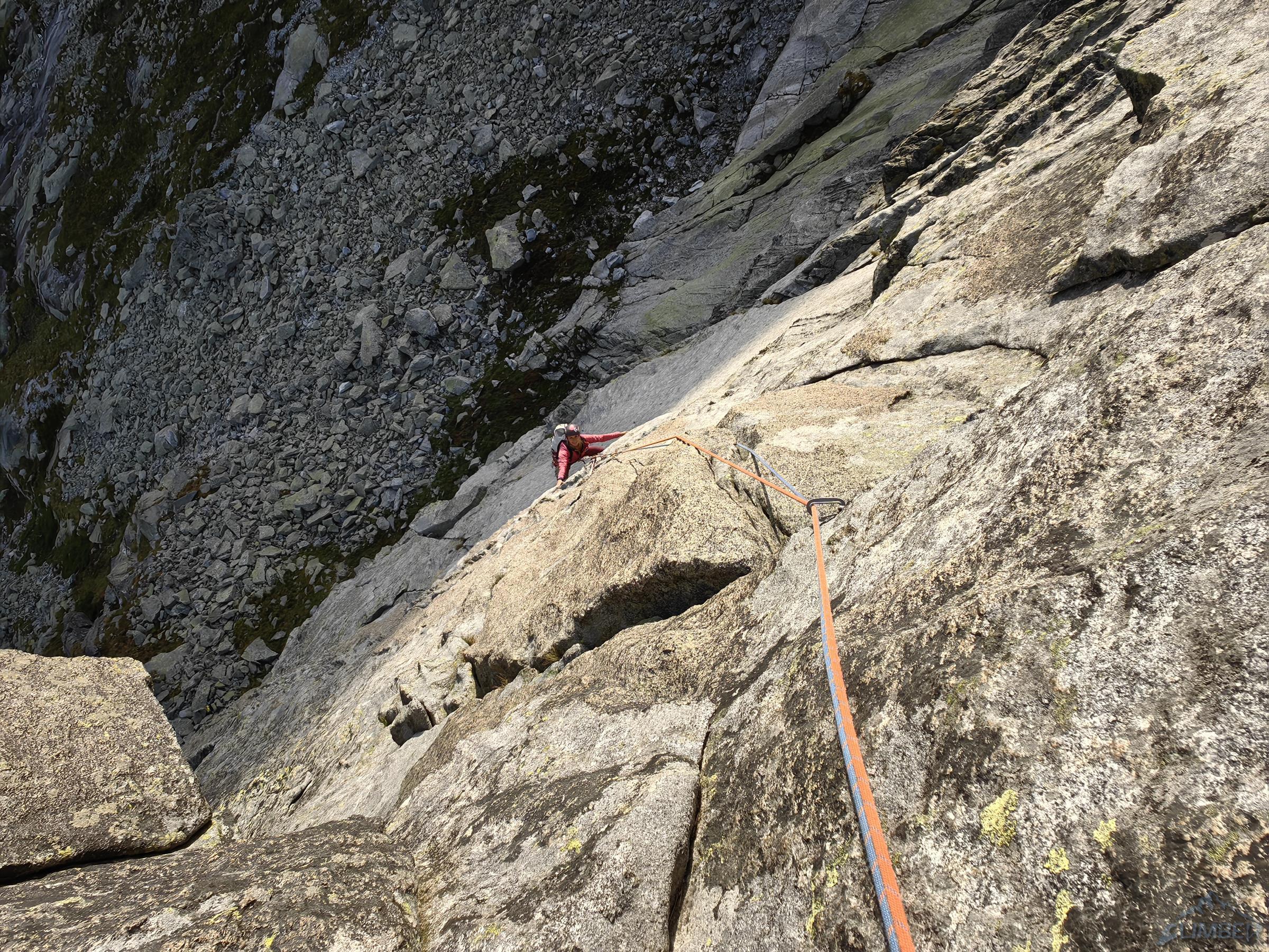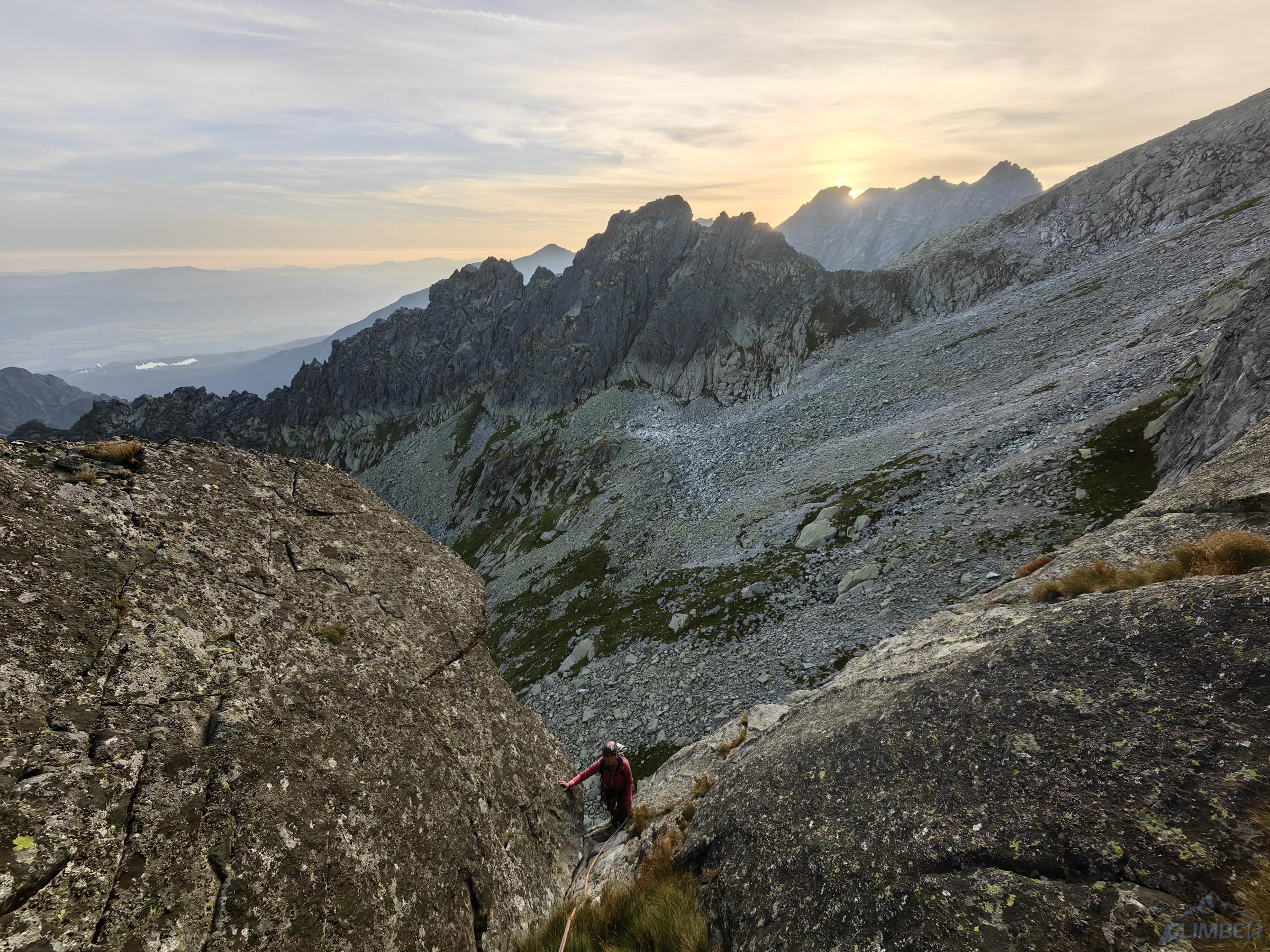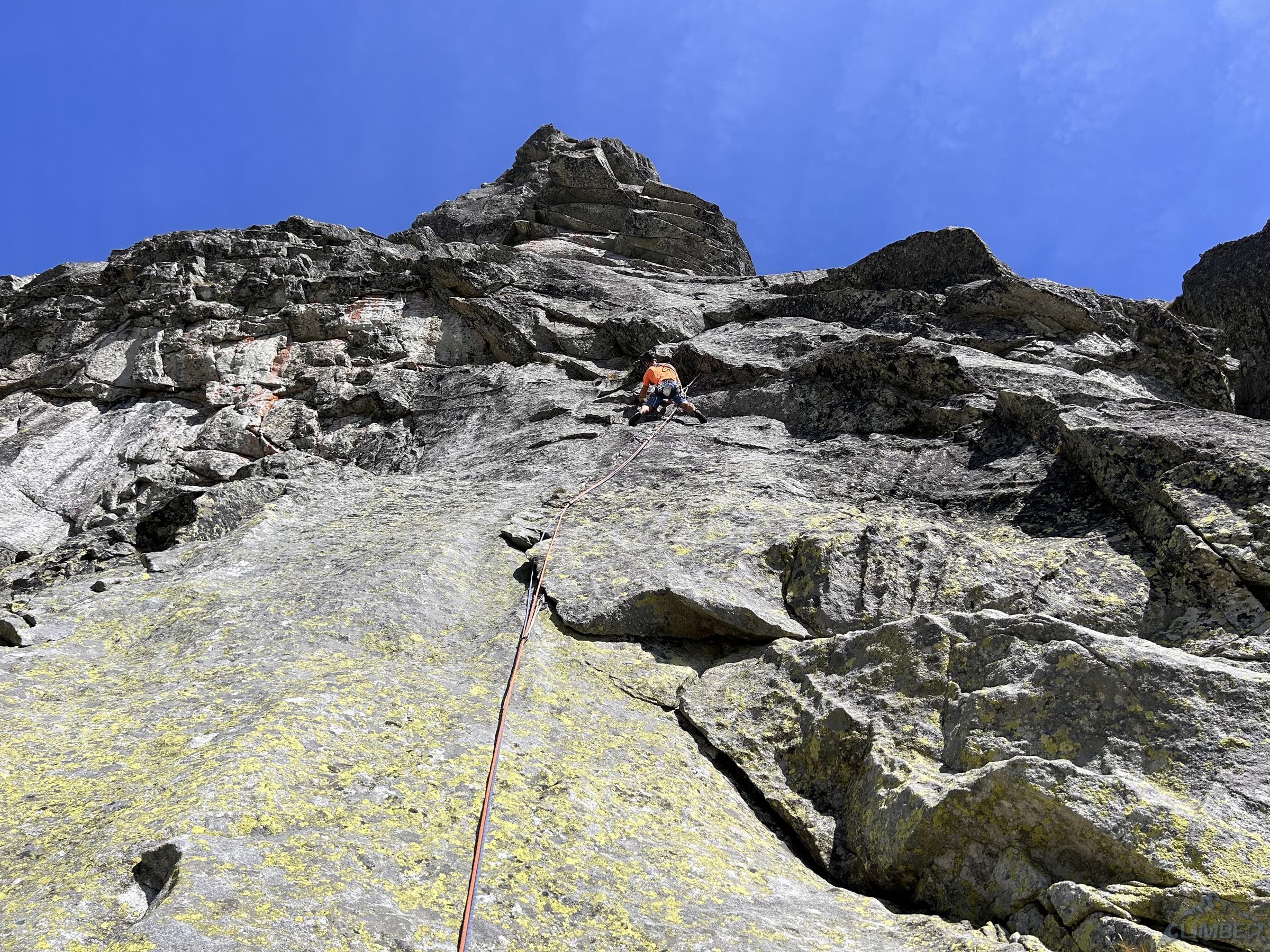 Po późnym dotarciu na miejsce (nie trzeba się spieszyć bo Słońce świeci tutaj do wieczora), zaczynamy od Strechy – nie przez przypadek umieszczonej na mojej liście Tatrzańskich Klasyków. Cała droga z nowym prostowaniem to bowiem prawdziwa perełka – krótko ale treściwie i różnorodnie, do tego bardzo efektownie! Asekuracja na kluczowym wyciągu okazała się wbrew obawom bardzo dobra, potwierdziła się jednak krążąca opinia o „niestandardowym” sposobie pokonania dachu 😉. Linia doczekała się re-ekipacji w 2017 roku (szczegóły w topo), obecnie przechodzi się ją w trzech odcinkach (30m, 20m, 30m) zakończonych stałymi stanowiskami.