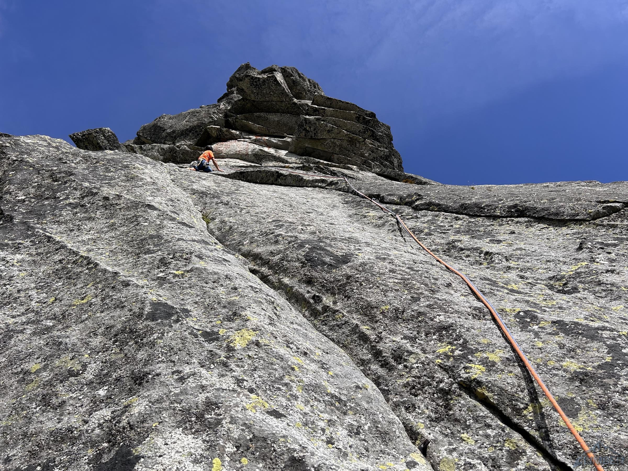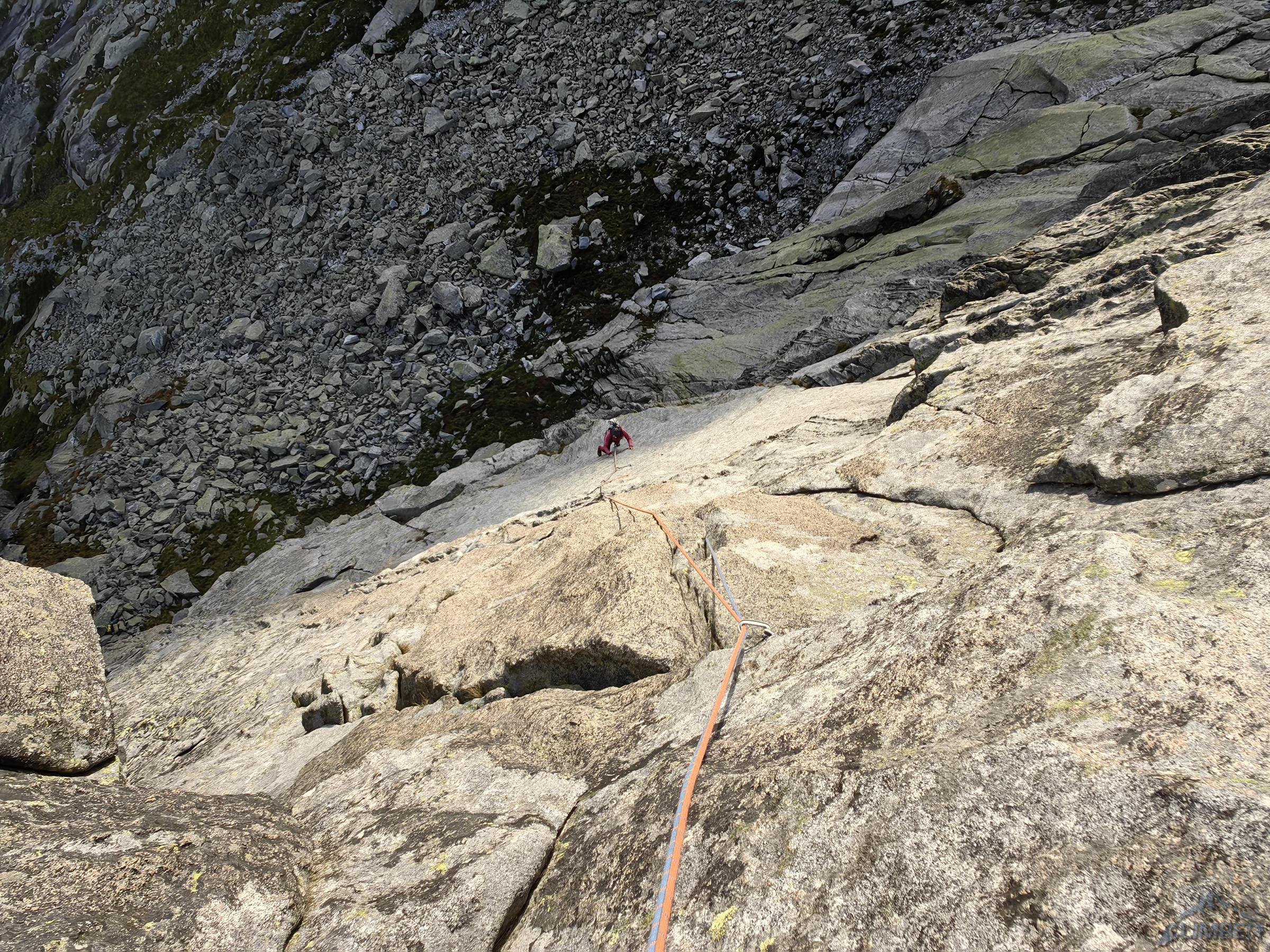 Startujemy ładnym i dość zajmującym jak na piątkowe trudności tradowym odcinkiem wzdłuż pęknięcia w płycie przechodzącego wyżej między okapikami. Drugi wyciąg oryginalnie prowadzi po łuku prawą stroną (V+), zdecydowanie warto wybrać jednak nowy wariant wprost (VII). Wspinamy się na nim odważnie wzdłuż dość odległych spitów w pięknej płycie przeciętej skośnym pęknięciem, po czym już nieco łatwiej do stanowiska pod tytułowym dachem.