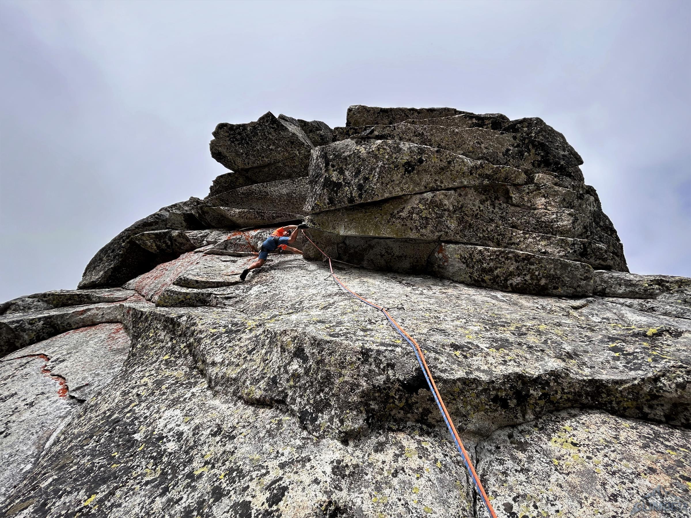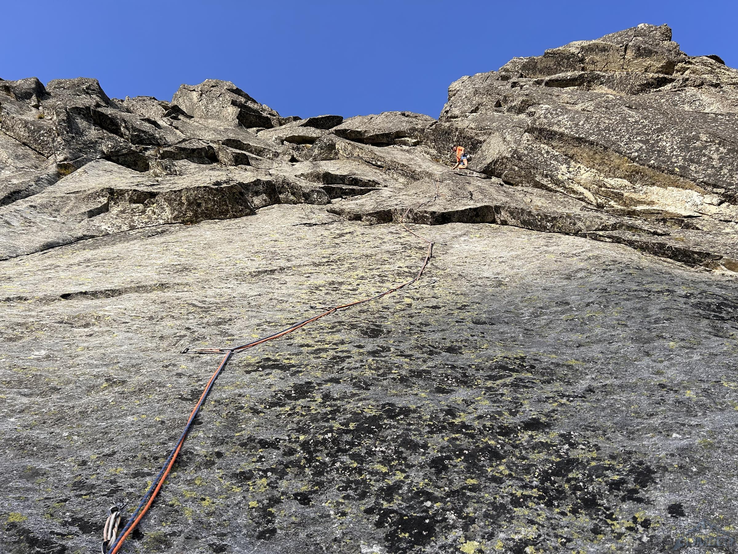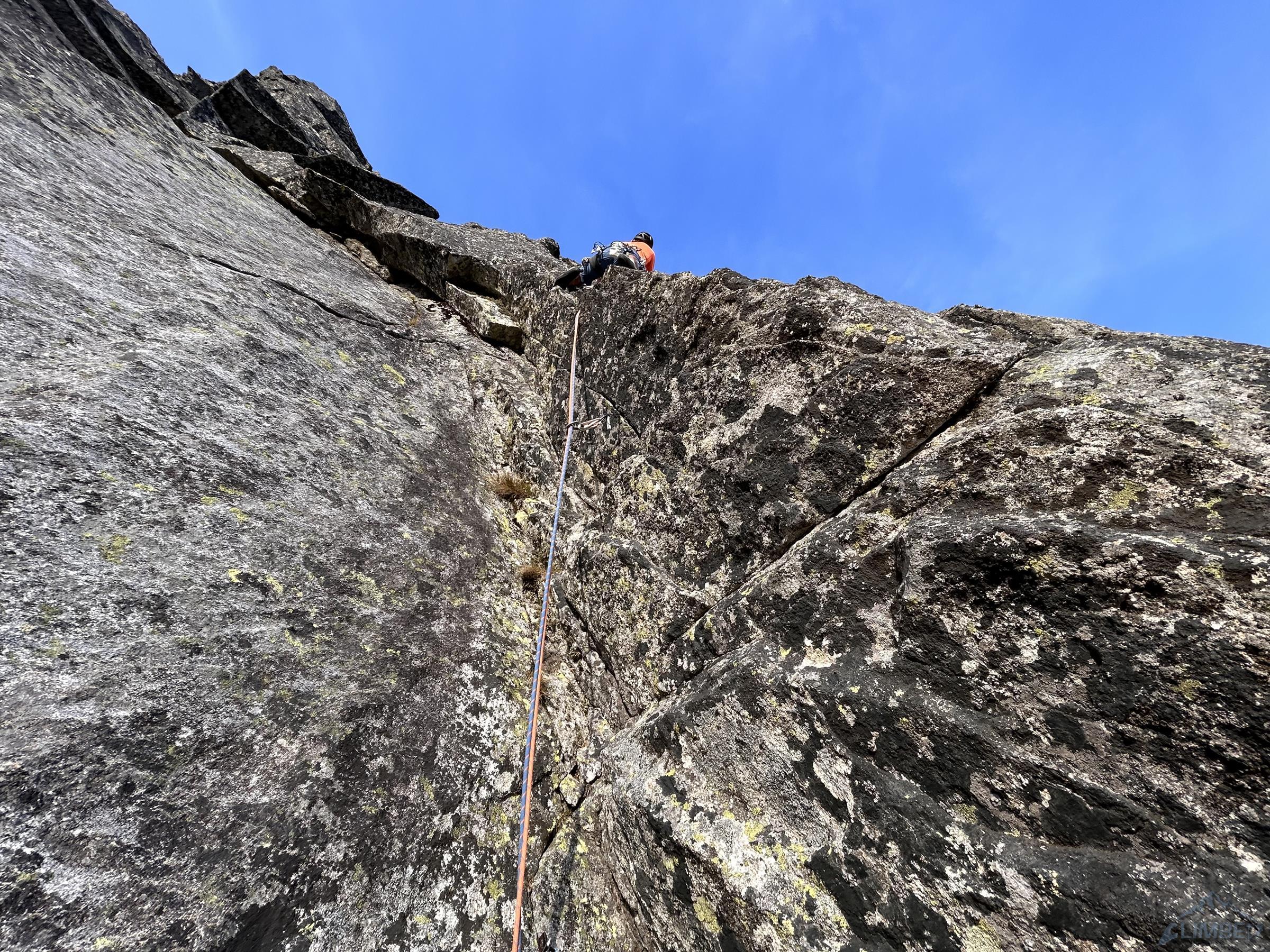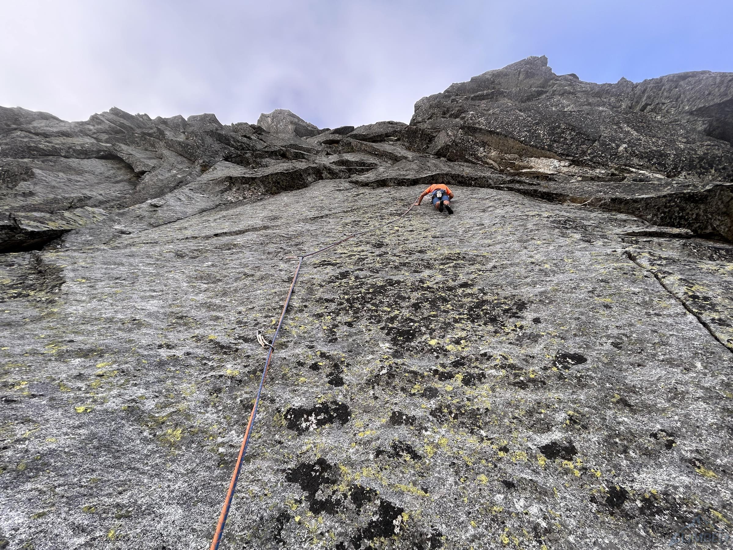Nad nim czeka danie główne – piękna i lita, choć nieco porośnięta z powodu niewielu przejść płyta – dobrze na szczęście obita. Wspinanie po niej jest bardzo techniczne i mocno dające po nogach – pierwsze metry cały czas trzymają w okolicy VII, a kluczowe przejście przez okapik (VIII) jest dość niebanalne. Pierwsza próba kończy się właśnie tam, a że wymyślony patent jest bardzo losowy, stopy bolą niemiłosiernie i pozostaje niewiele czasu do zmroku – postanawiam powtórzyć od początku tylko raz. Crux puszcza rzutem na taśmę, można więc kontynuować – pozostaje łatwiejszy odcinek wzdłuż rysy (VI) już bez spitów, po którym docieramy do stanowiska z dwóch haków pod zacięciem po prawej (25m).
