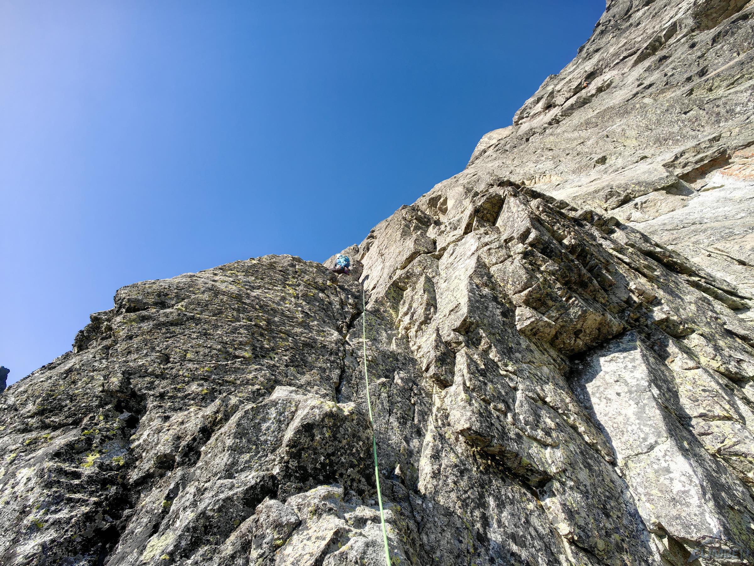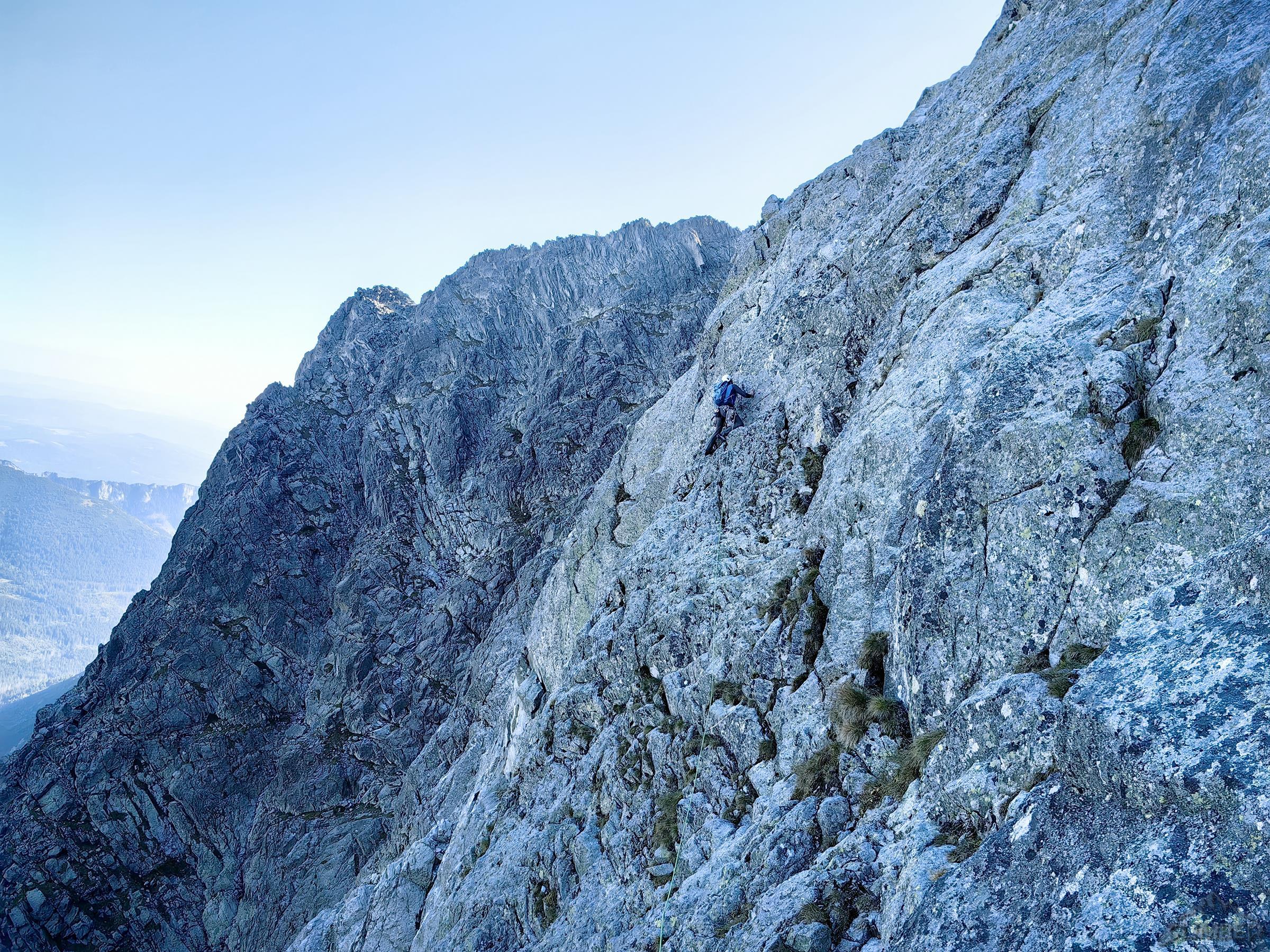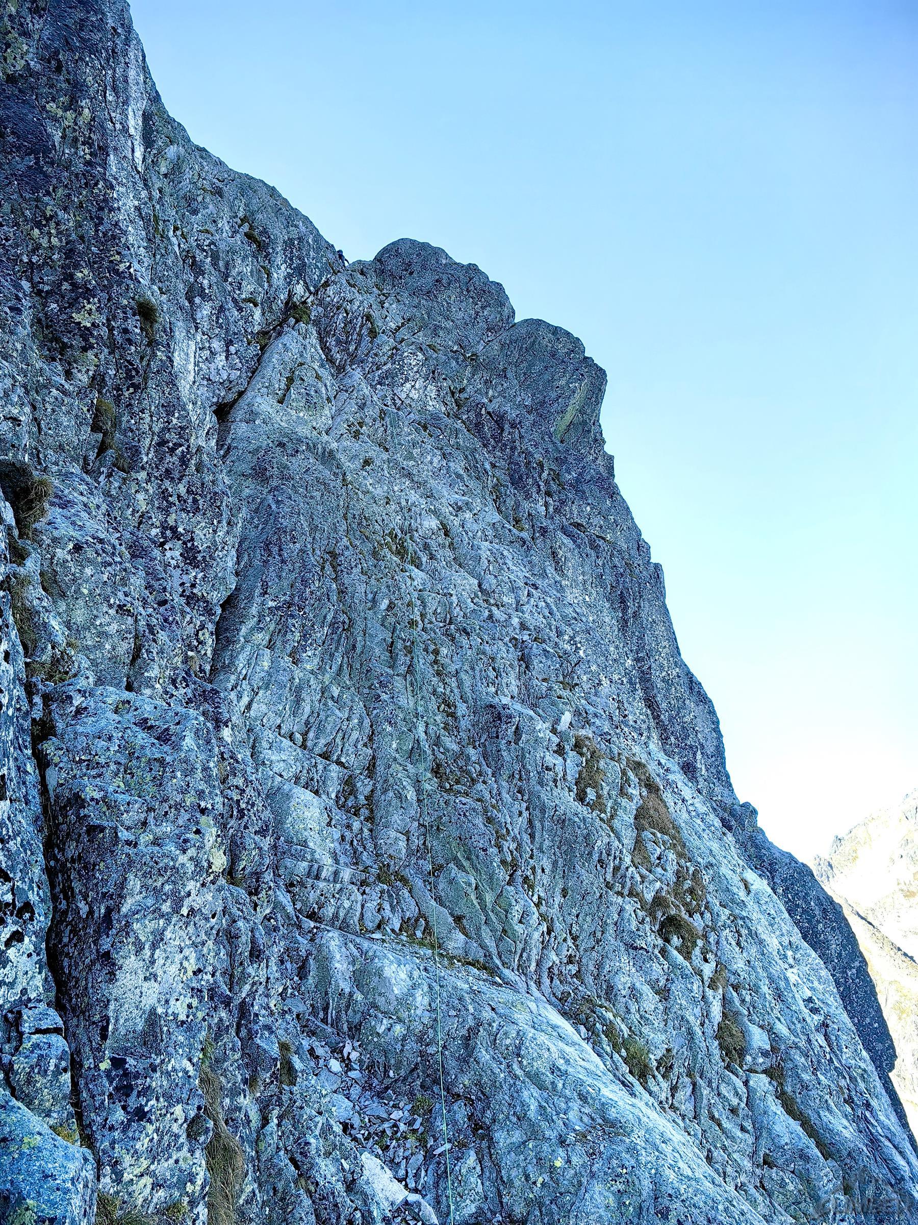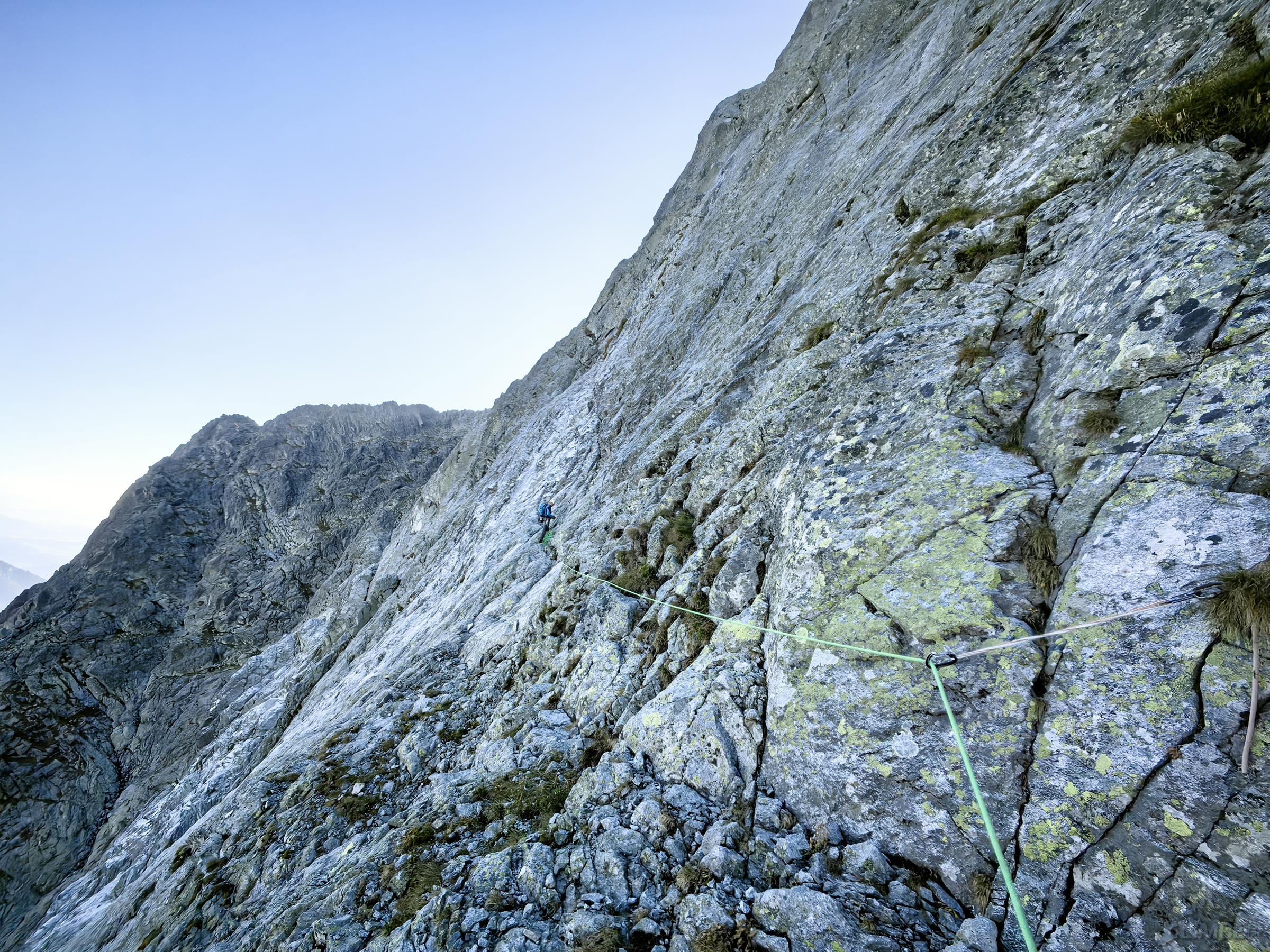 Stąd wspinamy się skośnie w lewo przez płyty (IV/V w zależności od wariantu) idąc za kolejnymi hakami w kierunku wyraźnej rysy na kancie. Przewijamy się pod nią i schodzimy lekko w dół na trawiaste półki. Z nich kontynuujemy (IV) trawers w lewo – na początku idziemy mocno w poziomie, by pod koniec przewinąć się za kolejny filar i dotrzeć do sporego kamienistego tarasu na Pośredniej Srebrnej Drabinie – ewidentnej rampy (III) prowadzącej skośnie w prawo na Kieżmarską Kazalnicę. Z niewiadomych przyczyn kolega przechodzi jednak dalej i ląduję gdzieś wysoko w ścianie – z kwaśnymi minami musimy wspinać się z powrotem w dół 😊.