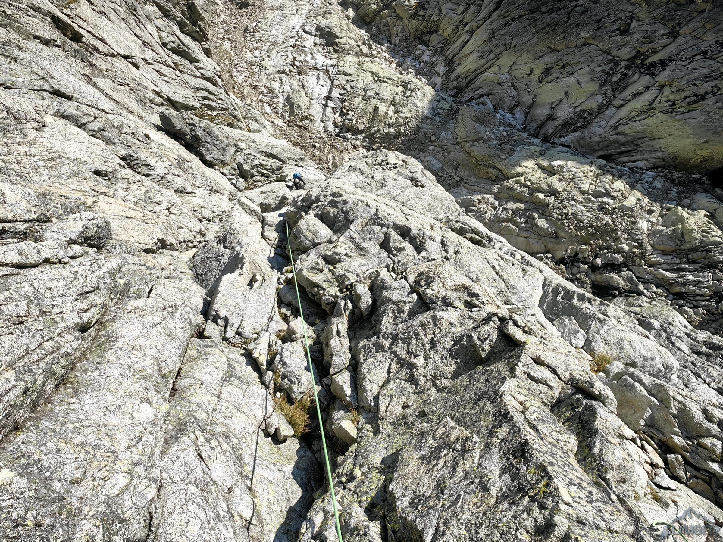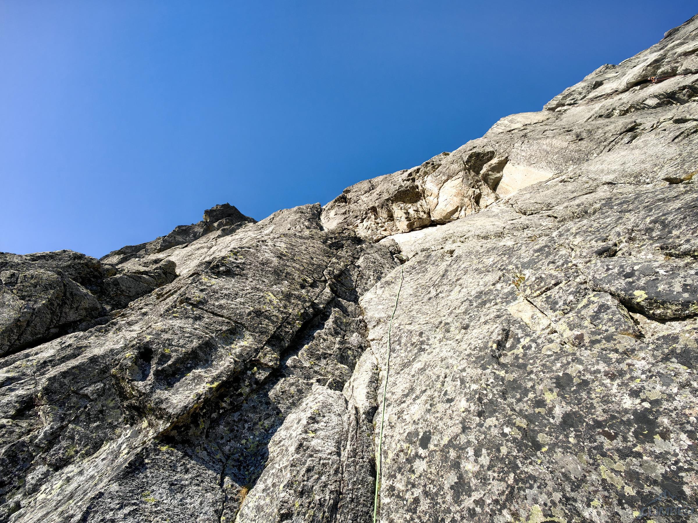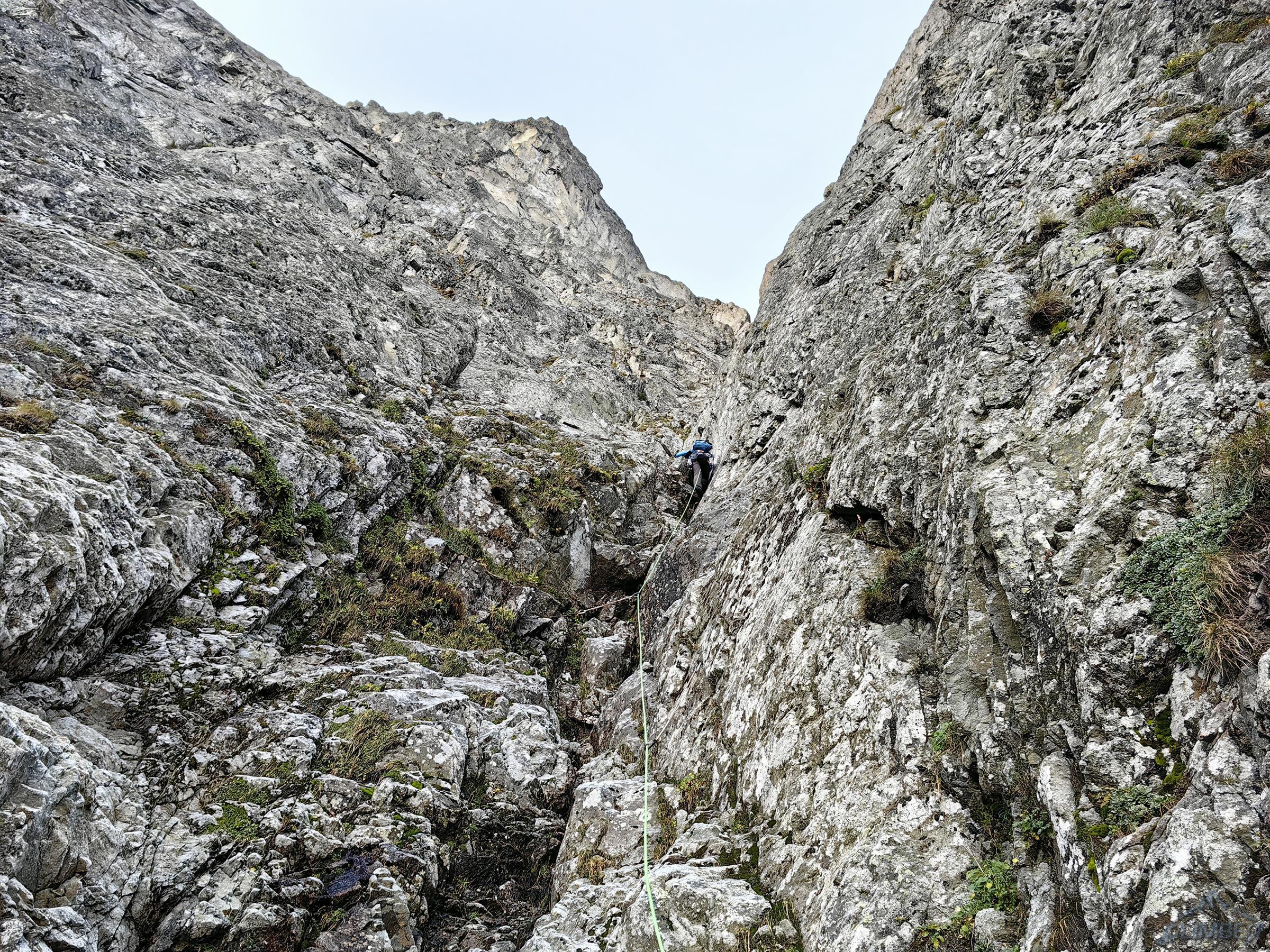 Stąd wspinamy się skośnie w lewo przez płyty (IV/V w zależności od wariantu) idąc za kolejnymi hakami w kierunku wyraźnej rysy na kancie. Przewijamy się pod nią i schodzimy lekko w dół na trawiaste półki. Z nich kontynuujemy (IV) trawers w lewo – na początku idziemy mocno w poziomie, by pod koniec przewinąć się za kolejny filar i dotrzeć do sporego kamienistego tarasu na Pośredniej Srebrnej Drabinie – ewidentnej rampy (III) prowadzącej skośnie w prawo na Kieżmarską Kazalnicę. Z niewiadomych przyczyn kolega przechodzi jednak dalej i ląduję gdzieś wysoko w ścianie – z kwaśnymi minami musimy wspinać się z powrotem w dół 😊.