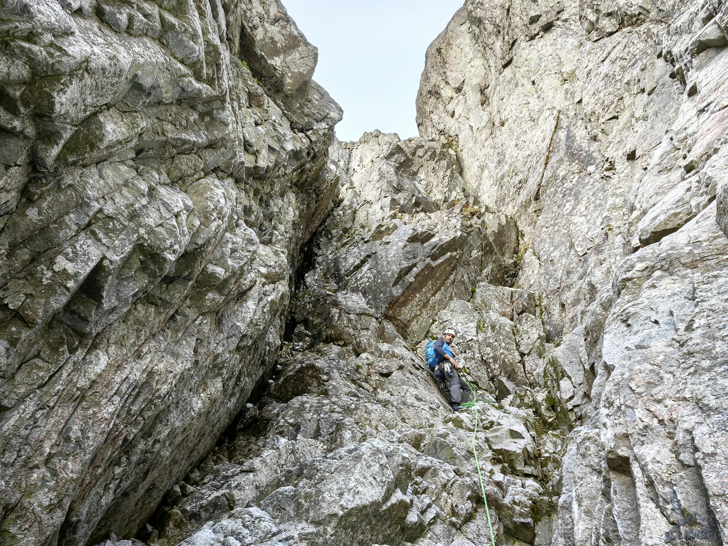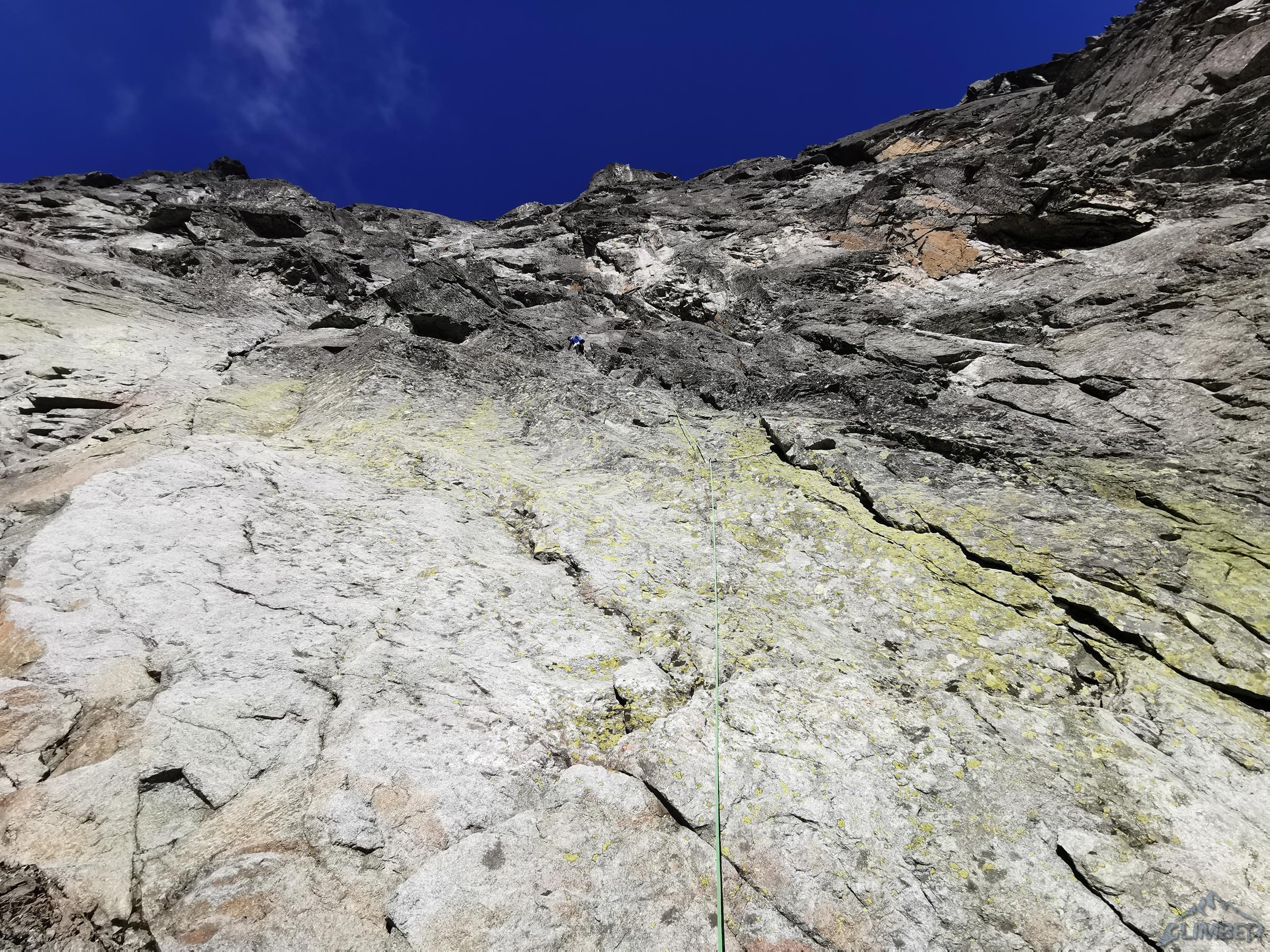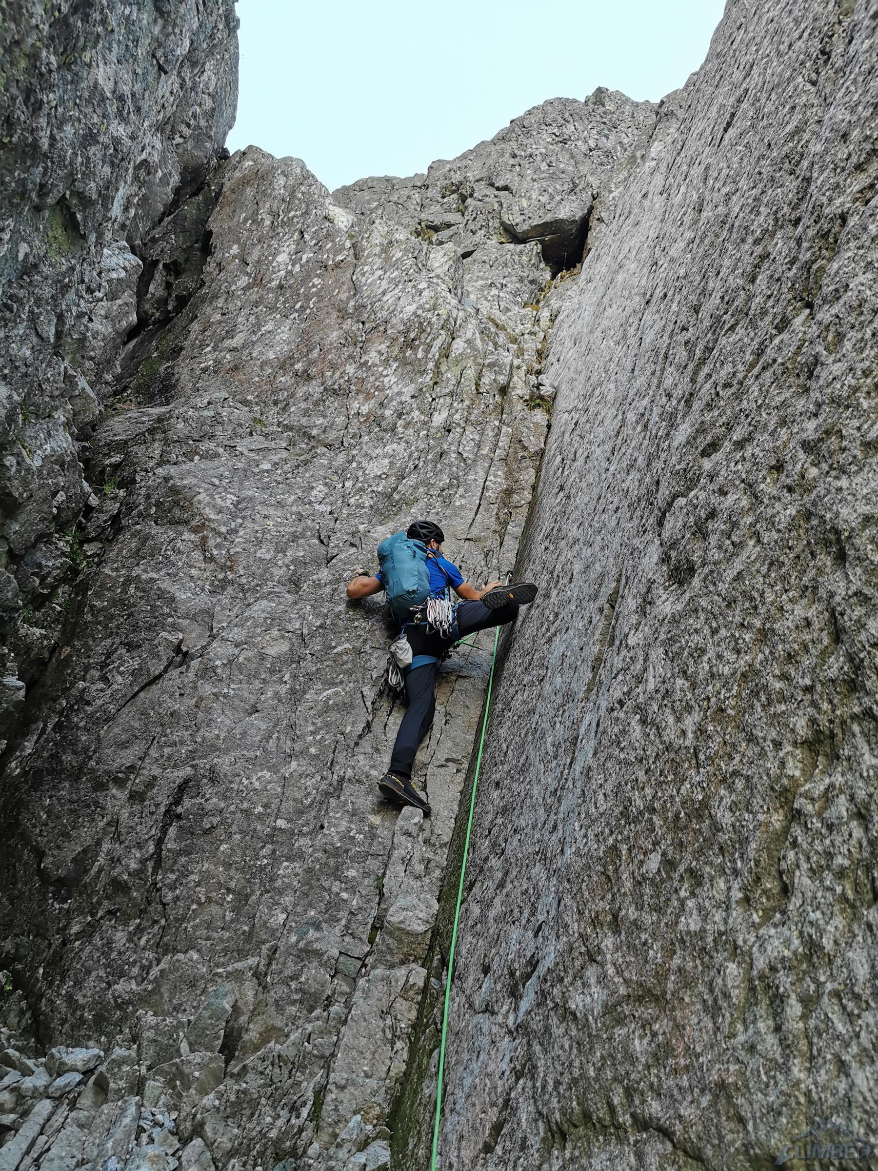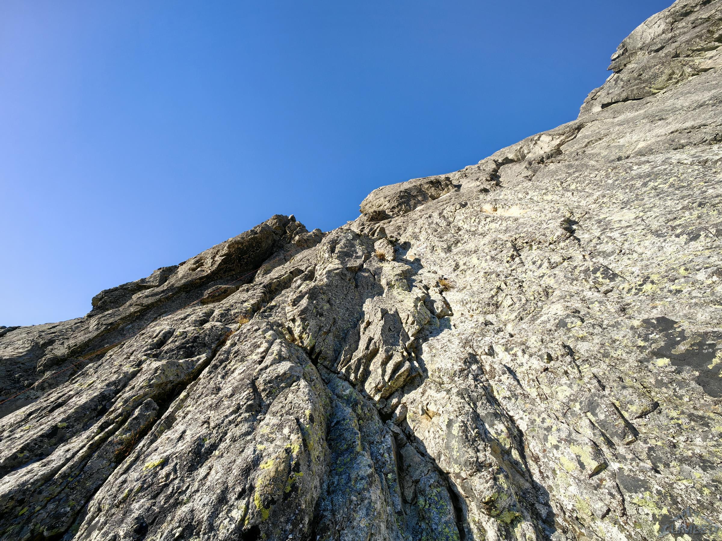 Stąd wspinamy się skośnie w lewo przez płyty (IV/V w zależności od wariantu) idąc za kolejnymi hakami w kierunku wyraźnej rysy na kancie. Przewijamy się pod nią i schodzimy lekko w dół na trawiaste półki. Z nich kontynuujemy (IV) trawers w lewo – na początku idziemy mocno w poziomie, by pod koniec przewinąć się za kolejny filar i dotrzeć do sporego kamienistego tarasu na Pośredniej Srebrnej Drabinie – ewidentnej rampy (III) prowadzącej skośnie w prawo na Kieżmarską Kazalnicę. Z niewiadomych przyczyn kolega przechodzi jednak dalej i ląduję gdzieś wysoko w ścianie – z kwaśnymi minami musimy wspinać się z powrotem w dół 😊.