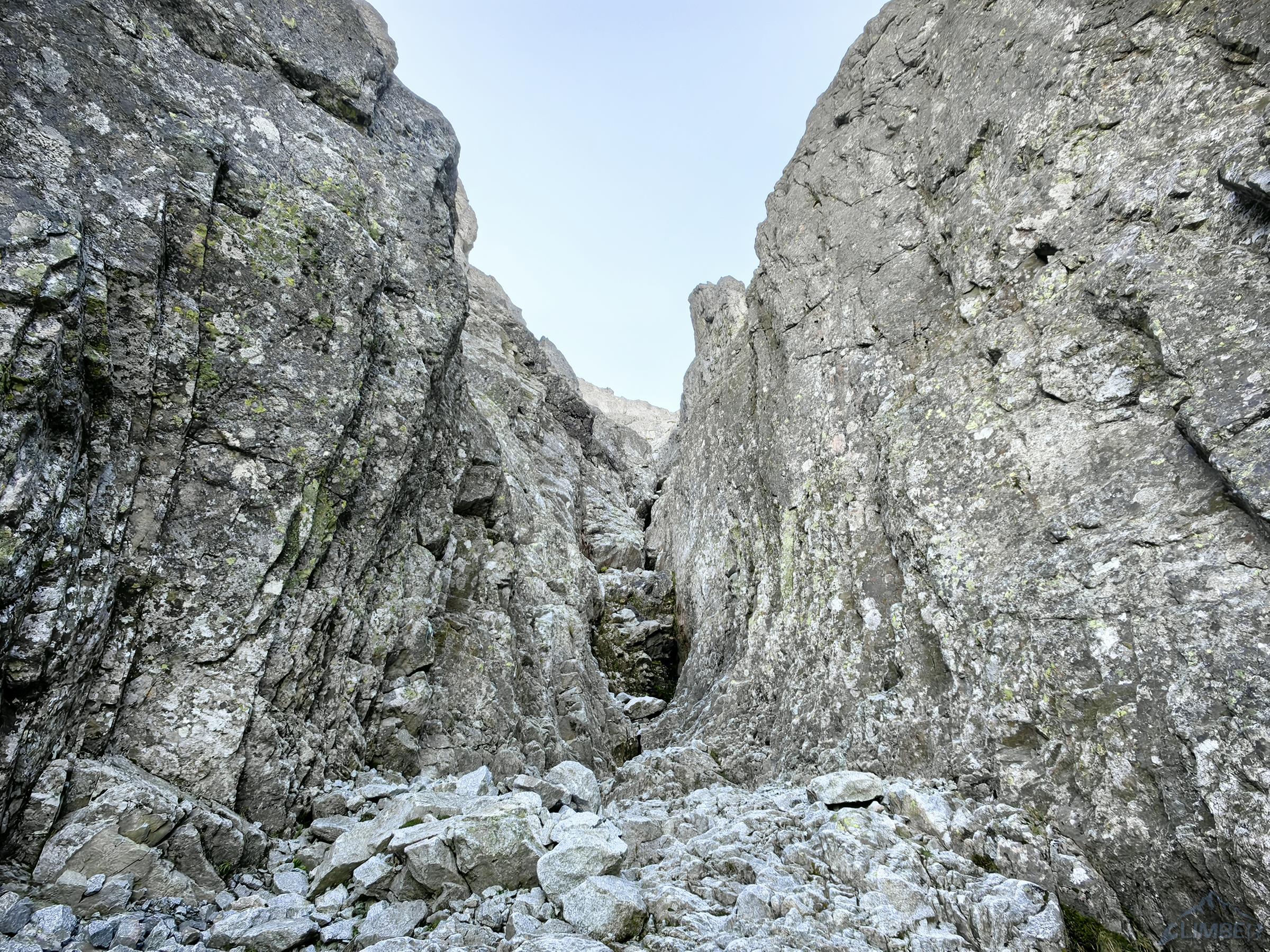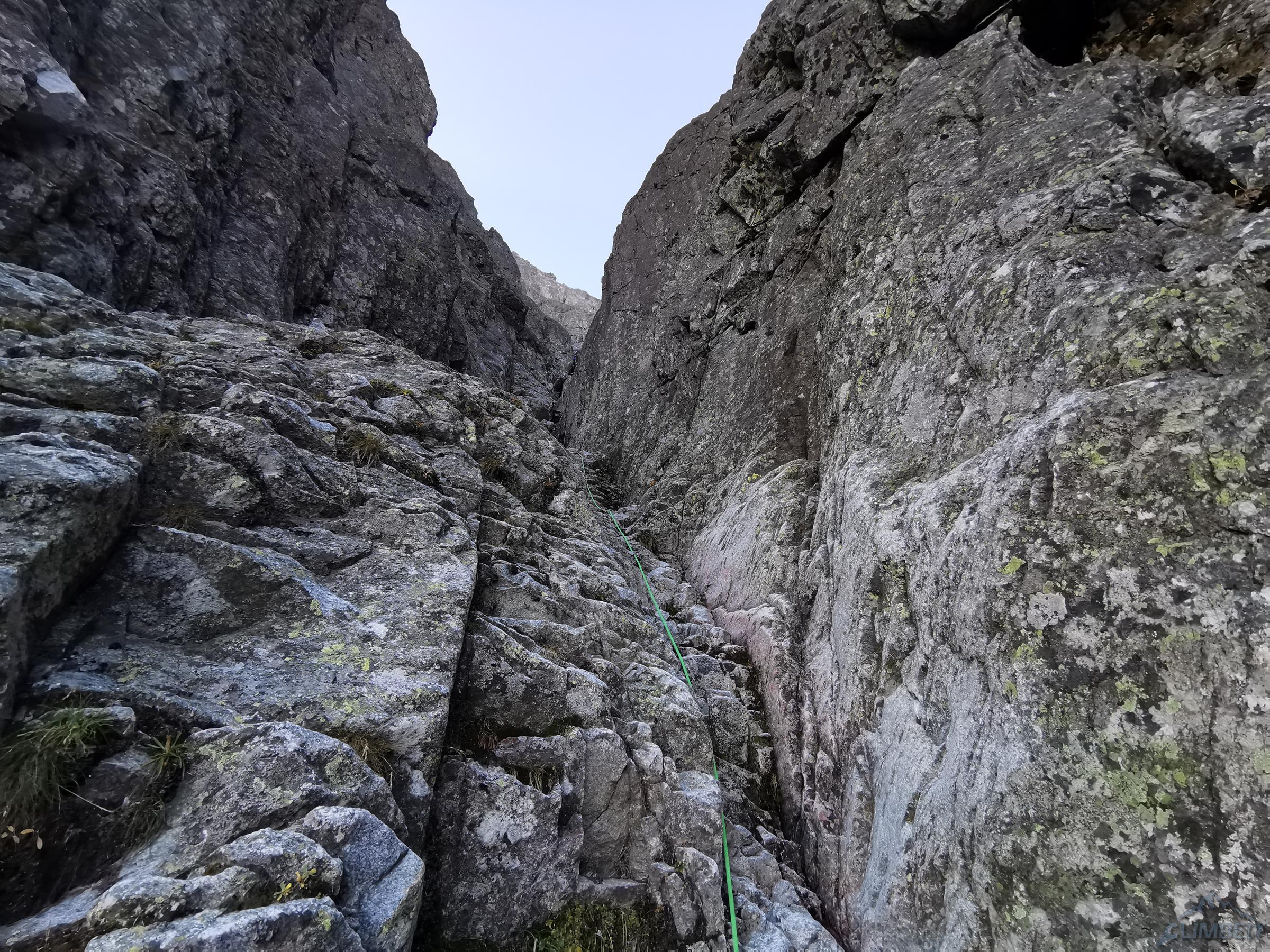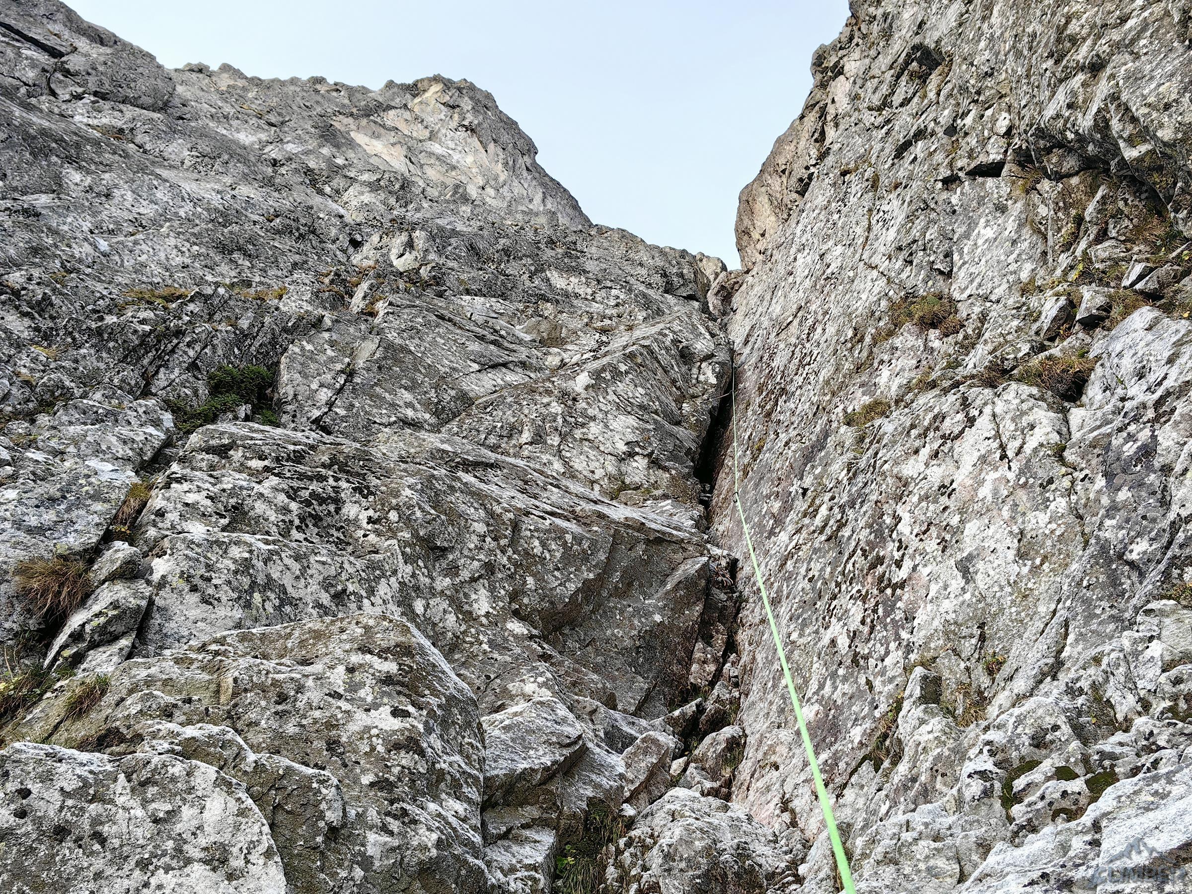 By dostać się pod początek „właściwego” wspinania czeka na wejście do Kotła pod Kominem – próg pokonujemy po najmniejszej linii oporu, połogimi skałami poprzetykanymi trawą (III). Pierwszy łańcuch znajdziemy w górnej części żlebu, po prawej stronie – około 3 metry nad ziemią (celowo pod kątem zimy). Stąd wspinamy się depresją po lewej (IV) i po wyjściu w łatwy teren podchodzimy do stanowiska na prawo od piętrzącego się do góry ciągu kominów. Wyciąg trzeci to nietrudne (IV) wspinanie żlebem, przechodzącym wyżej w zwężający się komin – na kolejnym odcinku do pokonaniu mamy jeden bardziej stromy fragment (V). Piąty odcinek (V) prowadzi dnem szerszego komina, z którego wychodzimy jego prawą ścianą – to chyba jeden z ciekawszych fragmentów całej drogi.