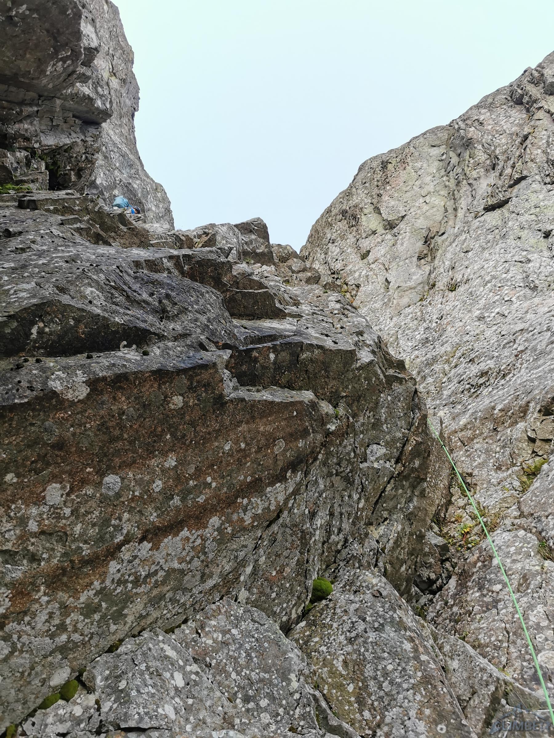 Znając Komin i pokonując łatwiejsze jego fragmenty na lotnej asekuracji na Niemieckiej Drabinie meldujemy się po dwóch godzinach (standardowo można założyć ok. 3-4h), robimy krótką przerwę i lustrujemy górną część ściany. Mimo wczesnej pory po nasłuchaniu się opowieści jak to trudno rozpracować przebieg dalszej drogi mamy sporo obaw czy starczy nam czasu na całą łańcuchówkę. Jak się jednak okazuje mimo braku zdjęć i sprawdzonych informacji okazuje się to bardzo proste – opis z WHP okazuje się wystarczający. Podchodzimy kawałek Drabiną i w miejscu gdzie kończy się pas przewieszek odnajdujemy startowe zacięcie z rysą. To jak zauważył już Grzesiek Folta jest zdecydowanie łatwiejsze niż pierwsza klasyczna wycena (max V, a nie VI) – ponownie jednak nie wiadomo jak miejsce to wyglądać mogło kiedyś. Po wyjściu z trudności czeka nas łatwy trawers w lewo do gotowego stanowiska – haki z taśmą.