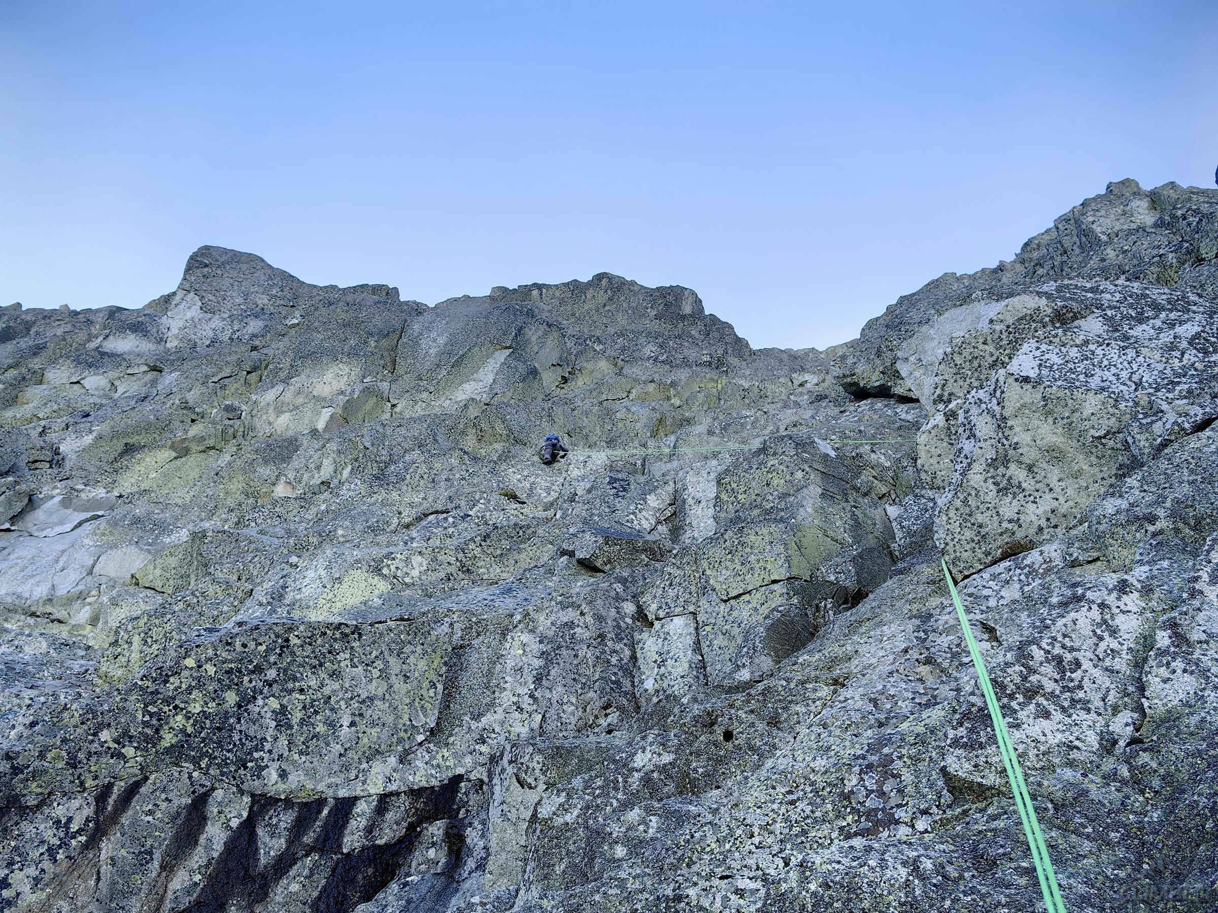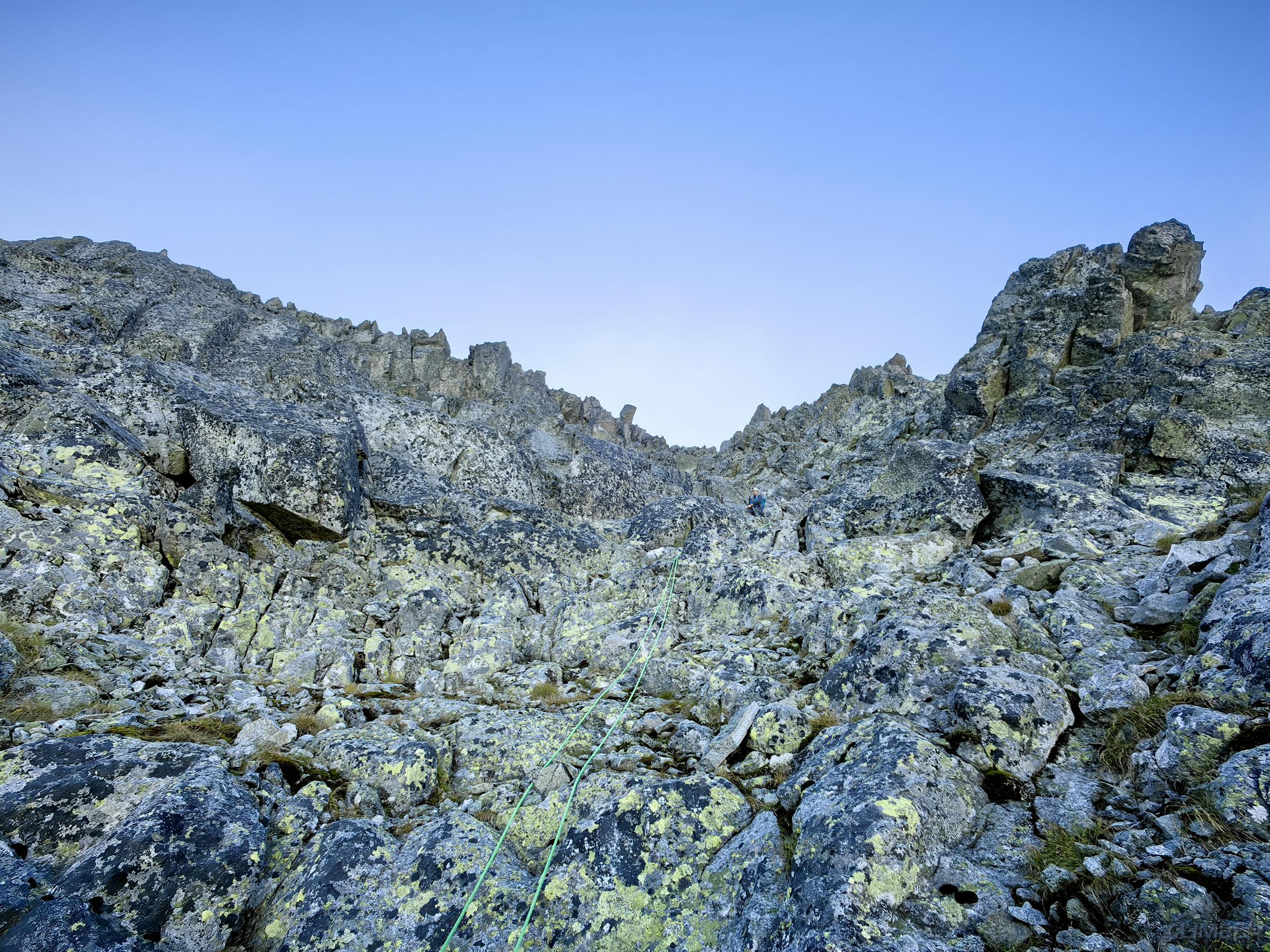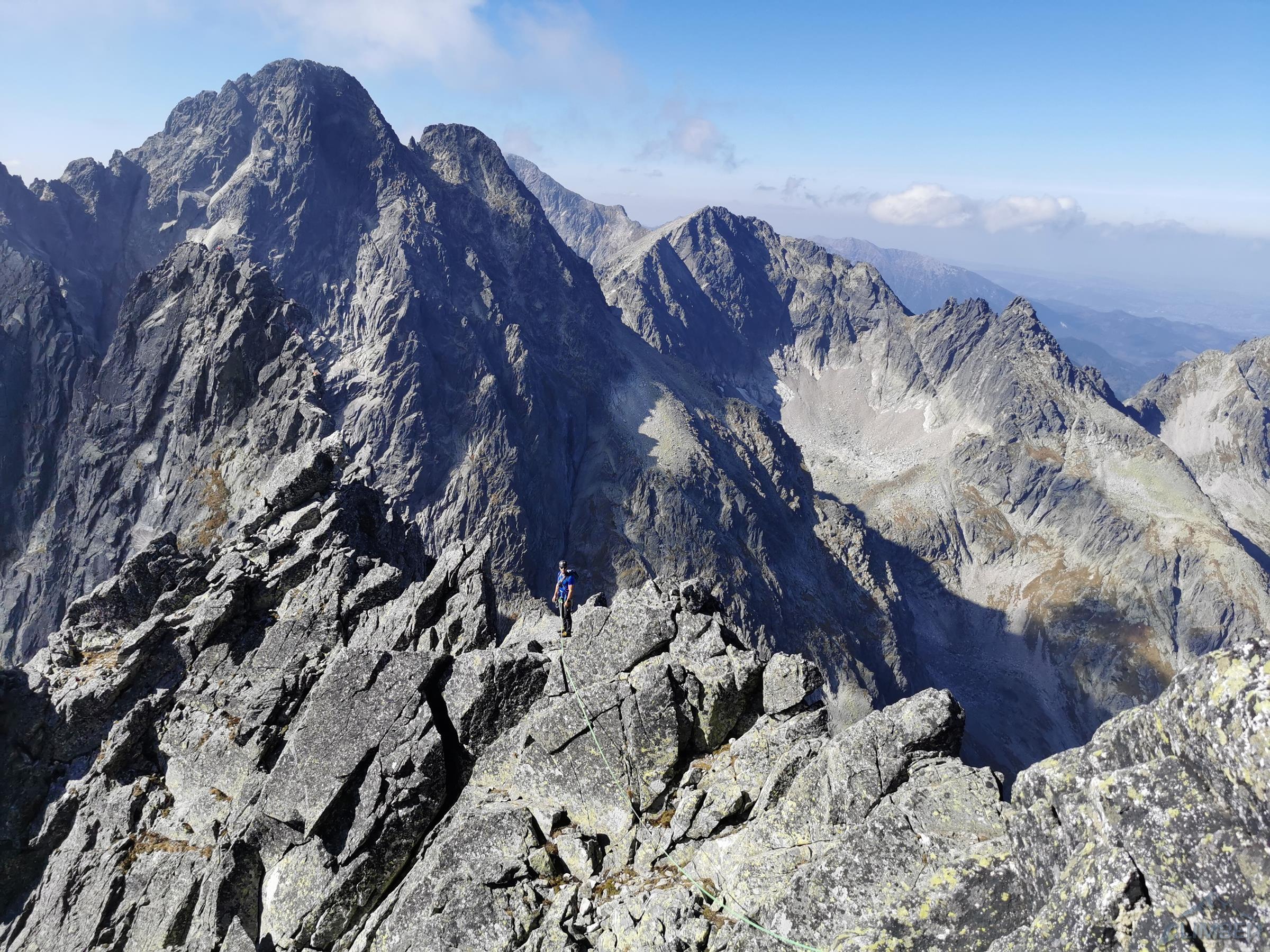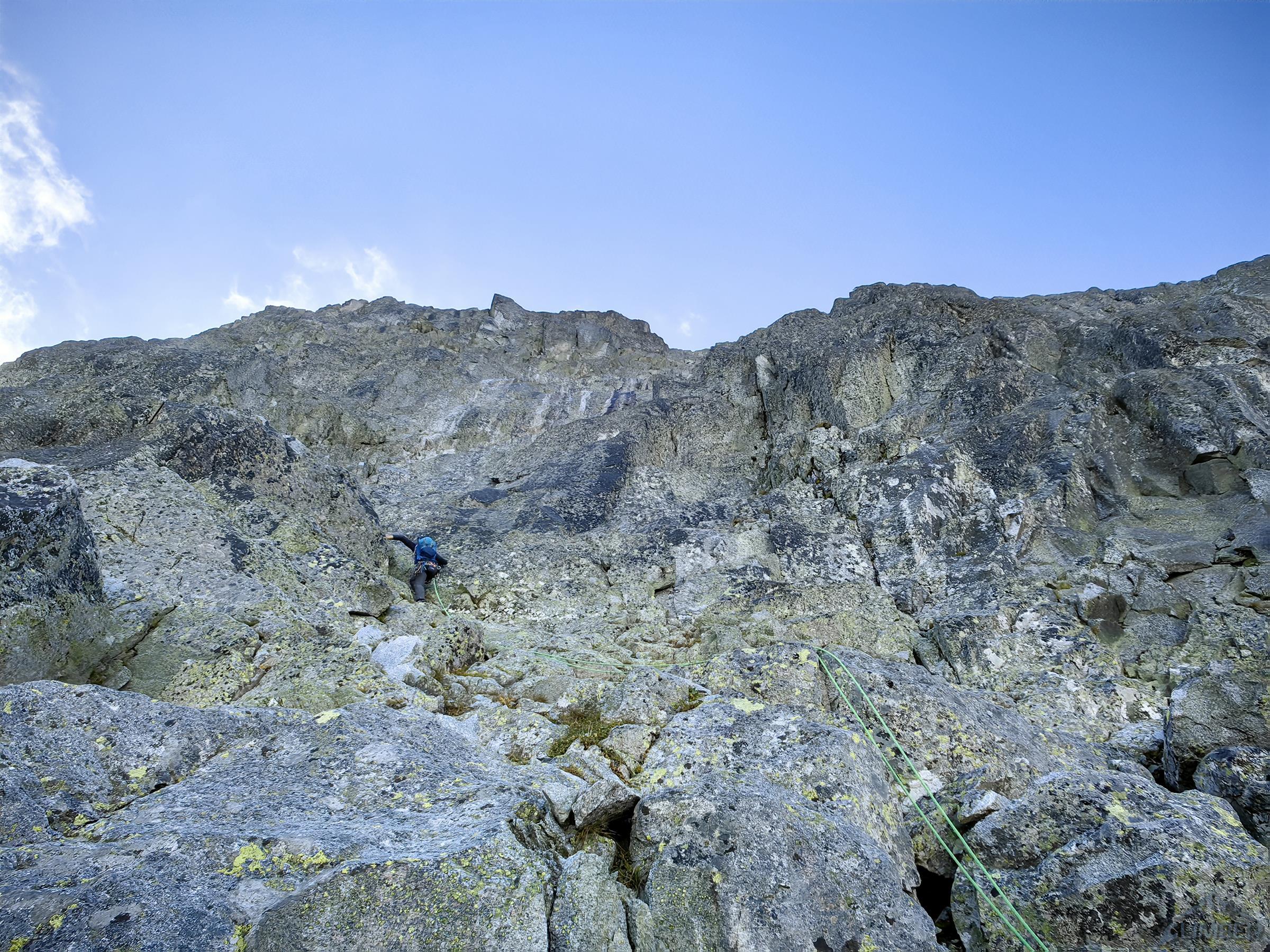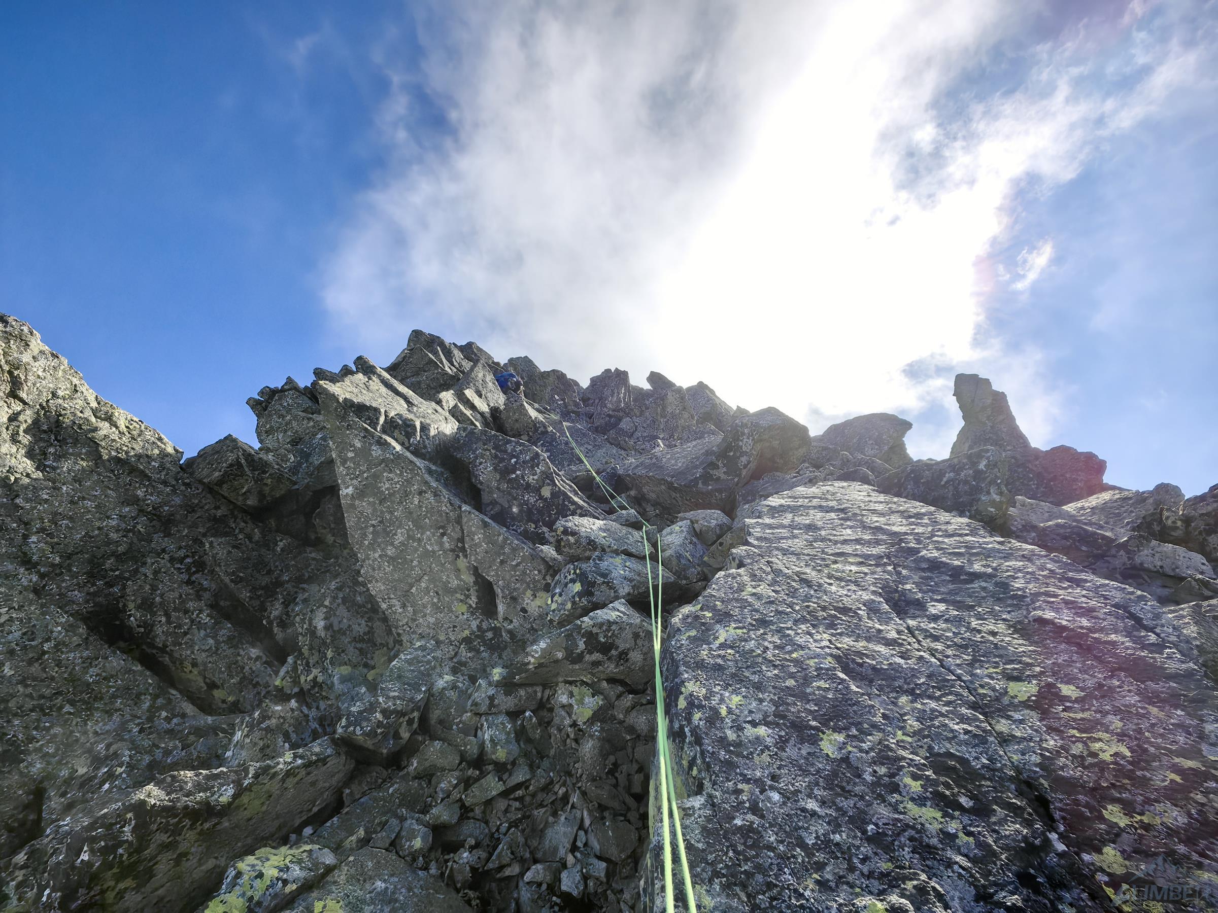 Na Kazalnicę docieramy już na lotnej i by nadgonić trochę czasu od razu ruszamy dalej. Dalsze kilkaset metrów (w sumie Górny Stanisławski będzie miał ok. 600m, w przewyższeniu ok. 400m) prowadzi ewidentną szeroką depresją na lewo od piętrzącego się nad nami filara – mikro-wariantów o podobnych trudnościach (III-IV) jest mnóstwo, ciężko więc o szczegóły. Generalnie co jakiś czas czytaliśmy WHP starając się iść wg opisu – czasami jednak wybieraliśmy kolejne pasaże intuicyjnie, starając się wymijać wielkie kruche bloki, które miejscami ledwo się trzymają... Po przełamaniu ściany wychodzimy do rozległego kotła pod granią i po wyjściu na nią odbijamy w lewo na pobliski szczyt (II-III). Na Małym Kieżmarskim jesteśmy po 2,5 godziny, a kilka minut później na jego większym bracie – udało się (prawie) nie błądzić i wyrobić zgodnie z planem, pozwalamy więc sobie na dłuższą przerwę przed rozpoczęciem dalszej części naszej „taternickiej wycieczki”.