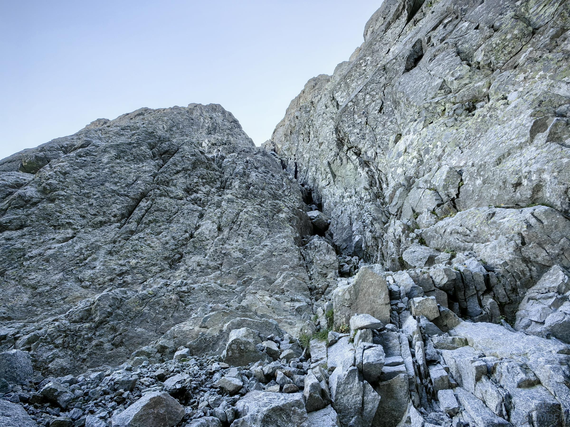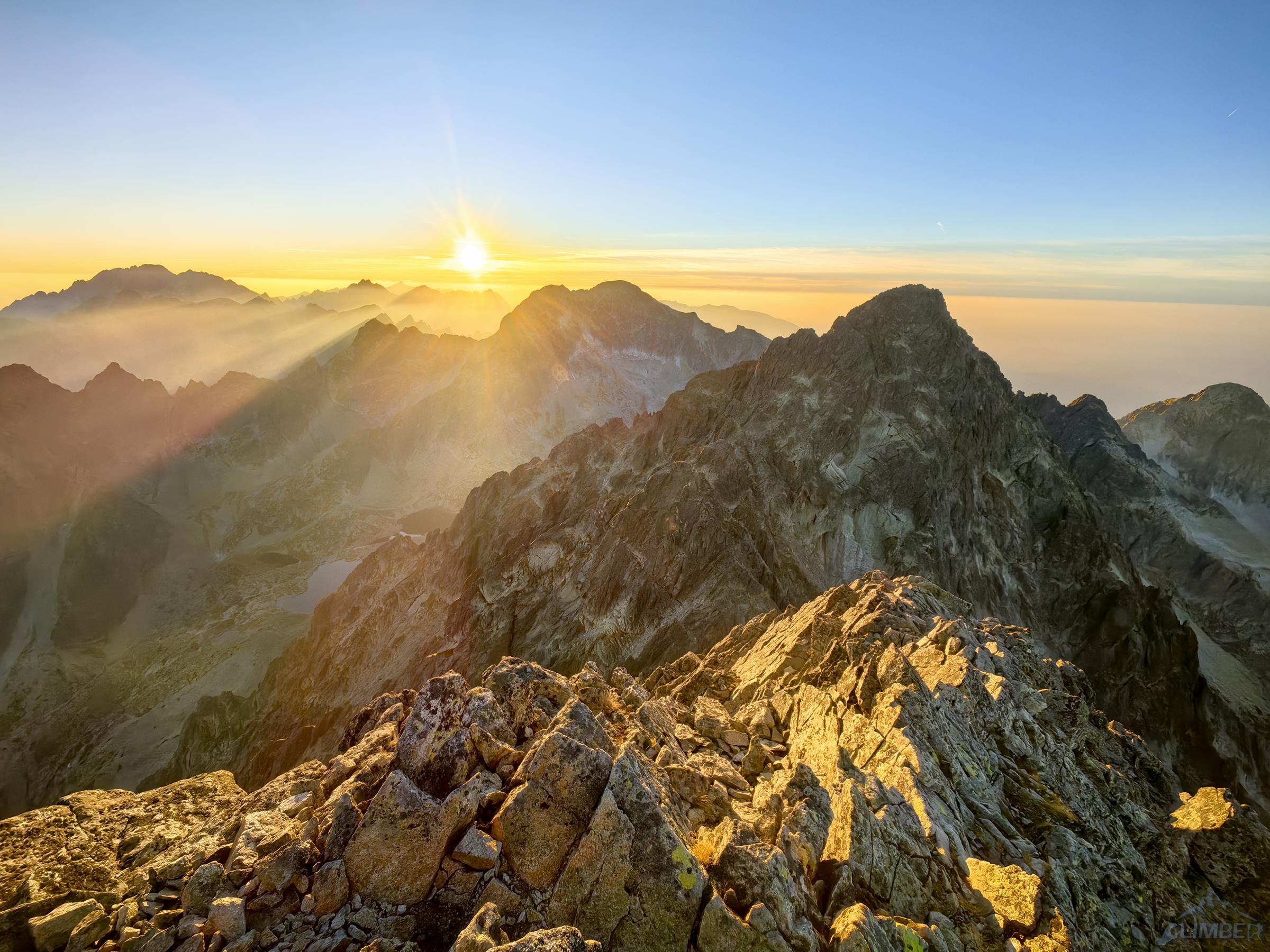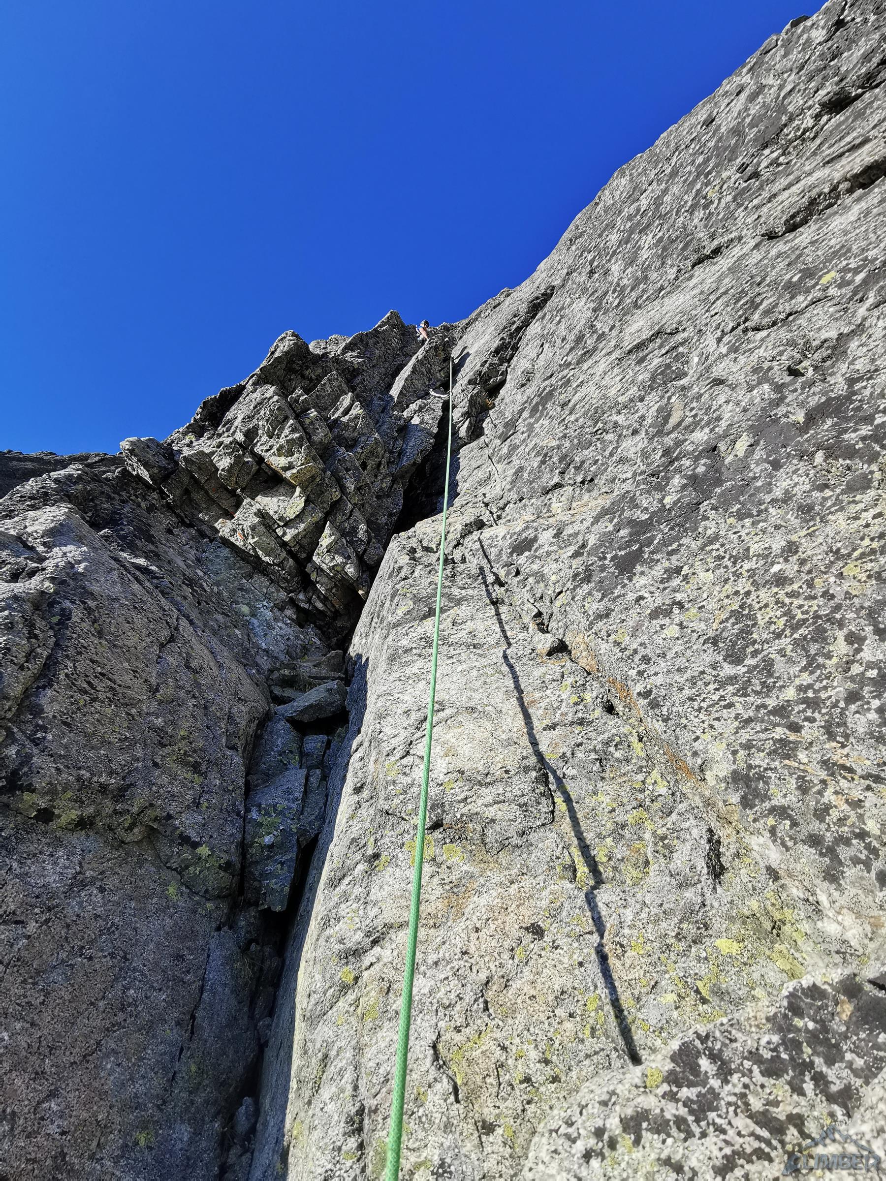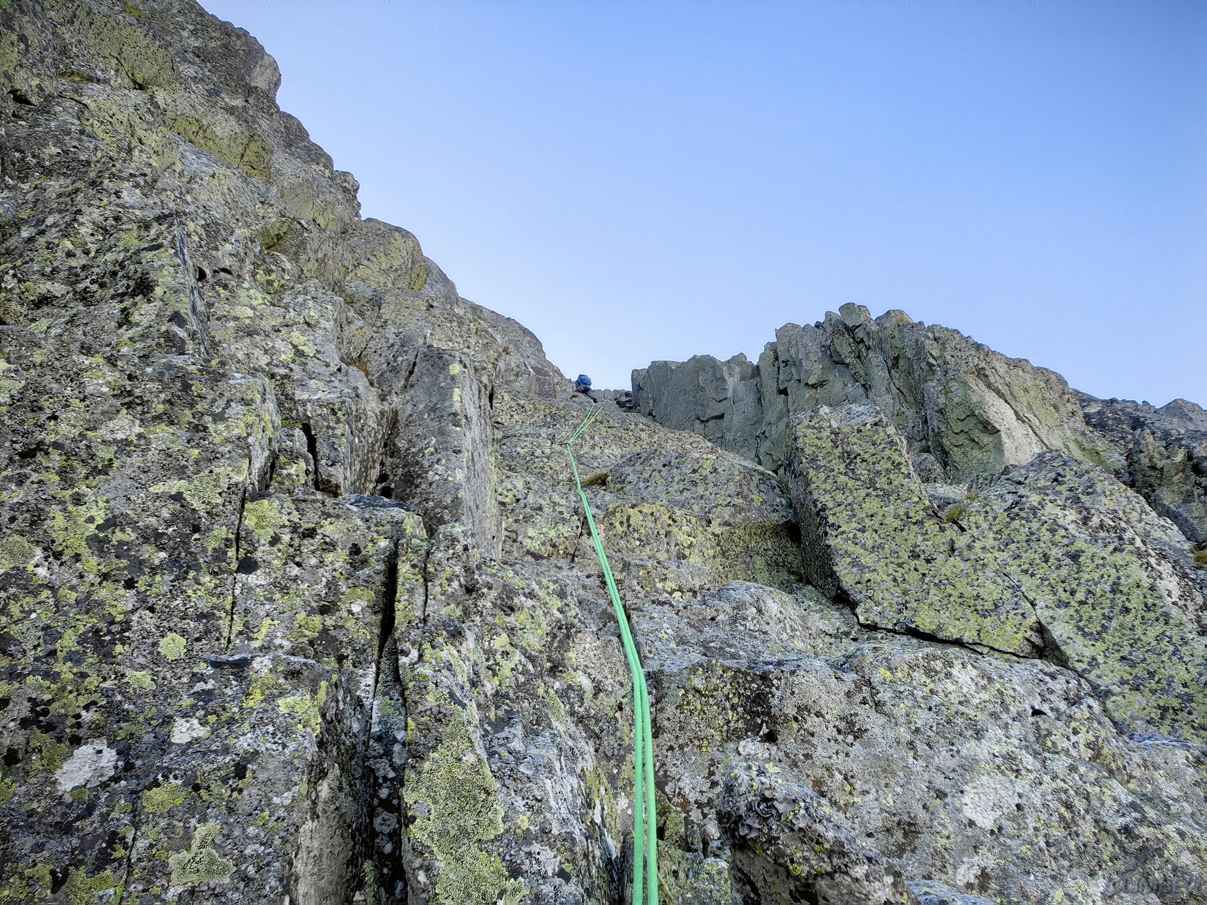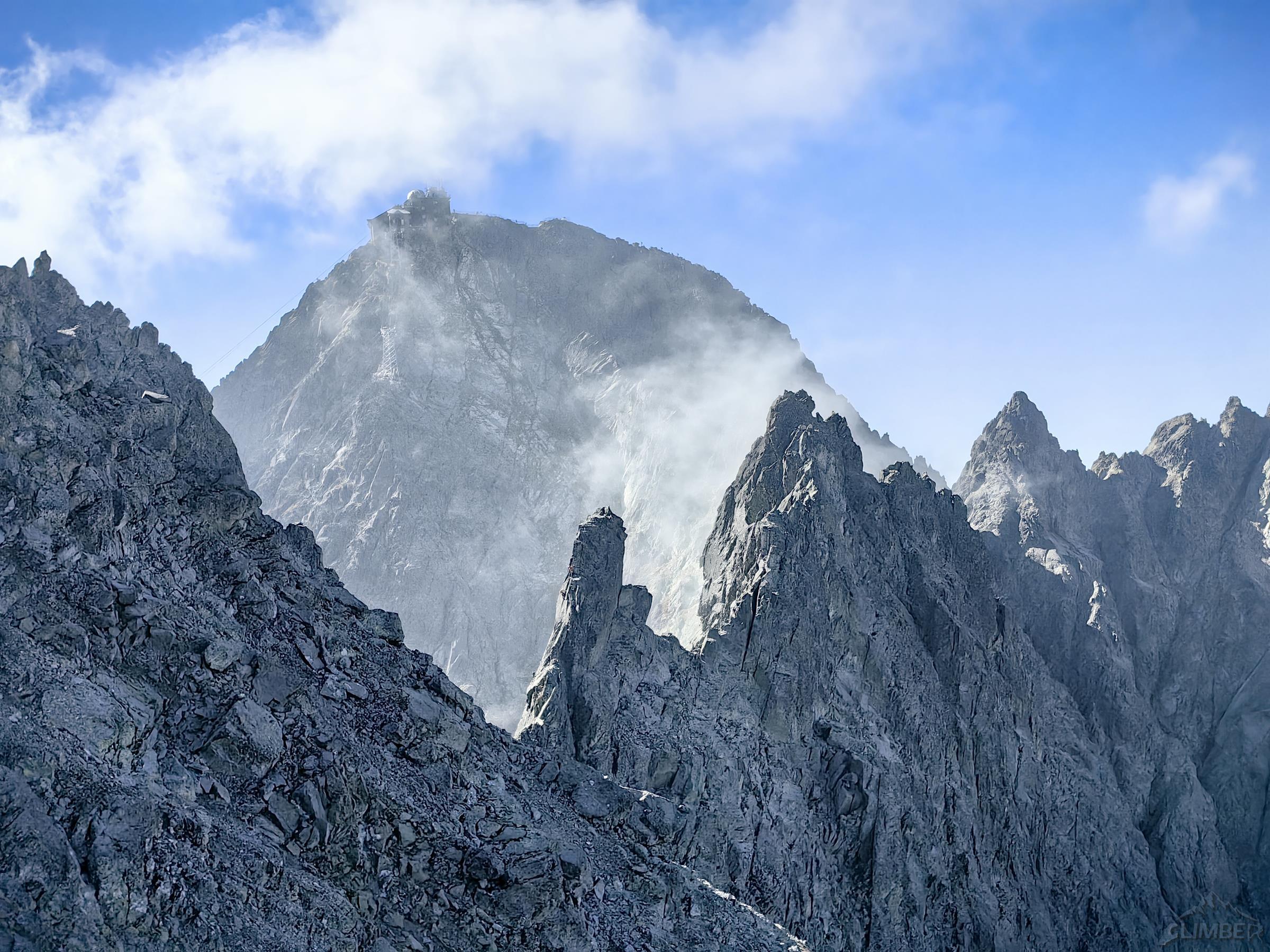 Na Kazalnicę docieramy już na lotnej i by nadgonić trochę czasu od razu ruszamy dalej. Dalsze kilkaset metrów (w sumie Górny Stanisławski będzie miał ok. 600m, w przewyższeniu ok. 400m) prowadzi ewidentną szeroką depresją na lewo od piętrzącego się nad nami filara – mikro-wariantów o podobnych trudnościach (III-IV) jest mnóstwo, ciężko więc o szczegóły. Generalnie co jakiś czas czytaliśmy WHP starając się iść wg opisu – czasami jednak wybieraliśmy kolejne pasaże intuicyjnie, starając się wymijać wielkie kruche bloki, które miejscami ledwo się trzymają... Po przełamaniu ściany wychodzimy do rozległego kotła pod granią i po wyjściu na nią odbijamy w lewo na pobliski szczyt (II-III). Na Małym Kieżmarskim jesteśmy po 2,5 godziny, a kilka minut później na jego większym bracie – udało się (prawie) nie błądzić i wyrobić zgodnie z planem, pozwalamy więc sobie na dłuższą przerwę przed rozpoczęciem dalszej części naszej „taternickiej wycieczki”.