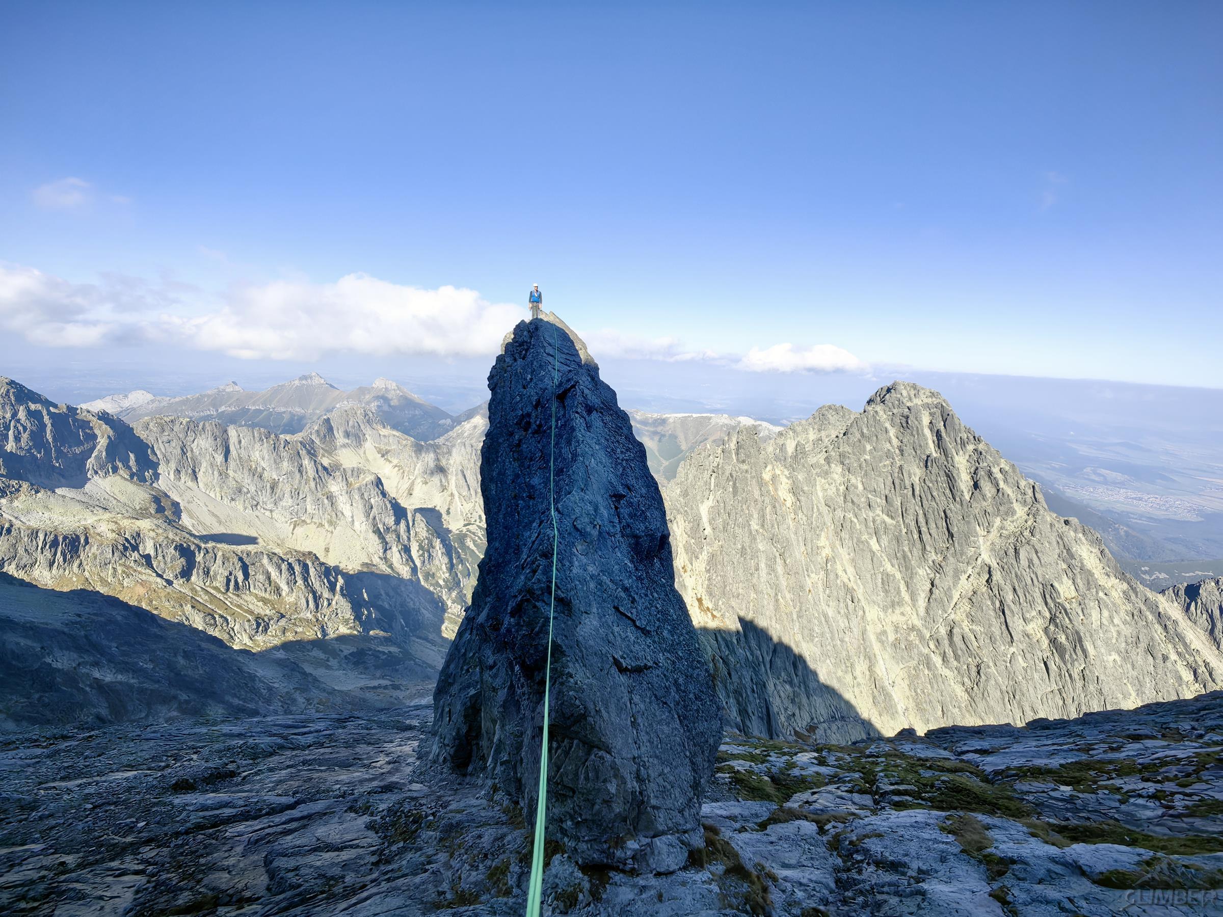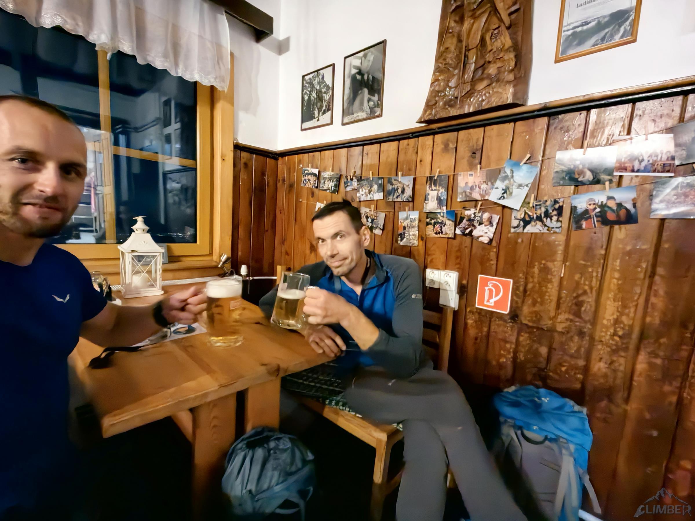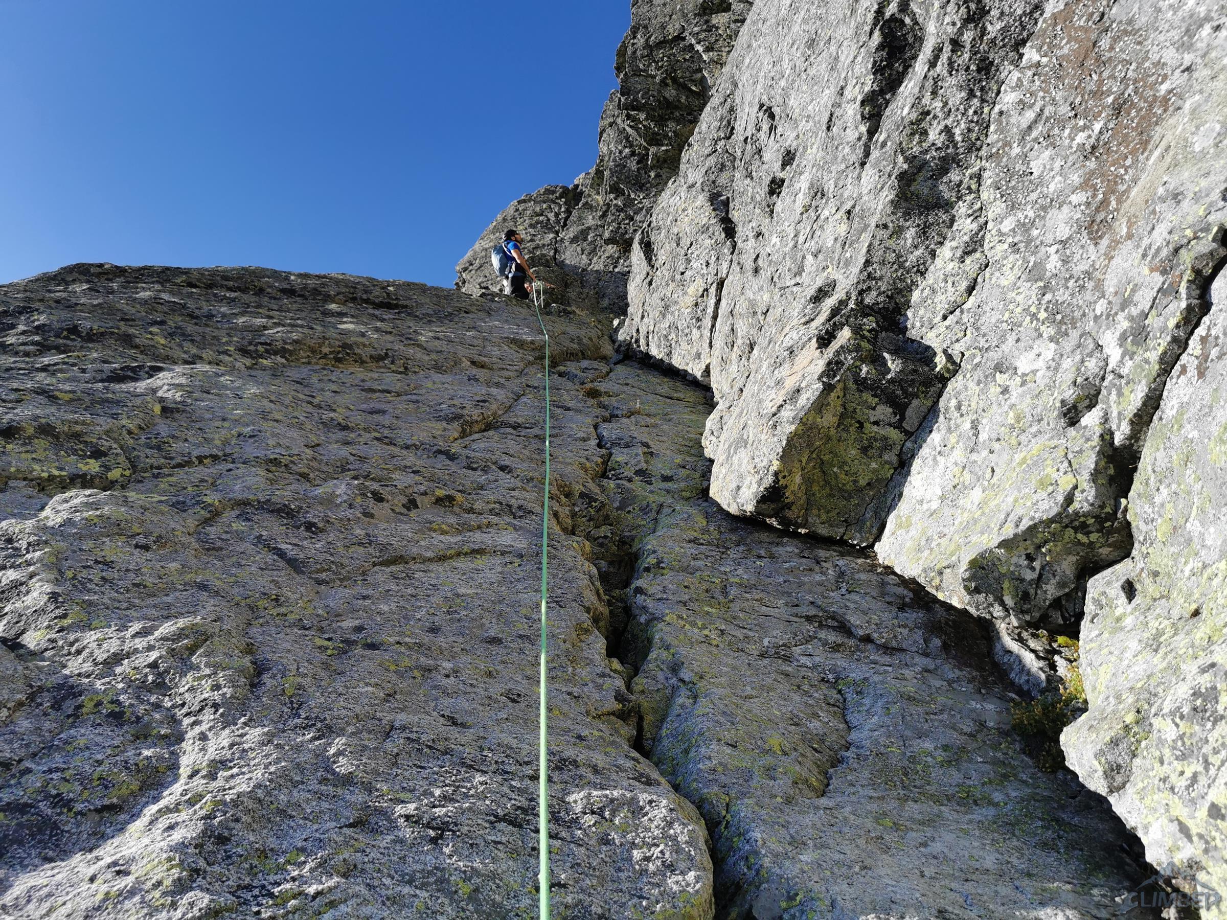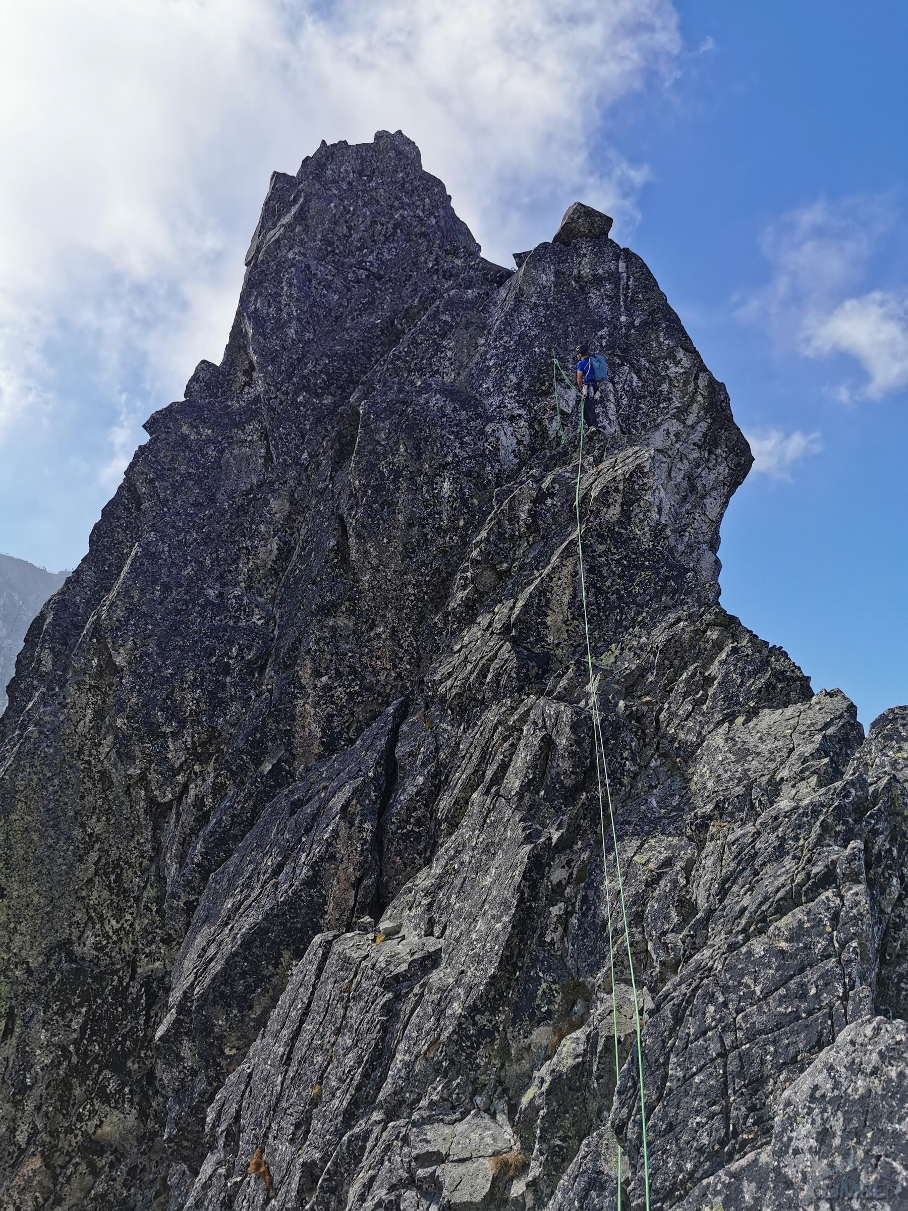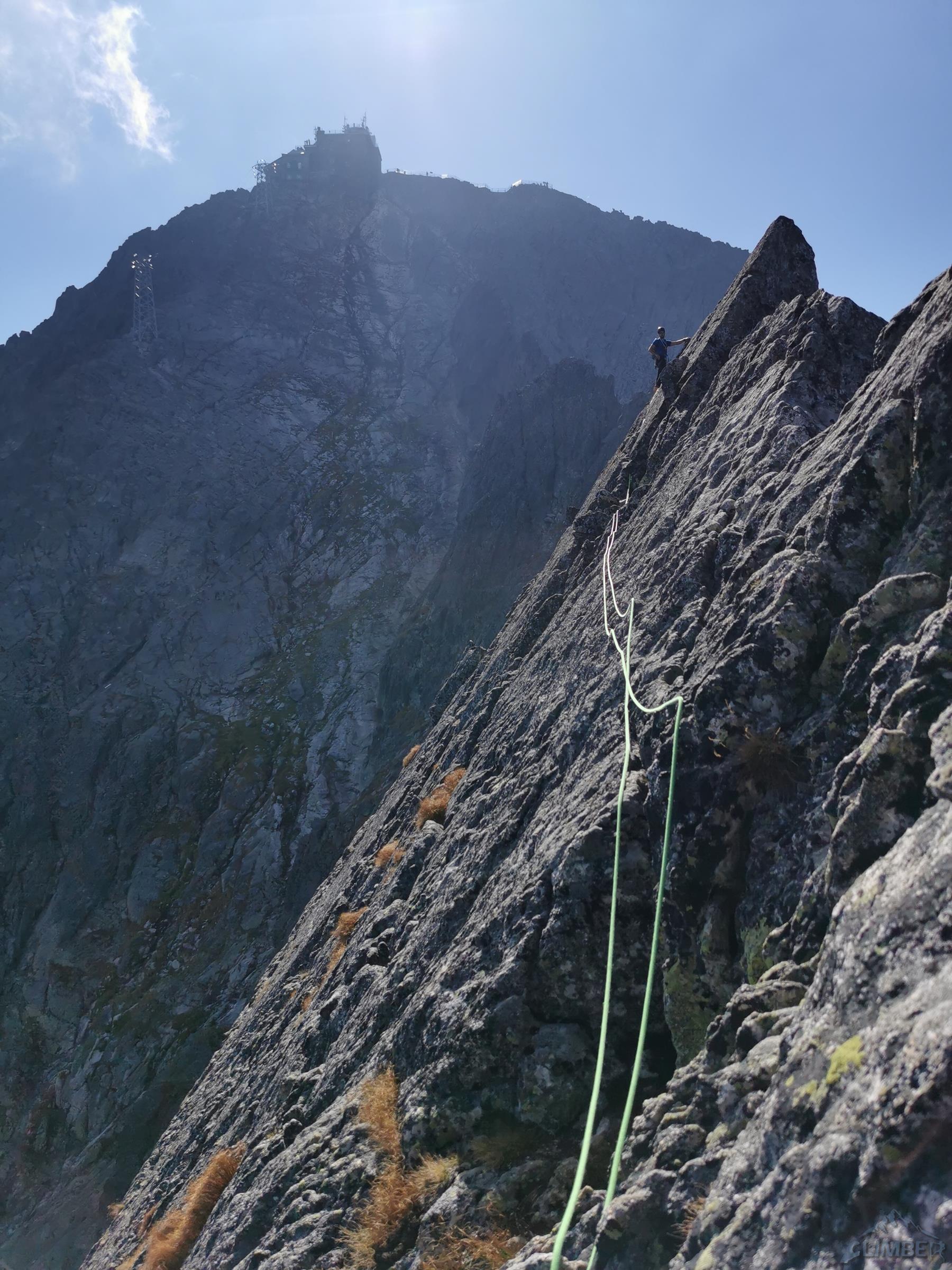 Ostatni fragment drogi (IV+) jest jako jedyny nieco mniej czytelny – gdy depresja zaczyna zanikać i prowadzić w stronę przewieszek do góry, trawersujemy w lewo do biegnącego wzdłuż kantu zacięcia z drogi Puskasa. Nim kontynuujemy wprost do góry i wychodzimy ze ściany – na półce czeka dość nietypowe stanowisko w postaci spita z baranimi rogami 😊. Na szczycie meldujemy się ponownie około godziny 18-tej i przechodzimy do najmniej przyjemnej części czyli zejścia – na pocieszenie fundujemy sobie jednak piwo w Skalnatej Chacie. Ku naszej radości po wyjściu ze schroniska wpadamy na Kubę i Tomka, którzy nie tylko umilają nam czas rozmową ale i podwożą do samochodu zostawionego przy wejściu do Doliny Kieżmarskiej, gdzie zaczęliśmy naszą przygodę.