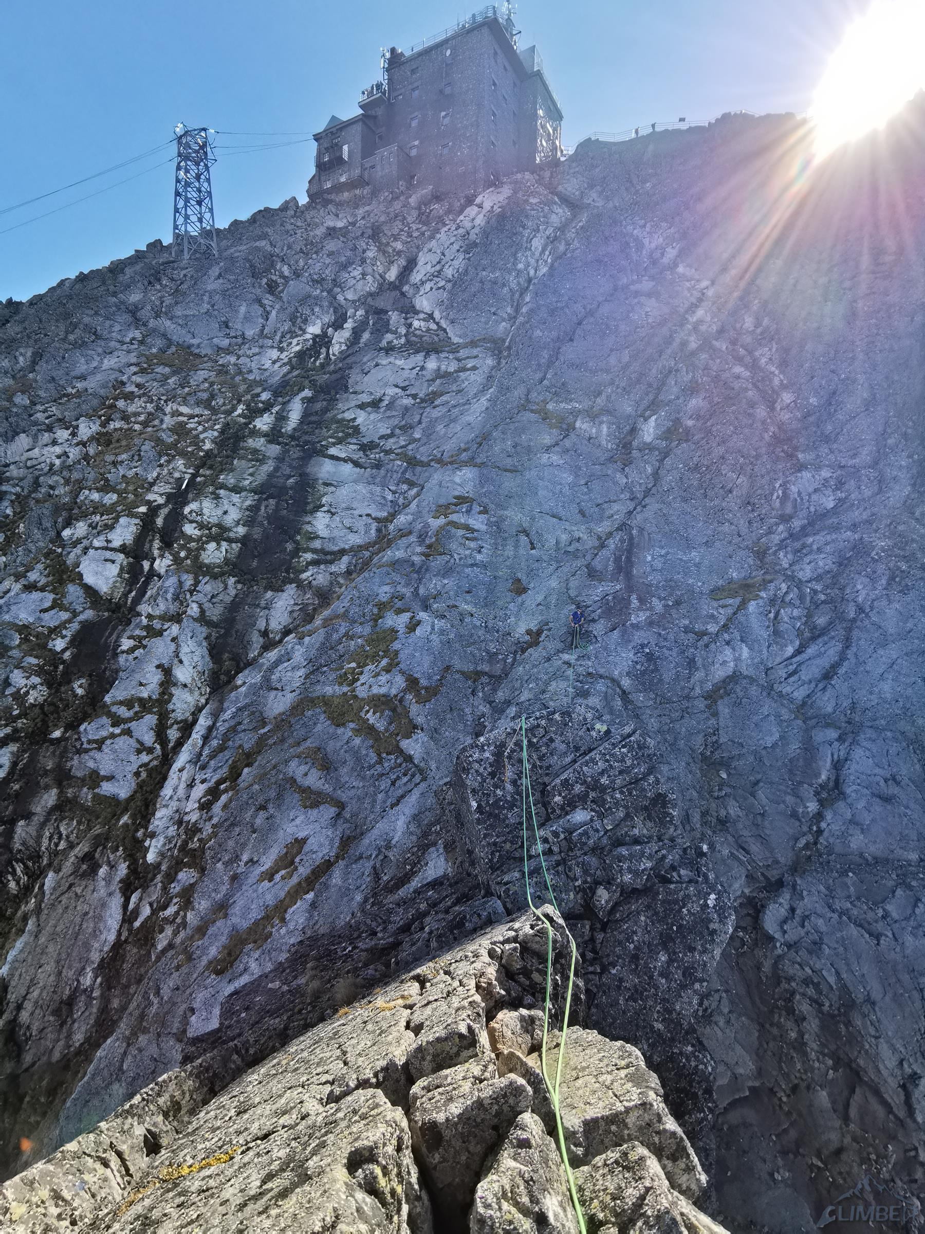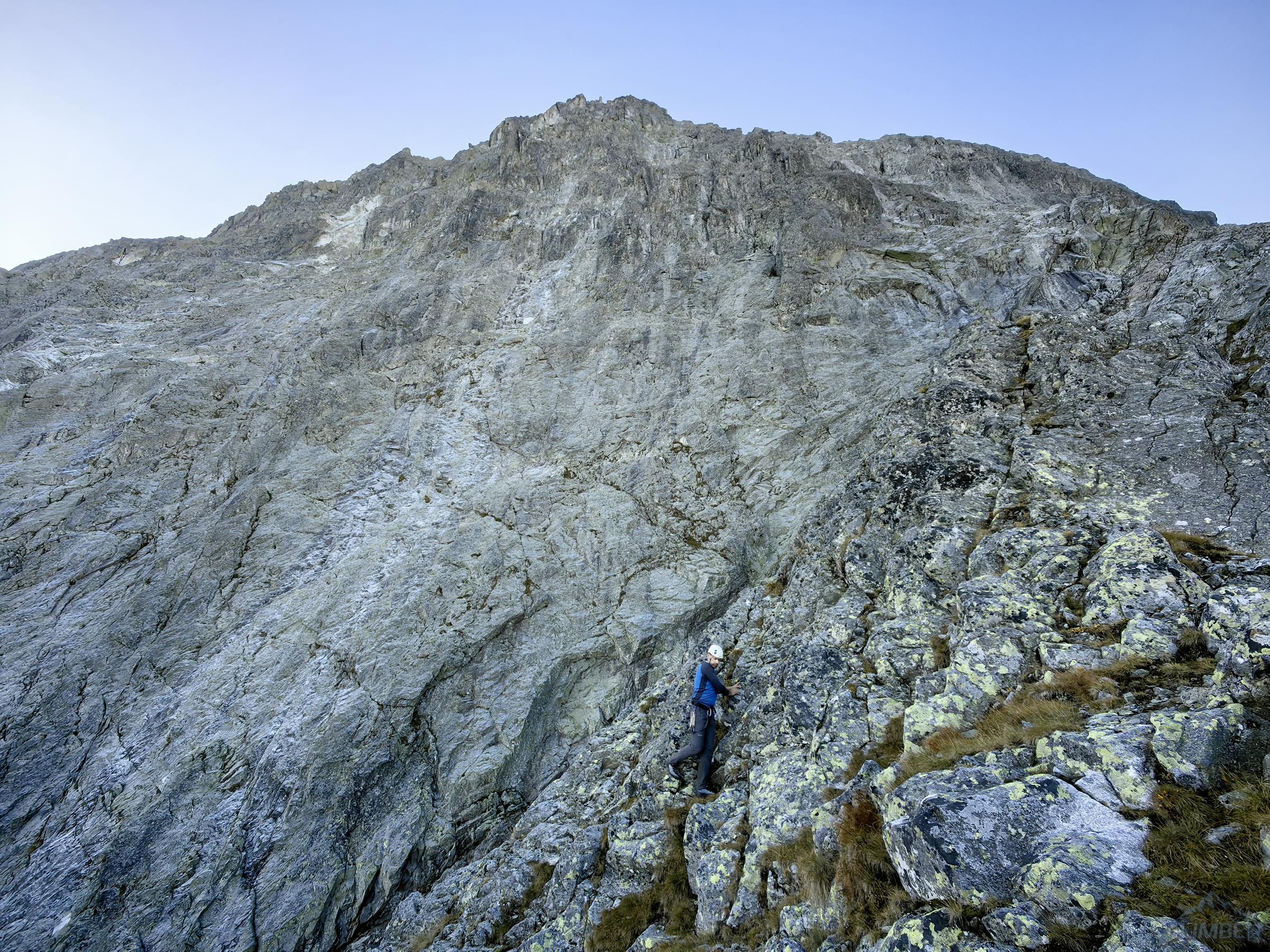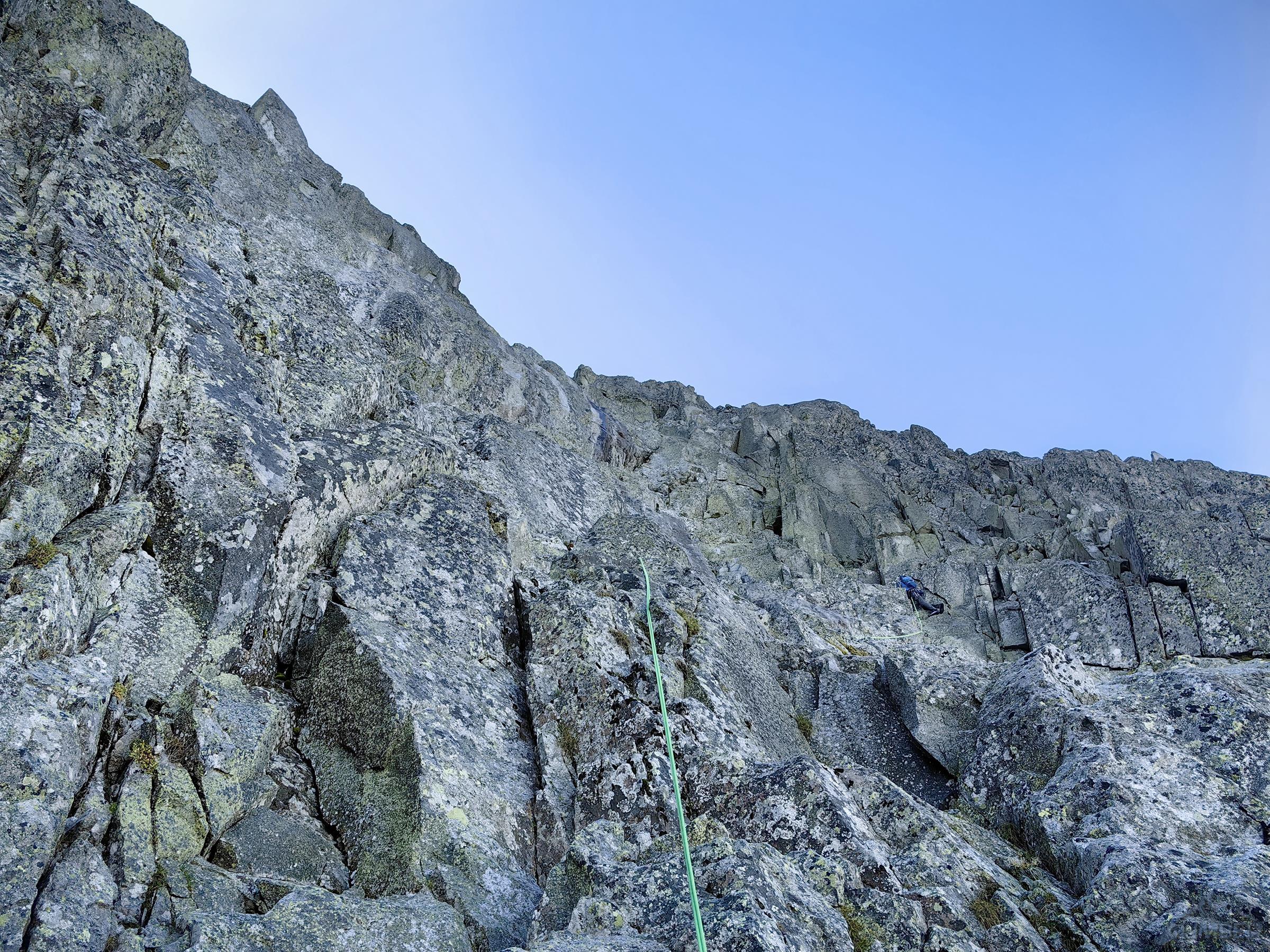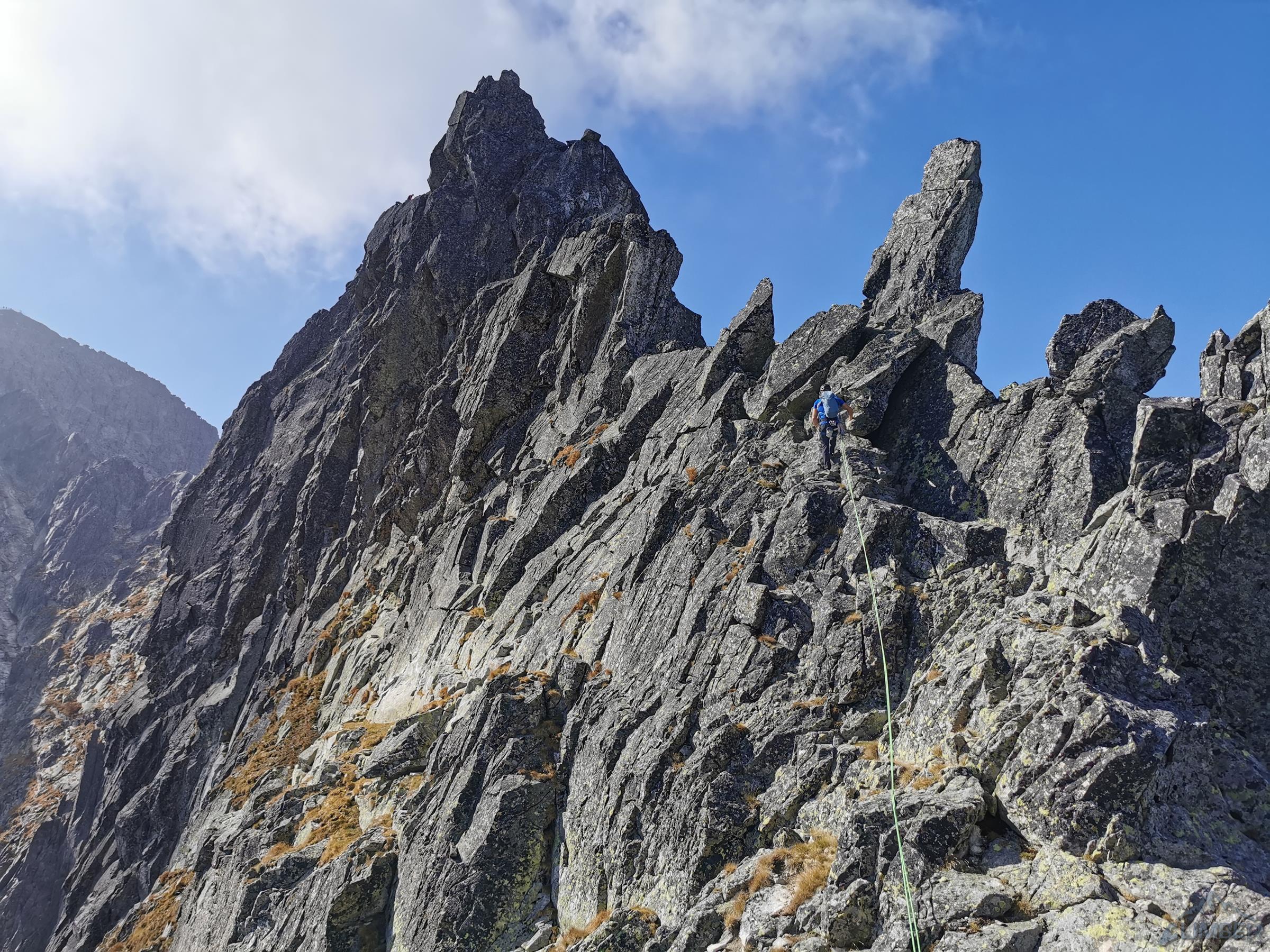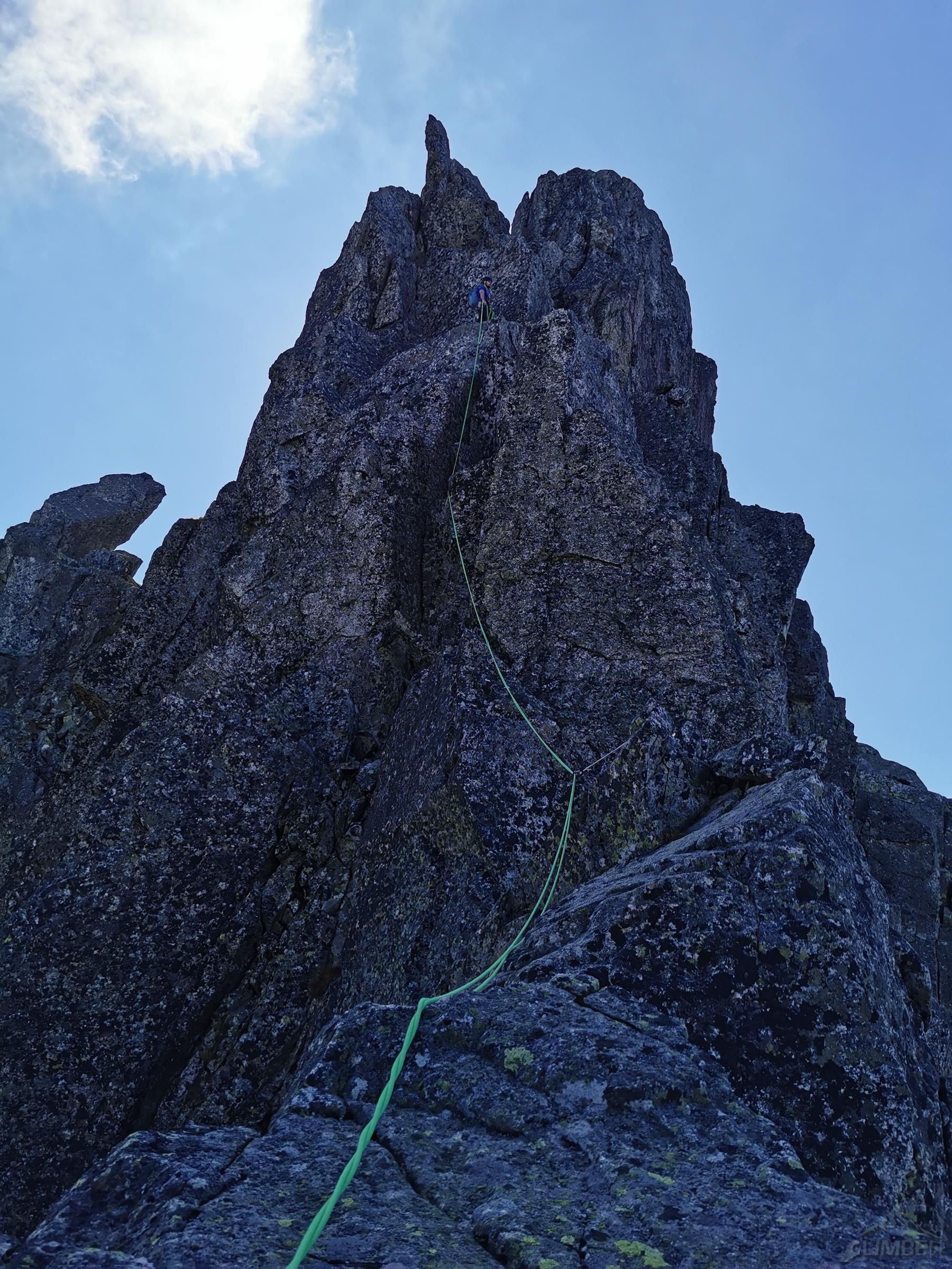 Ostatni fragment drogi (IV+) jest jako jedyny nieco mniej czytelny – gdy depresja zaczyna zanikać i prowadzić w stronę przewieszek do góry, trawersujemy w lewo do biegnącego wzdłuż kantu zacięcia z drogi Puskasa. Nim kontynuujemy wprost do góry i wychodzimy ze ściany – na półce czeka dość nietypowe stanowisko w postaci spita z baranimi rogami 😊. Na szczycie meldujemy się ponownie około godziny 18-tej i przechodzimy do najmniej przyjemnej części czyli zejścia – na pocieszenie fundujemy sobie jednak piwo w Skalnatej Chacie. Ku naszej radości po wyjściu ze schroniska wpadamy na Kubę i Tomka, którzy nie tylko umilają nam czas rozmową ale i podwożą do samochodu zostawionego przy wejściu do Doliny Kieżmarskiej, gdzie zaczęliśmy naszą przygodę.