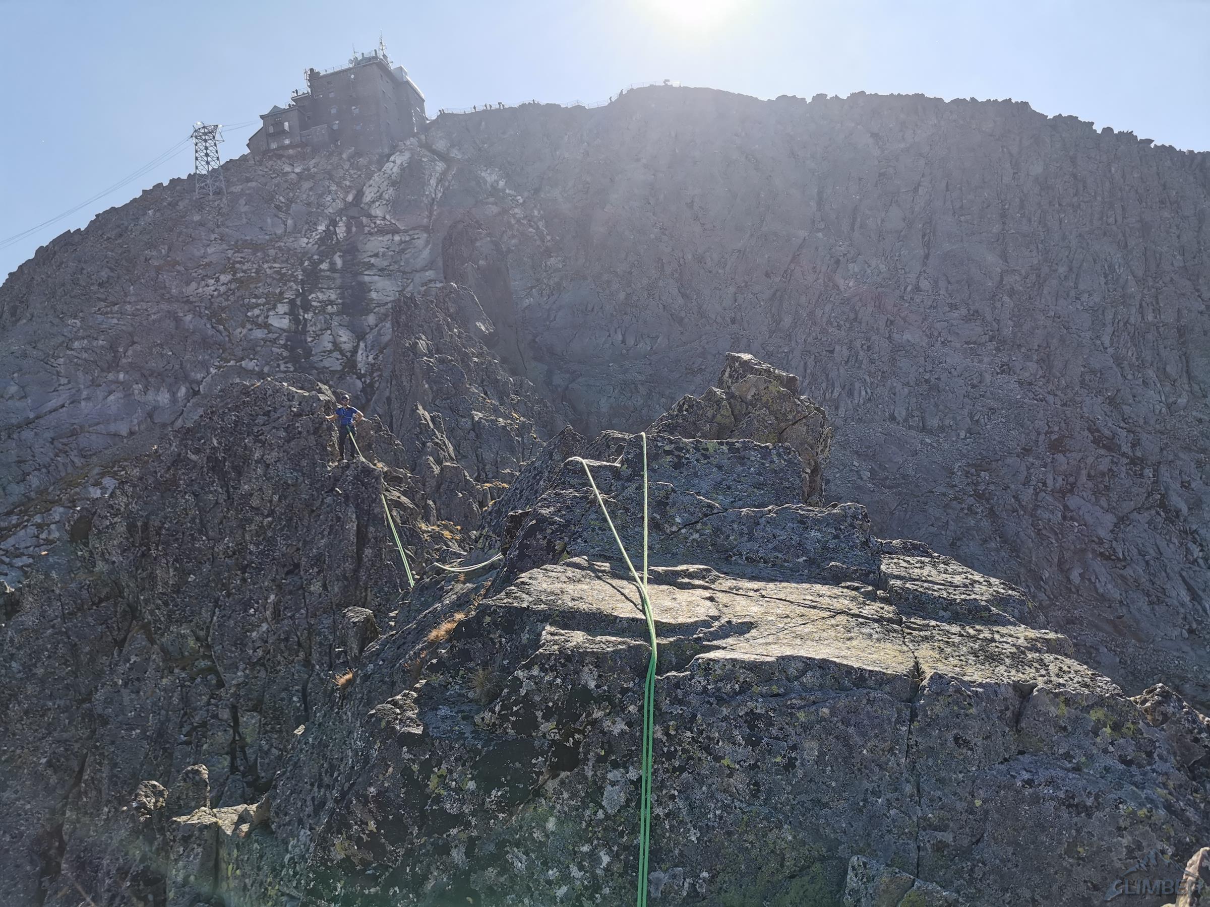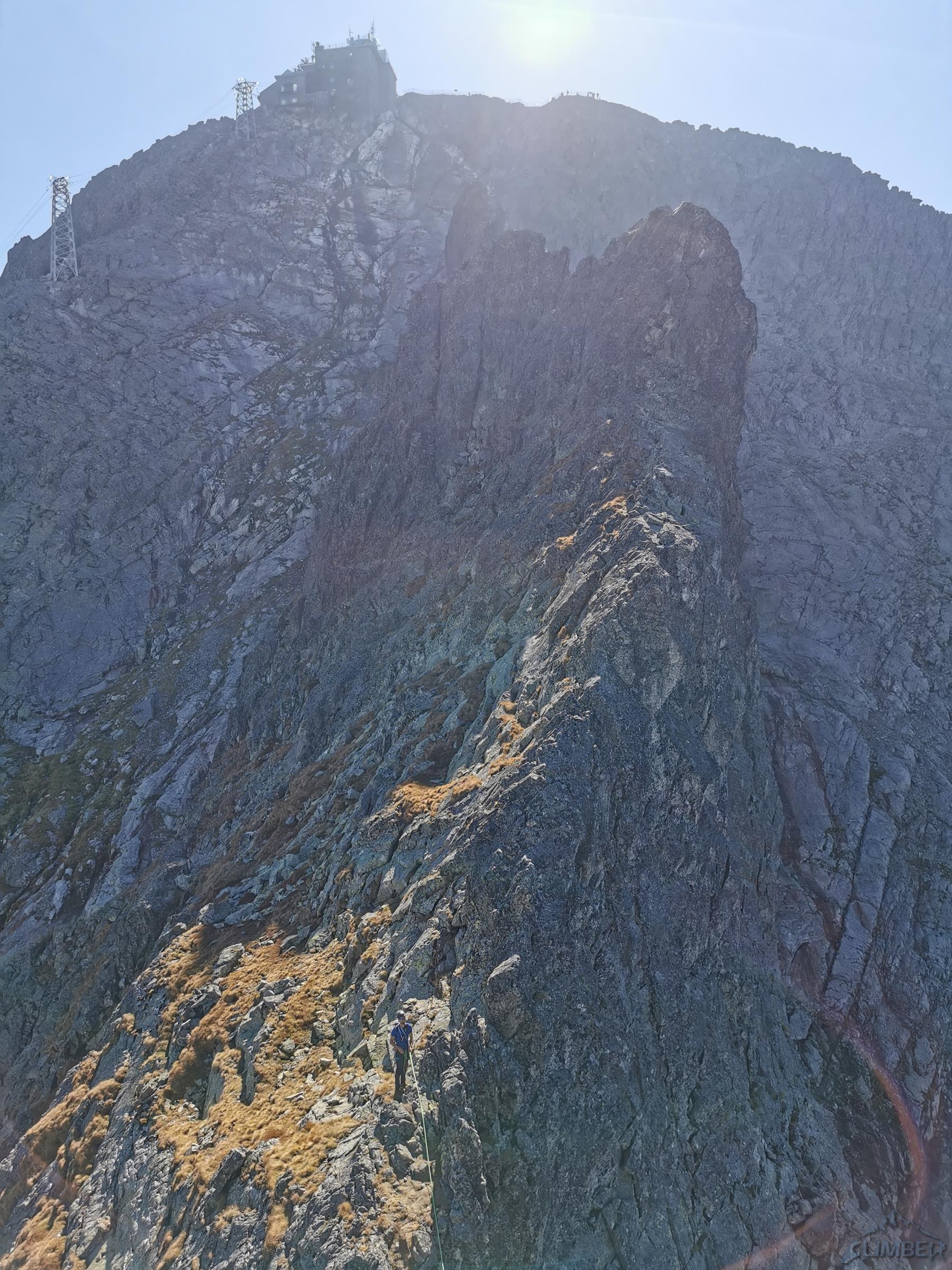 Mimo piątku z powodu ostatniego dnia pięknej pogody Grań Wideł, na którą wchodzimy po 12-tej, jest mocno zatłoczona w obie strony – w newralgicznych momentach jesteśmy jednak uprzejmie puszczani. Szybkie przejście ułatwia niewątpliwie znajomość drogi – idziemy dość szybko i zatrzymujemy się tylko przed najtrudniejszym uskokiem pod Wielkim Szczytem Wideł oraz przy okazji zjazdów. Przebieg opisywałem już przy okazji pierwszego przejścia (RELACJA), tym razem ograniczę się więc tylko do kilku zdjęć z podpisami. Z Grani schodzimy po około dwóch godzinach i wiedząc, że mamy całkiem spory zapas czasu do zachodu Słońca pozwalamy sobie na ekstrawagancję w postaci podwójnego espresso w restauracji na szczycie Łomnicy 😊. Po długiej przerwie ciężko ruszyć do dalszej akcji, przy tak pięknej pogodzie łatwiej jednak o motywację – ruszamy więc w dół Drogą Jordana na przełączkę nad Żlebem Teryho i nim w dół pod Stanisławskiego na Szklanej Górze, jak określona została kiedyś zachodnia ścian drugiego najwyższego tatrzańskiego szczytu.