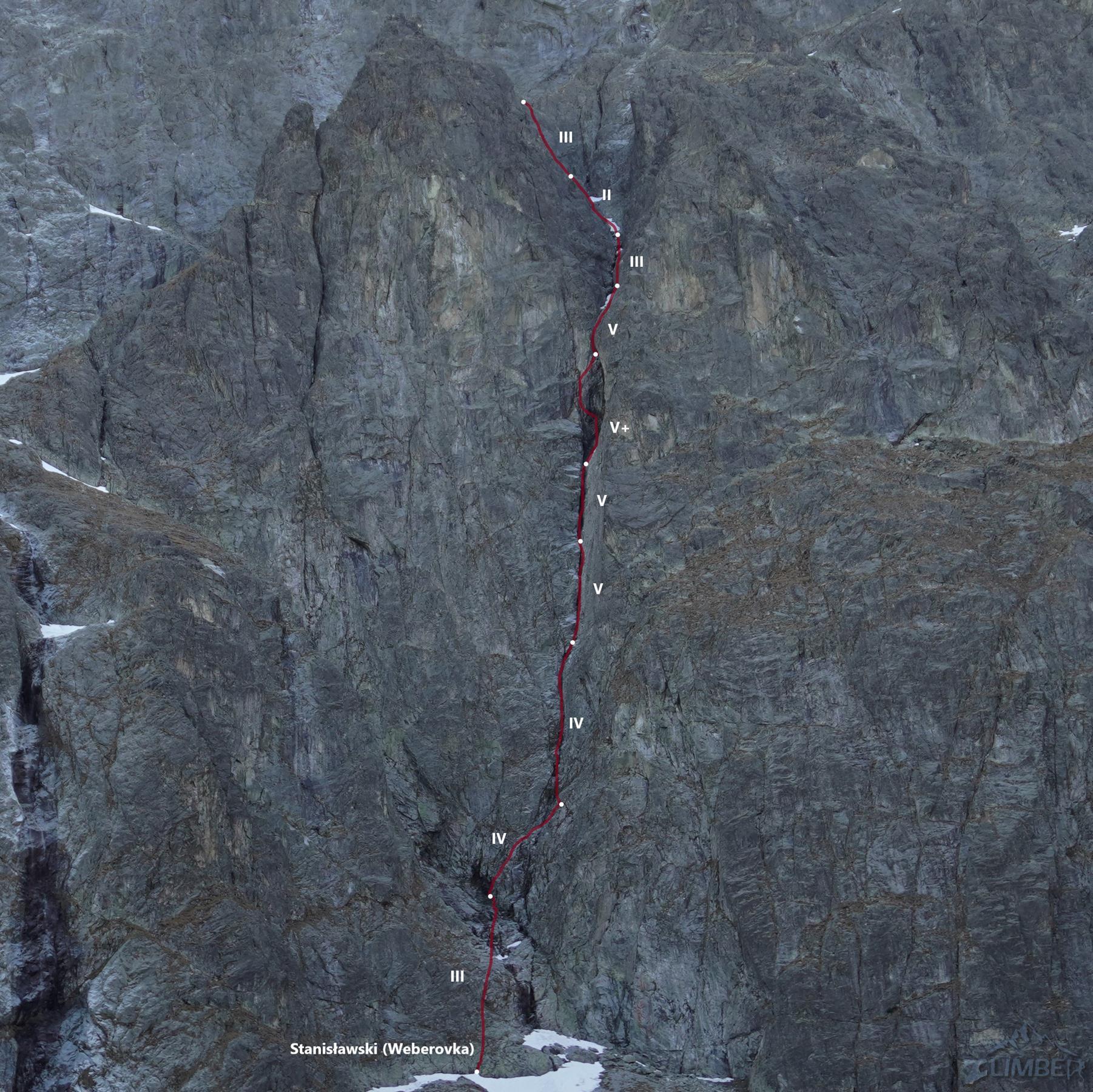 W znany nam już z lata i zimy Komin Stanisławskiego startujemy o świcie (ok. 6:30) – do Niemieckiej Drabiny do przejścia jest ok. 500 metrów podzielone na 10 długich wyciągów. Droga jakiś czas temu została wyposażona w gotowe stanowiska (łańcuchy), co znacznie przyspiesza wspinanie i poprawia bezpieczeństwo – w sezonie letnim haki nie są konieczne. Tatrzański klasyk jest zdecydowanie ciekawszy zimą – latem jak to w kominach jest sporo wilgoci i kruszyzny – mimo to biorąc pod uwagę historię drogi i jej lokalizację po prostu wypada ją zrobić! Po pierwszym letnim przejściu nie opisywałem drogi, zrobię to więc pokrótce tutaj, dołączam też orientacyjne foto-topo. Opis zimowy wraz z topo zawierającym wyceny mikstowe znajdziecie w relacji z przejścia zimowego – TUTAJ.