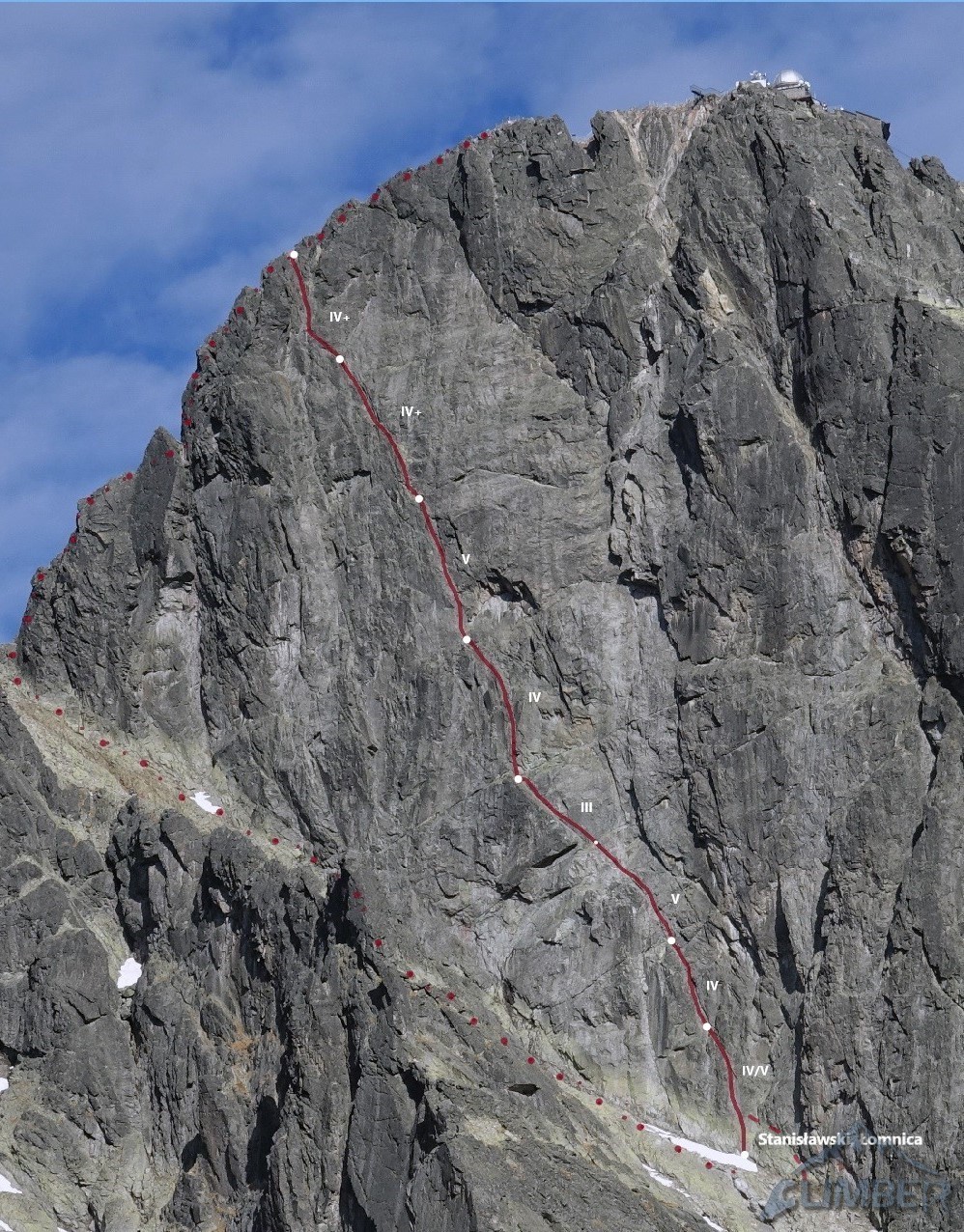 Droga okazuje się nie tylko niezwykle ewidentna (prowadzi wzdłuż wielkiej rampy przecinającej prawie całą ścianę) ale i zaskakująco ładna - zdecydowanie można ją polecić jako cel sam w sobie, szczególnie osobom poszukującym najlepszych tatrzańskich „piątek”. By urozmaicić sobie wspinanie warto zrobić małe prostowanie na starcie i do rampy dostać się płytami na prawo zaraz obok zacięcia opadającego spod Hokejki. Po przejściu tego ciekawego fragmentu (V) dochodzimy do depresji i kontynuujemy nią skośnie w lewo (IV). Po około 30 metrach trafimy na łańcuch, dobrze prowadząc linę spokojnie można jednak iść dalej – kontynuujemy zacięciem w lewo i wychodzimy na filarek (IV), nad którym czeka wygodna platforma ze stanowiskiem wspólnym z Hokejką.