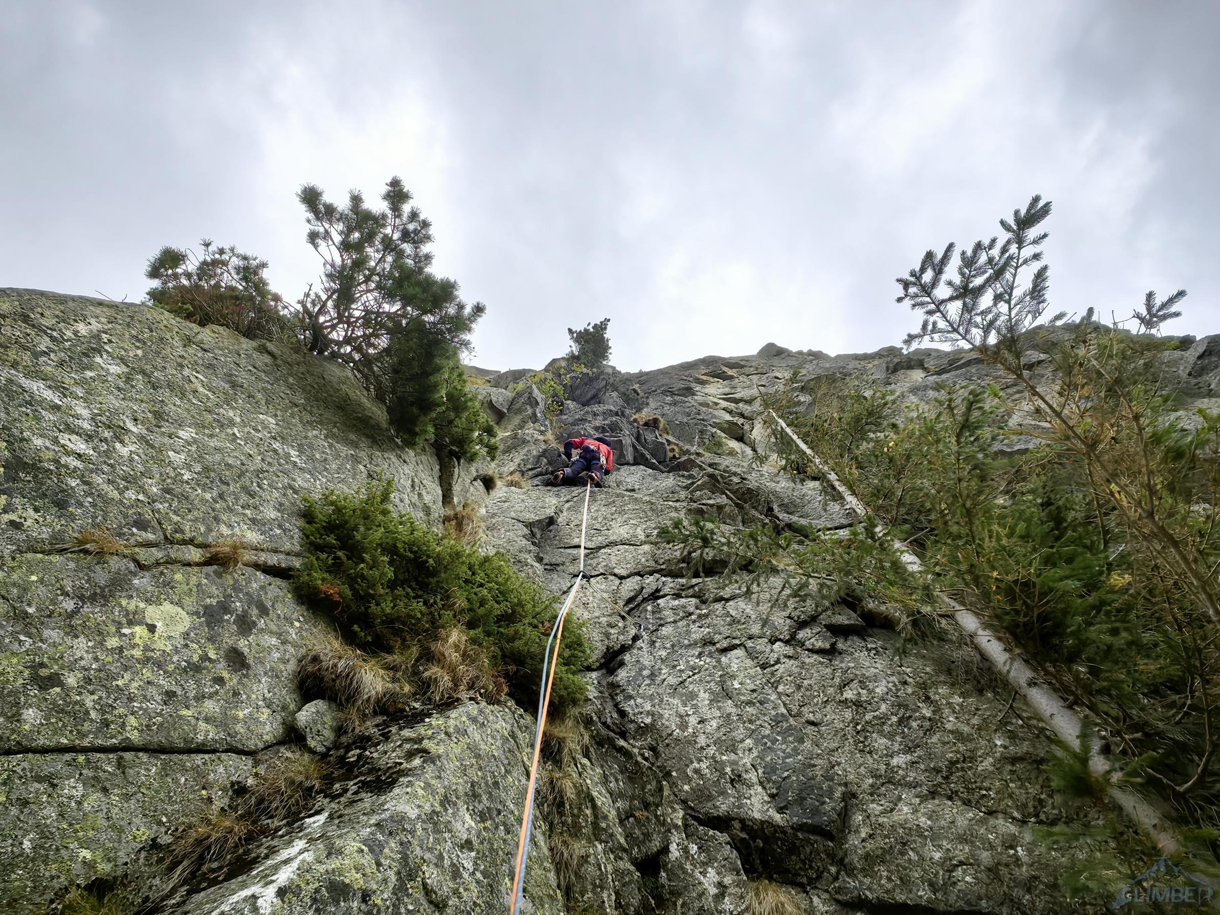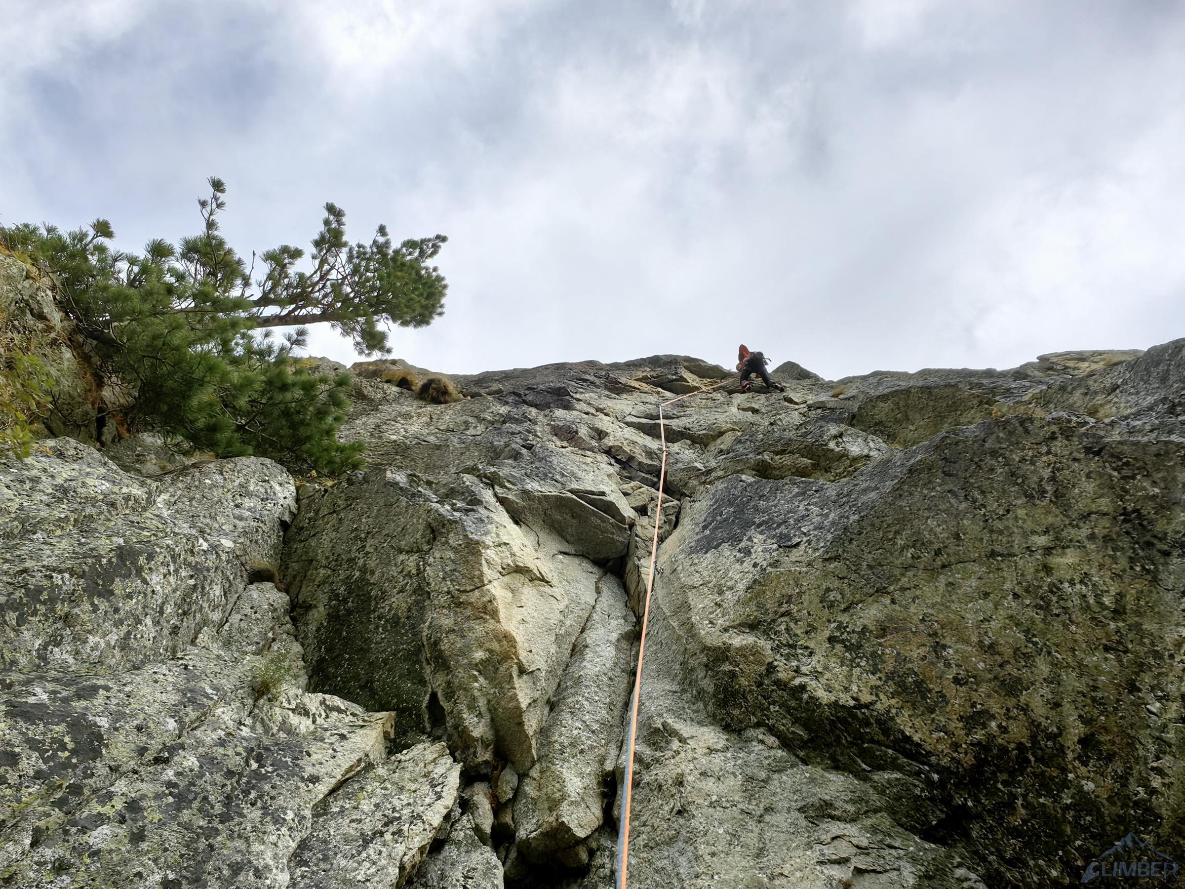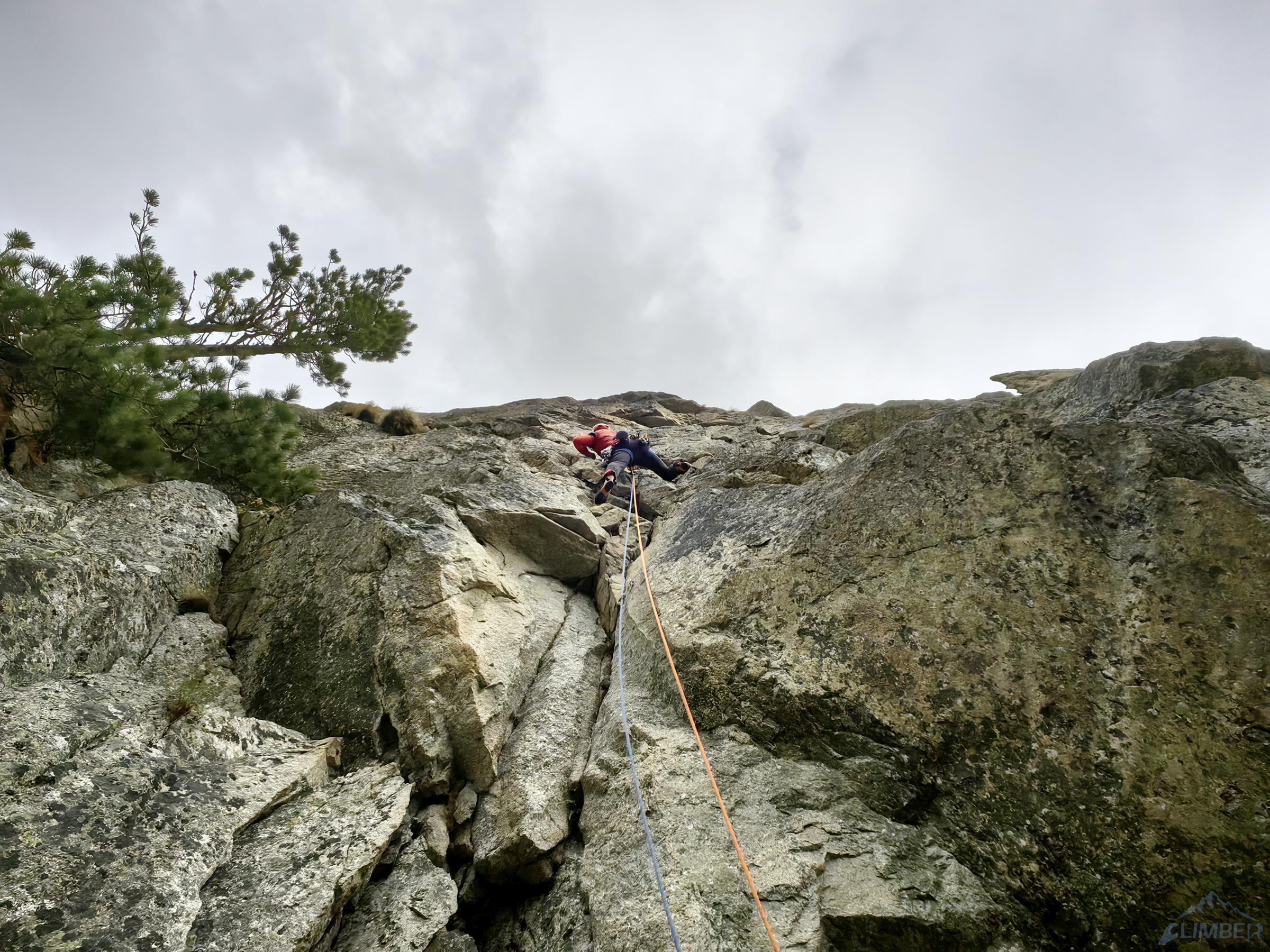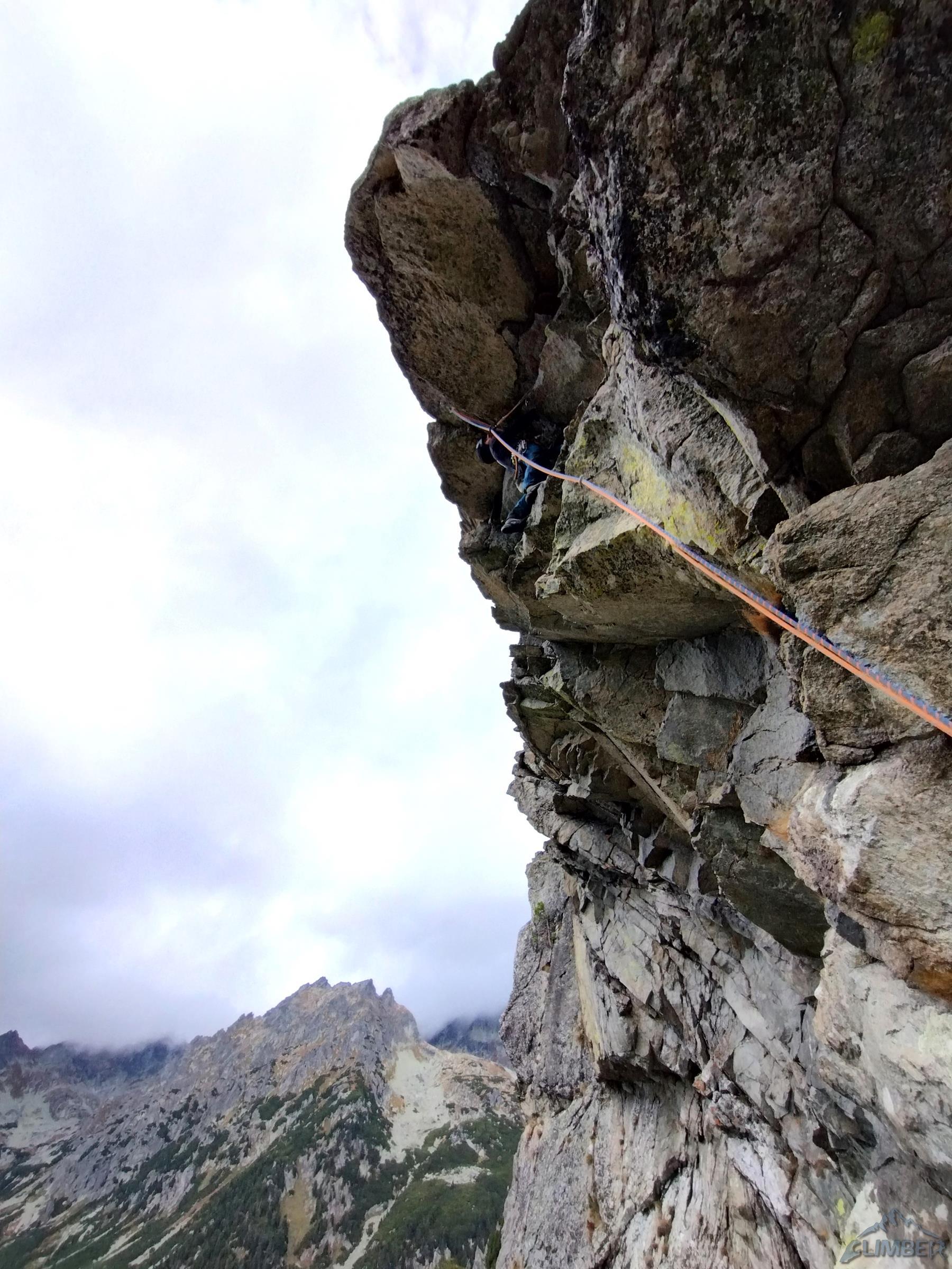 Gdy odpoczywamy pod ścianą Słońce w końcu przebija się przez chmury, wieje jednak jeszcze mocniej – proponuję więc koledze spróbowanie interesującego buldera na starcie Eliny (VIII), do którego już się kiedyś przymierzałem. Stwierdzam, że jak się z nim uporamy to dalej pójdzie już szybko – droga ma bowiem tylko trzy krótkie wyciągi (25m, 20m, 25m). Oddajemy po dwie próby i gdy już mamy rezygnować, trzecia w wykonaniu Dominika okazuje się skuteczna. Po przejściu mocnego wg nas cruxa (i zasięgowego) wbrew oczekiwaniom nie robi się całkiem łatwo – do stanowiska czeka jeszcze całkiem sprężny fragment (ok. VII), który przejść trzeba będąc już mocno „wybranym”. Warto skorzystać ze stanowiska po prawej stronie – to po lewej jest z dochodzącej od dołu rysą Cesty Horskej Służby, zatrzymując się na nim wspinanie na drugim wyciągu będzie nieco utrudnione.