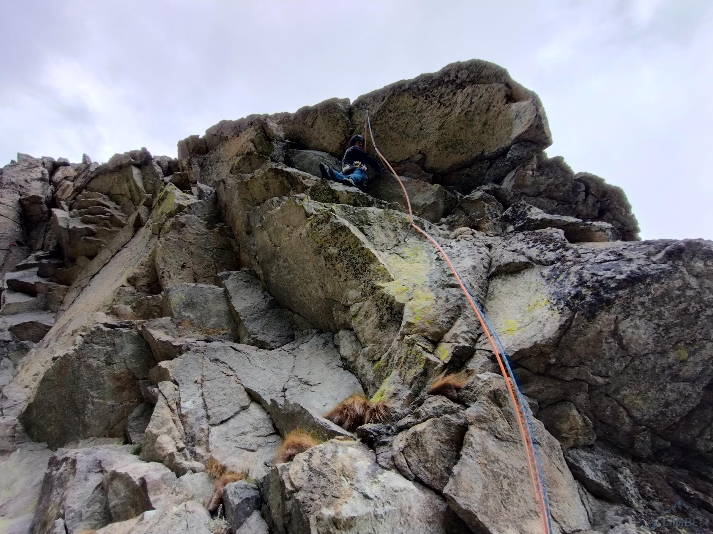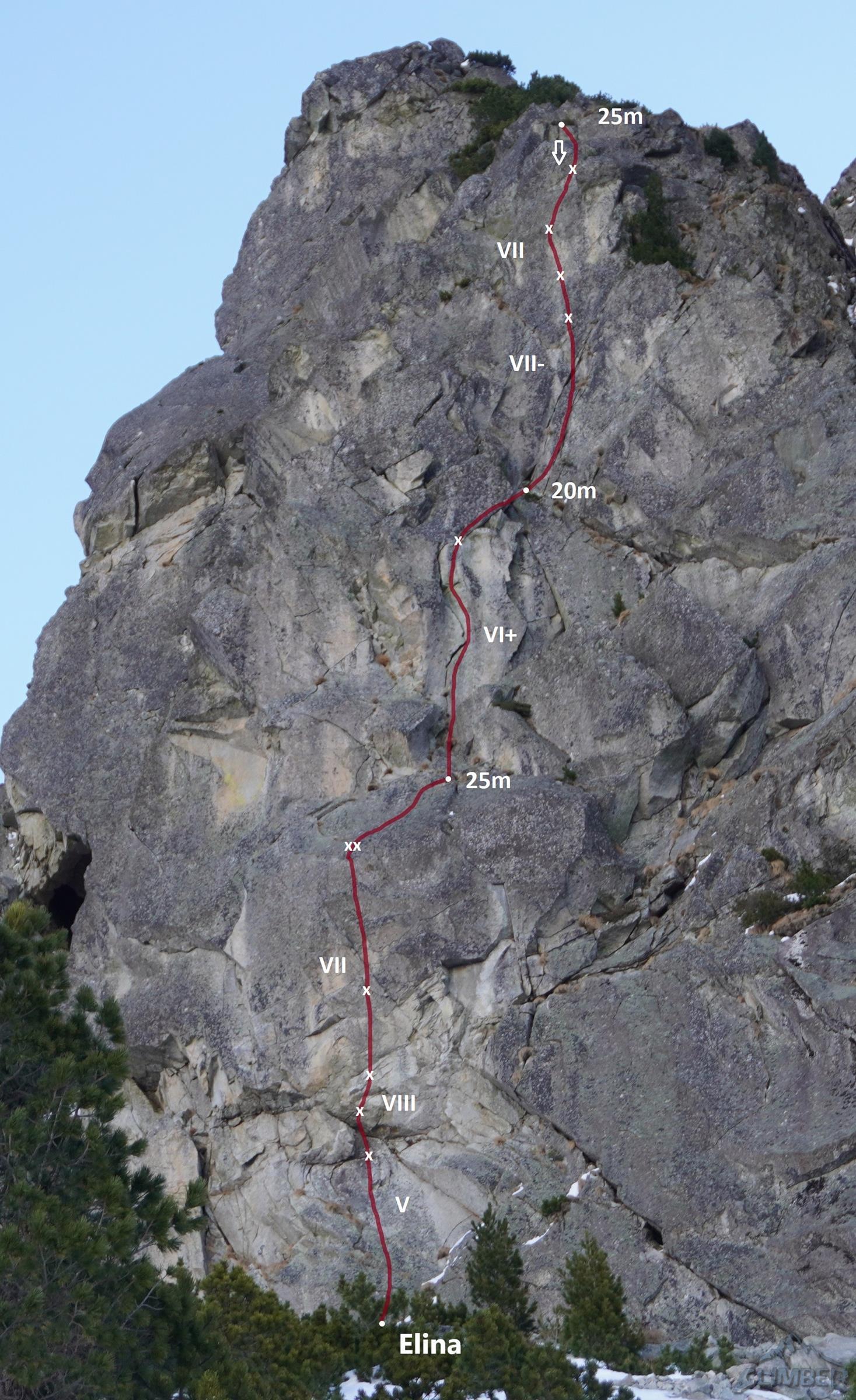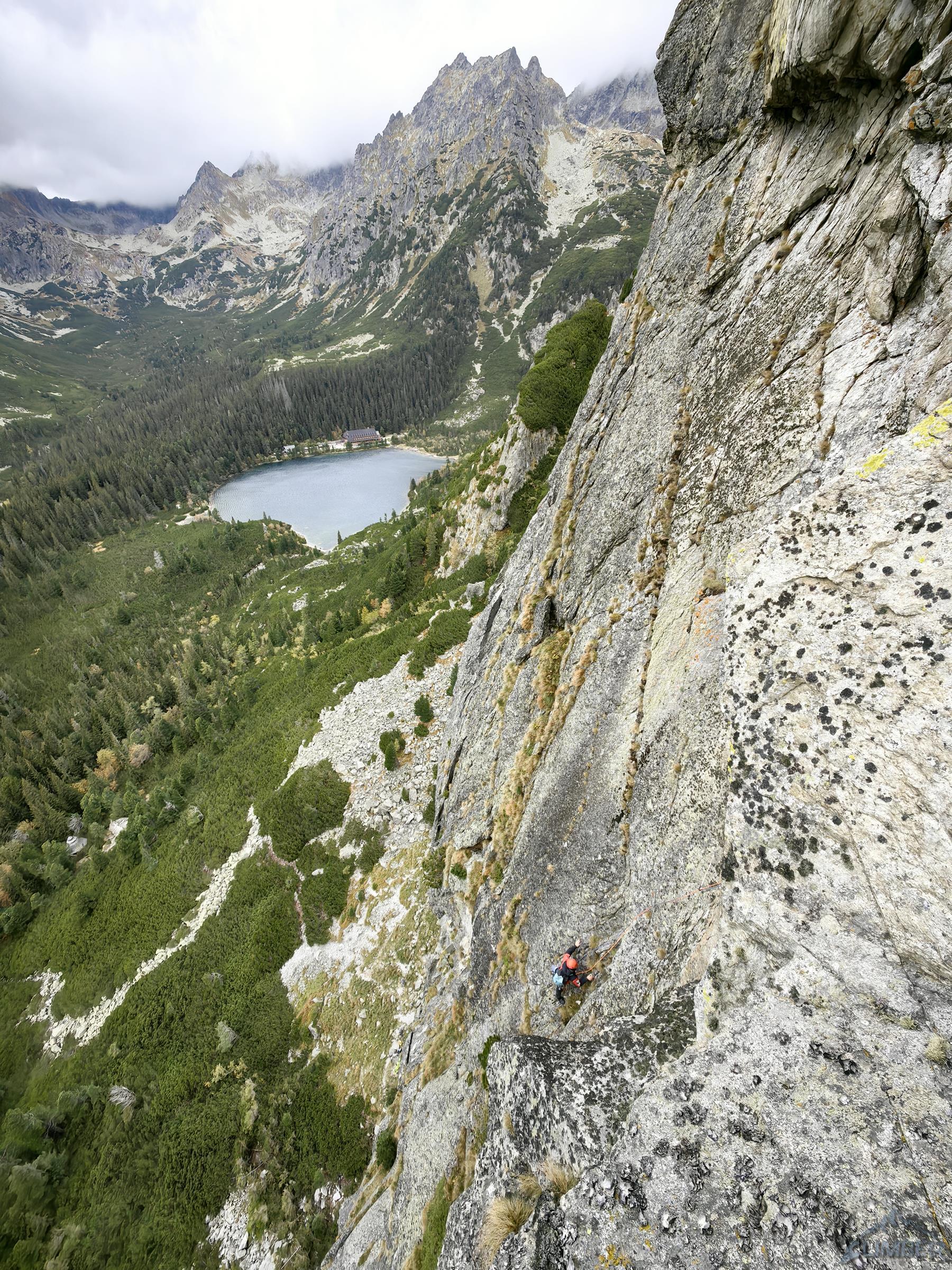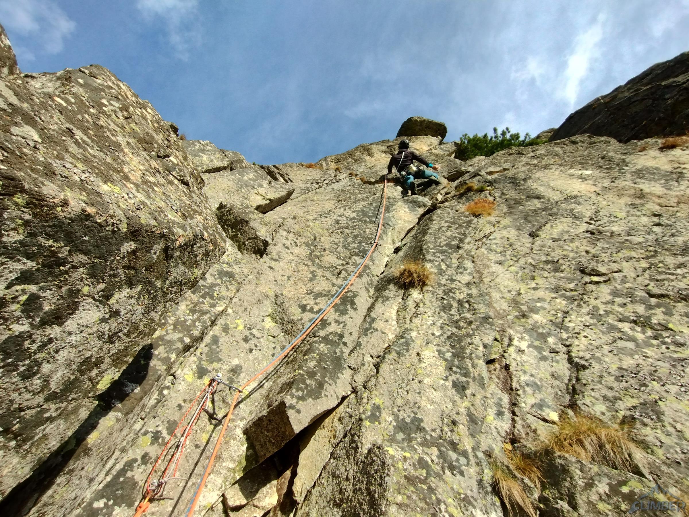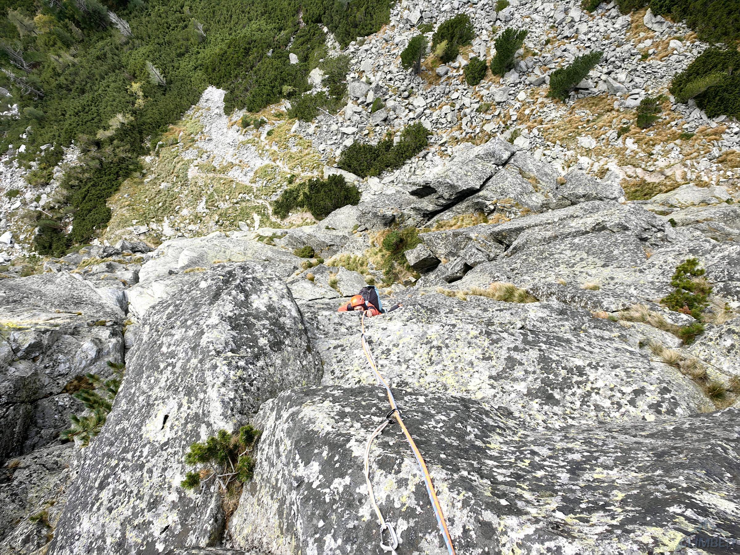 Gdy odpoczywamy pod ścianą Słońce w końcu przebija się przez chmury, wieje jednak jeszcze mocniej – proponuję więc koledze spróbowanie interesującego buldera na starcie Eliny (VIII), do którego już się kiedyś przymierzałem. Stwierdzam, że jak się z nim uporamy to dalej pójdzie już szybko – droga ma bowiem tylko trzy krótkie wyciągi (25m, 20m, 25m). Oddajemy po dwie próby i gdy już mamy rezygnować, trzecia w wykonaniu Dominika okazuje się skuteczna. Po przejściu mocnego wg nas cruxa (i zasięgowego) wbrew oczekiwaniom nie robi się całkiem łatwo – do stanowiska czeka jeszcze całkiem sprężny fragment (ok. VII), który przejść trzeba będąc już mocno „wybranym”. Warto skorzystać ze stanowiska po prawej stronie – to po lewej jest z dochodzącej od dołu rysą Cesty Horskej Służby, zatrzymując się na nim wspinanie na drugim wyciągu będzie nieco utrudnione.