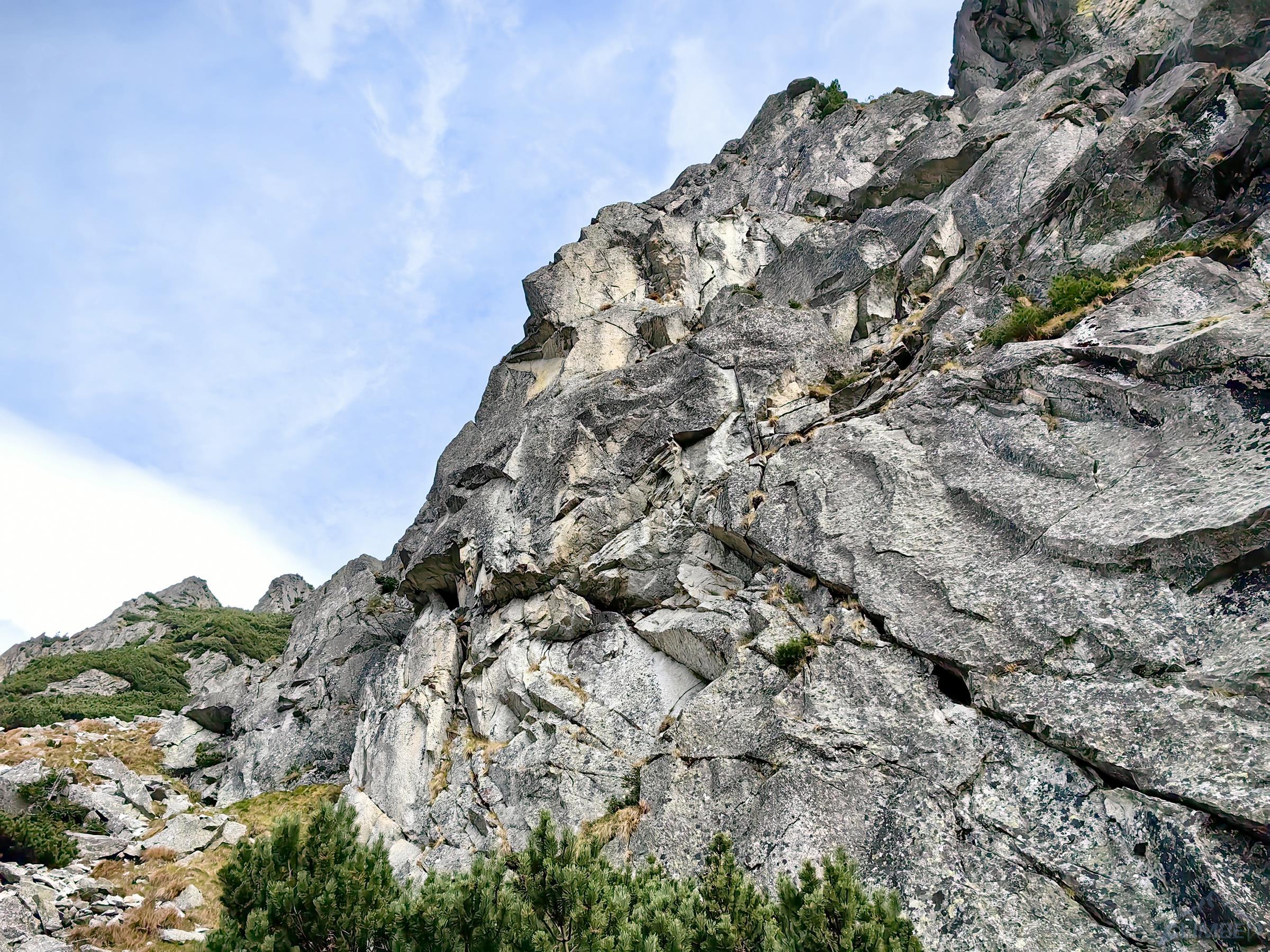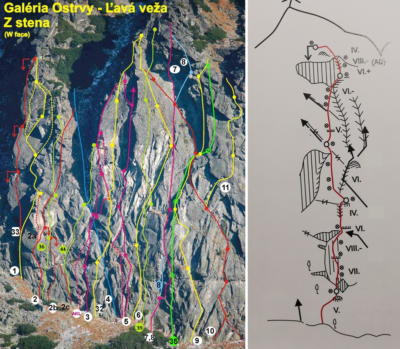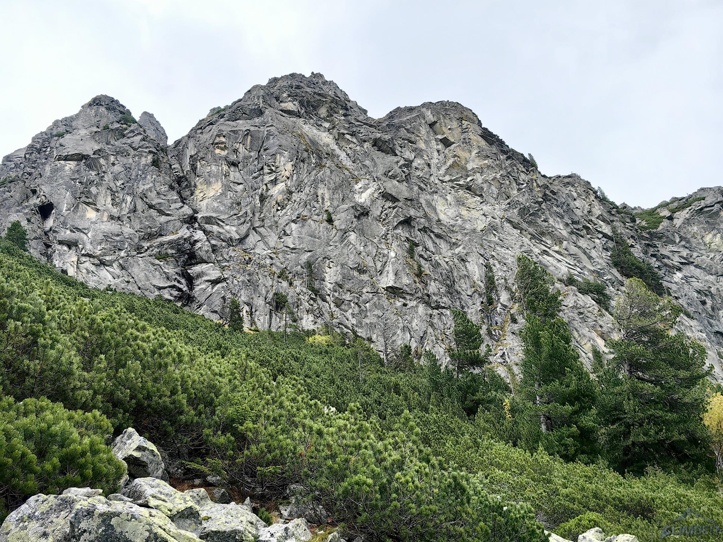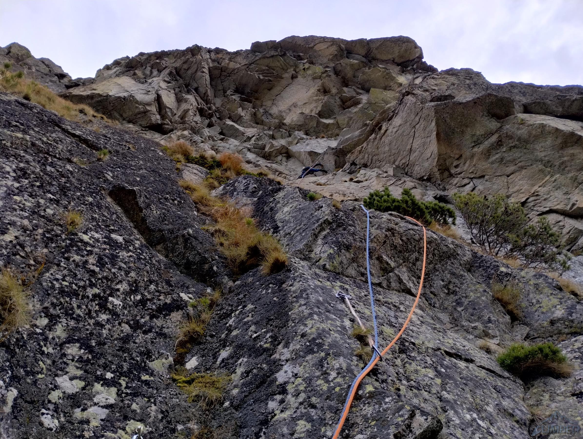 Gdy odpoczywamy pod ścianą Słońce w końcu przebija się przez chmury, wieje jednak jeszcze mocniej – proponuję więc koledze spróbowanie interesującego buldera na starcie Eliny (VIII), do którego już się kiedyś przymierzałem. Stwierdzam, że jak się z nim uporamy to dalej pójdzie już szybko – droga ma bowiem tylko trzy krótkie wyciągi (25m, 20m, 25m). Oddajemy po dwie próby i gdy już mamy rezygnować, trzecia w wykonaniu Dominika okazuje się skuteczna. Po przejściu mocnego wg nas cruxa (i zasięgowego) wbrew oczekiwaniom nie robi się całkiem łatwo – do stanowiska czeka jeszcze całkiem sprężny fragment (ok. VII), który przejść trzeba będąc już mocno „wybranym”. Warto skorzystać ze stanowiska po prawej stronie – to po lewej jest z dochodzącej od dołu rysą Cesty Horskej Służby, zatrzymując się na nim wspinanie na drugim wyciągu będzie nieco utrudnione.