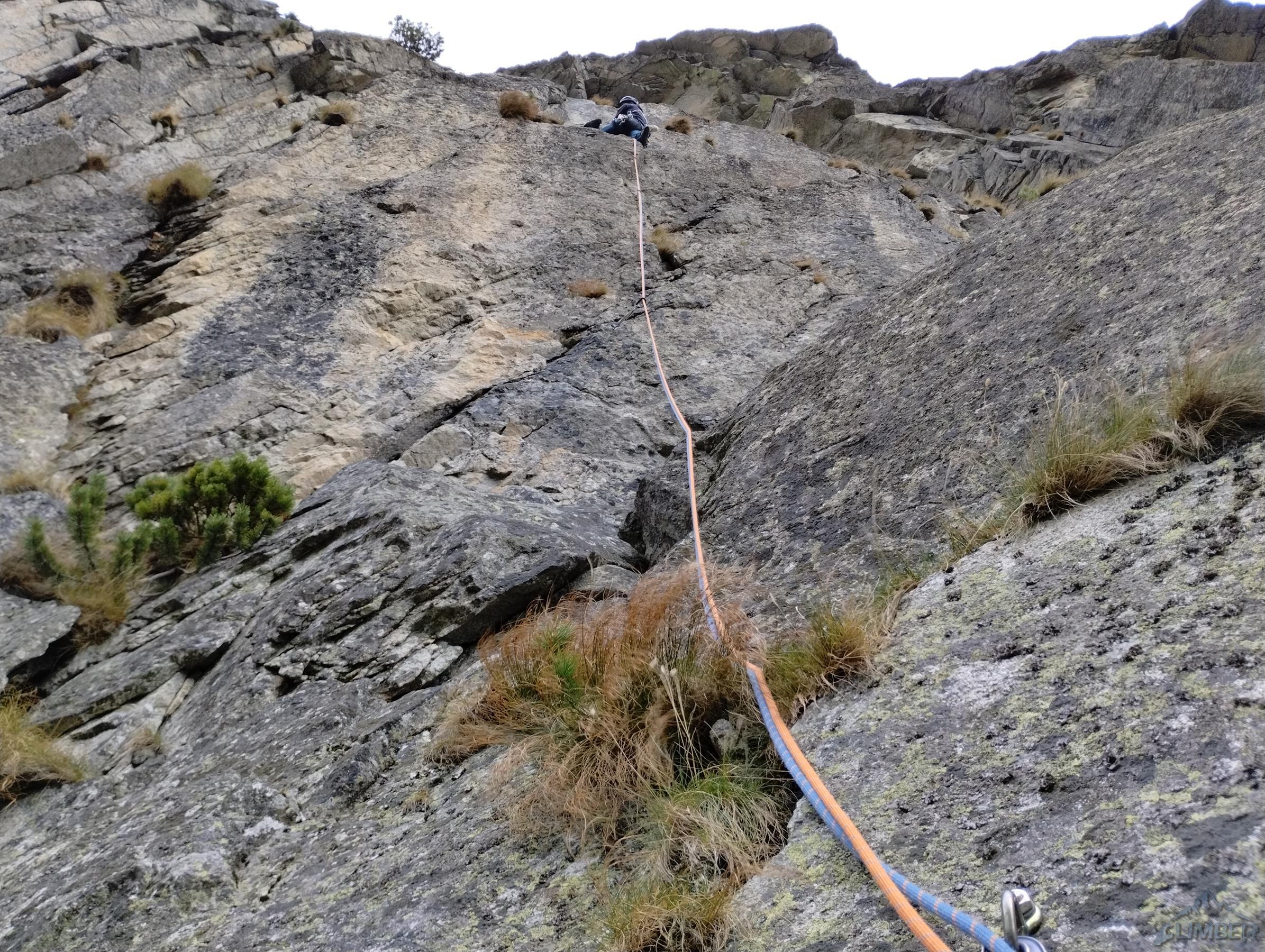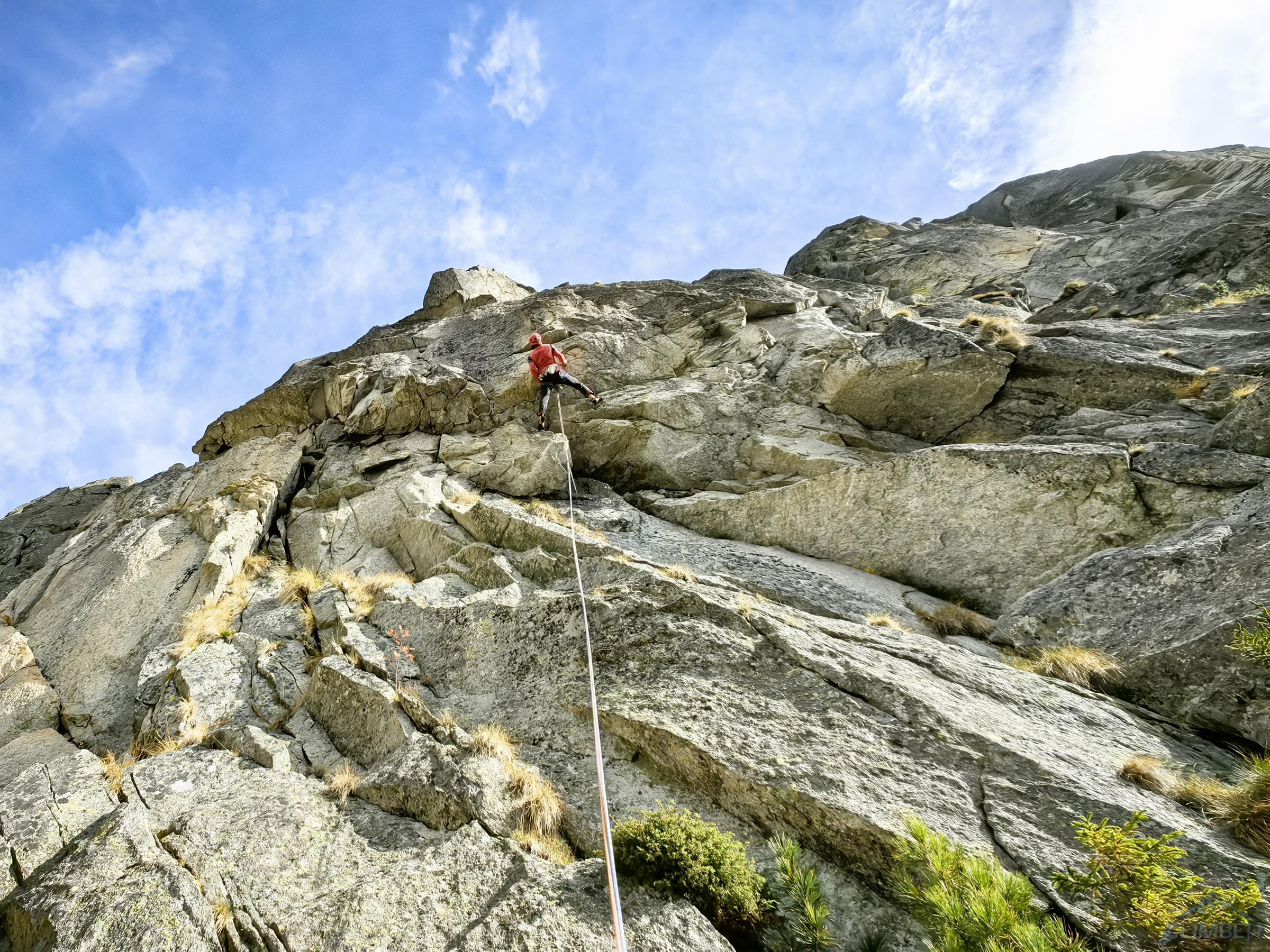 Pierwszy wyciąg (V) to właściwie „teren dojściowy” – czeka nas około 15 metrów wspinania przez zarośniętą ściankę (warto coś założyć bo jest tylko jeden spit) i trawers w prawo do stanowiska na półce. Na drugim odcinku (40m) trzeba się już intensywnie wspinać – zaczynamy od przewieszonego zacięcia (VII), kontynuujemy spękaną płytą (VIII-) i po dojściu pod okap trawersujemy w prawo, do łatwiejszej już rysy (VI) ze starej drogi. Jest zimno i wilgotno (przez chwilę nawet kropi), do tego wiatr próbuje zrzucić nas ze ściany - cieszę się więc niezmiernie gdy Dominik przechodzi wyciąg w pierwszej próbie, za co w nagrodę resztę idzie już na drugiego 😊.