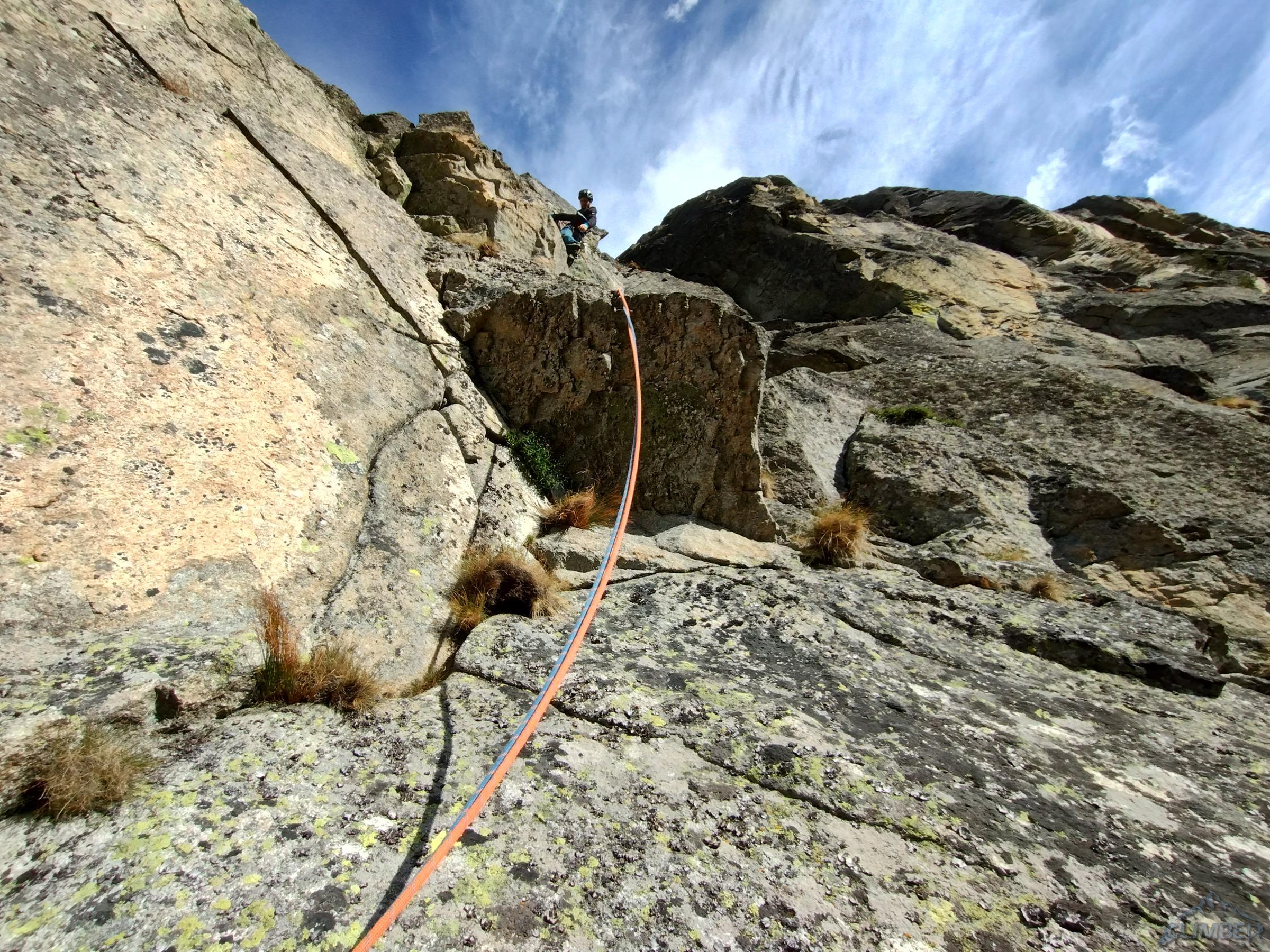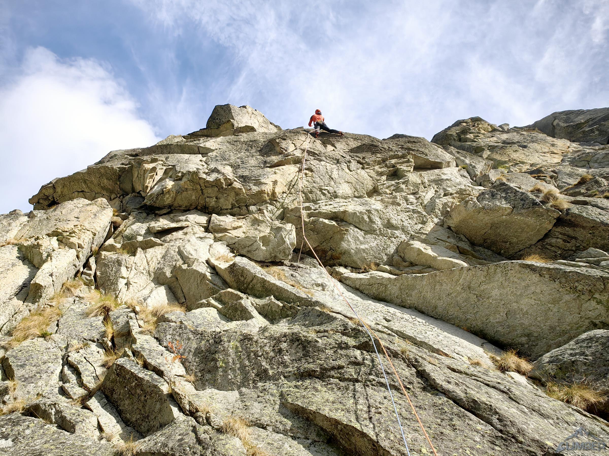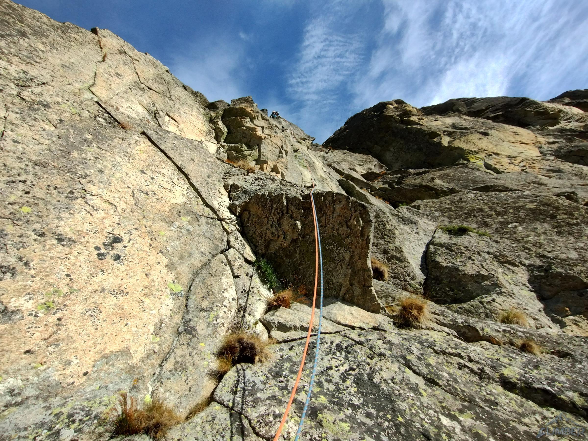 Po przewinięciu w prawo za kant do przejścia mamy piękną szeroką rysę (VI+), gdzie asekurujemy się własnym sprzętem – jedyny spit jest już po wyjściu z trudności. Warto mieć z 3-4 średnie/duże friendy, z samymi mniejszymi też się da ale jest dość odważnie. Na ostatnim wyciągu startujemy zacięciem i wchodzimy na ospitowaną płytę z krawądkami (VII-), nad którą czeka niebanalne przewinięcie (VII) i kilka technicznych metrów do stanowiska. Do ziemi jest równo 60 metrów - mając choć trochę krótszą linę konieczne są dwa zjazdy. Droga jest więc dobrą opcją na szybką dogrywkę, o ile oczywiście bulder na starcie puści - raczej nie da się go bowiem przeazerować.