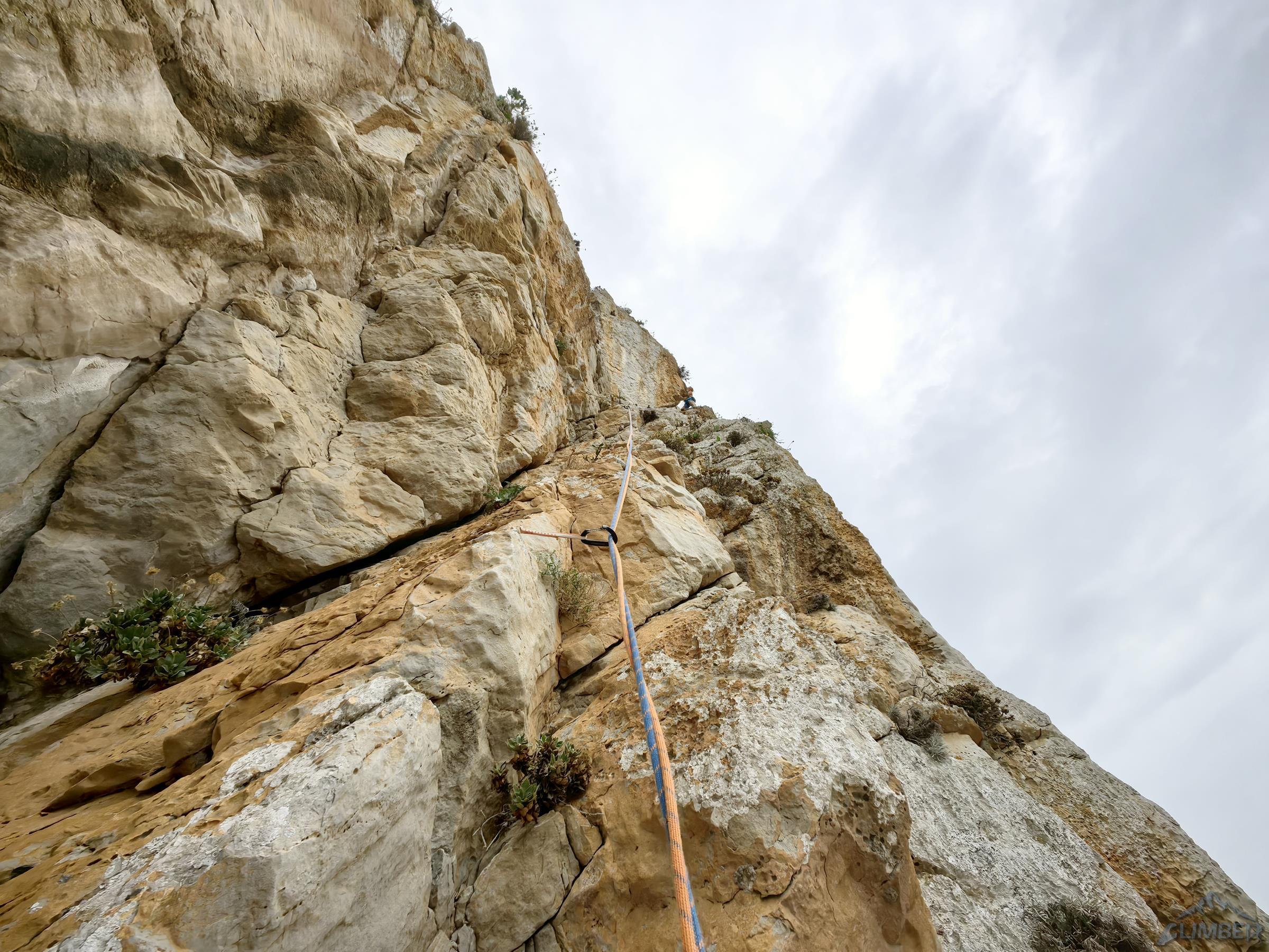 Pierwszego dnia na tapetę bierzemy ścianę północną czyli Parete Nord – startujemy dopiero przed południem gdy ściana podsycha po nocnych opadach dzięki silnemu ciepłemu wiatrowi. Sektor opisany jest co prawda jako tradowy, większość dróg jest jednak przynajmniej częściowo wyposażona w spity, a znajdą się i takie obite na tyle gęsto, że własny sprzęt przydaje się tylko do uzupełnienia. Jedną z takich linii jest La Collina del Conigili (6b+) czyli tłumacząc na polski Wzgórze Królików 😊. Droga jest ładna i logicznie poprowadzona – oferuje zajmujące wspinanie wzdłuż rys i zacięć, z dwoma trudniejszymi wyciągami biegnącymi między efektownymi przewieszeniami. Dojazd z San Vito trwa raptem pięć minut, po czym po 10 minutach spaceru docieramy pod turnię Pizzo Monaco i przechodzimy pod nią w lewo -  w przypadku naszej drogi tylko kawałek, startuje ona bowiem z prawego skraju muru.