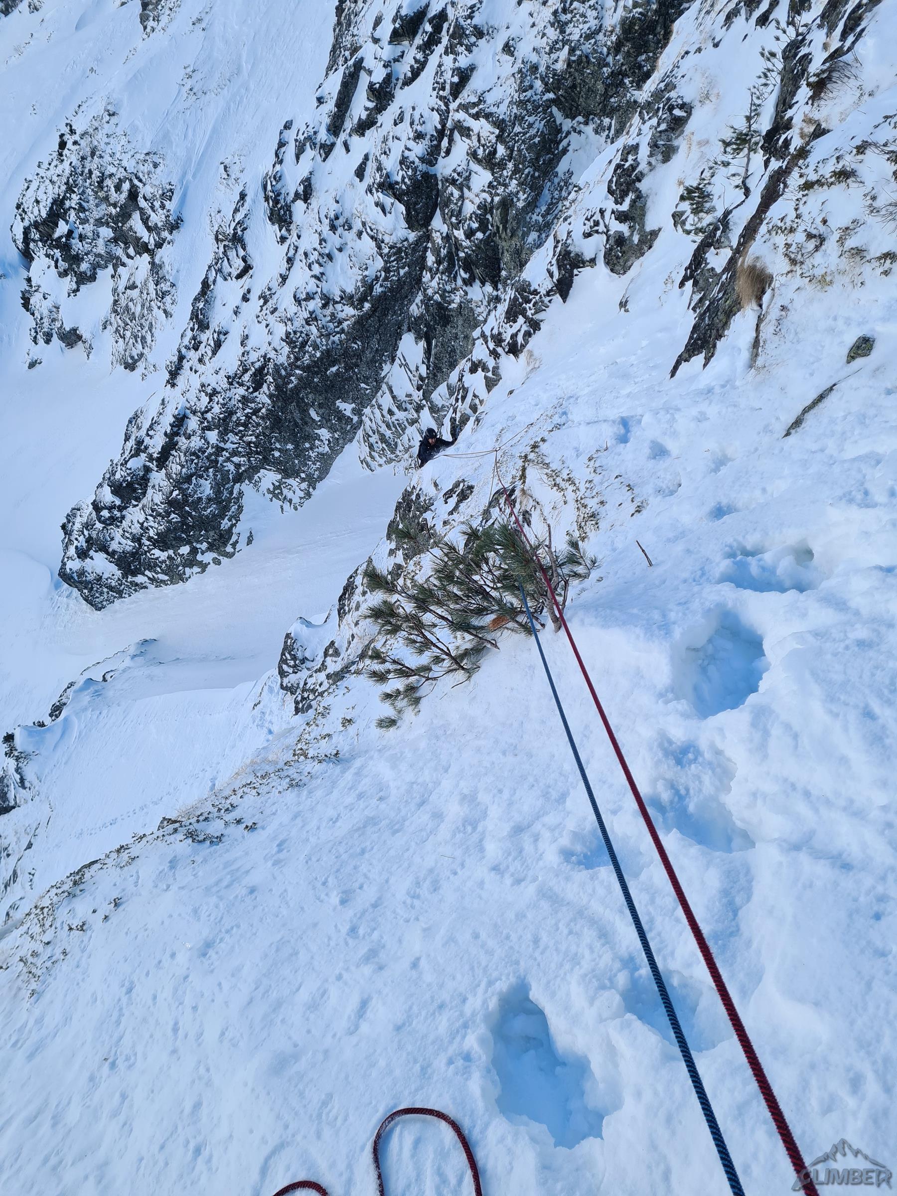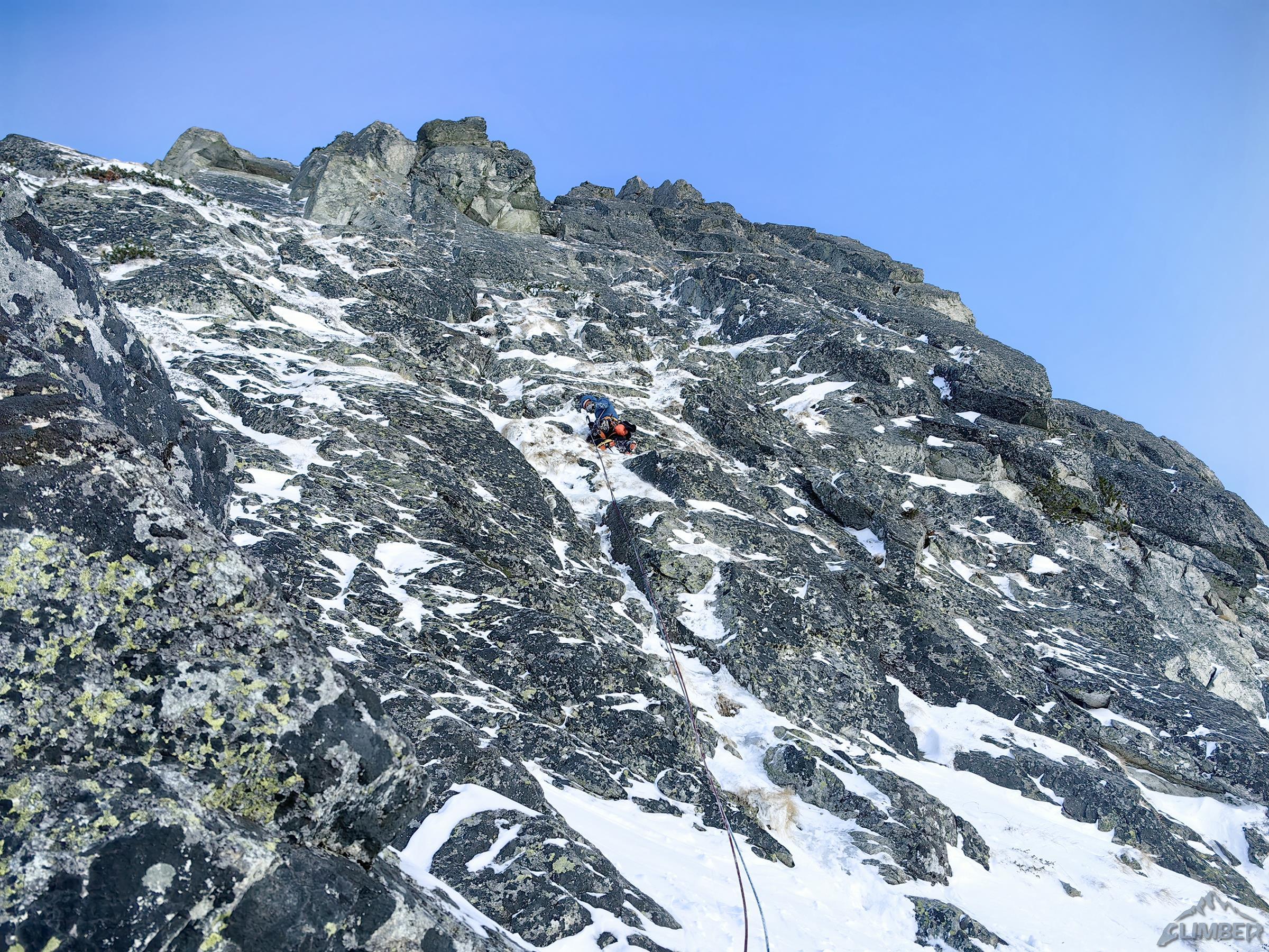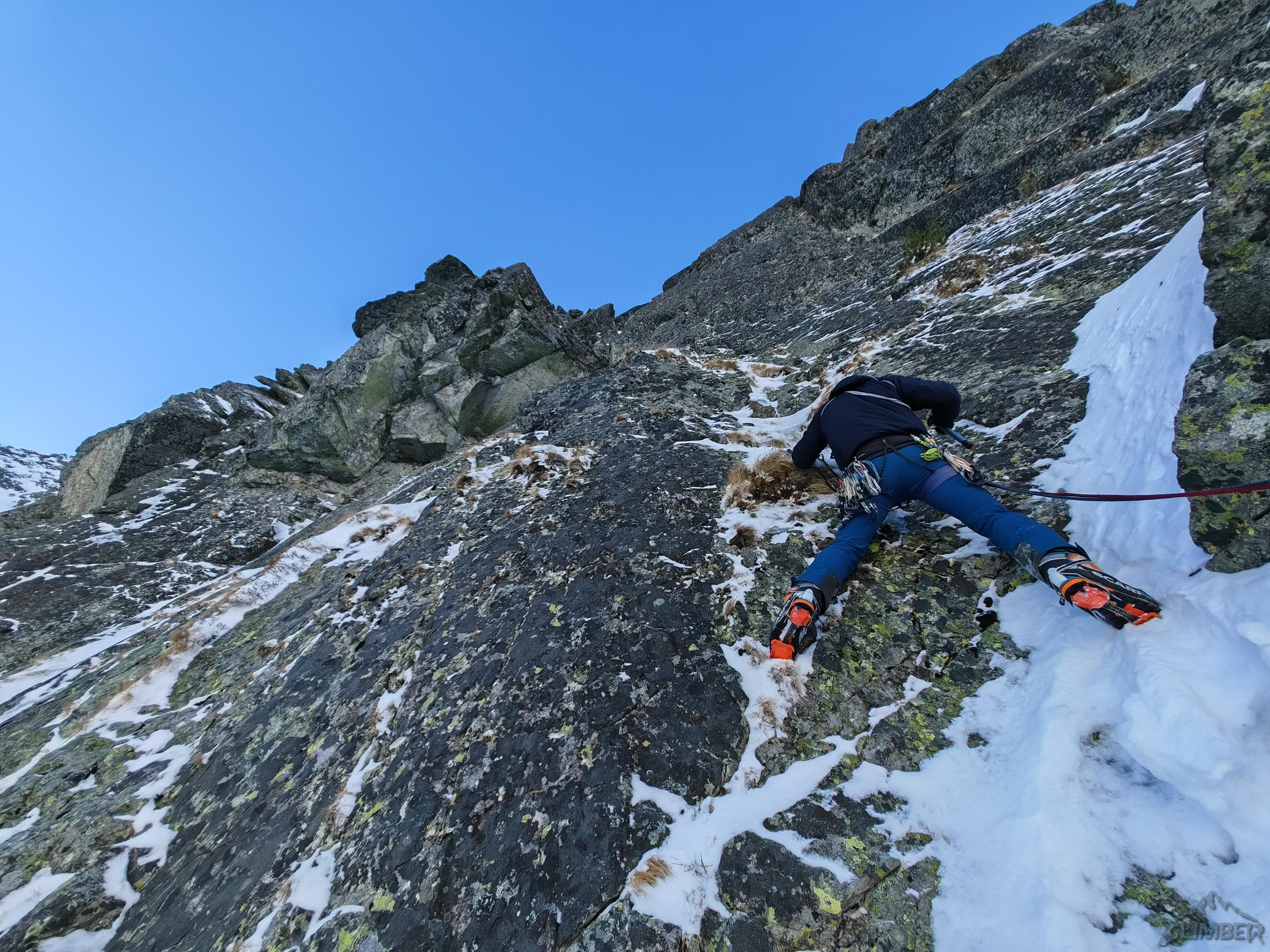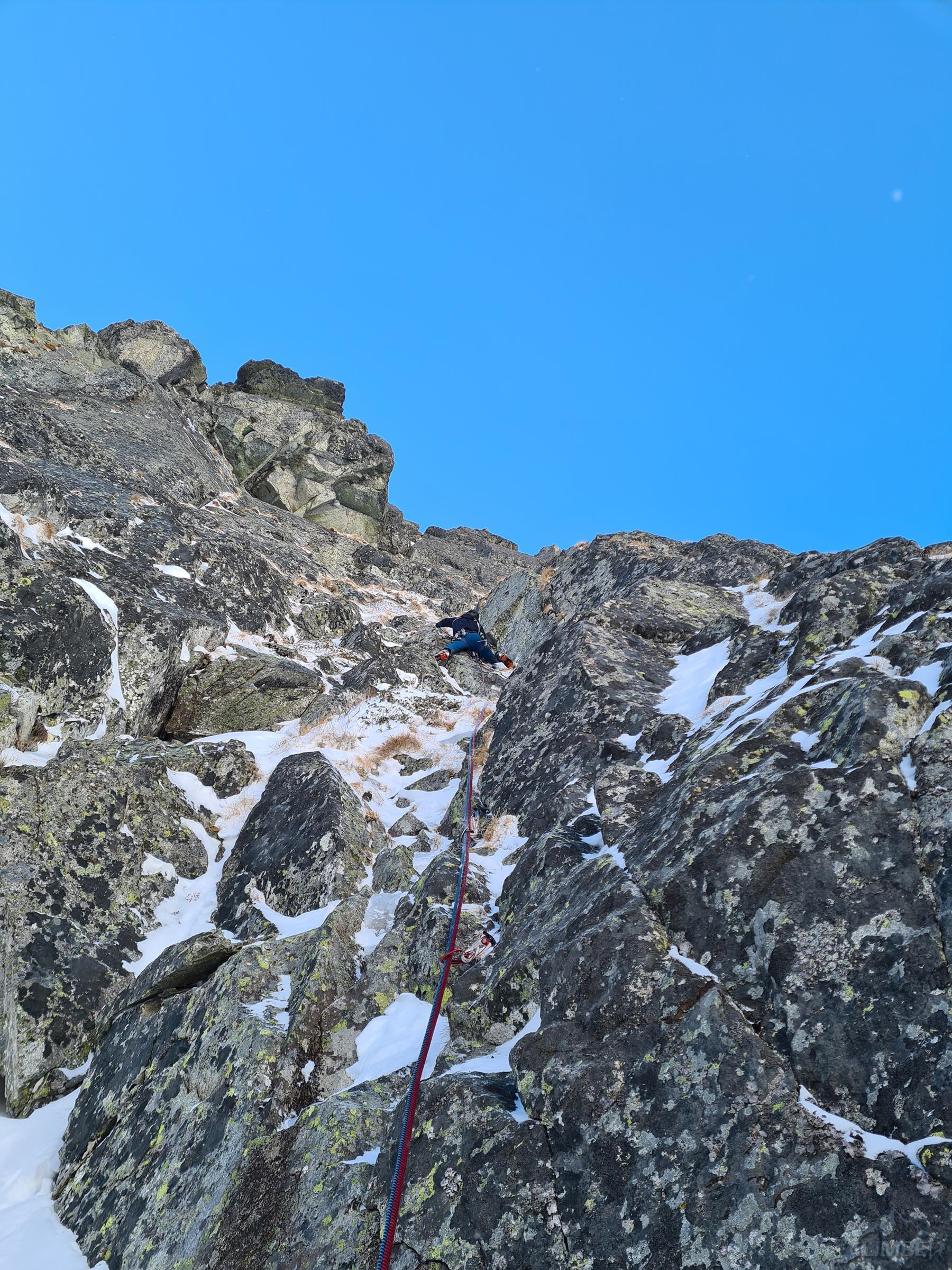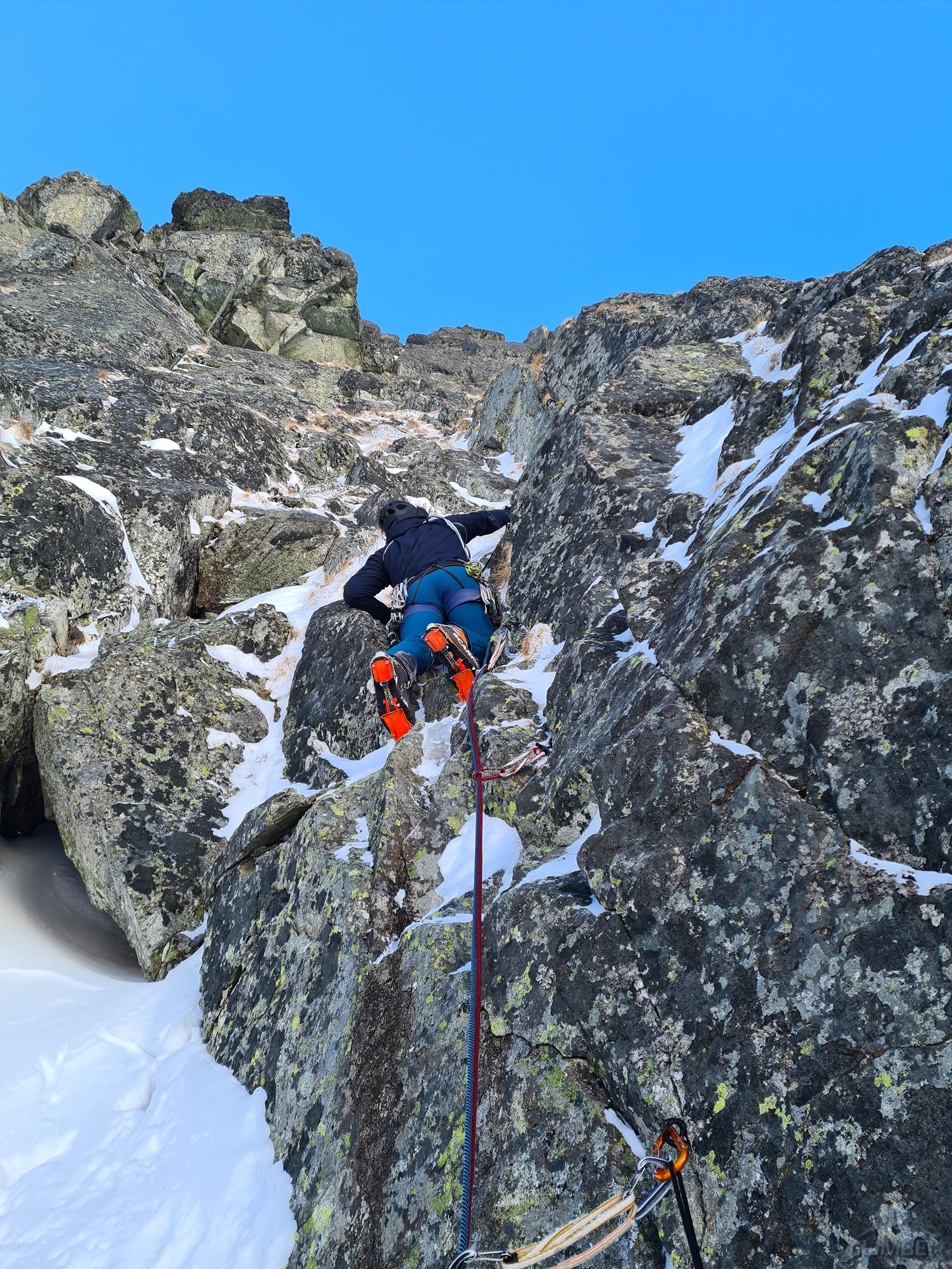 Na miejscu stawiamy się w trójkowym zespole dość późno – zakładamy, że skoro większość wyciągów jest „łatwa” to spokojnie wyrobimy się do zmroku. Ale jak już wielokrotnie doświadczyliśmy, zimą rzadko kiedy coś jest „za darmo”, a już zwłaszcza na starych (1975) słowackich drogach 😉. Wspinanie rozpoczyna Mateusz – na początek do pokonania jest próg broniący dostępu do dużego tarasu. I choć z daleka wydaje się, że to łatwy teren, nie do końca tak jest. Pierwsze metry to co prawda ok. M4 ale bardzo czujne, o czym kolega przekonuje się po chwili wracając na ziemię z wyrwanym starym hakiem (jedynym na wyciągu). Druga próba jest już na szczęście skuteczna, kolejne metry łatwiejsze (w lewo za depresją), po wyjściu na taras pozostaje przejść go na prawie całą długość liny pod kolejne spiętrzenie (rep na bloku).