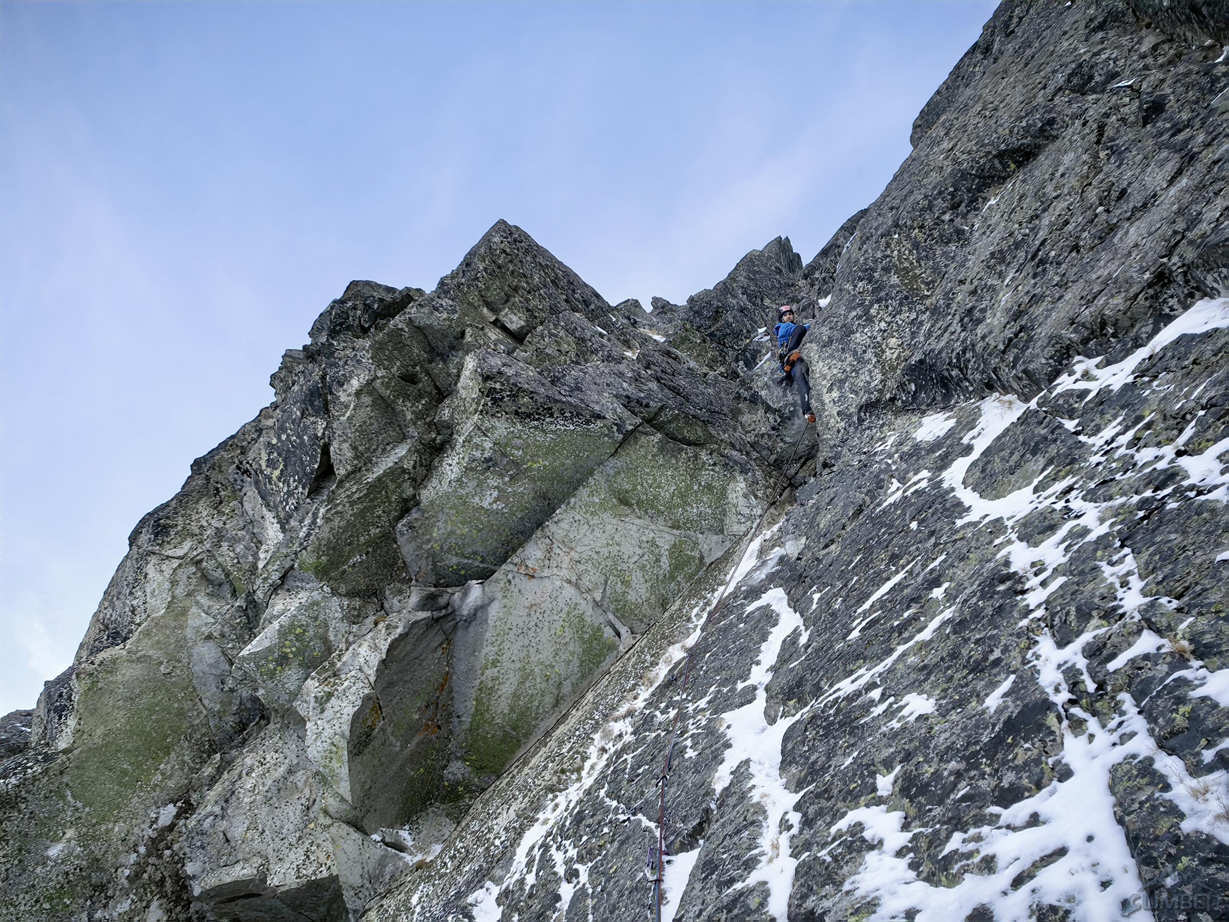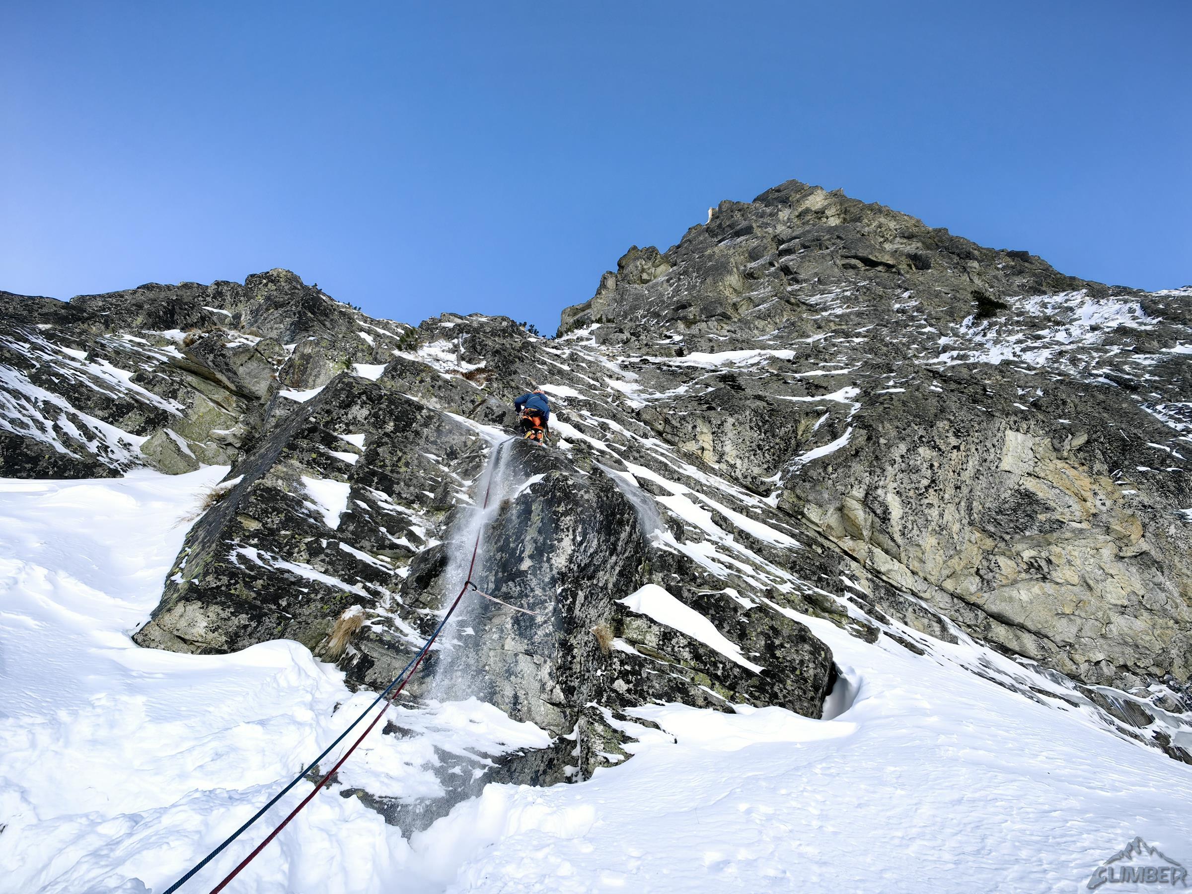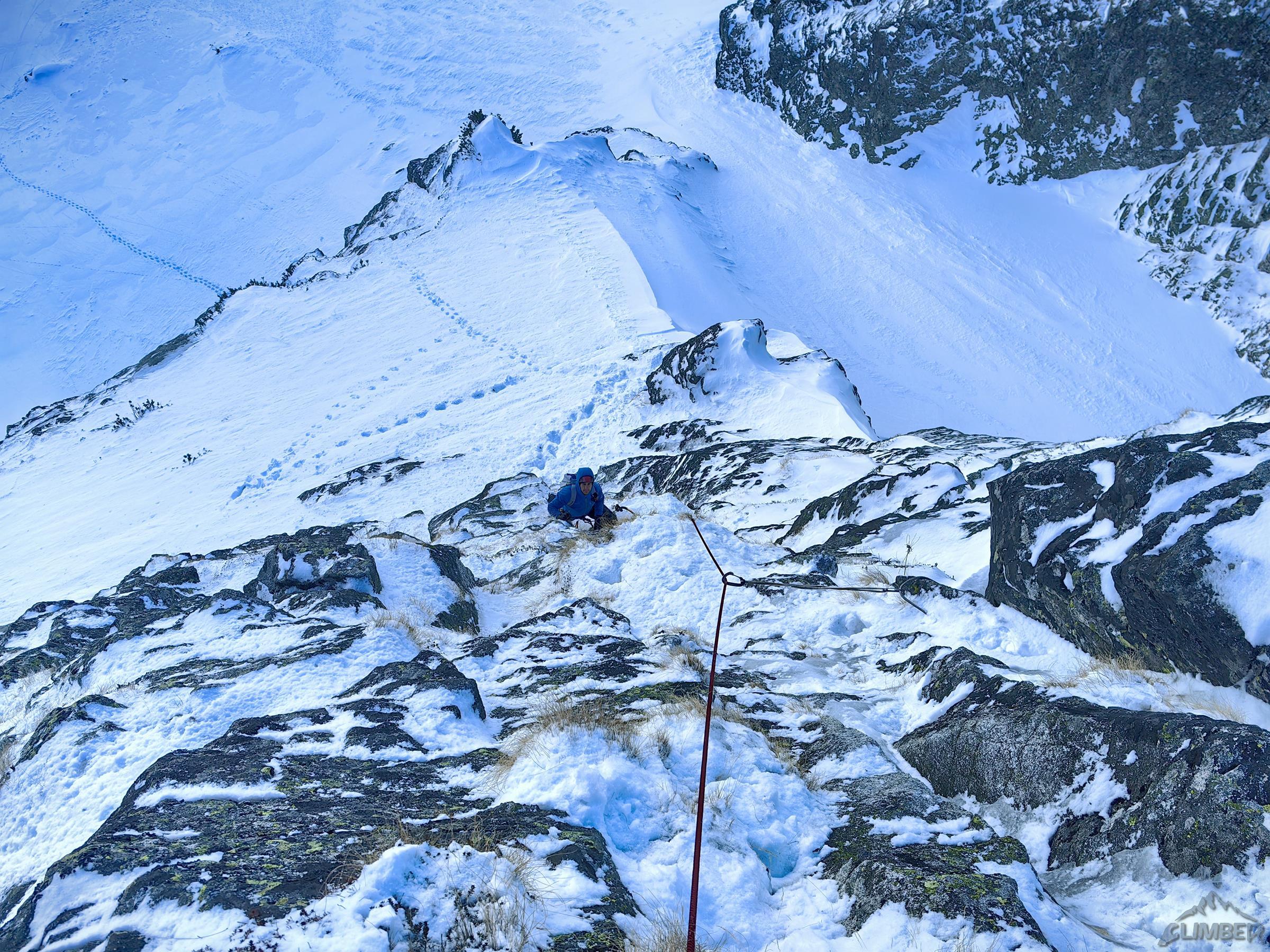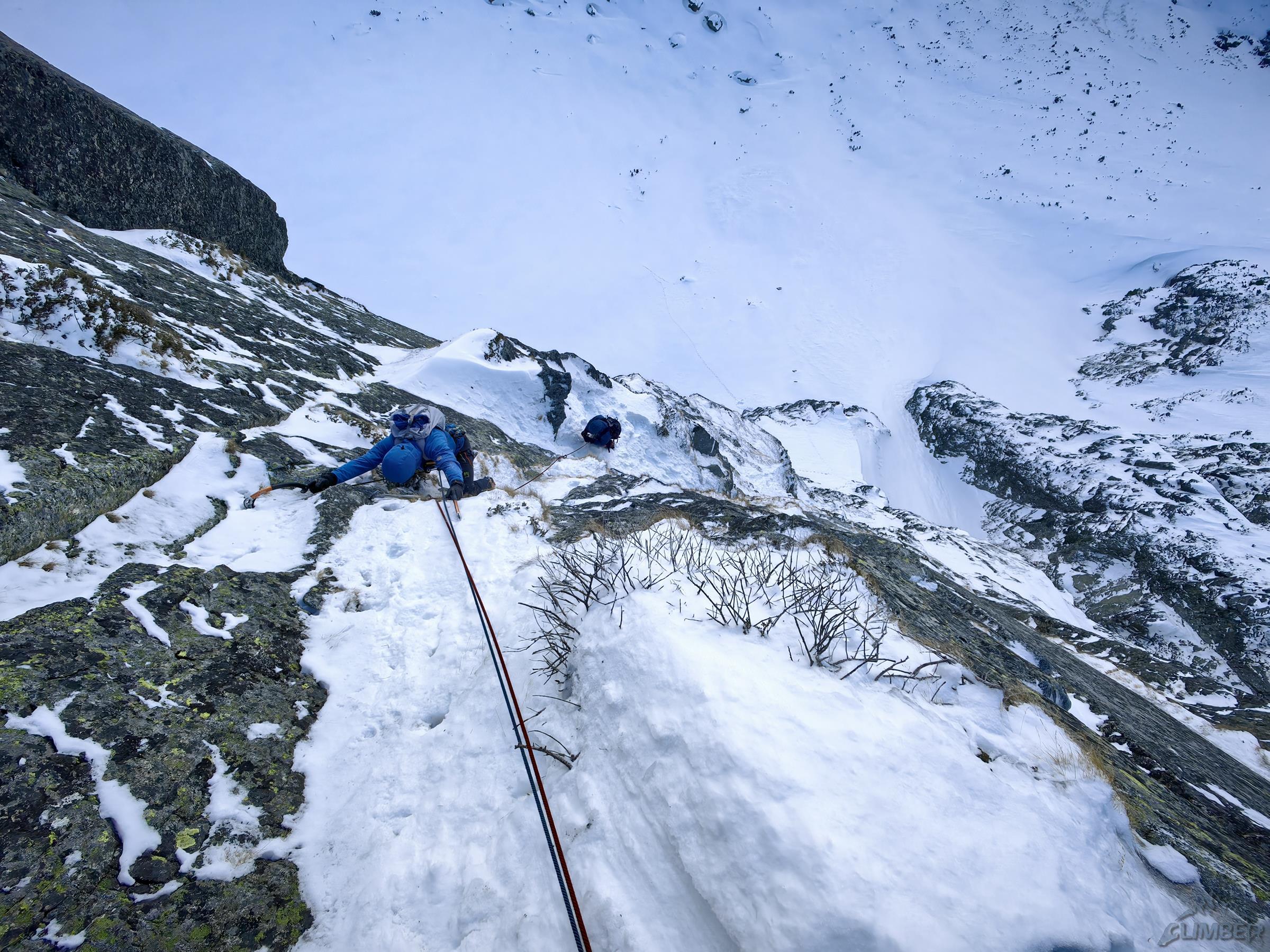 Na miejscu stawiamy się w trójkowym zespole dość późno – zakładamy, że skoro większość wyciągów jest „łatwa” to spokojnie wyrobimy się do zmroku. Ale jak już wielokrotnie doświadczyliśmy, zimą rzadko kiedy coś jest „za darmo”, a już zwłaszcza na starych (1975) słowackich drogach 😉. Wspinanie rozpoczyna Mateusz – na początek do pokonania jest próg broniący dostępu do dużego tarasu. I choć z daleka wydaje się, że to łatwy teren, nie do końca tak jest. Pierwsze metry to co prawda ok. M4 ale bardzo czujne, o czym kolega przekonuje się po chwili wracając na ziemię z wyrwanym starym hakiem (jedynym na wyciągu). Druga próba jest już na szczęście skuteczna, kolejne metry łatwiejsze (w lewo za depresją), po wyjściu na taras pozostaje przejść go na prawie całą długość liny pod kolejne spiętrzenie (rep na bloku).