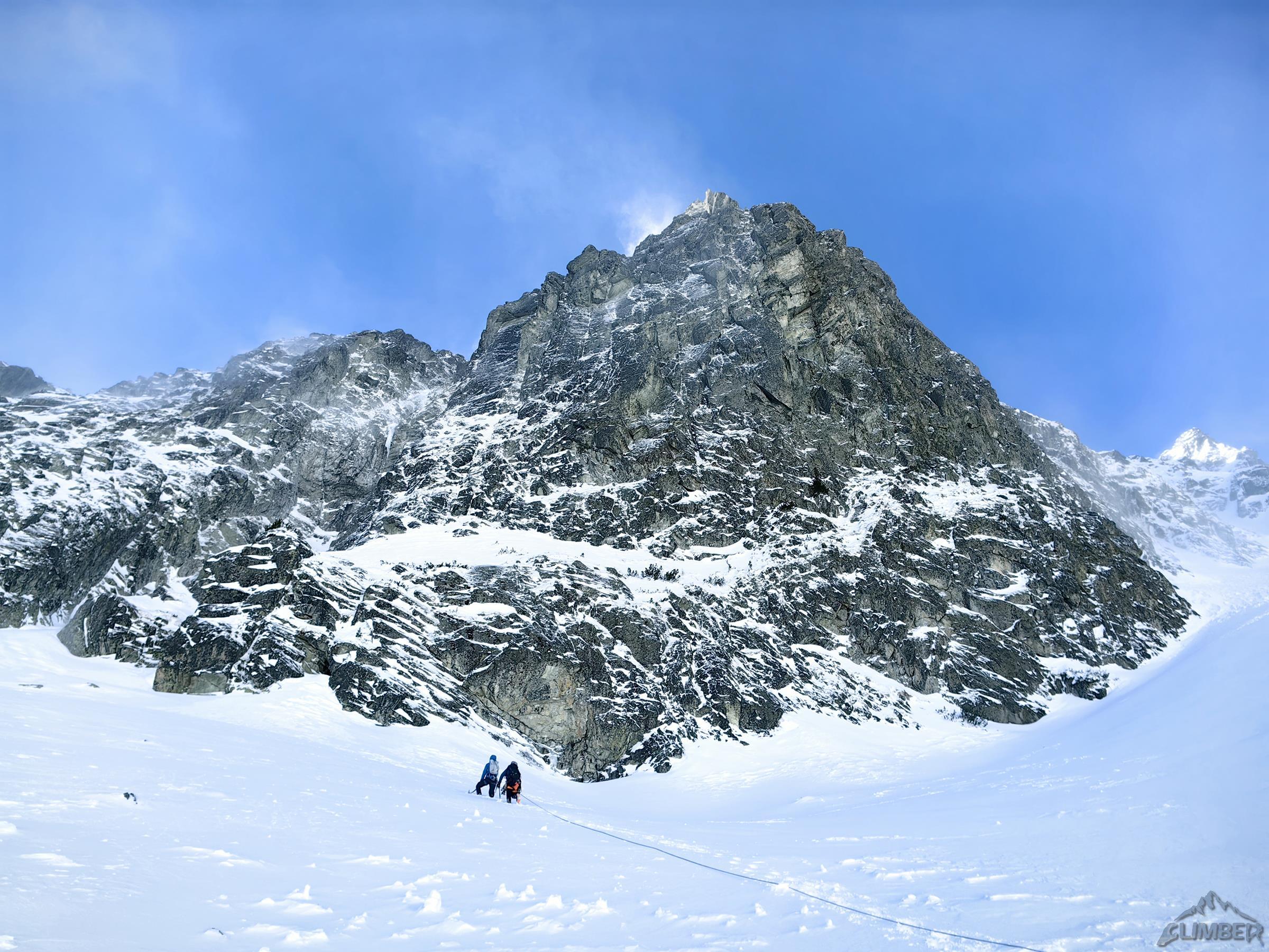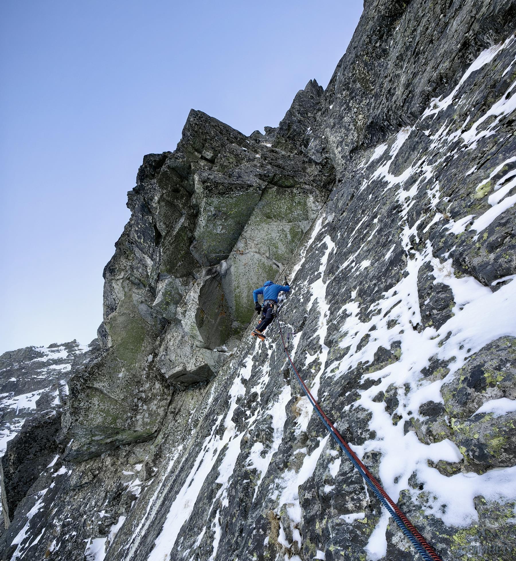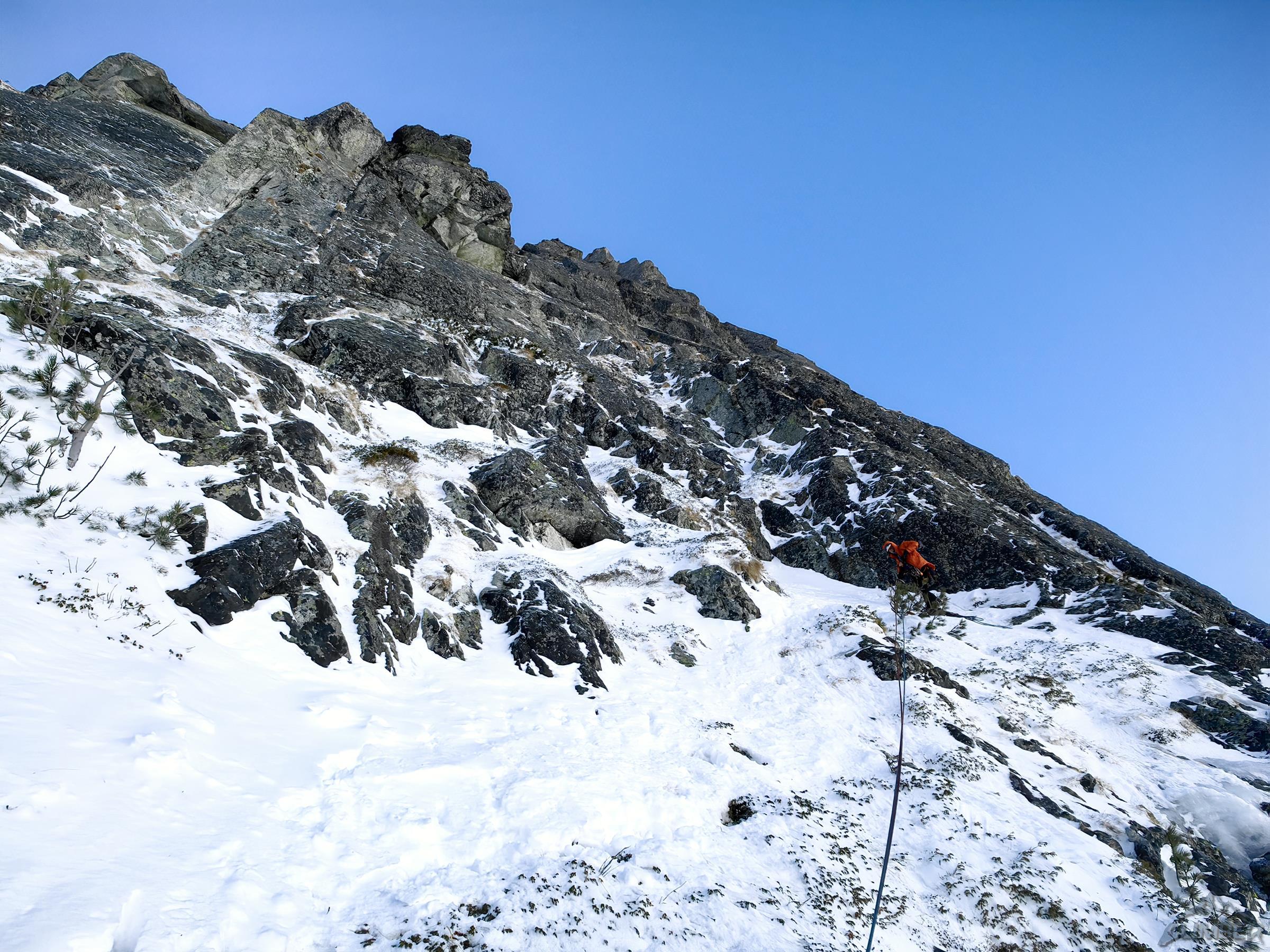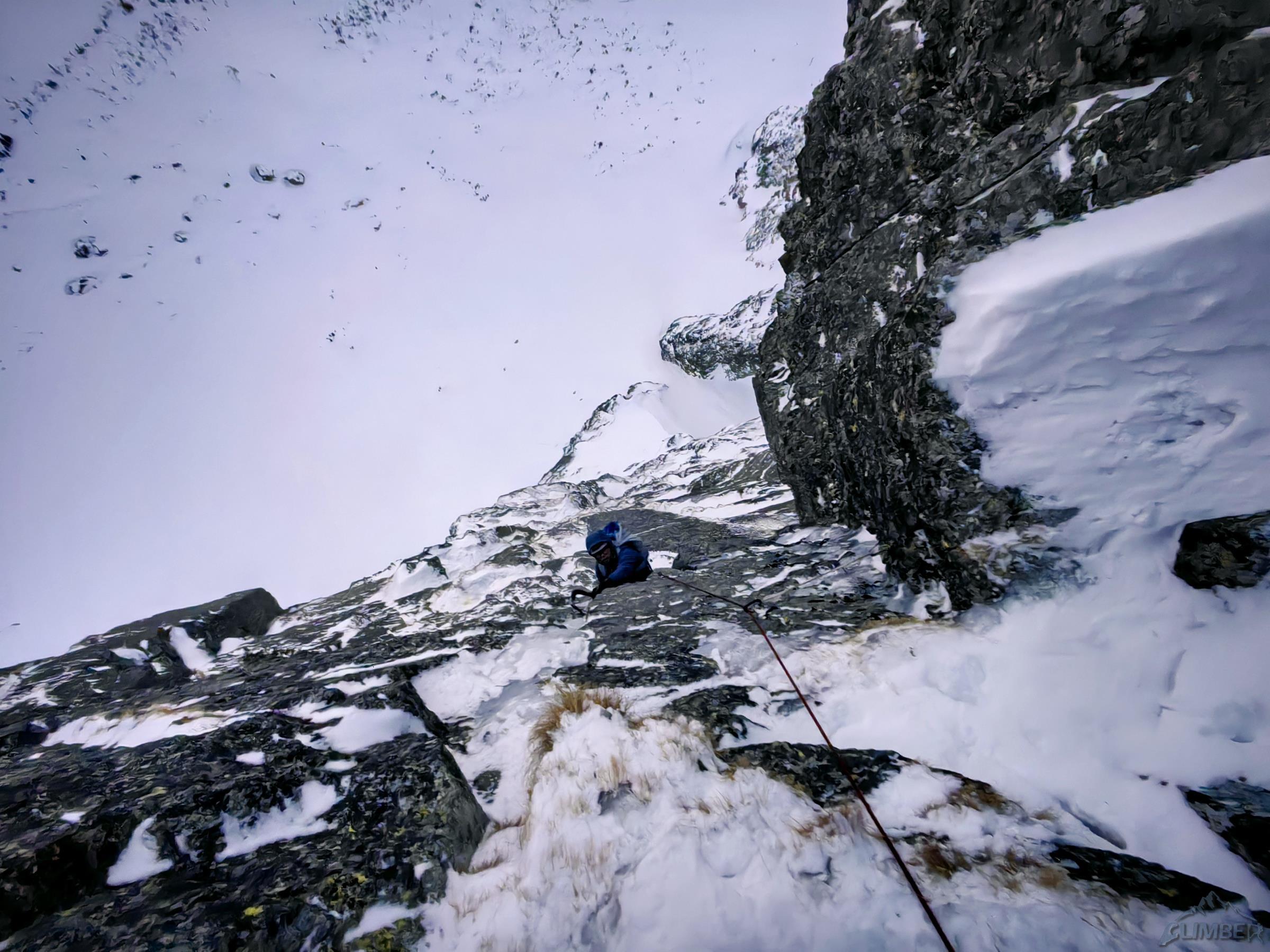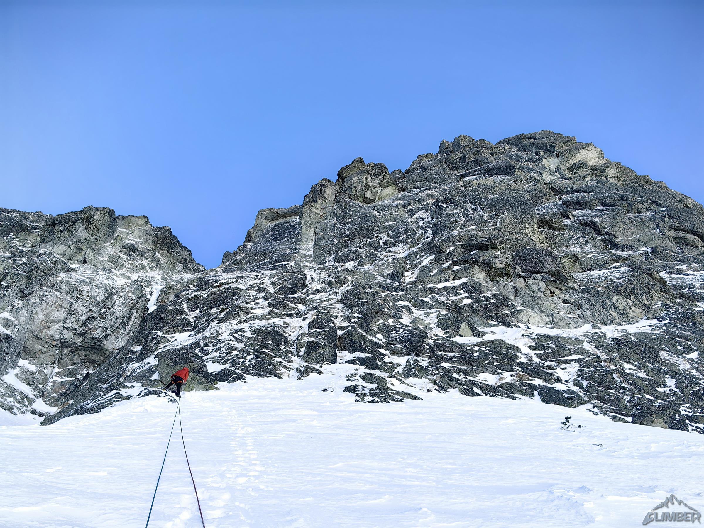 Na miejscu stawiamy się w trójkowym zespole dość późno – zakładamy, że skoro większość wyciągów jest „łatwa” to spokojnie wyrobimy się do zmroku. Ale jak już wielokrotnie doświadczyliśmy, zimą rzadko kiedy coś jest „za darmo”, a już zwłaszcza na starych (1975) słowackich drogach 😉. Wspinanie rozpoczyna Mateusz – na początek do pokonania jest próg broniący dostępu do dużego tarasu. I choć z daleka wydaje się, że to łatwy teren, nie do końca tak jest. Pierwsze metry to co prawda ok. M4 ale bardzo czujne, o czym kolega przekonuje się po chwili wracając na ziemię z wyrwanym starym hakiem (jedynym na wyciągu). Druga próba jest już na szczęście skuteczna, kolejne metry łatwiejsze (w lewo za depresją), po wyjściu na taras pozostaje przejść go na prawie całą długość liny pod kolejne spiętrzenie (rep na bloku).