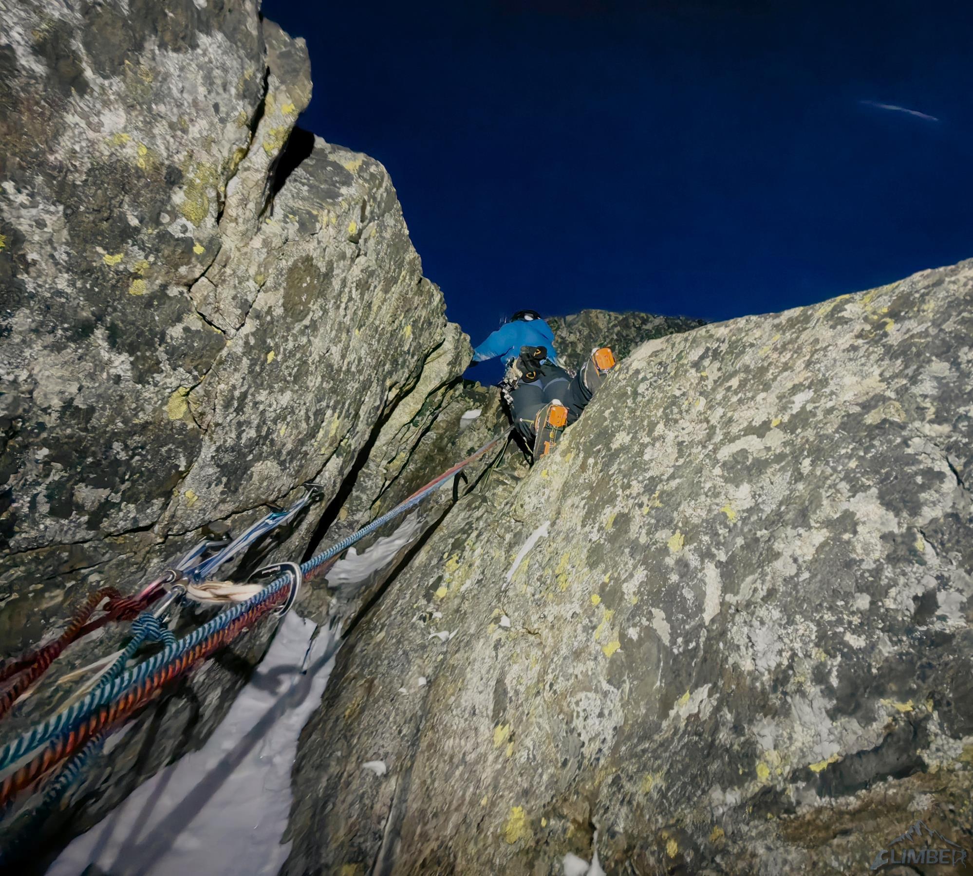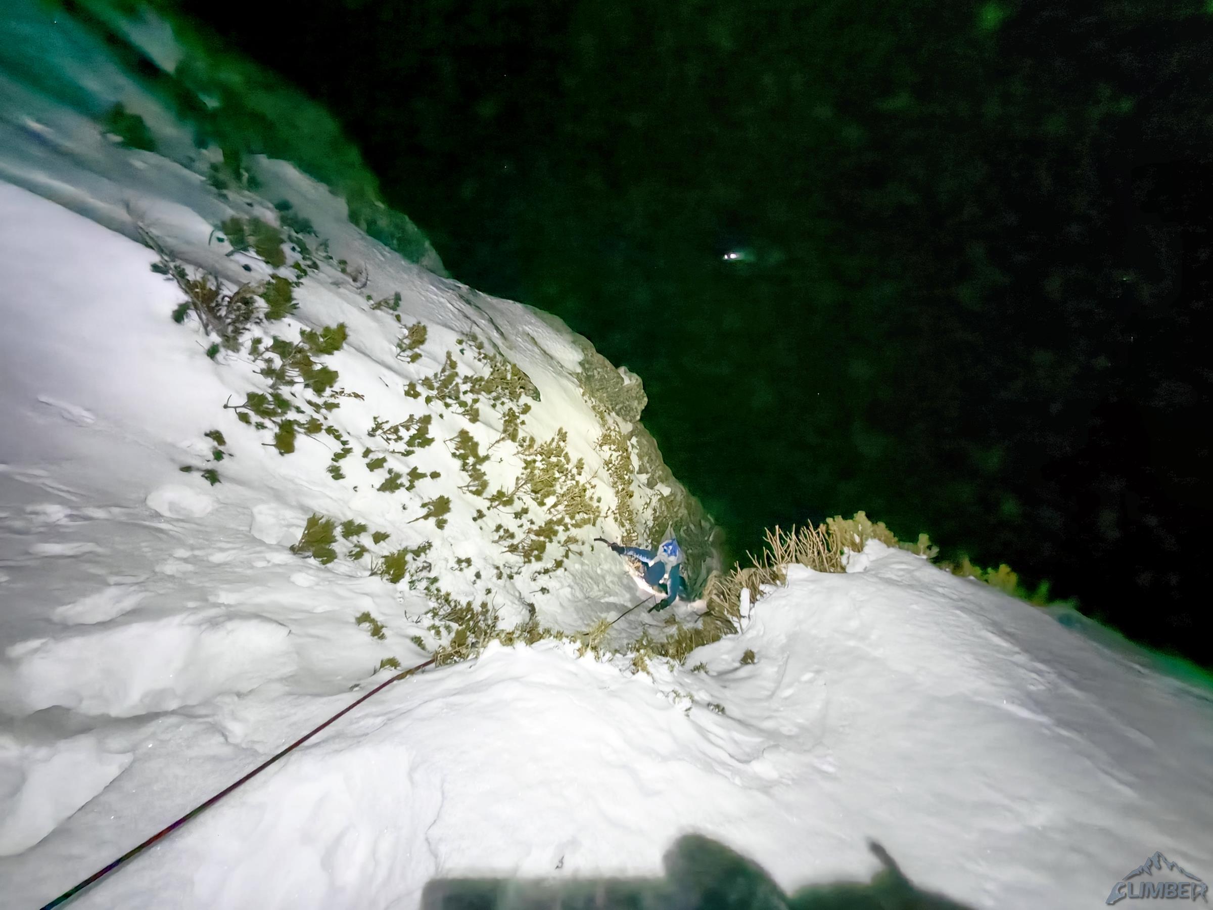 Za kluczowy wyciąg zabiera się Michał – mamy godzinę do zachodu Słońca i mocno mrozi, mamy więc nadzieję, że będzie łatwiej niż wygląda z dołu 😉. Już dojście pod okap okazuje się jednak niebanalne (czujne M5), a przewinięcie obok niego (stare haki) i wyjście z płyty powyżej to wg nas co najmniej bardzo solidne M6. Kolega mimo kłopotów w dwóch miejscach daje jednak radę i do stanowiska (2 haki) pod kominkiem dociera OS-em, broniąc nam zapewne klasycznego przejścia - powtórki przy tej temperaturze i wietrze po zmroku raczej nie byłyby skuteczne. Szósty wyciąg mimo ciemności to już przyjemny deser – po ciekawym kominku (ok. M4+) czeka prawie cała długość fajnego trawiasto-lodowego kuluaru, z którego wychodzi się na spory taras. Z niego pozostaje krótki odcinek żeberkiem (M3) i wyjście w łatwy teren nad Galerią.