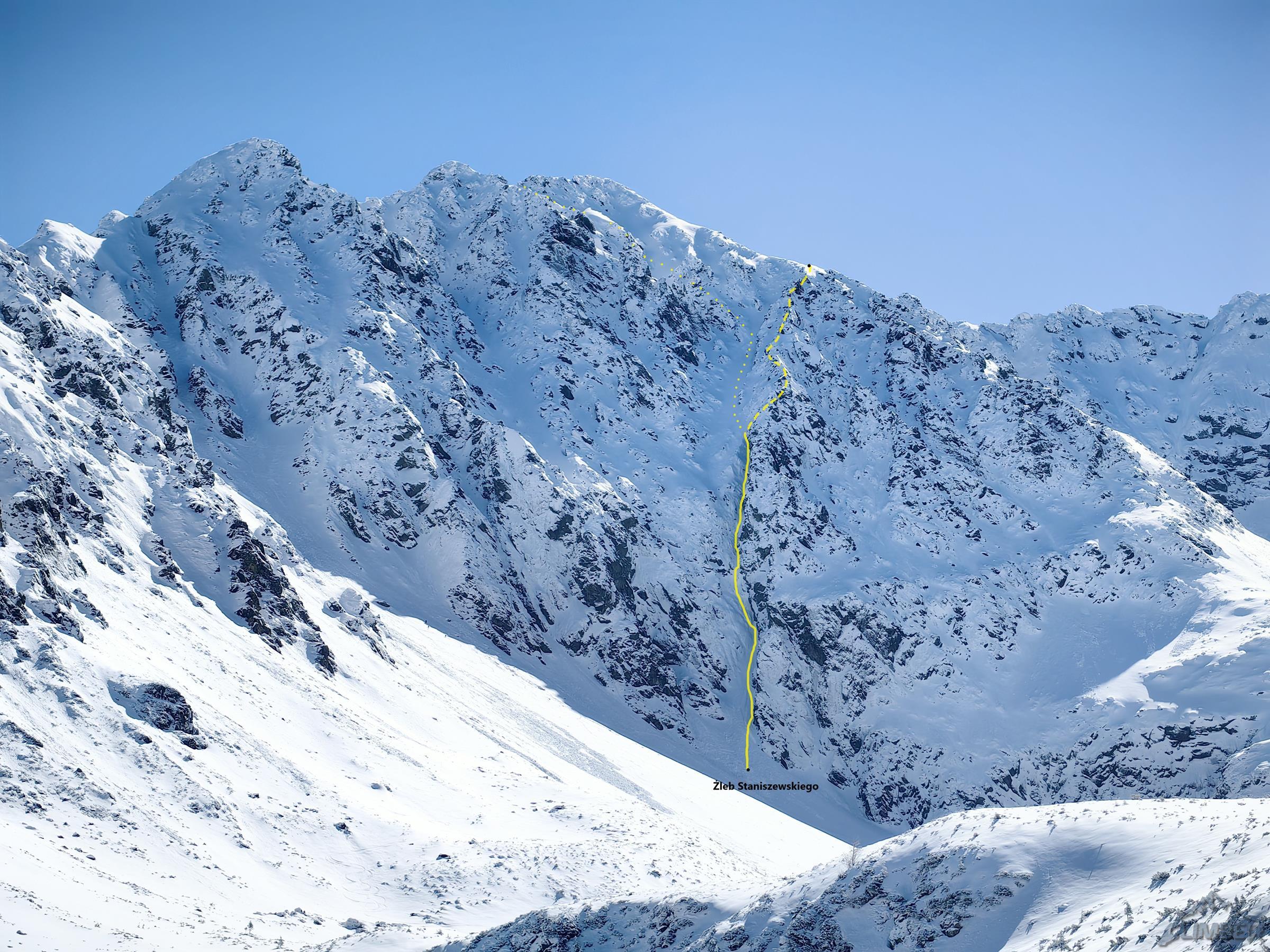 Uszkodzone po wypadku ramię nadal nie pozwala na wspinanie, za długo bez Tatr wytrzymać się jednak nie da 😊. W ramach rehabilitacji wybrałem się więc z dawno nie widzianym kolegą Łukaszem na małą alpiniadę – Żleb Staniszewskiego na Granatach. W idealnych zimowych warunkach droga posiada jeden bardziej stromy odcinek lodowy (WI3, przy odkrytej skale ok. M4). Pozostałe trzy długości liny w dolnej części to firnowa rynna przedzielona prożkami. Druga połowa drogi to szeroki żleb – łatwy przy twardy śniegu, przy głębokim wymuszający jednak przejście na górny, łatwiejszy odcinek Filara Staszla i kontynuowanie nim do zwieńczenia ściany.