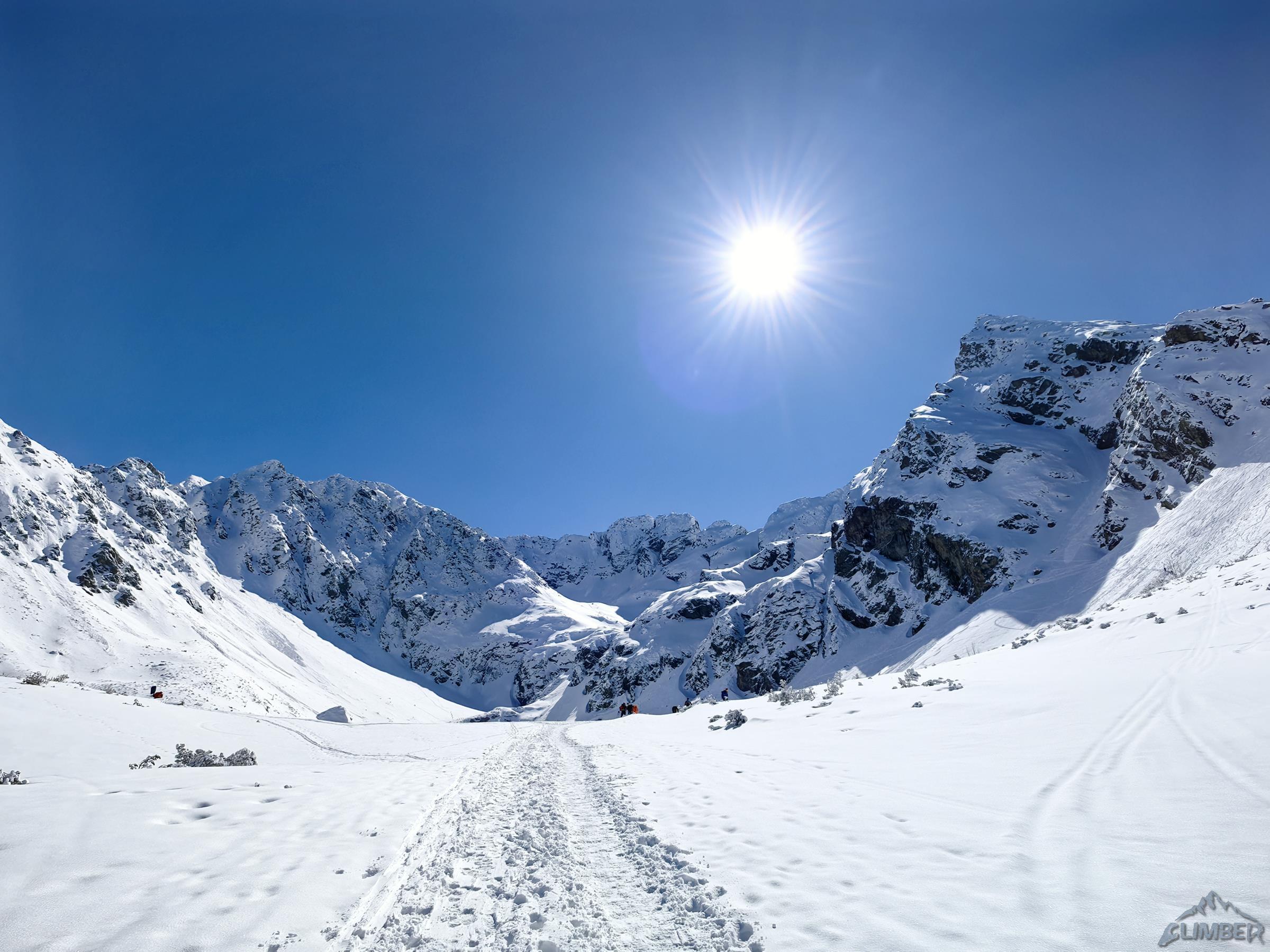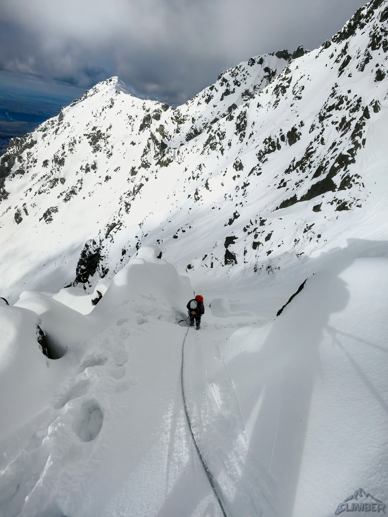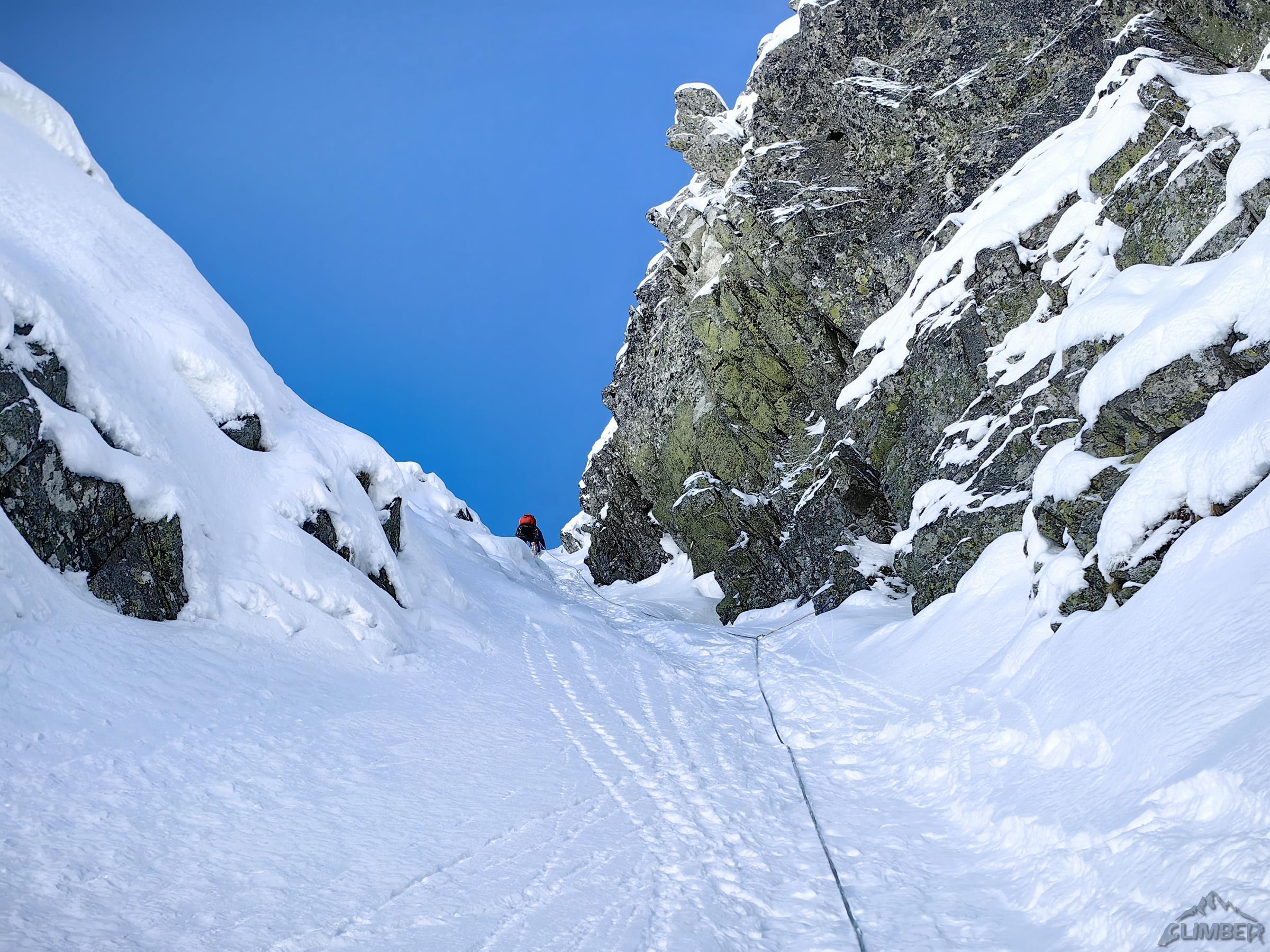 Kolejne 100 metrów pokonujemy już z uśmiechem na ustach – rynna wypełniona jest twardym śniegiem, szybko więc dochodzimy do siodełka nad którym żleb robi się mniej stromy i znacznie szerszy. Po chwili okazuje się, że tutaj na firn nie mamy co liczyć – śnieg jest słabo związany na dużej głębokości co grozi nie tylko ugrzęźnięciem ale i lawiną. Kolegę na próbie przejścia do Filara Staszla zatrzymuje zasypany uskok bez asekuracji, wraca więc na stanowisko i prosi bym coś wymyślił 😊. Kolejną godzinę spędzam więc na żmudnym i stresującym przedzieraniu się stromą depresją do grani.