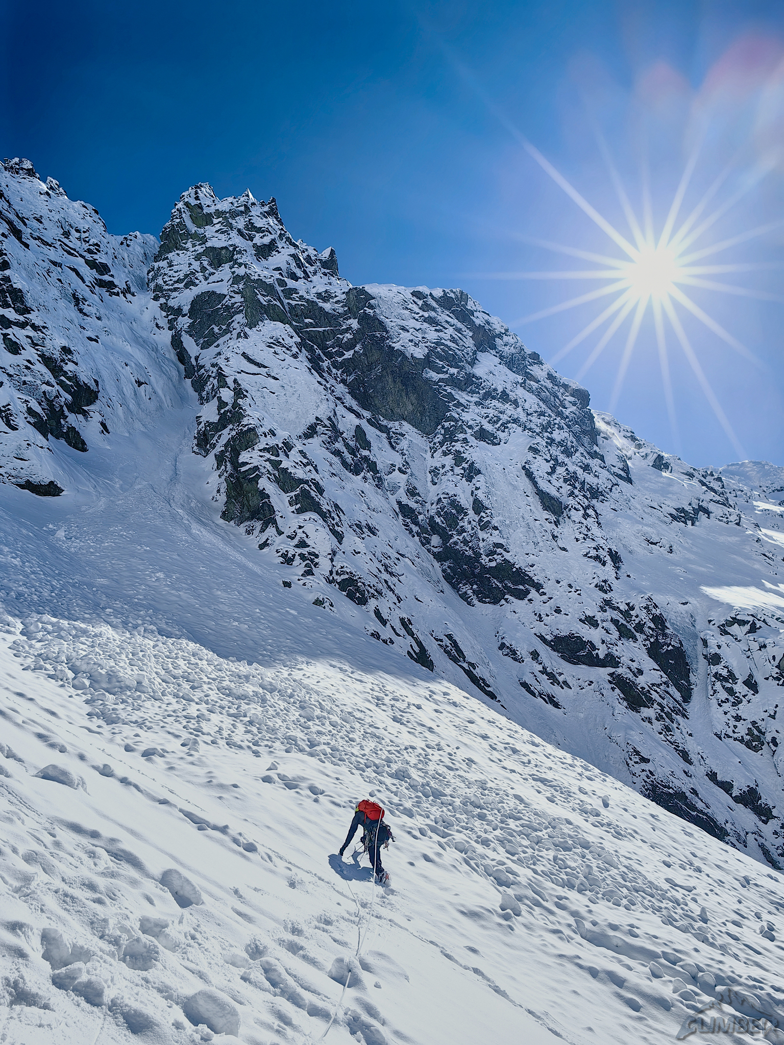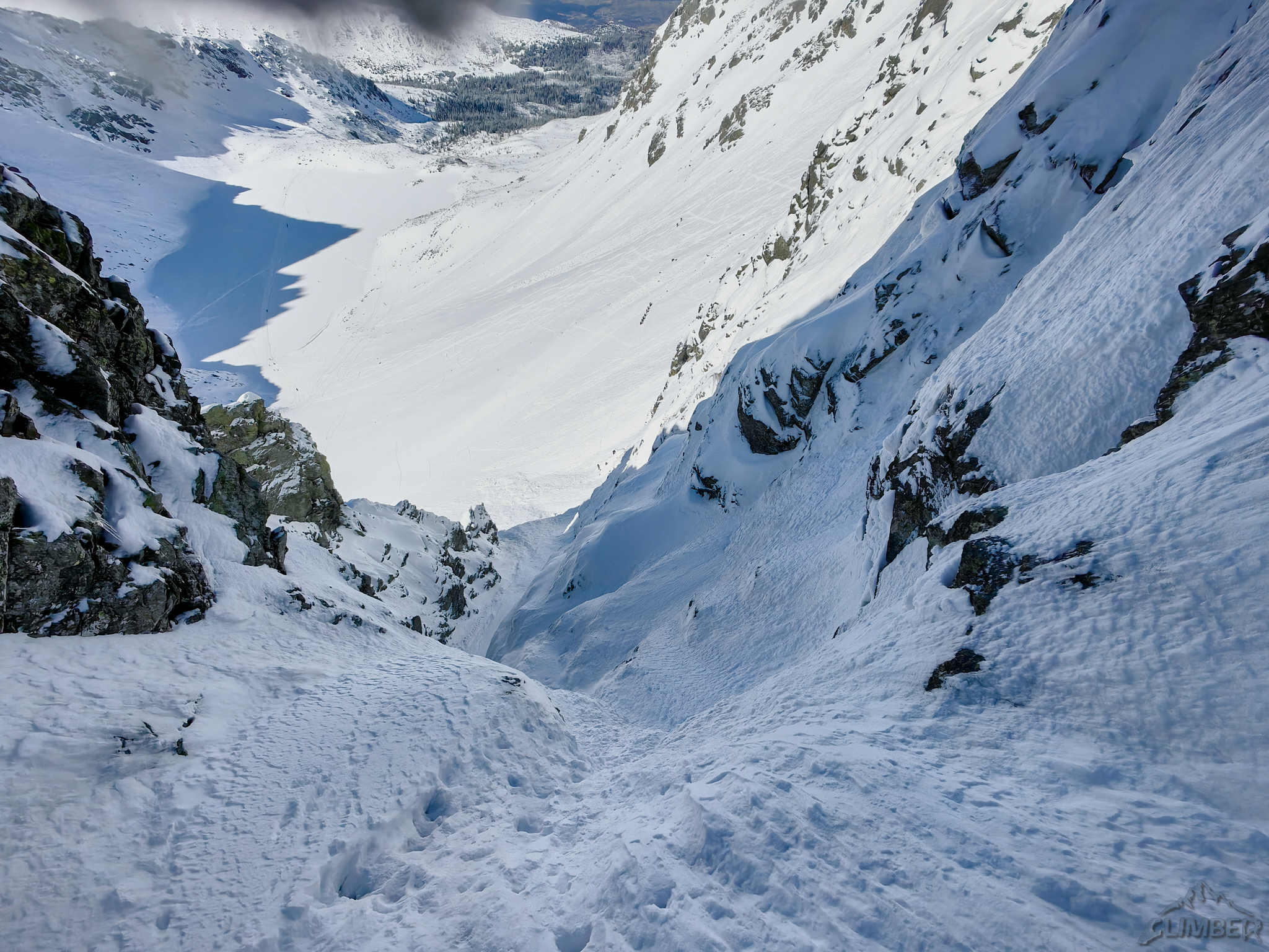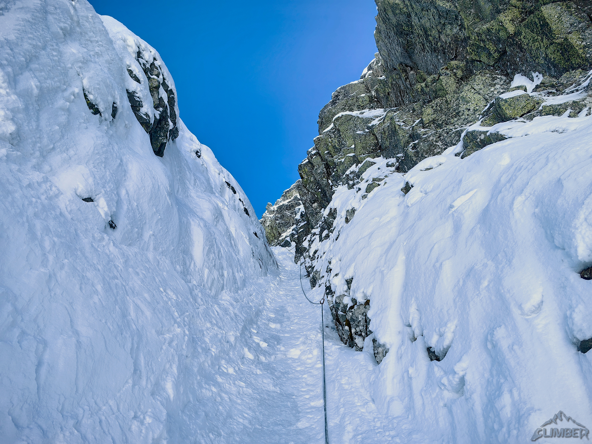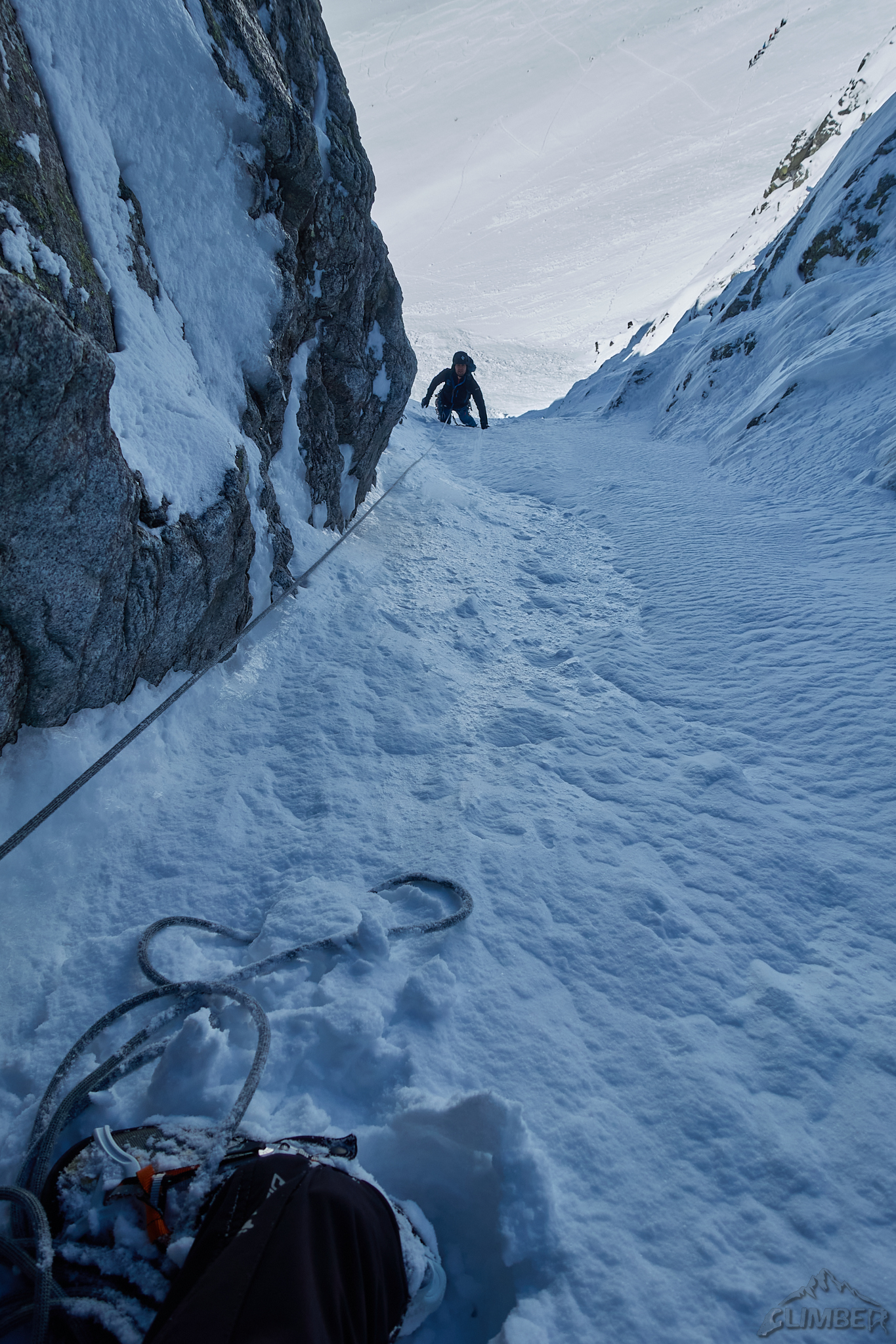 Kolejne 100 metrów pokonujemy już z uśmiechem na ustach – rynna wypełniona jest twardym śniegiem, szybko więc dochodzimy do siodełka nad którym żleb robi się mniej stromy i znacznie szerszy. Po chwili okazuje się, że tutaj na firn nie mamy co liczyć – śnieg jest słabo związany na dużej głębokości co grozi nie tylko ugrzęźnięciem ale i lawiną. Kolegę na próbie przejścia do Filara Staszla zatrzymuje zasypany uskok bez asekuracji, wraca więc na stanowisko i prosi bym coś wymyślił 😊. Kolejną godzinę spędzam więc na żmudnym i stresującym przedzieraniu się stromą depresją do grani.