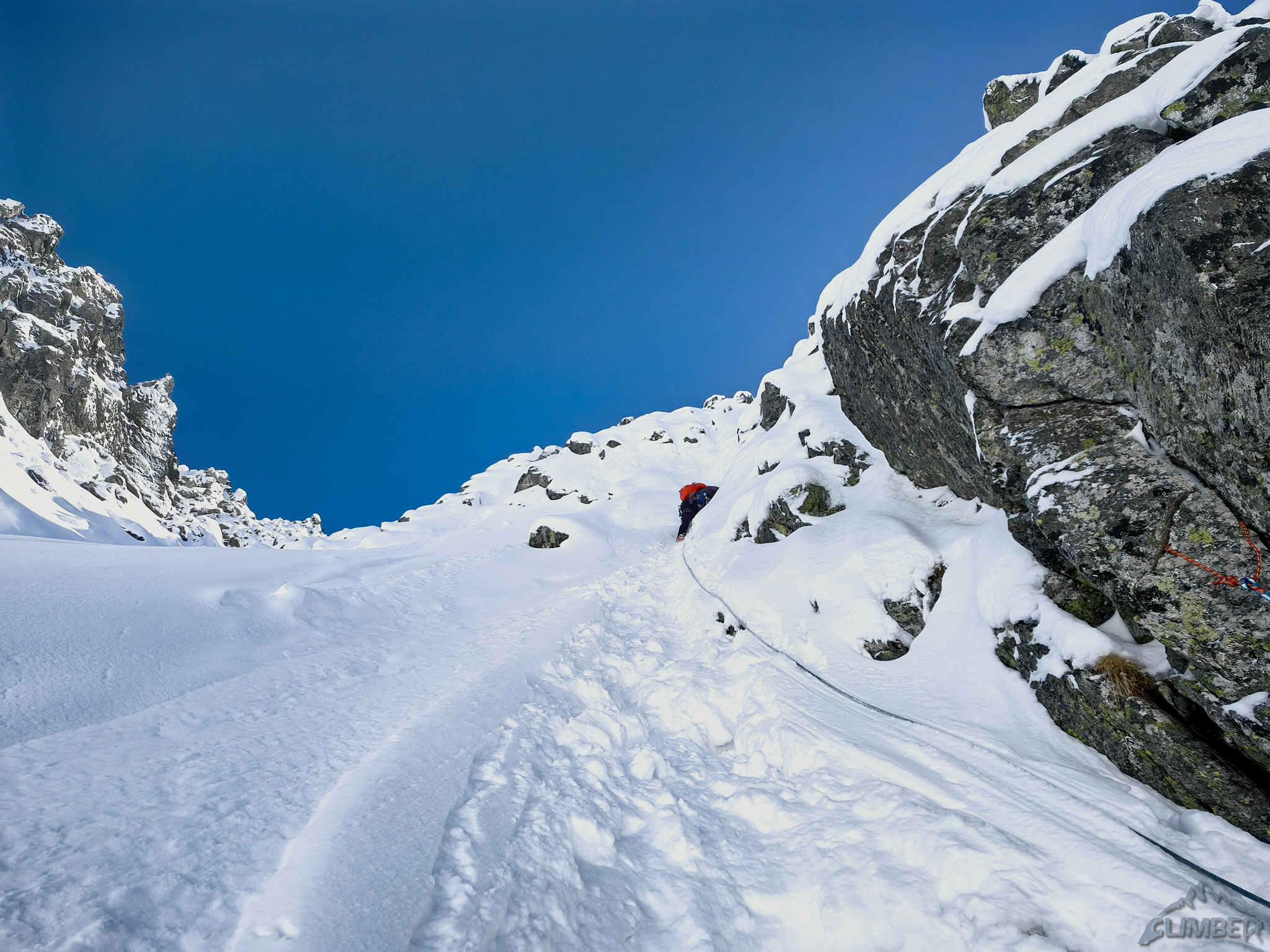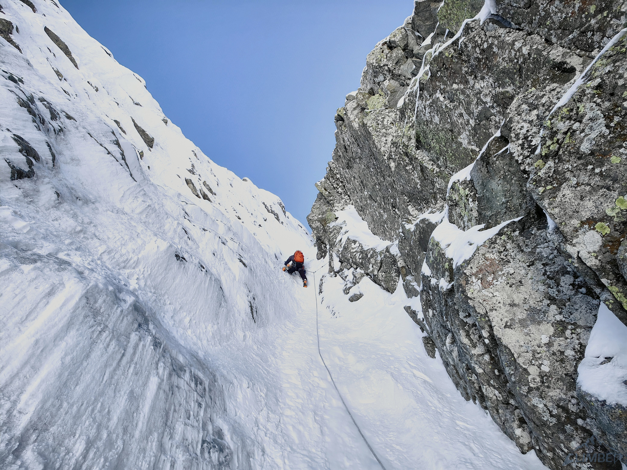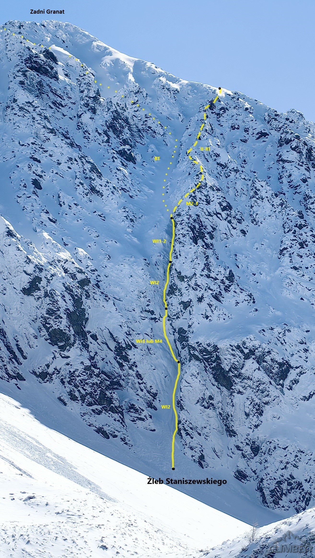 Wycena: WI3   Wycena uzupełniająca: WI3 lub M4   Asekuracja: R2   Długość [m]: 400   Wyciągi: 4   Czas [h]: 5   Wystawa: NW   Ocena: 7/10   Komentarz: 4 wyc. + lotna 200m