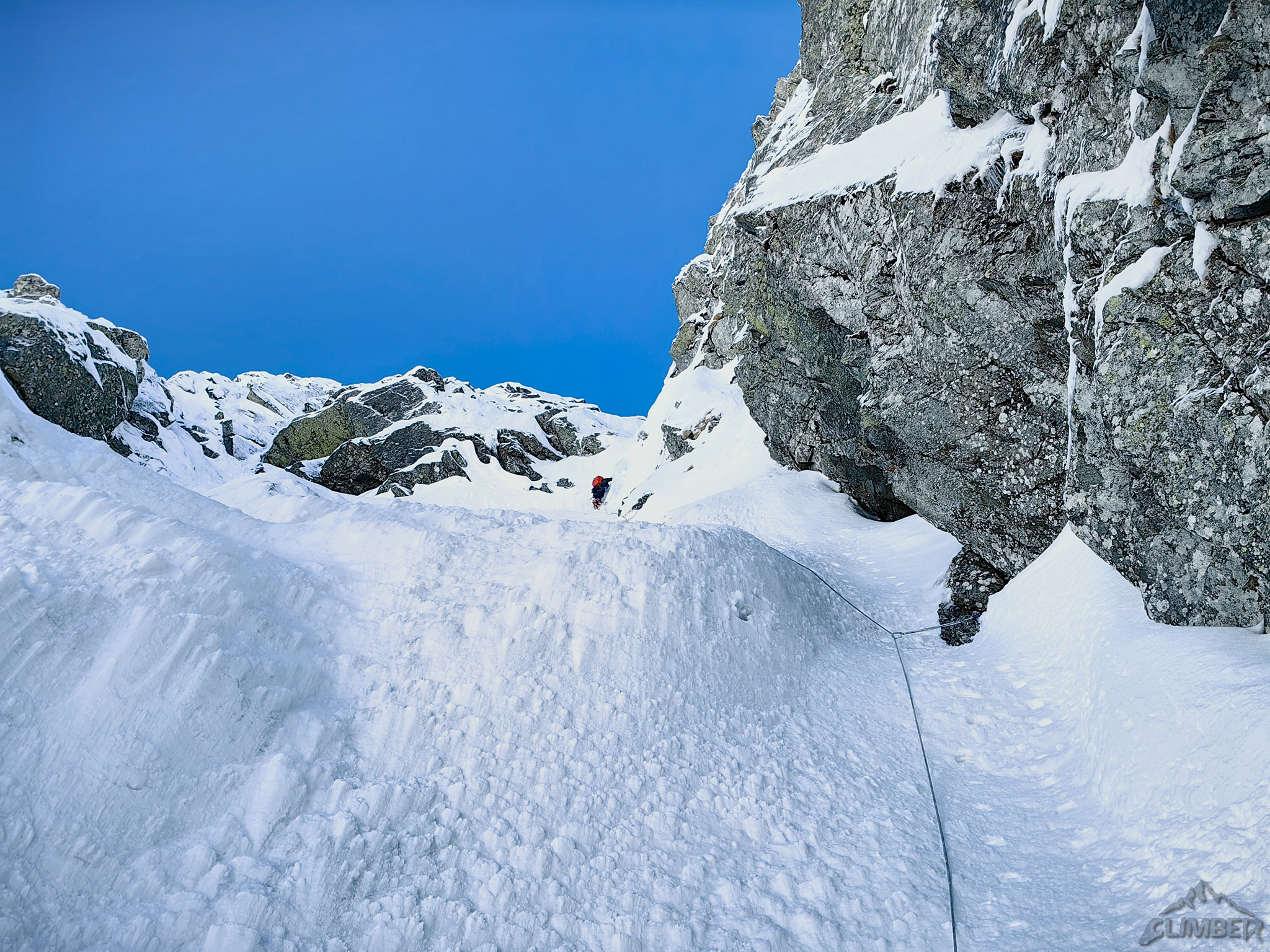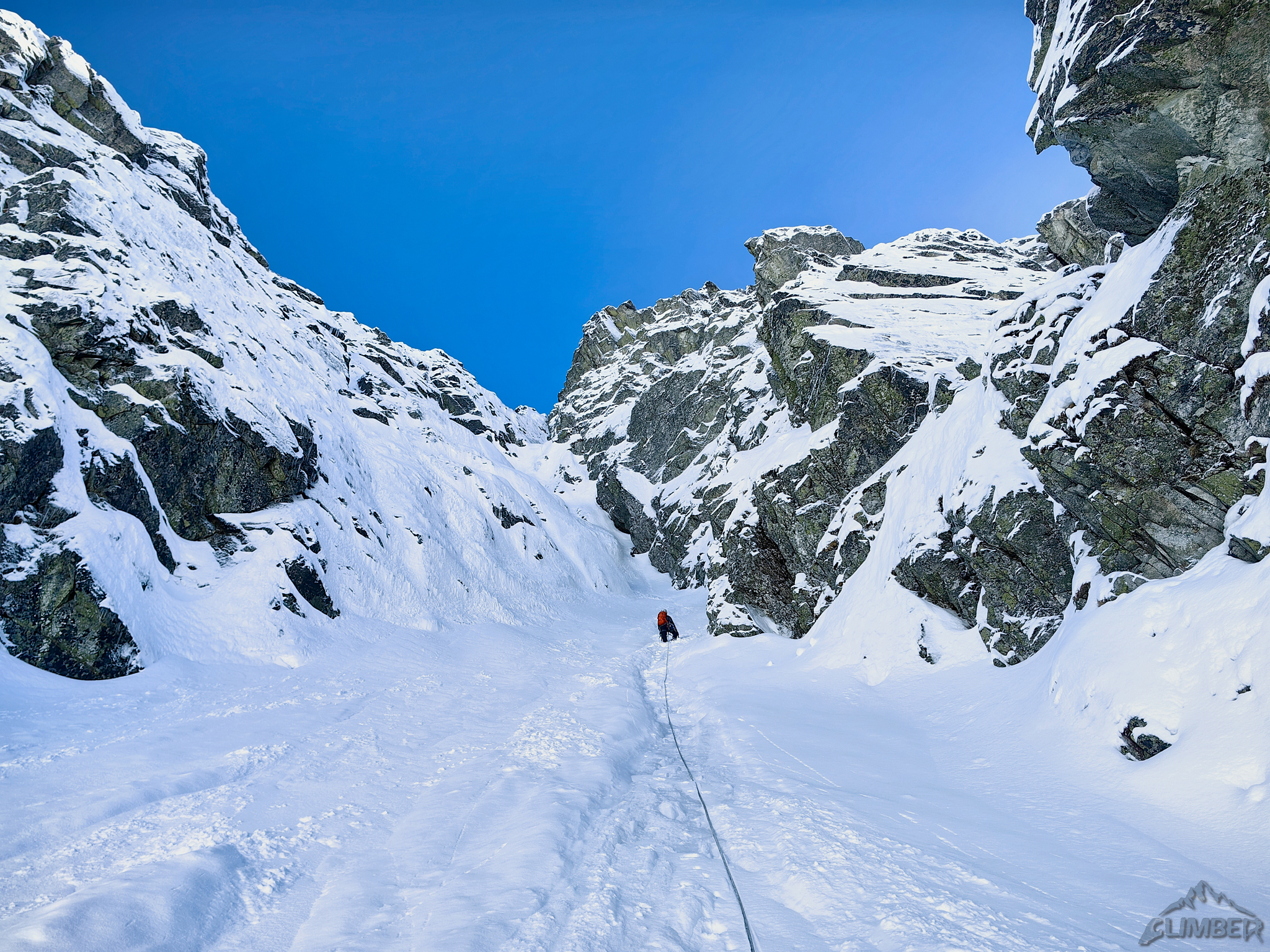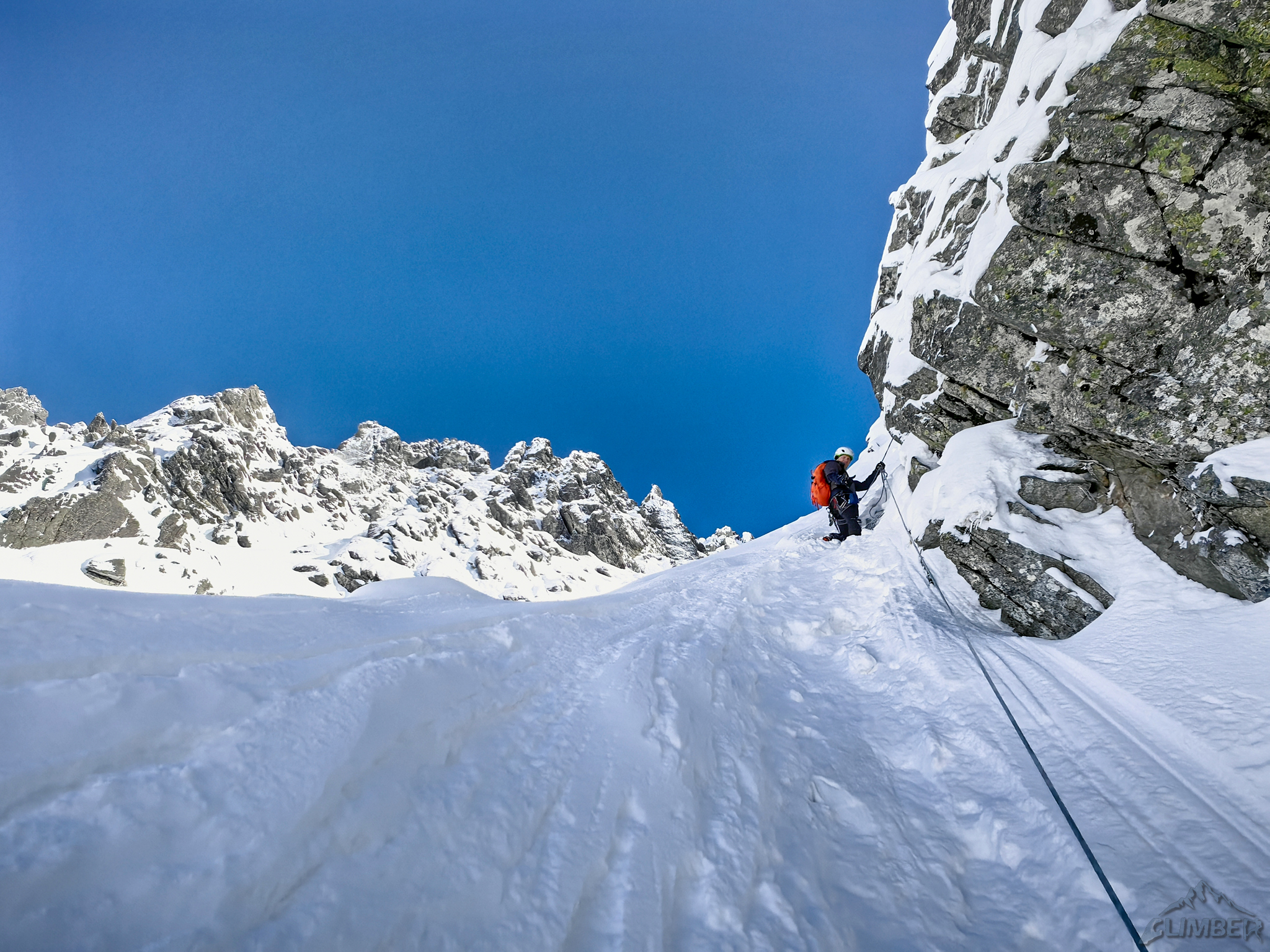 Wycena: WI3   Wycena uzupełniająca: WI3 lub M4   Asekuracja: R2   Długość [m]: 400   Wyciągi: 4   Czas [h]: 5   Wystawa: NW   Ocena: 7/10   Komentarz: 4 wyc. + lotna 200m