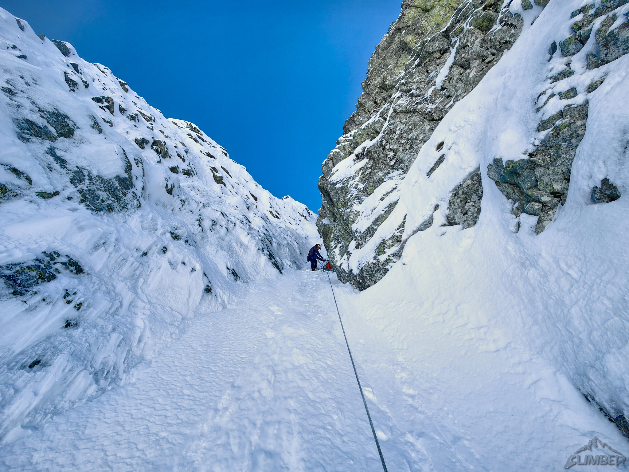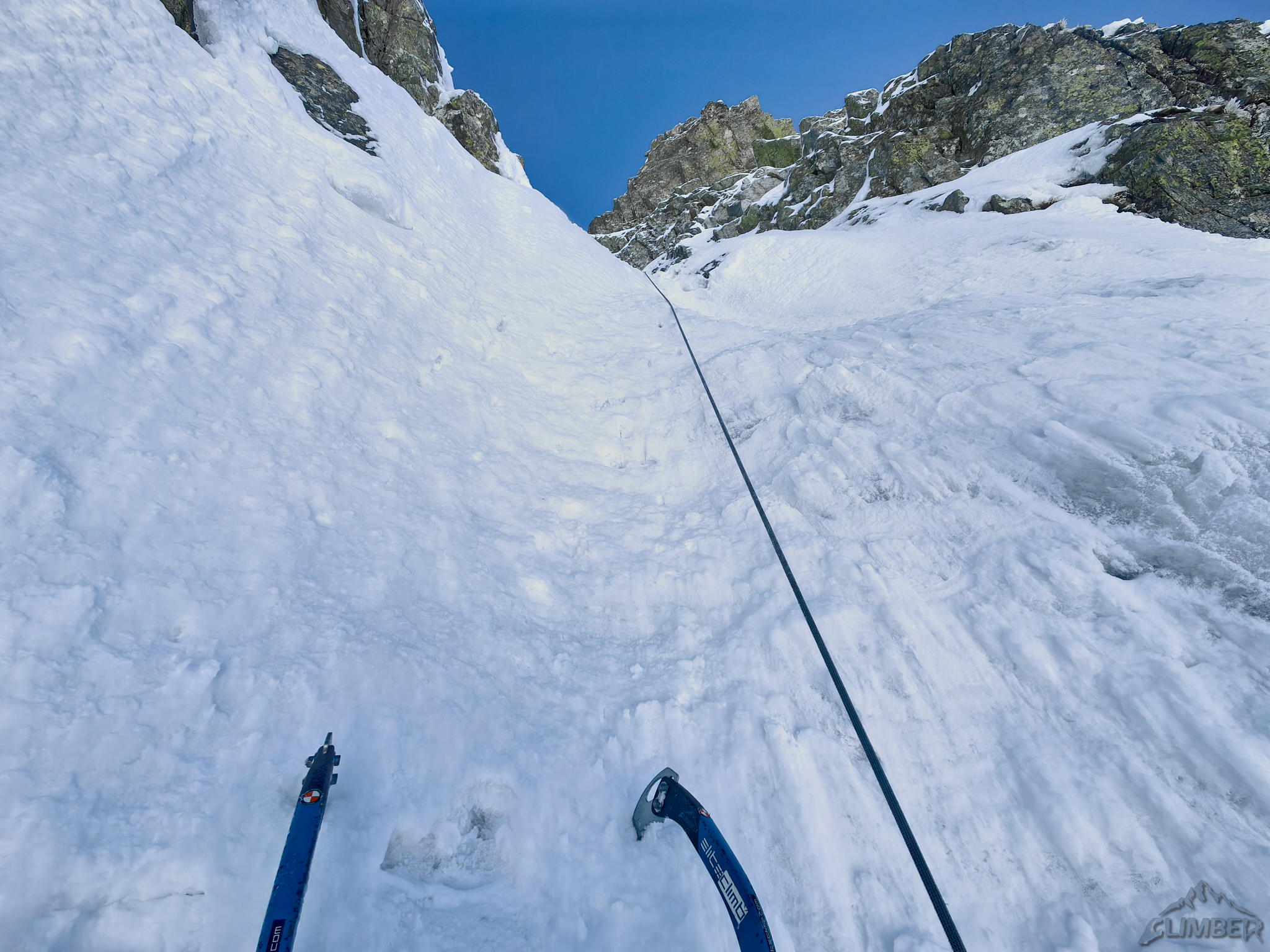 Poranek w Brzezinach wita nas deszczem, po dotarciu na Halę przed południem zgodnie z prognozami pięknie się jednak wypogadza. Ku naszej uciesze dolna część żlebu jest w dobrym firnie, szybko więc podchodzimy pod najtrudniejszy fragment drogi. Tutaj jednak niestety jest nieco gorzej – miejscami śnieg nie trzyma, do tego na kluczowym progu jest tylko mały placek lodu. Idący przodem Łukasz po dotarciu do tego miejsca wkręca dwie słabe śruby i pokonuje niepewny odcinek powyżej – trudności nie są duże (WI3) ale przy słabej przy tych warunkach asekuracji nie wolno odpadać. Gotowe stanowisko z haków jest kilkanaście metrów wyżej, po prawej stronie.
