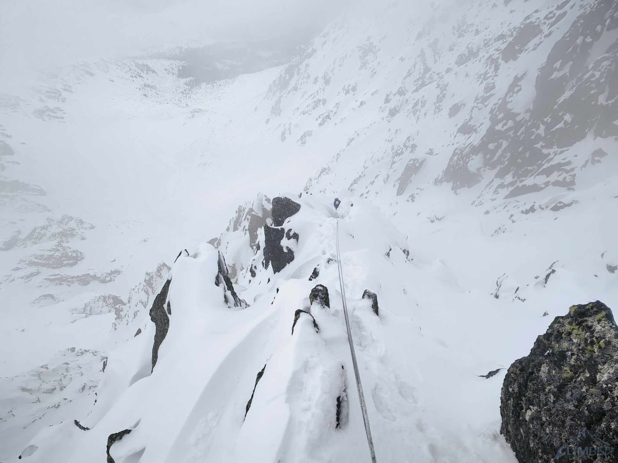 Tutaj okazuje się, że czeka jeszcze dużo pracy – ponieważ ściany grani są kompletnie zalepione, pozostaje odśnieżać jej ostrze i iść ściśle nim (trudności letnie II-III, normalnie idzie się łatwo niżej po lewej stronie). Do tego łapie mróz, robi się pochmurnie i wietrznie – przygoda nabiera więc nieco charakteru i mocno się wydłuża. Miał być szybki i przyjemny spacer ale wiadomo jaka jest zima – „nawet jak jest łatwo może nie być lekko” 😉. Po kolejnych dwóch godzinach wychodzimy wreszcie ze ściany i do domów wracamy przyjemnie zmęczeni. Stracona przez kontuzję końcówka sezonu zimowego dostarczy może jeszcze trochę wrażeń.